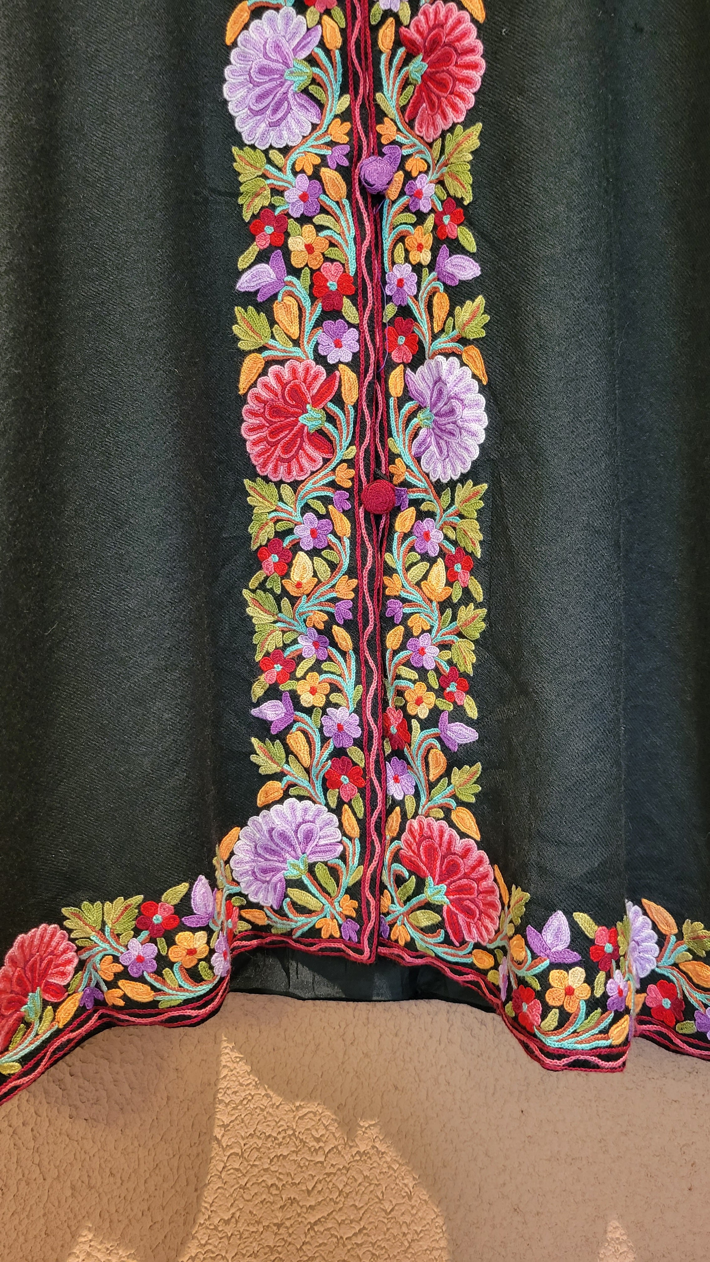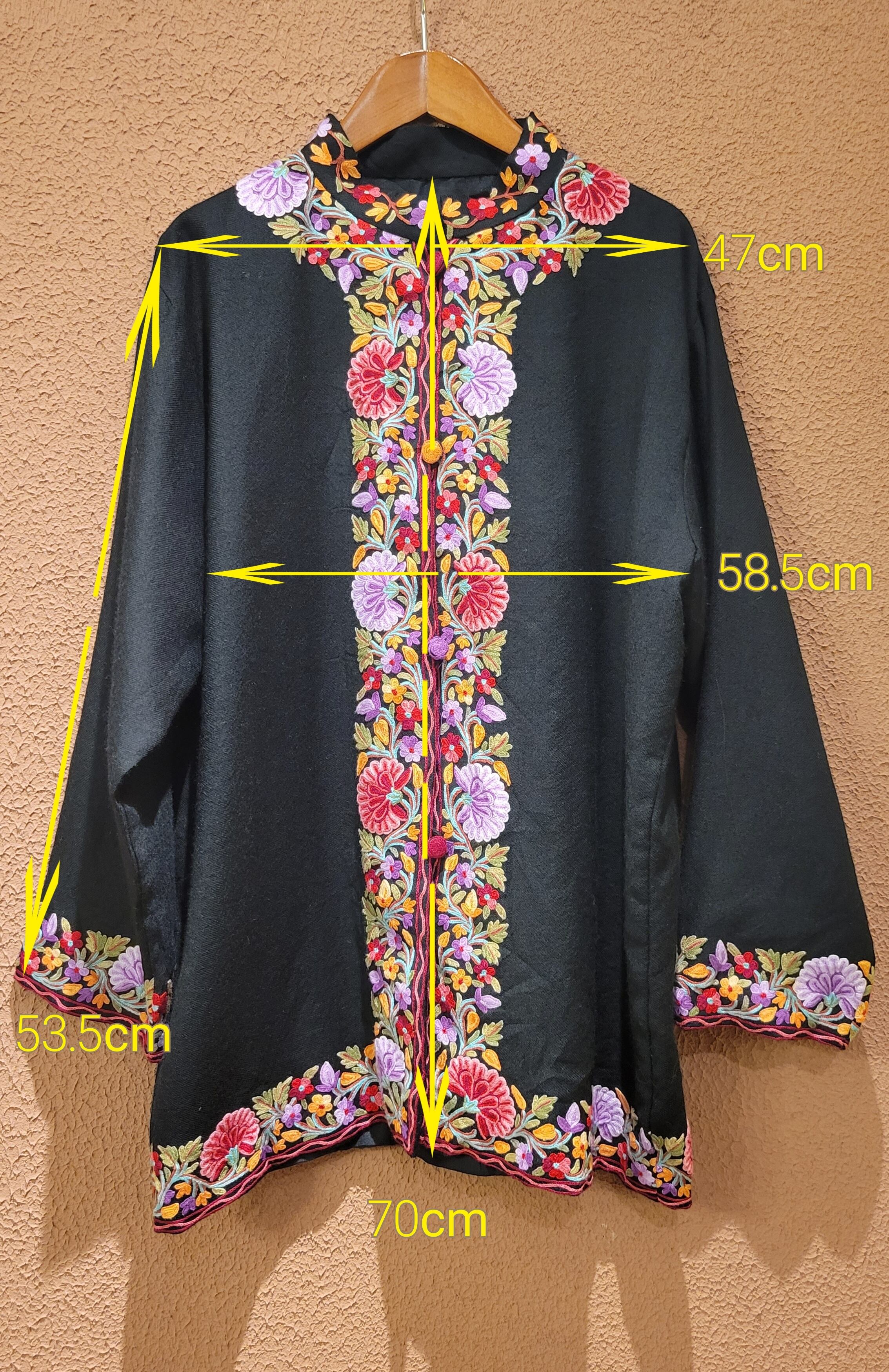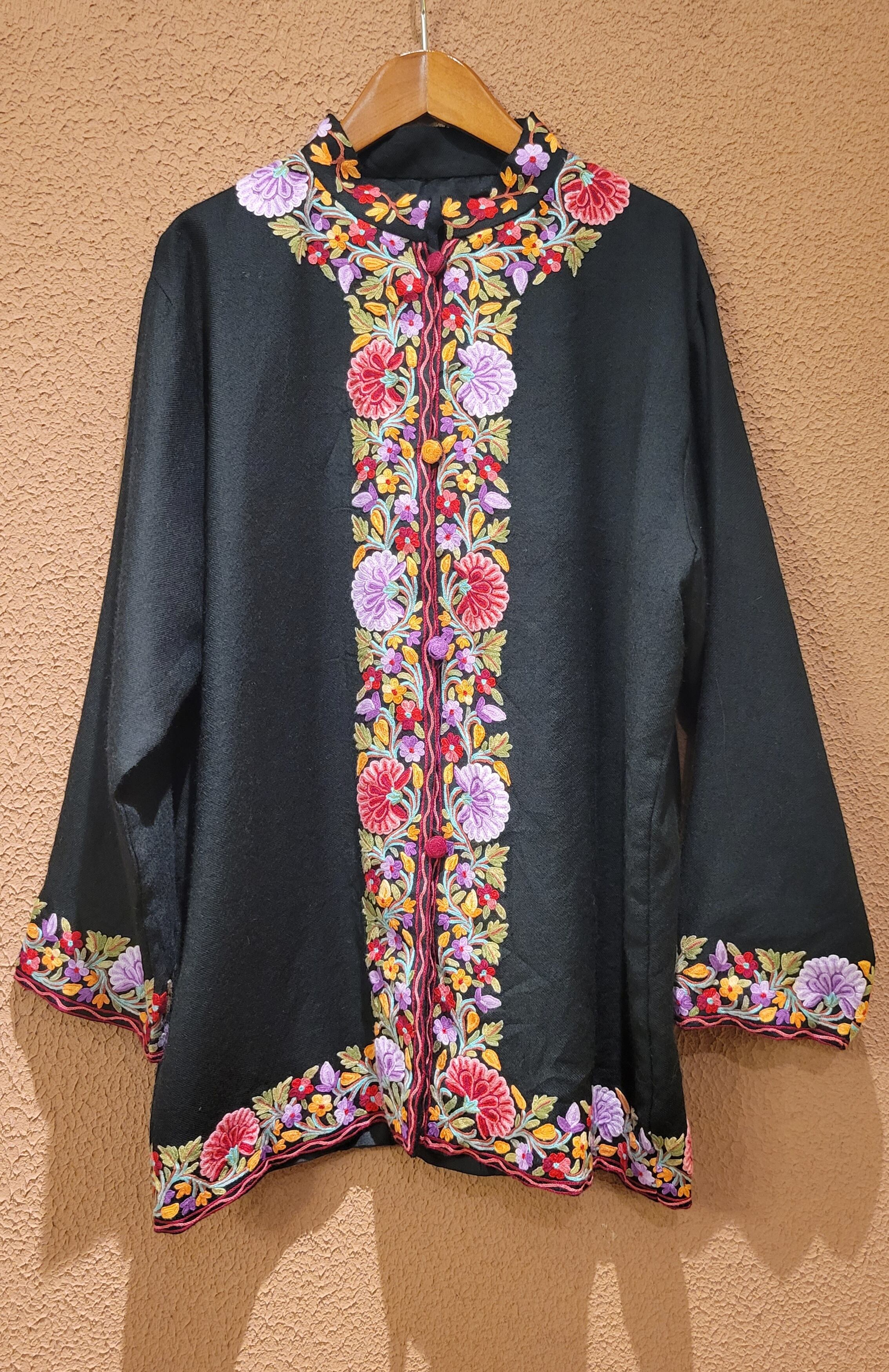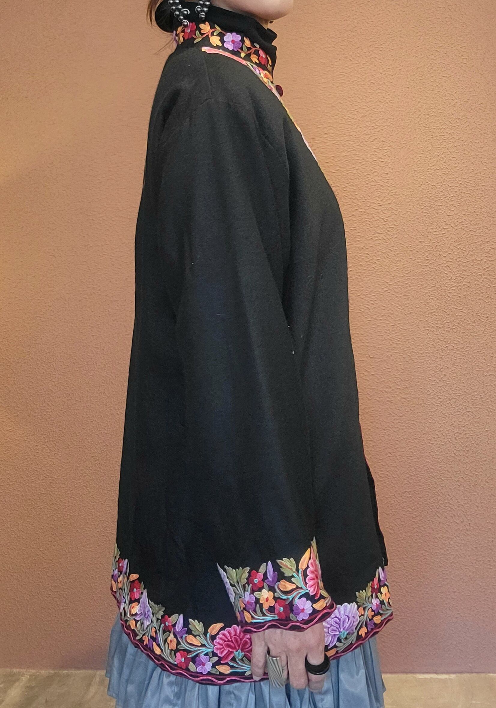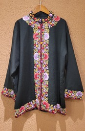Made in India カシミール刺繍のヴィンテージウールジャケット。とても柔らかく軽量なウール素材で着心地抜群です。裏地付きで着脱もスムーズ。鮮やかで繊細な刺繍が黒地によく映えます。スタンドカラーできちんと感もあり、カジュアルからきれいめスタイリングまで幅広くお使いいただけるアイテムです。