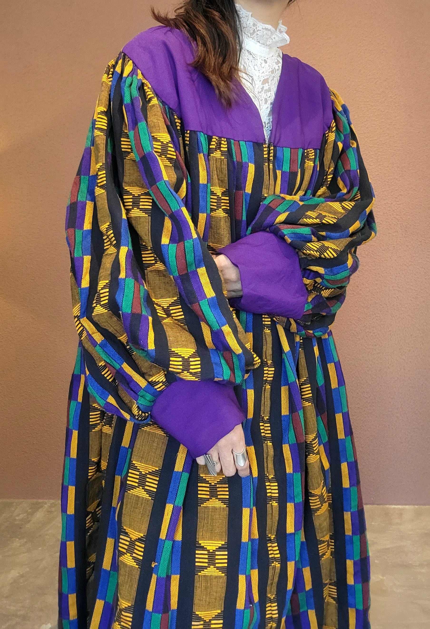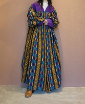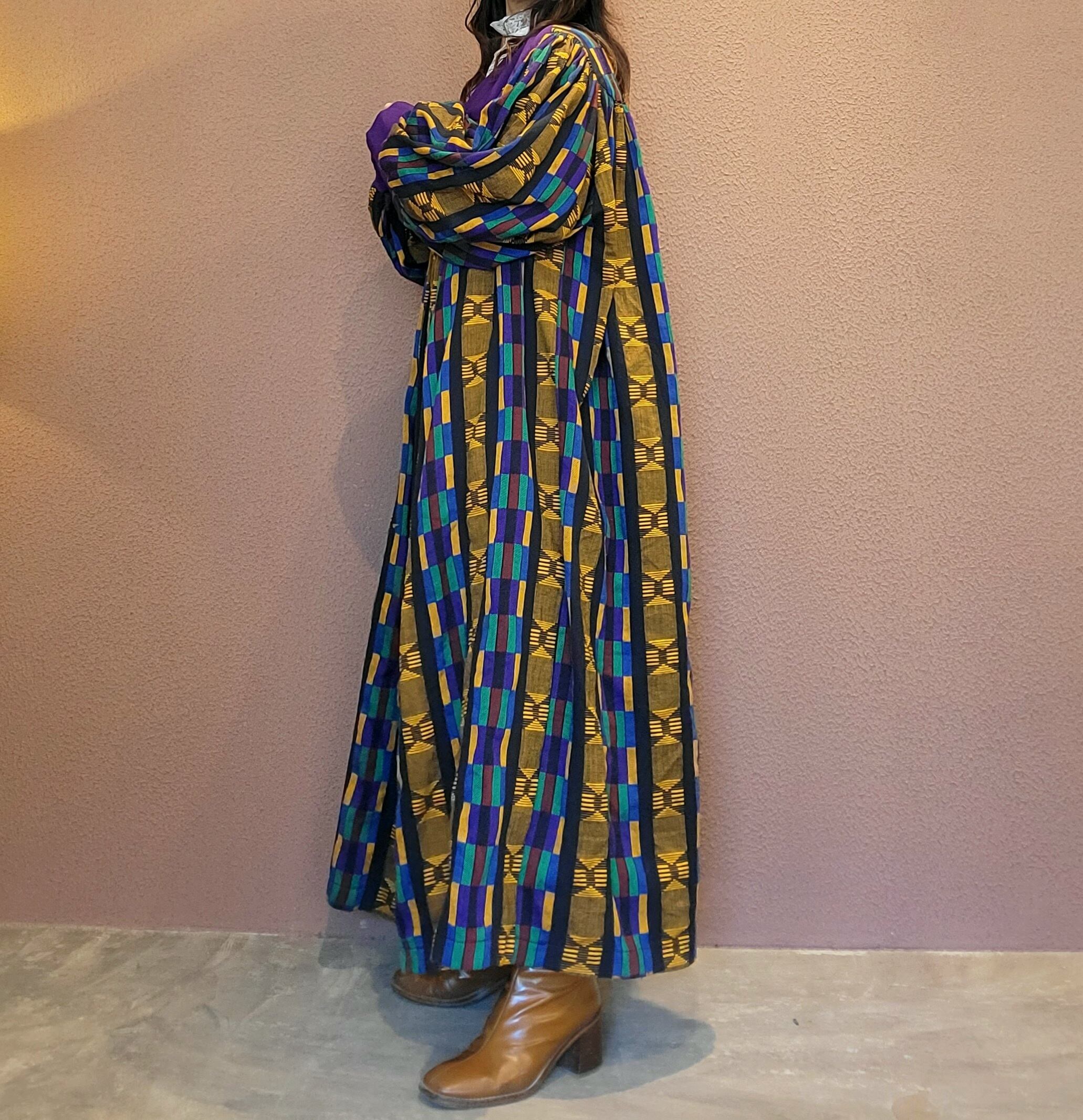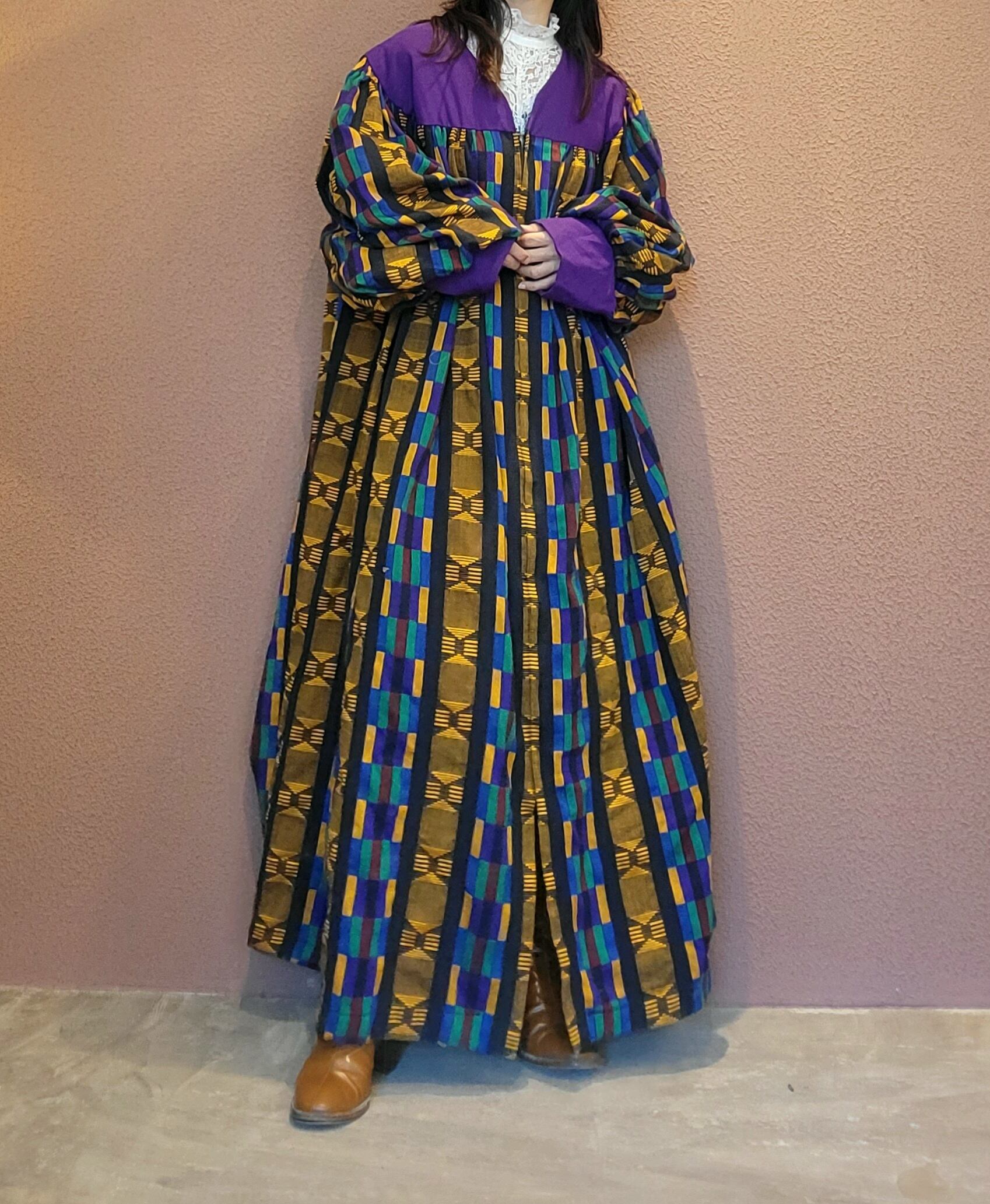 アフリカンプリントのエスニックマキシワンピース。素材はざっくりしたコットンです。フロントフルジップ仕様。大きめサイズで元々は男性用かもしれません。パンチの効いたプリントとたっぷりギャザーのボリューム感は主役級の存在感です。