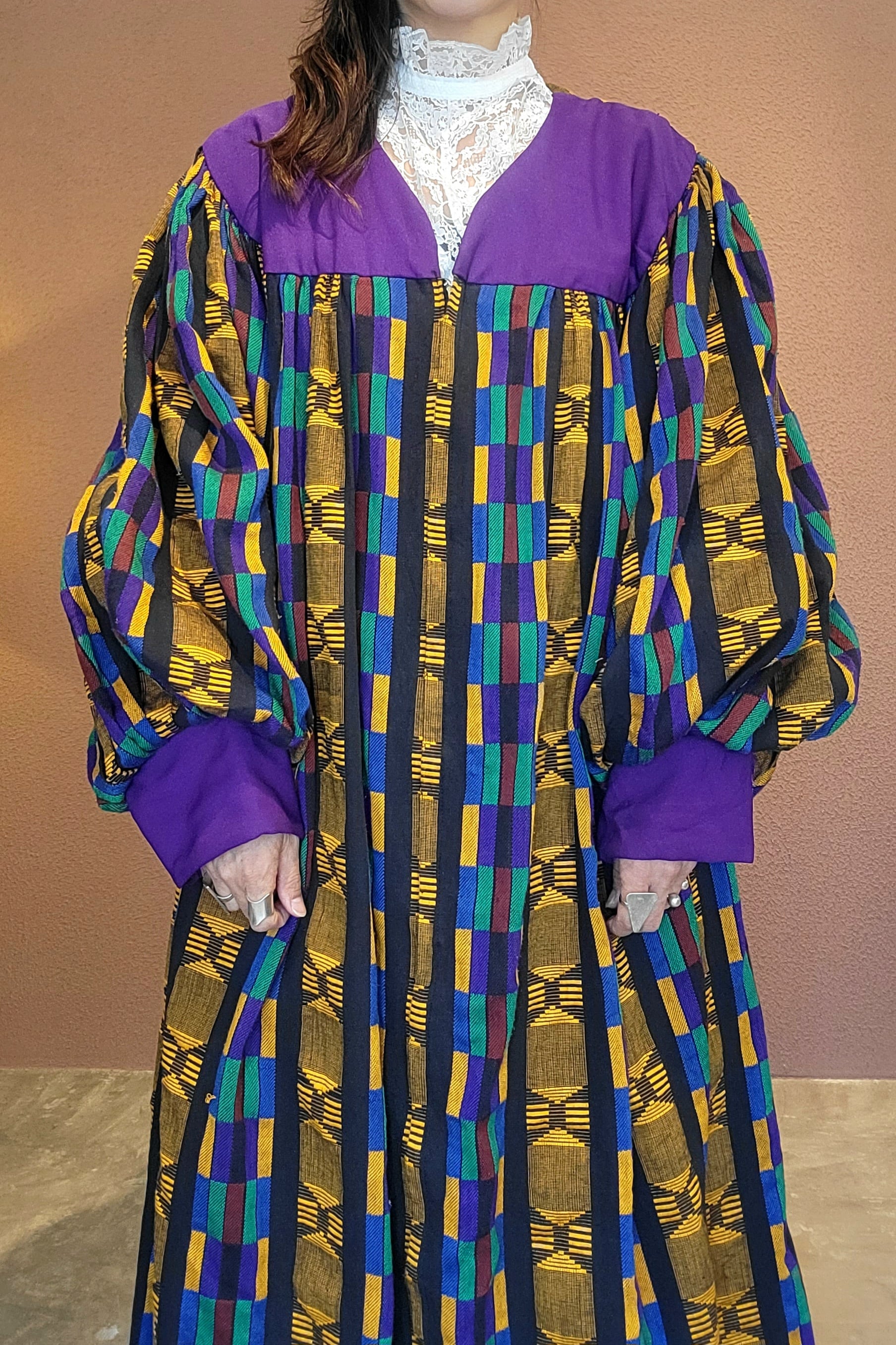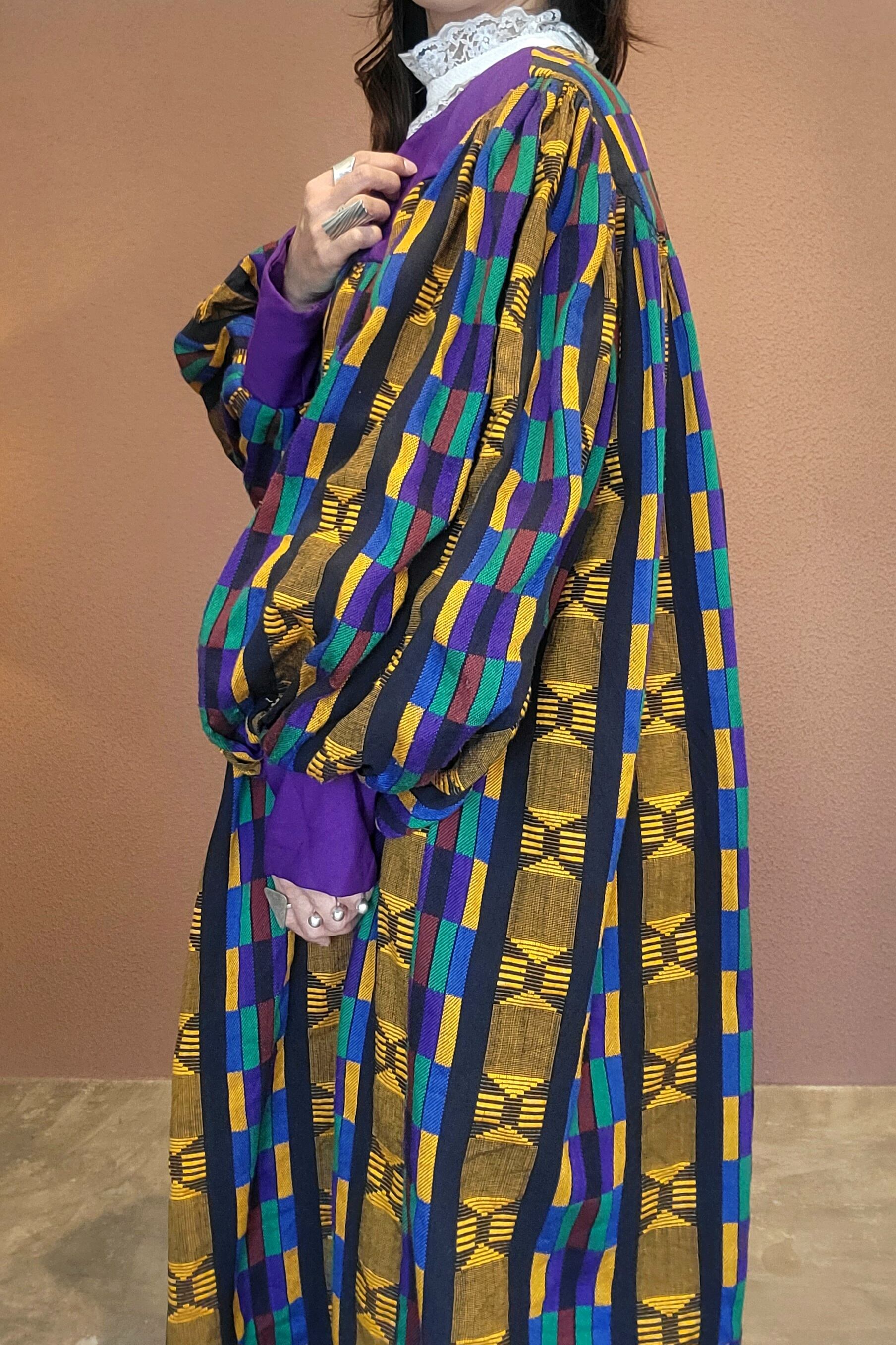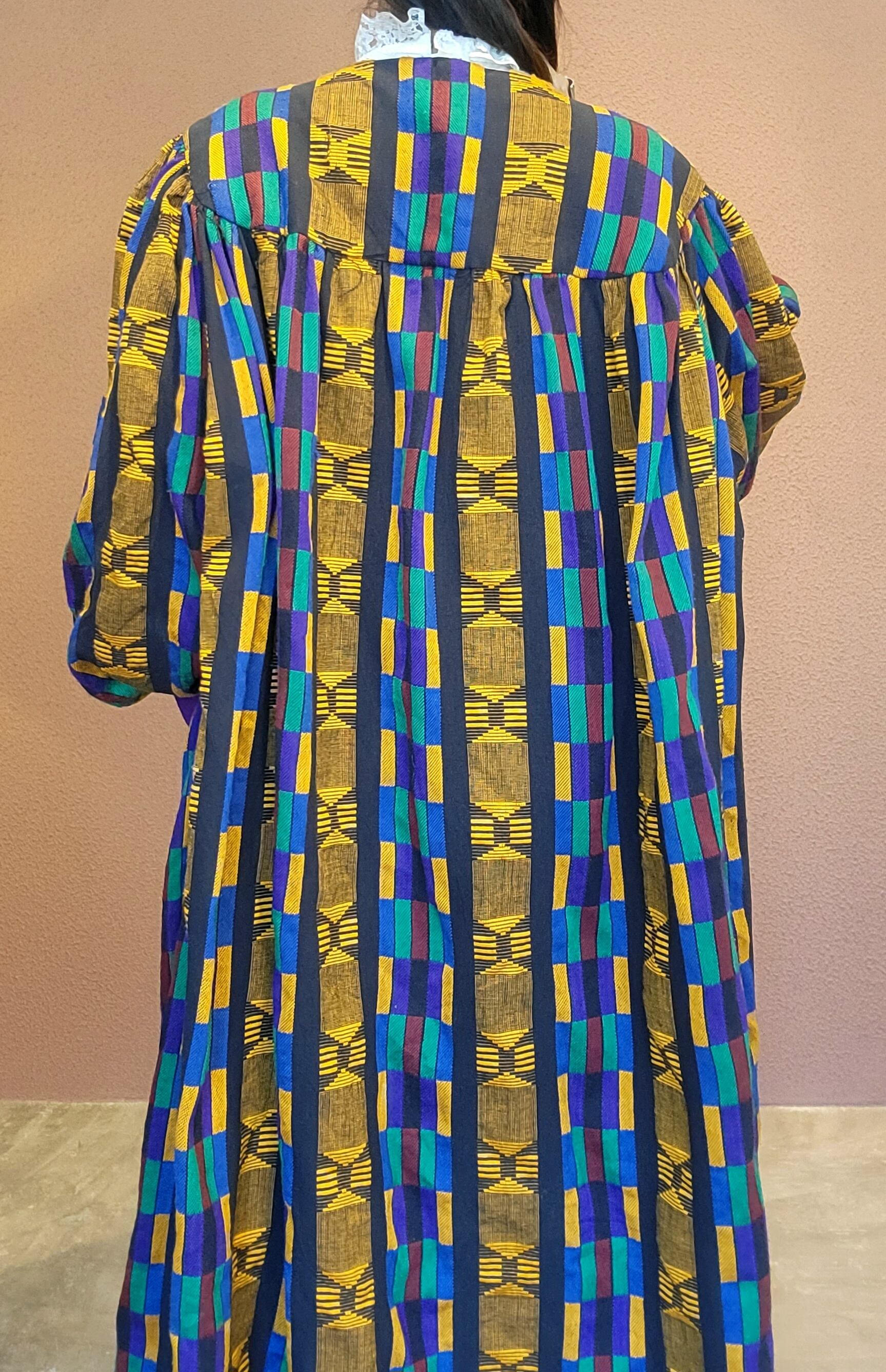 アフリカンプリントのエスニックマキシワンピース。素材はざっくりしたコットンです。フロントフルジップ仕様。大きめサイズで元々は男性用かもしれません。パンチの効いたプリントとたっぷりギャザーのボリューム感は主役級の存在感です。