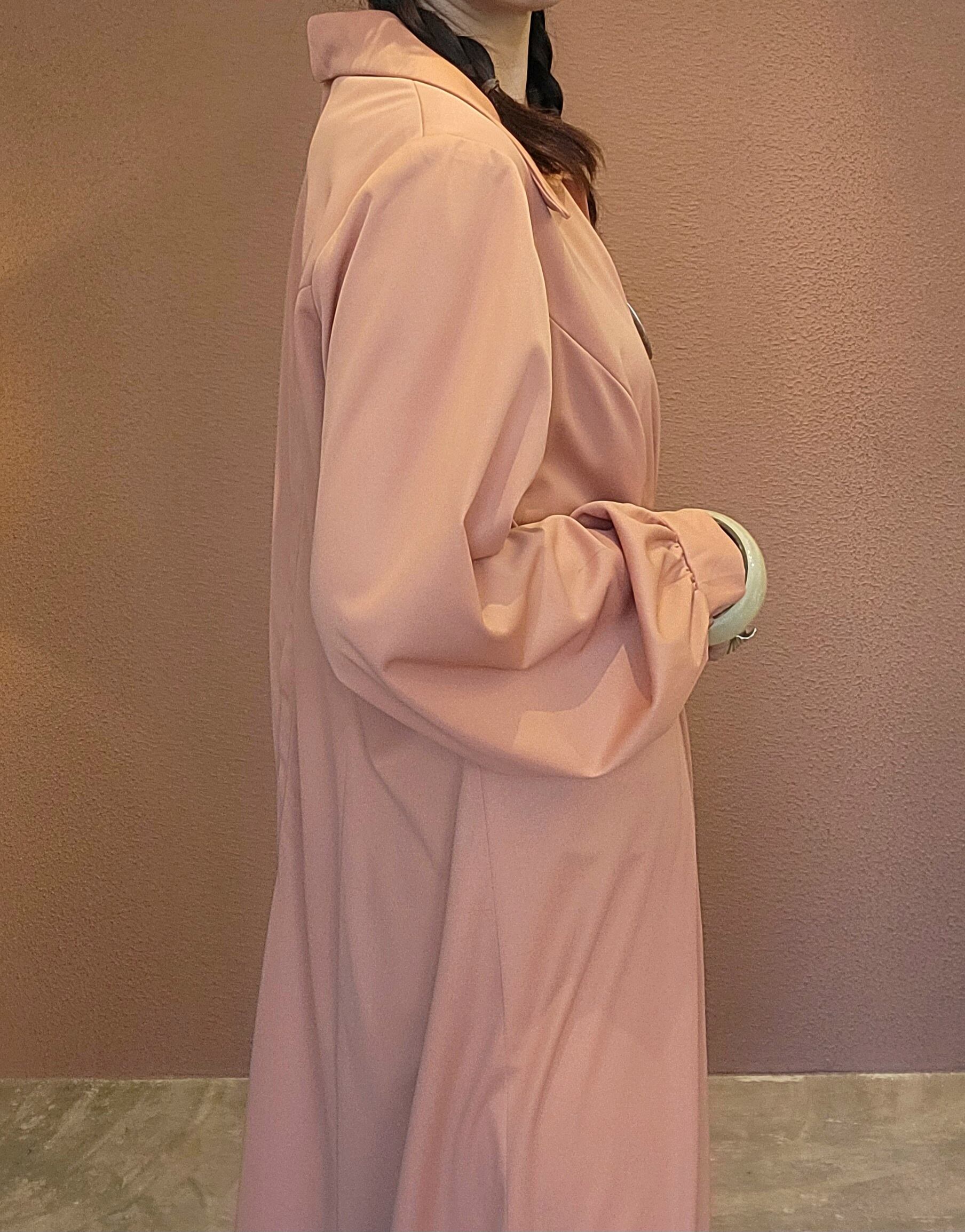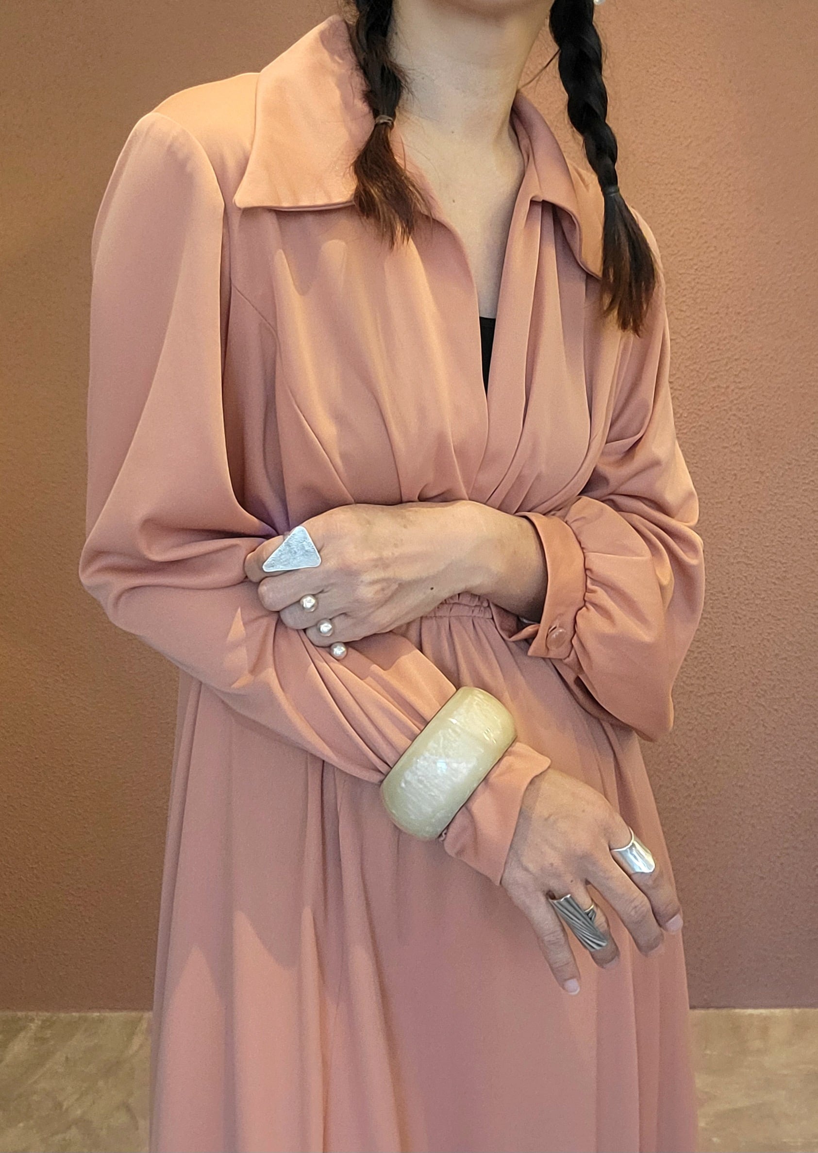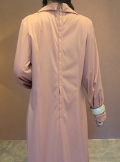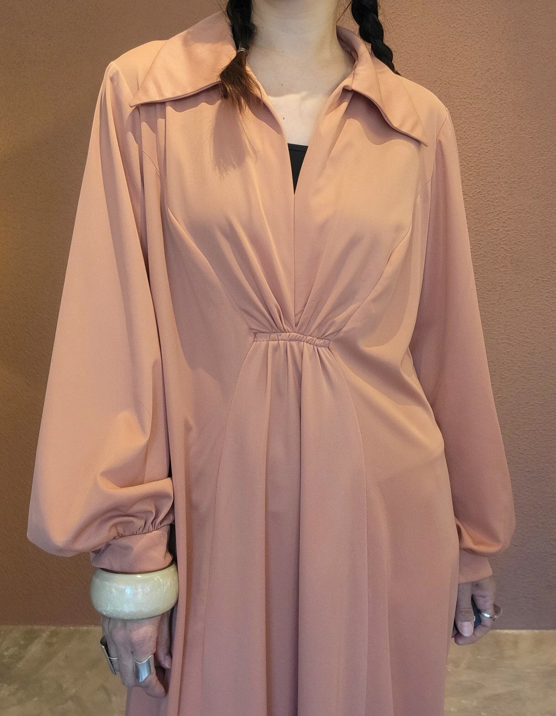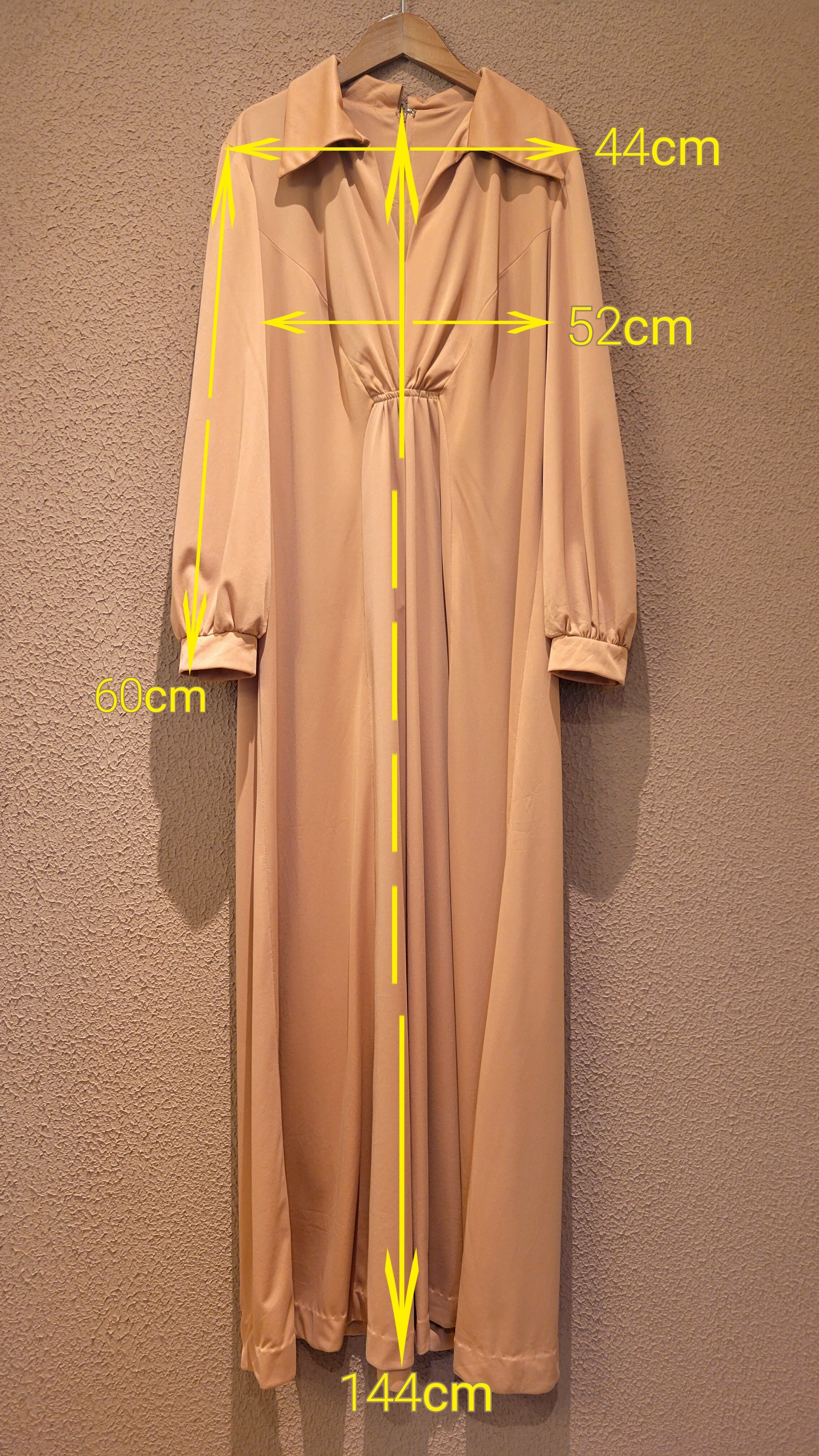 ヴィンテージのマキシワンピース。素材表記はありませんがポリエステルのようです。やや伸縮性があります。バックファスナー付き。丈詰め可能なデザインです。ハイウエスト位置でのポイントギャザーが脚長見えを叶えます。ベストやポンチョをプラスしてスタイリングのアレンジを楽しめる綺麗なシルエットの無地ワンピースです。