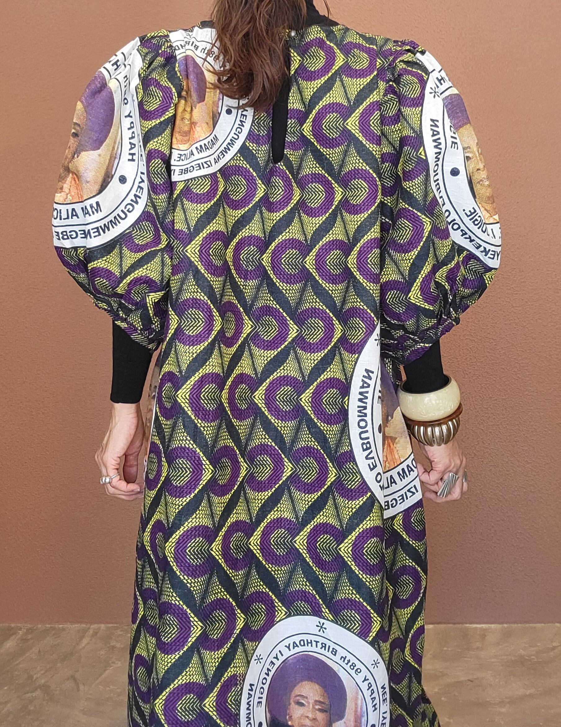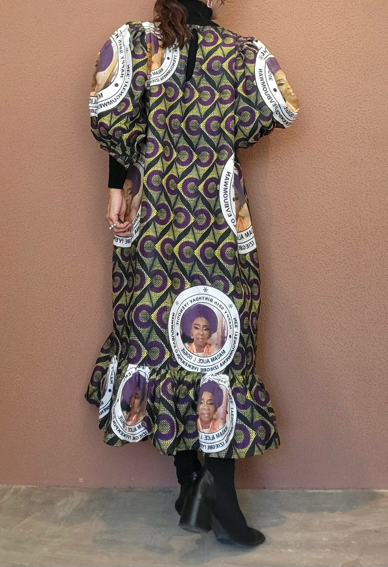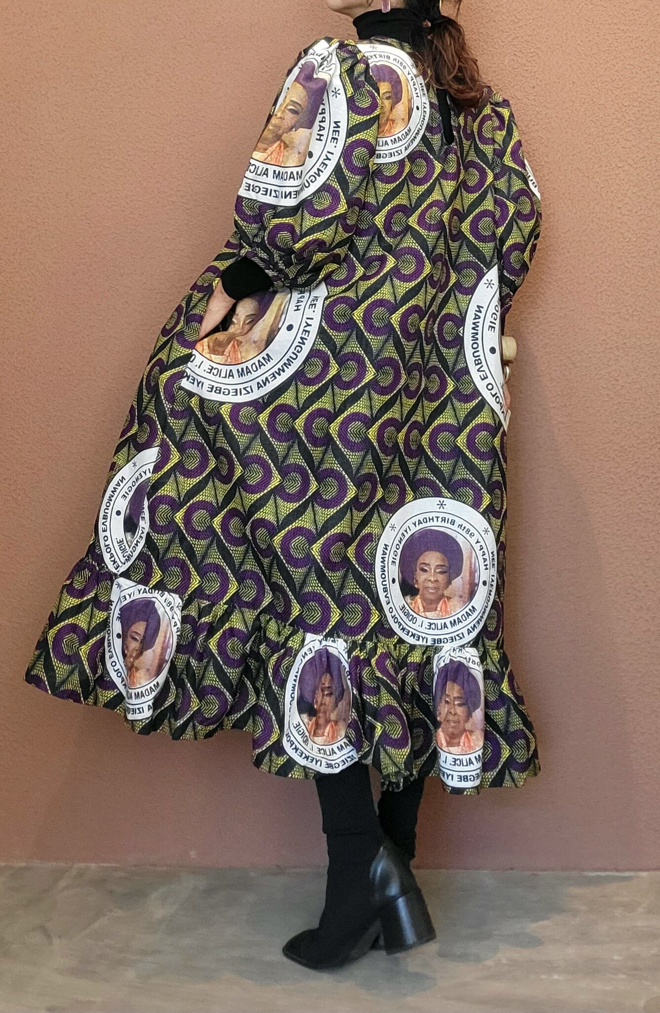 ヴィンテージのアフリカンバティックワンピース。素材はコットンです。バティック特有の張り感があり着用時にもふんわりシルエットをキープ。インパクト強めのプリントですがたっぷりのボリュームスリーブと裾フリルデザインがちゃんとおしゃれ感漂うデザインワンピースに仕上げています。
