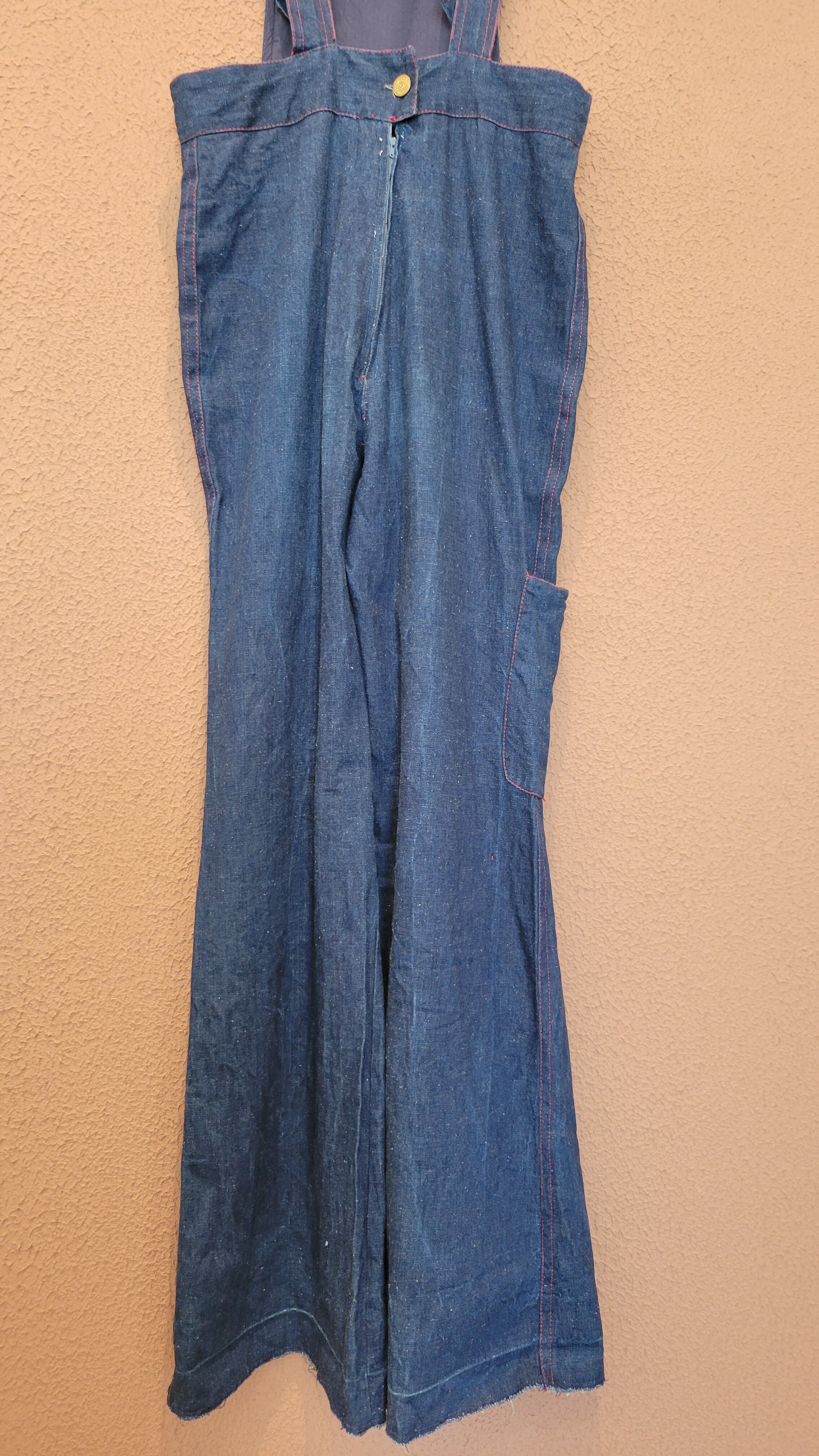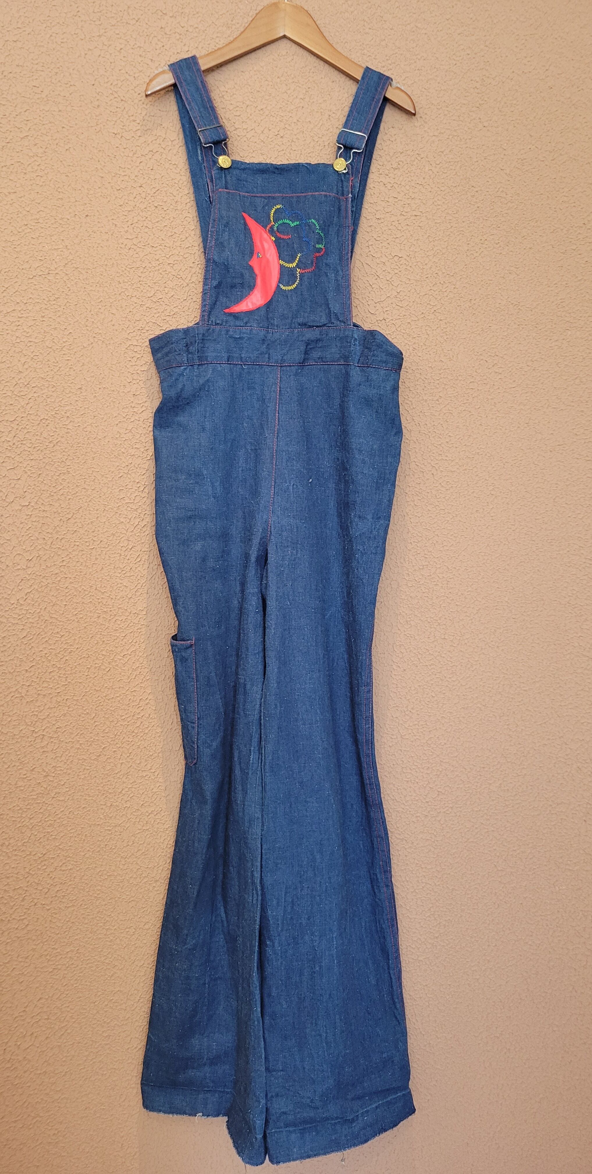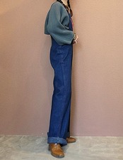ヴィンテージのデニムサロペット。やや薄手のデニムですでにくったり馴染んでおりストレスの無く着ていただけます。かなりハイウエストからのフレアシルエットは脚長見え効果大です。裾は切りっぱなし、レングス長めですがロールアップしても可愛く着られます。