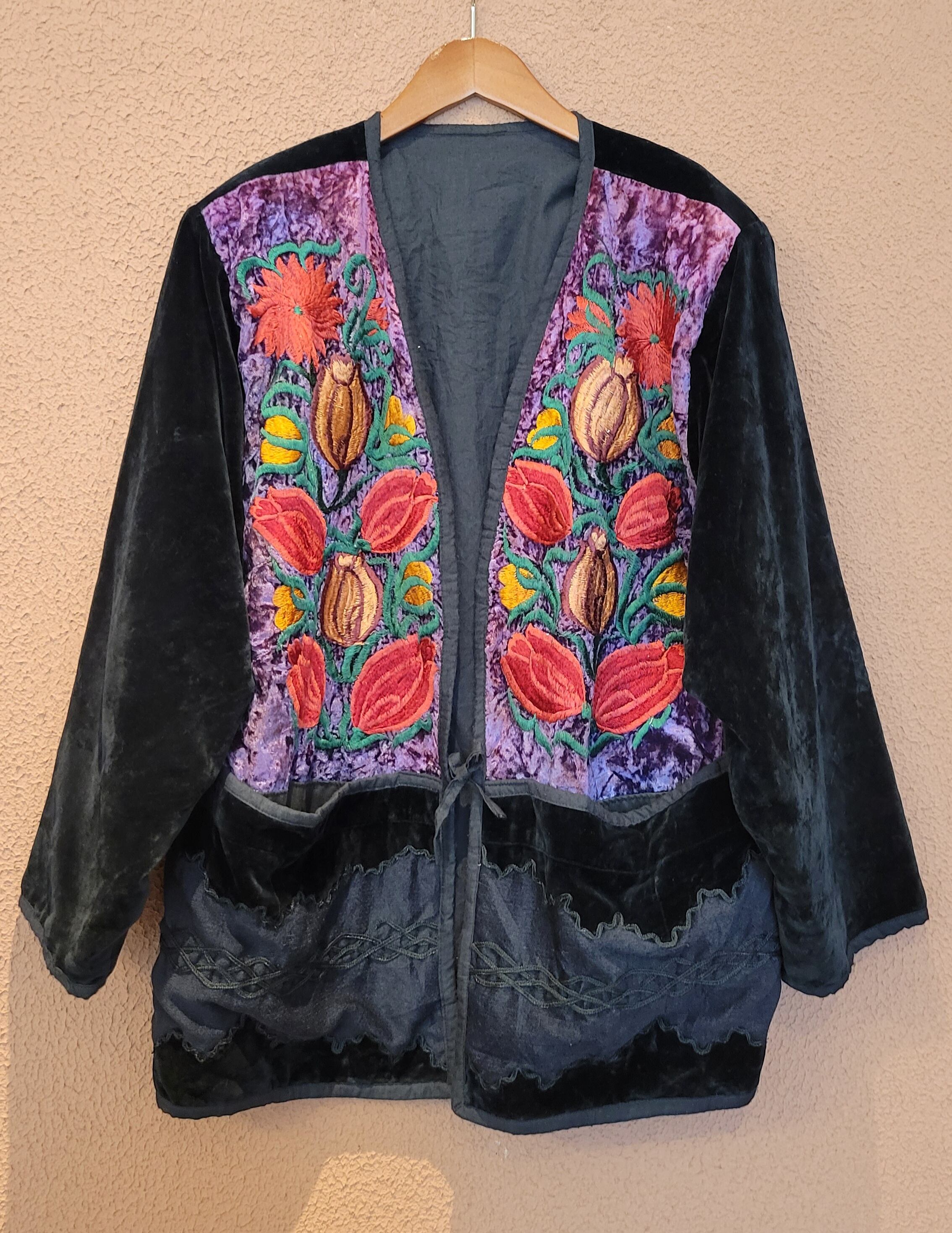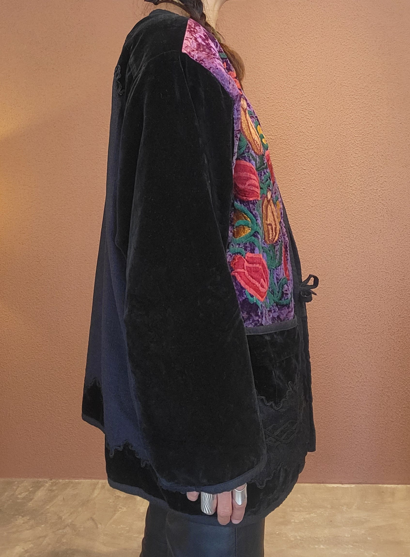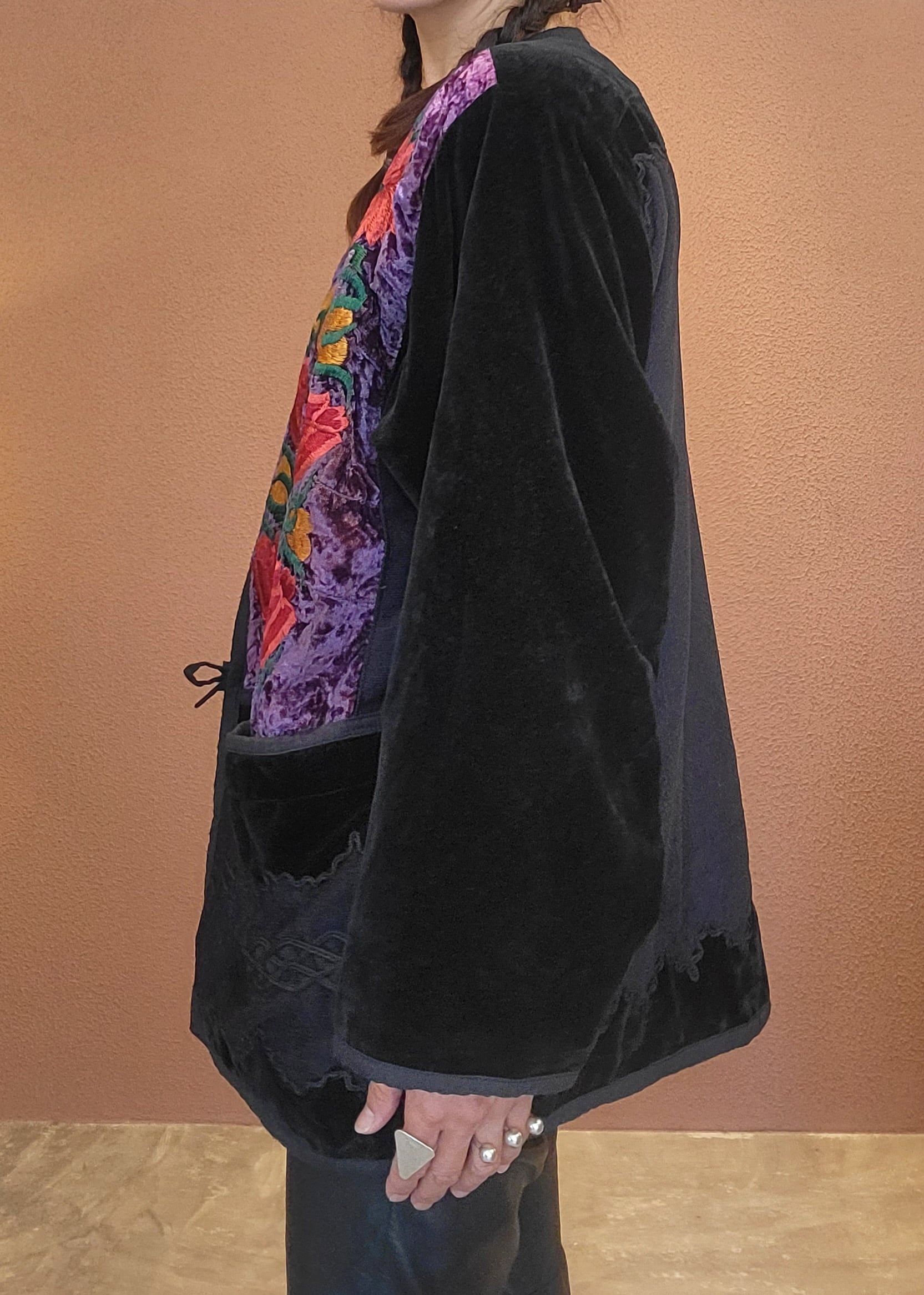 Made in Guatemala ヴィンテージジャケット。グアテマラジャケットには珍しく柔らかいベルベット素材です。女性がオーバーサイズで着ても、男性がジャストサイズで着てもほどよいサイズ感。刺繍の存在感と落ち着きのあるカラーで大人っぽく着られます。