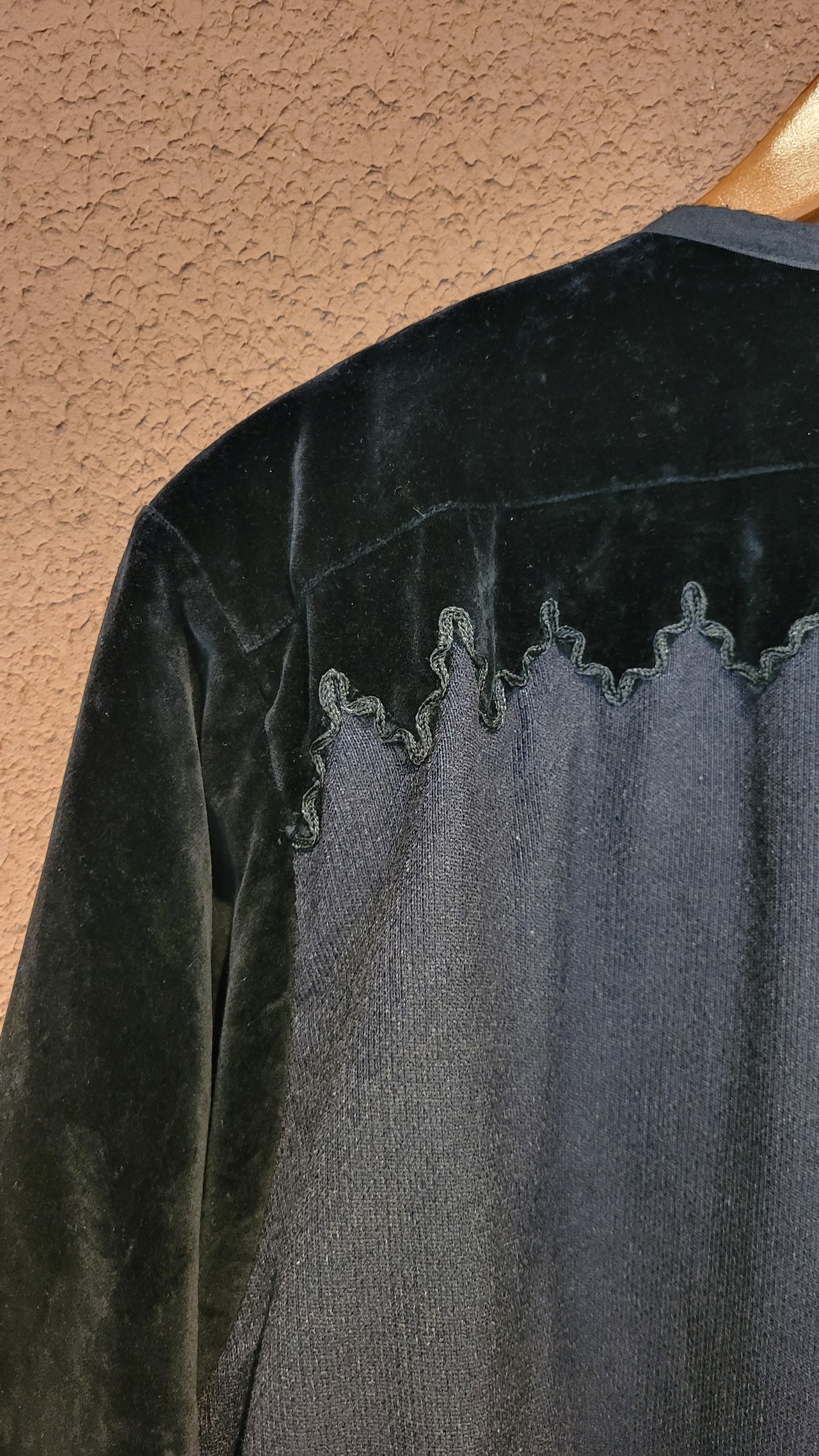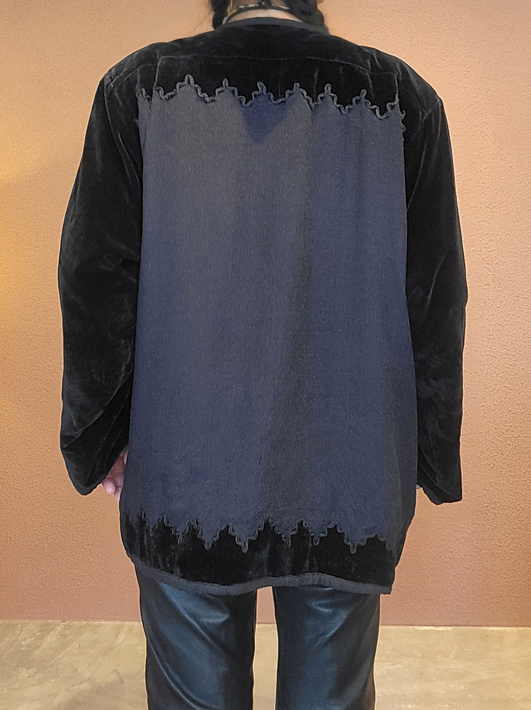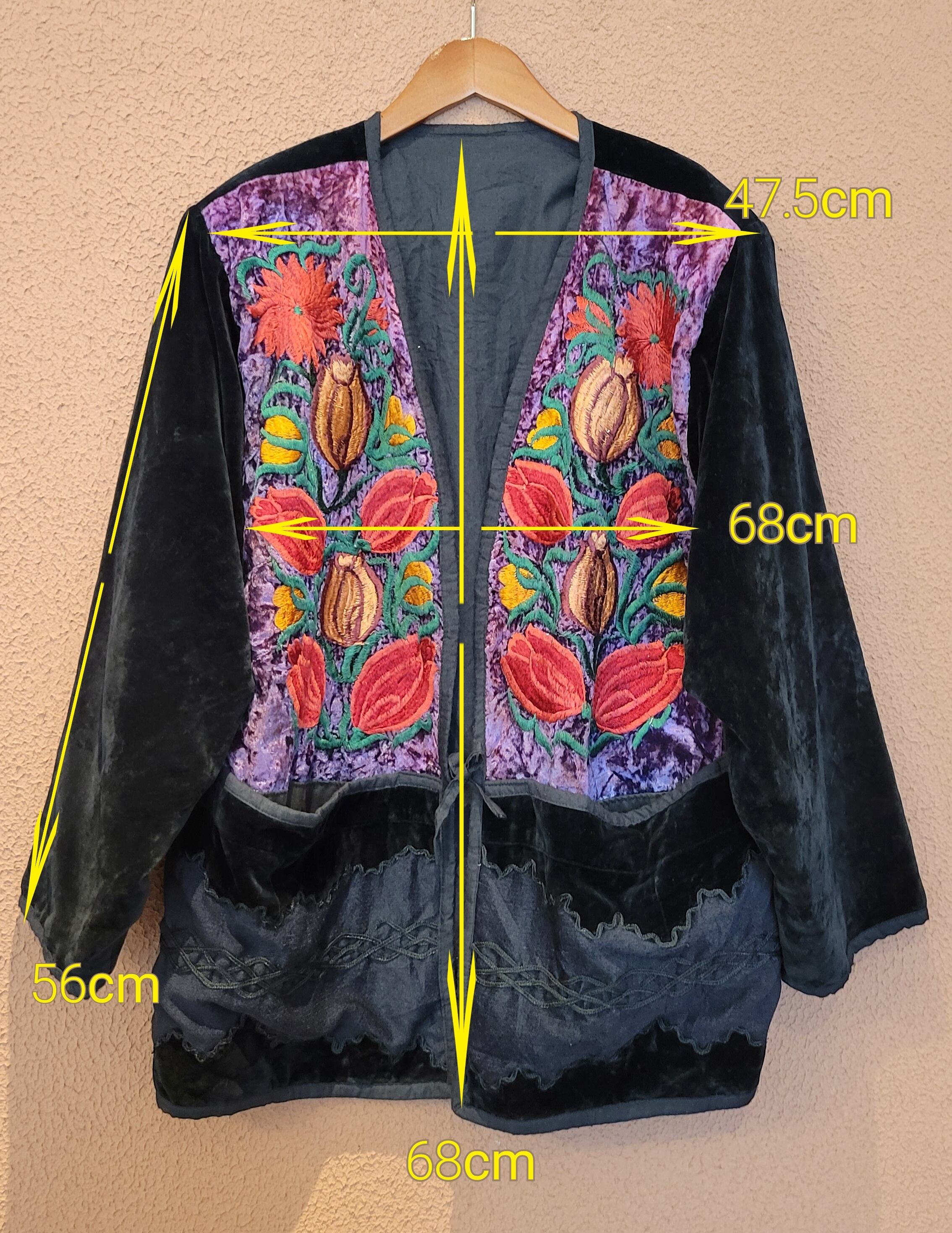 Made in Guatemala ヴィンテージジャケット。グアテマラジャケットには珍しく柔らかいベルベット素材です。女性がオーバーサイズで着ても、男性がジャストサイズで着てもほどよいサイズ感。刺繍の存在感と落ち着きのあるカラーで大人っぽく着られます。