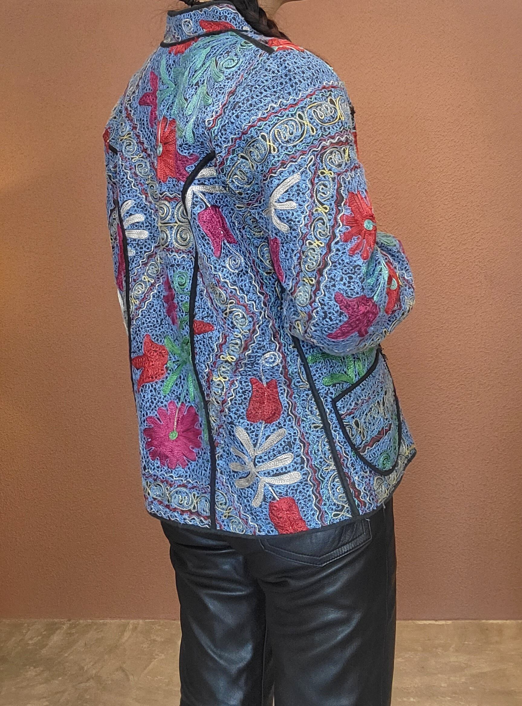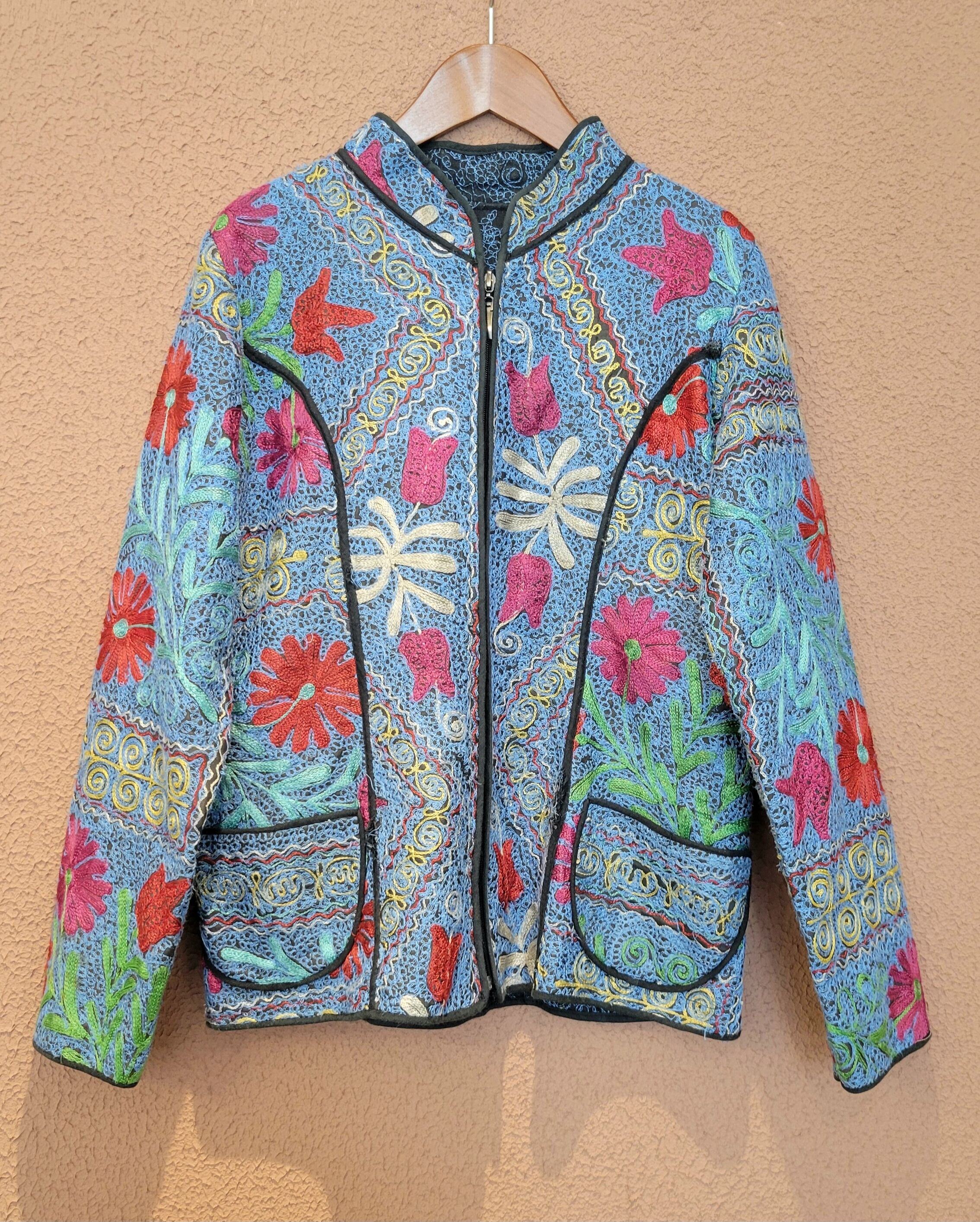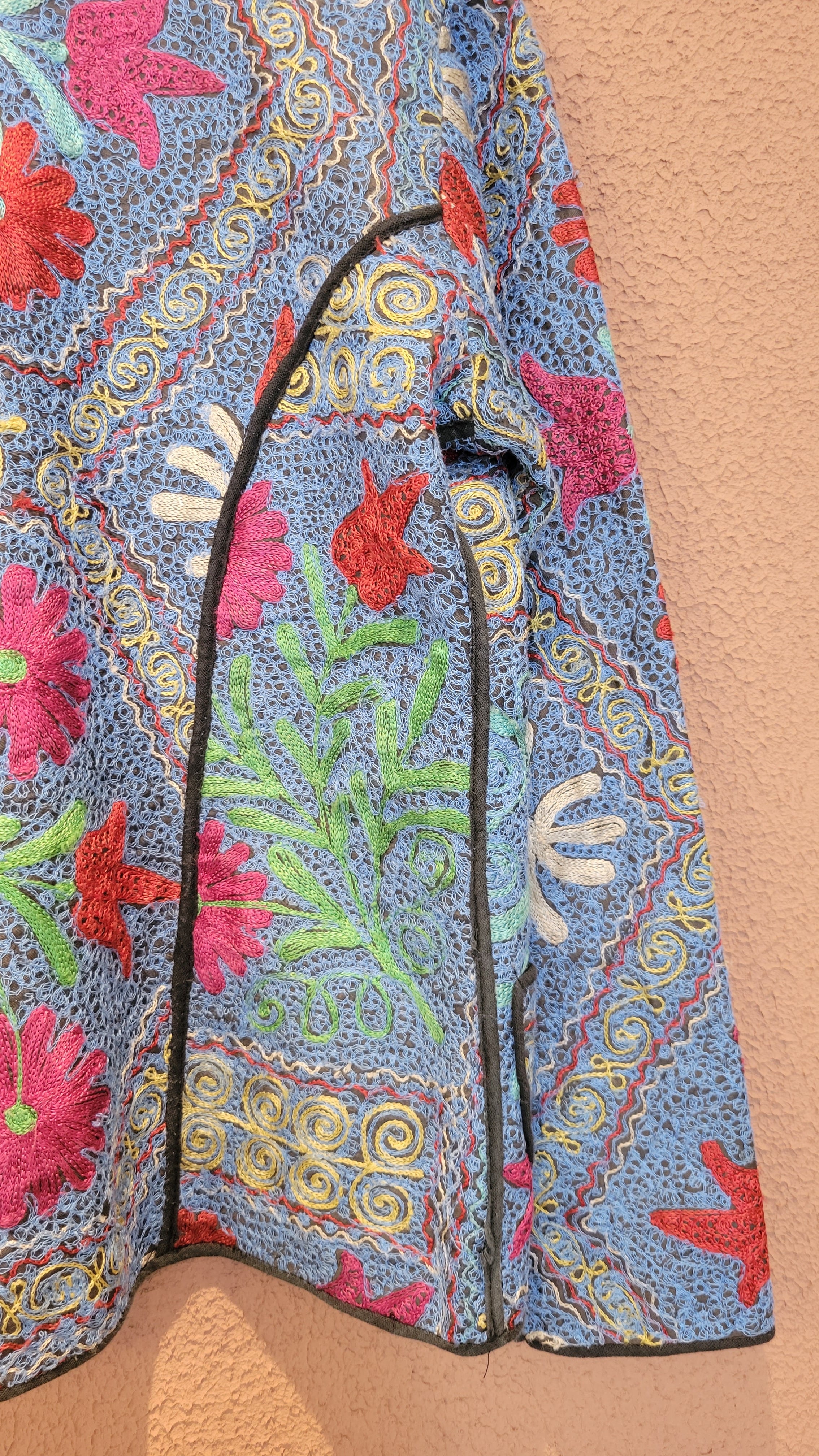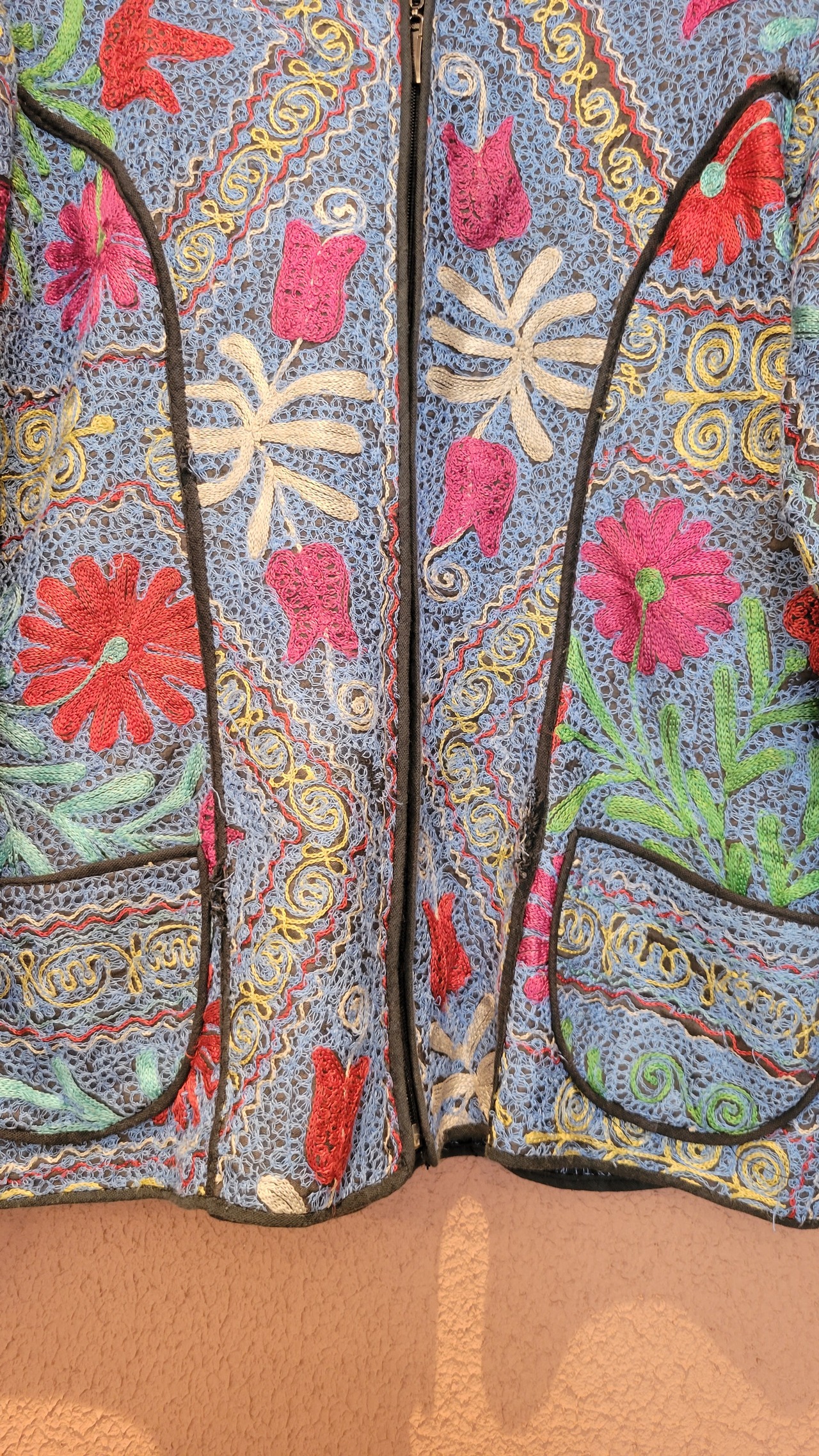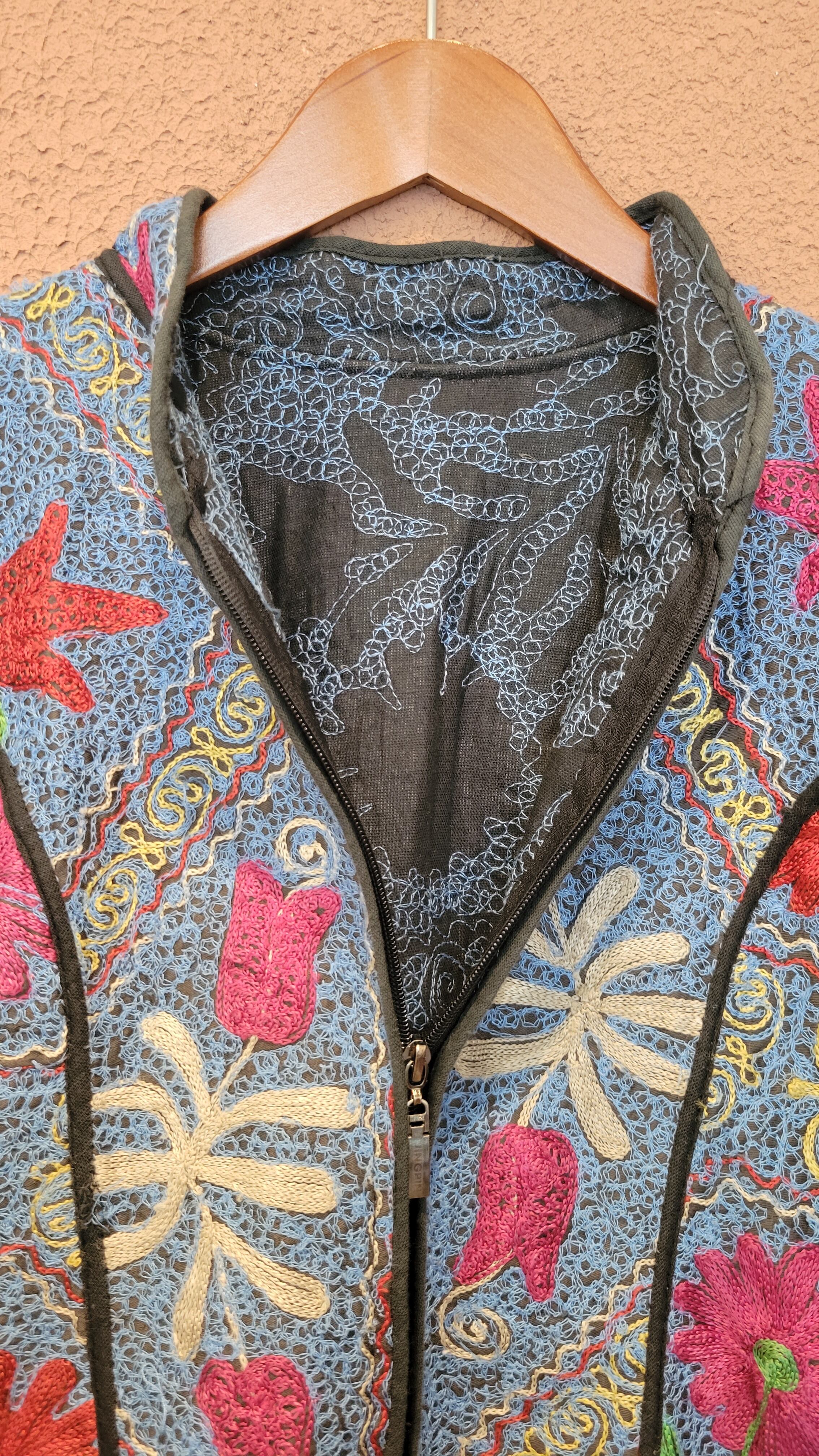Made in India の刺繍ジャケット。素材表記はありませんがコットンのようです。全体にびっしりと施されたチェーンステッチが存在感のある1枚。フロントジップで着脱が楽なのも嬉しいポイントです。