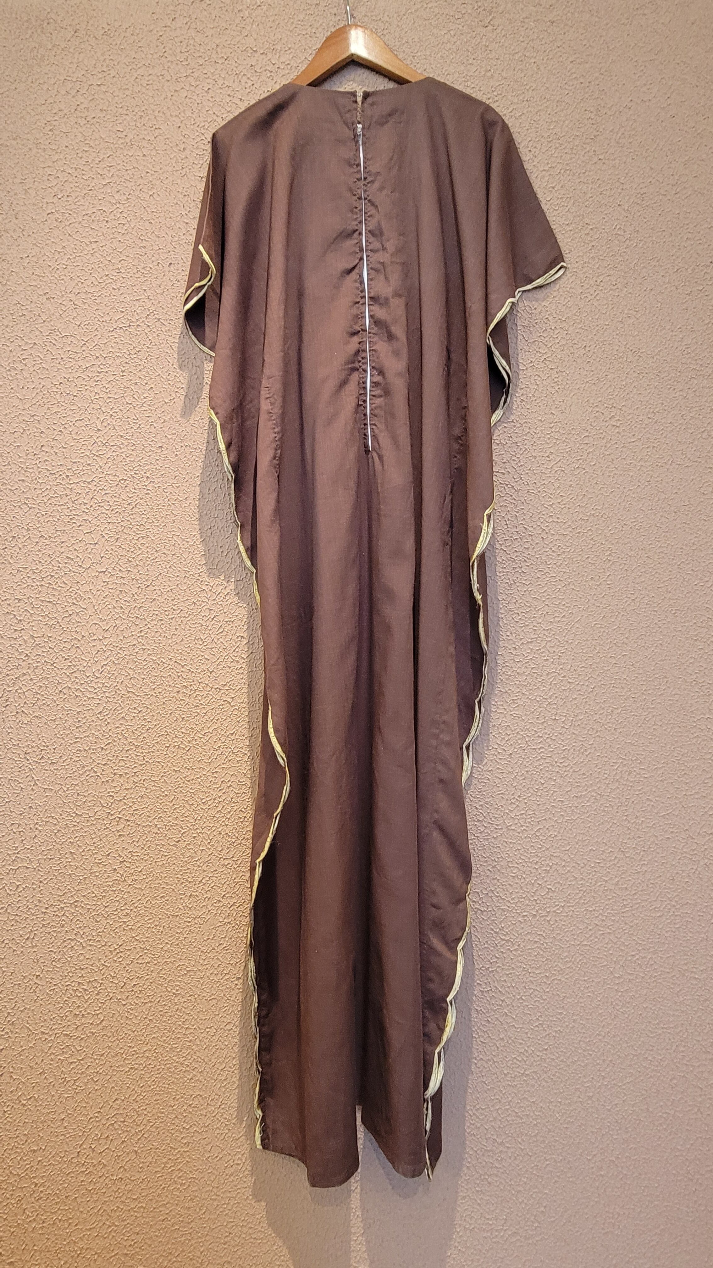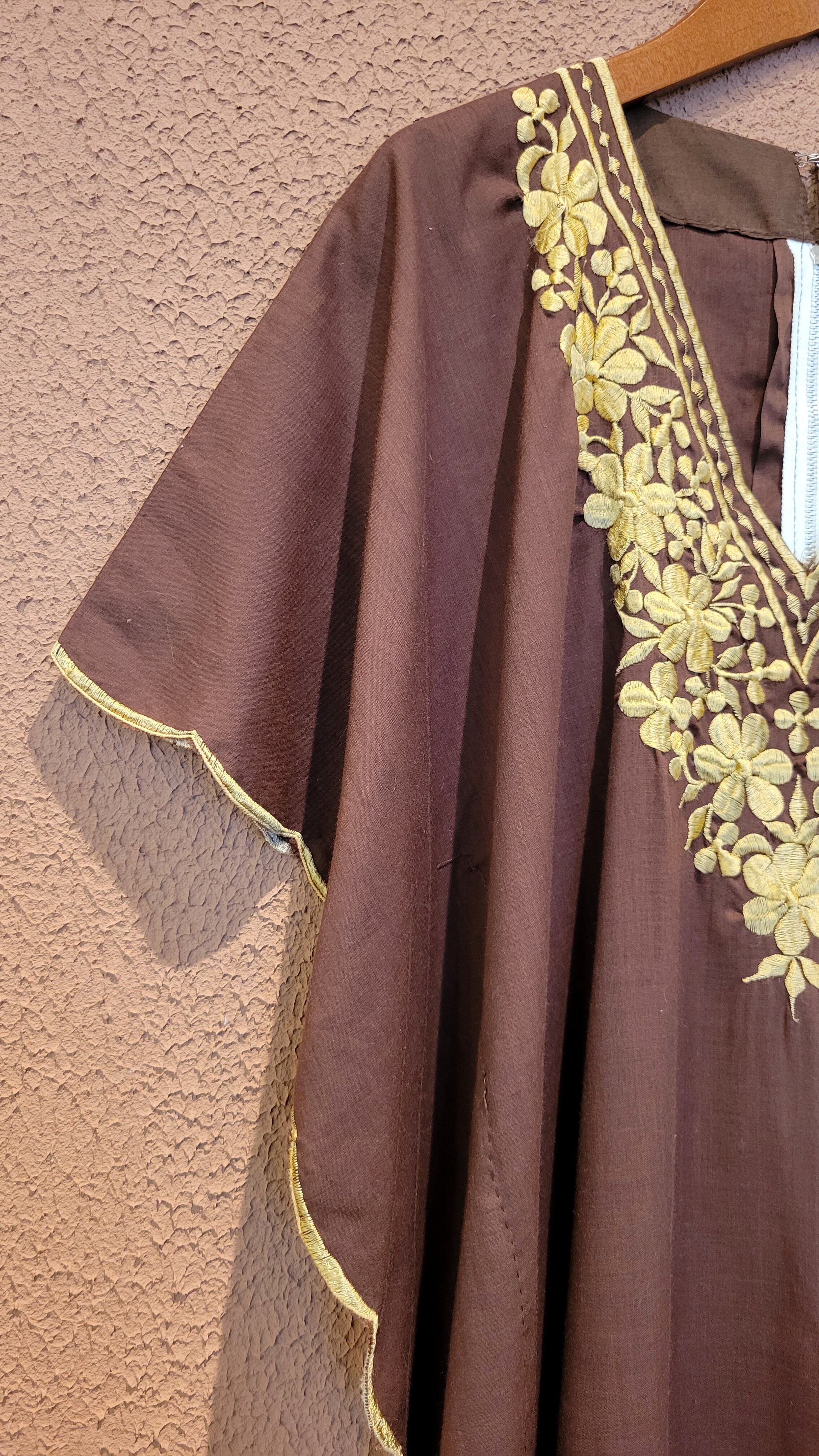 フィリピン刺繍のヴィンテージカフタンワンピース。素材表記はありませんが薄手のコットンとポリエステルの混紡のようです。左右は裾まで縫われておりスカラップ刺繍の縁取りが施されています。バックファスナー付き。縦のラインが綺麗なすっきりシルエット。締め付け感が無く楽な着心地です。丈詰め可能なデザインです。