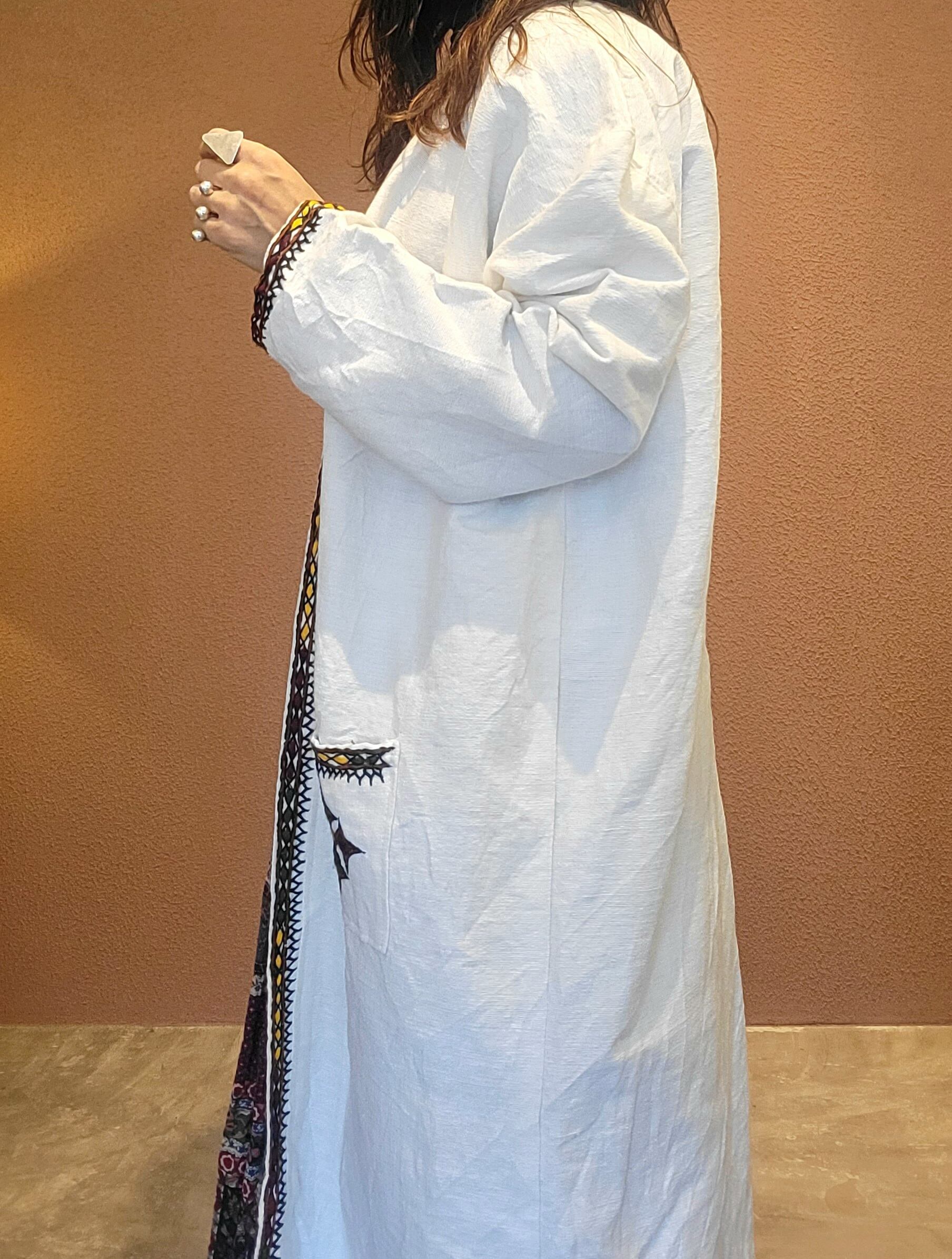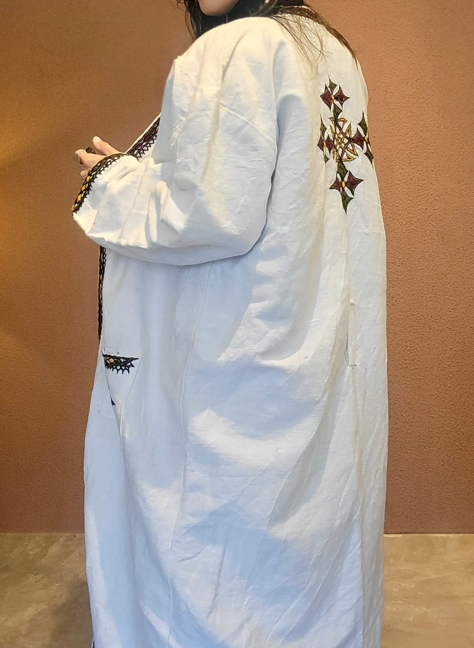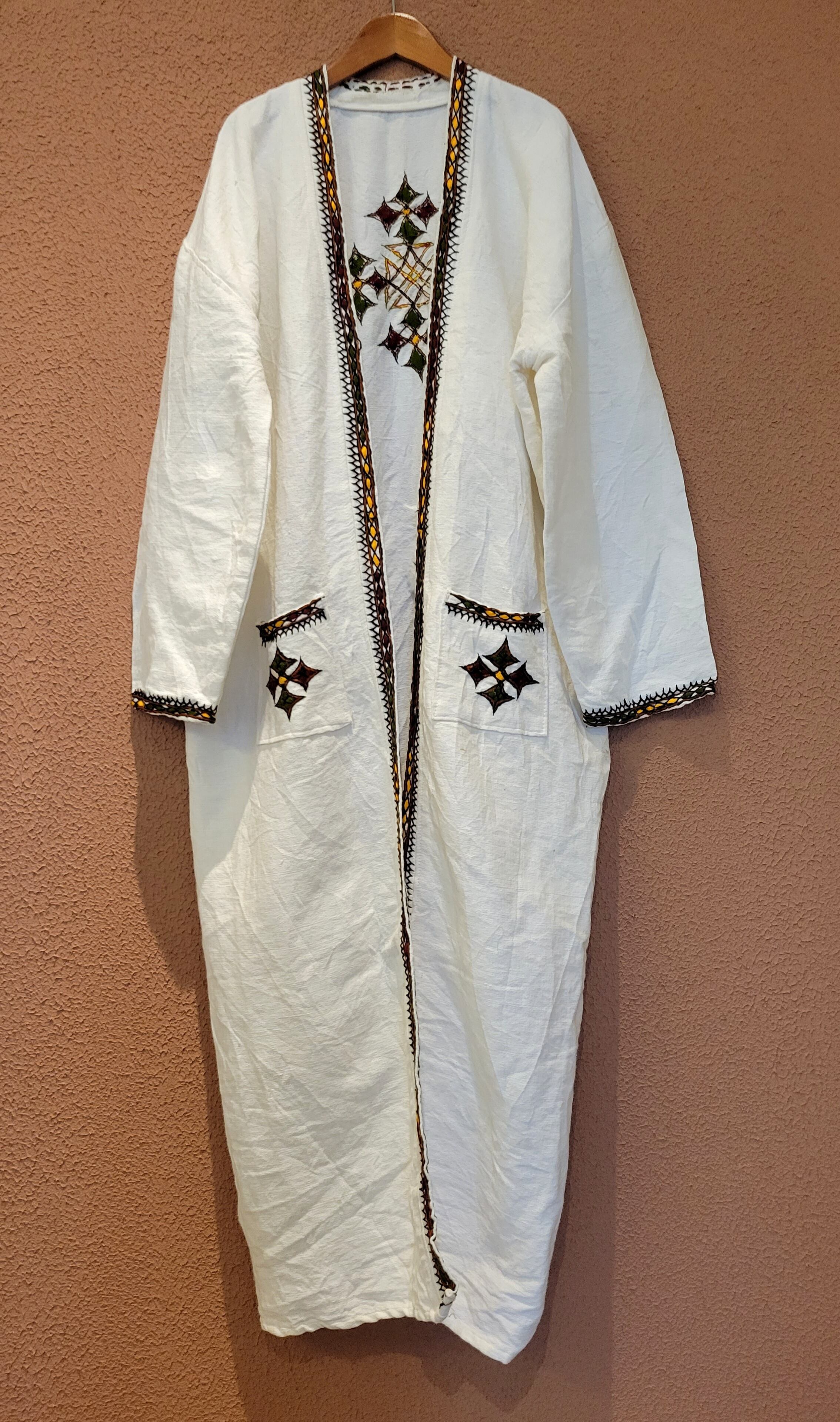 刺繍入りヴィンテージガウン。素材はやや張り感のあるコットンです。フロントオープンでサイズフリー。シーズン問わず長く着られるアイテムです。さっと羽織って雰囲気の出る1枚。