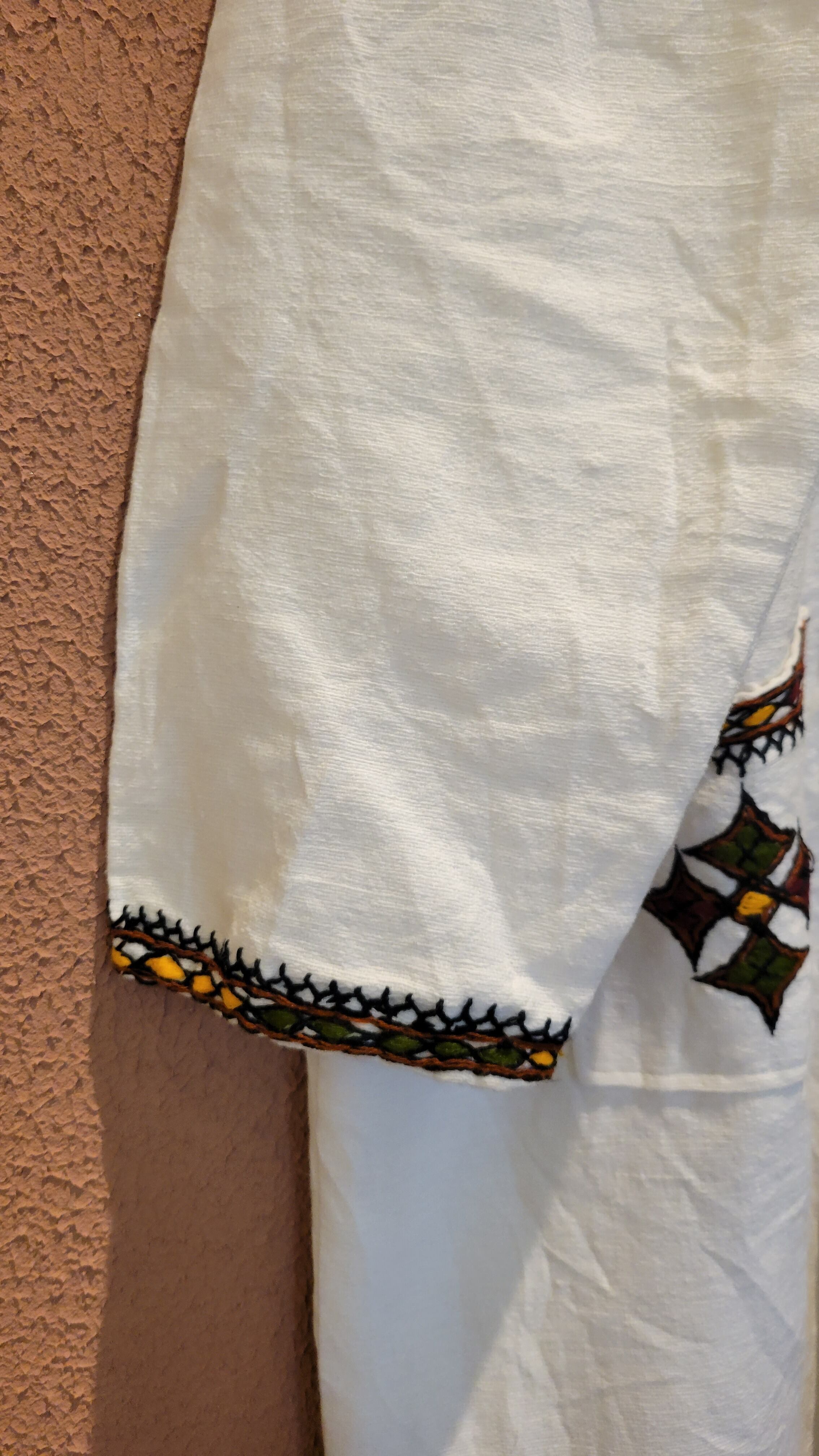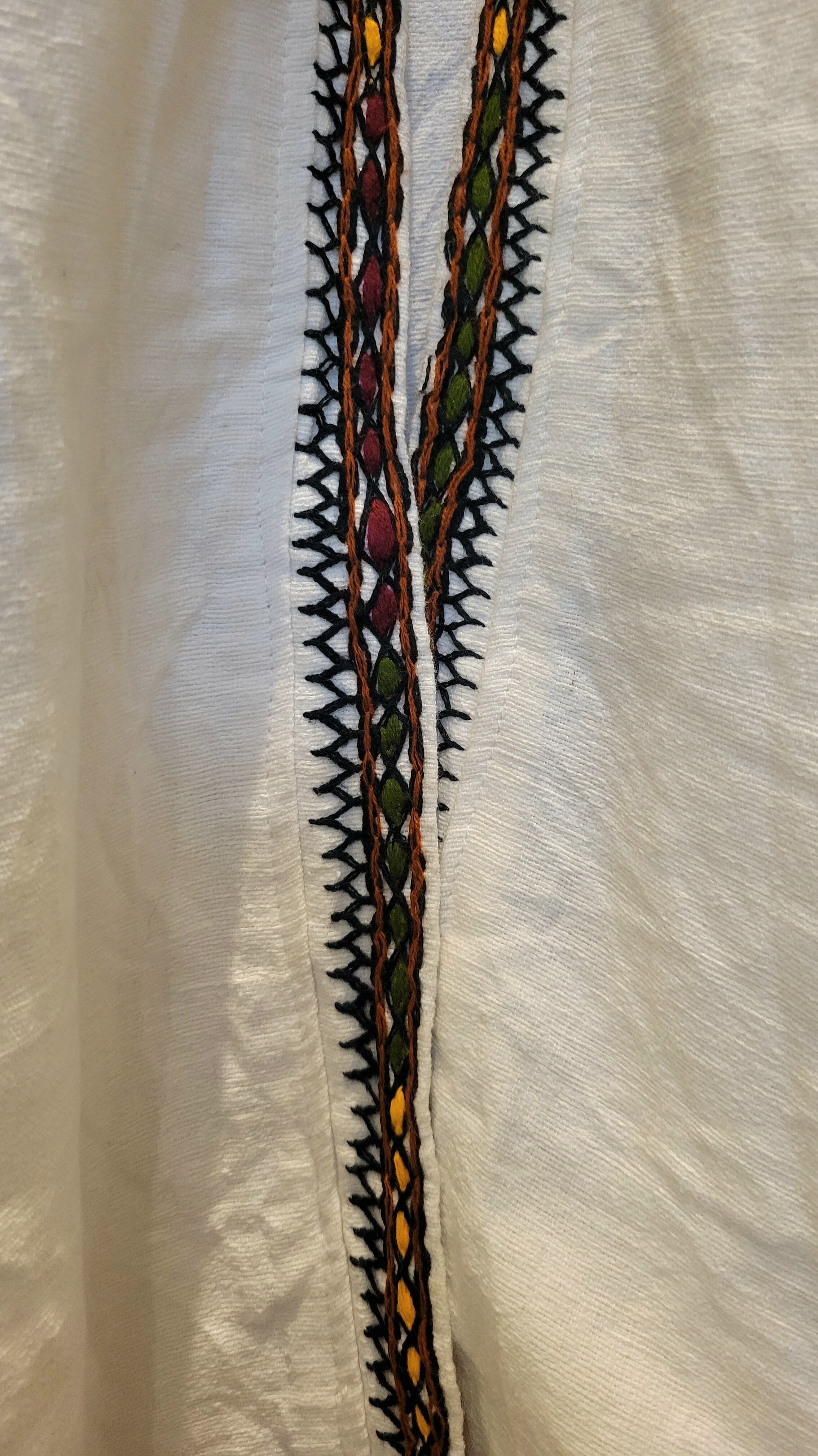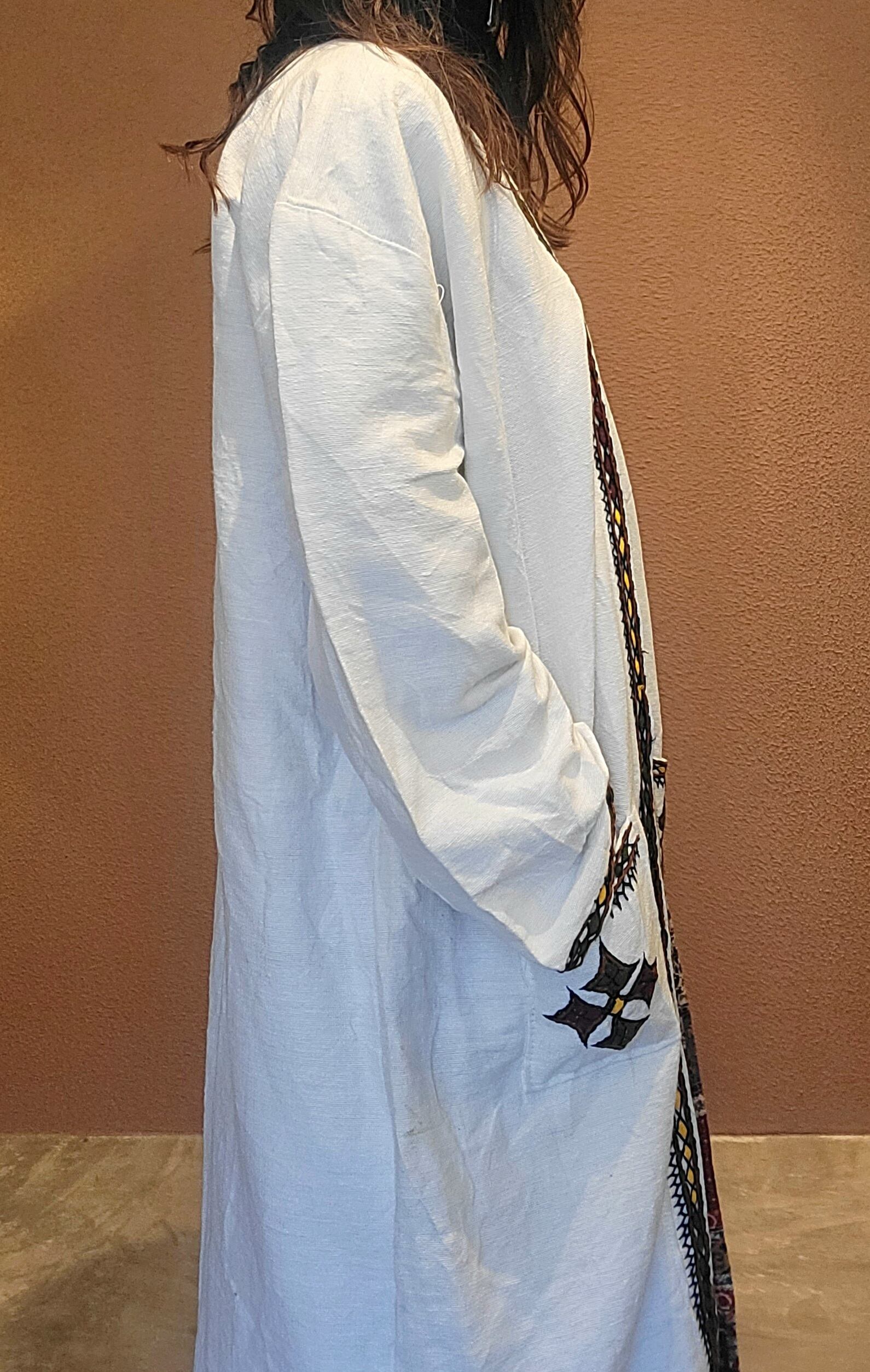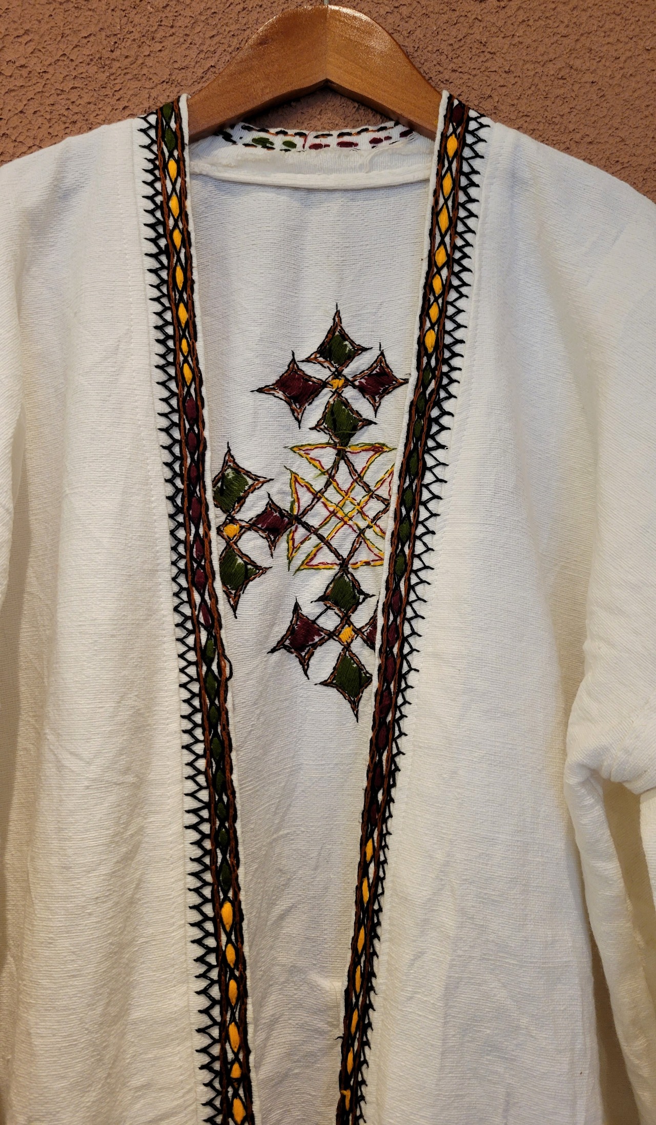 刺繍入りヴィンテージガウン。素材はやや張り感のあるコットンです。フロントオープンでサイズフリー。シーズン問わず長く着られるアイテムです。さっと羽織って雰囲気の出る1枚。