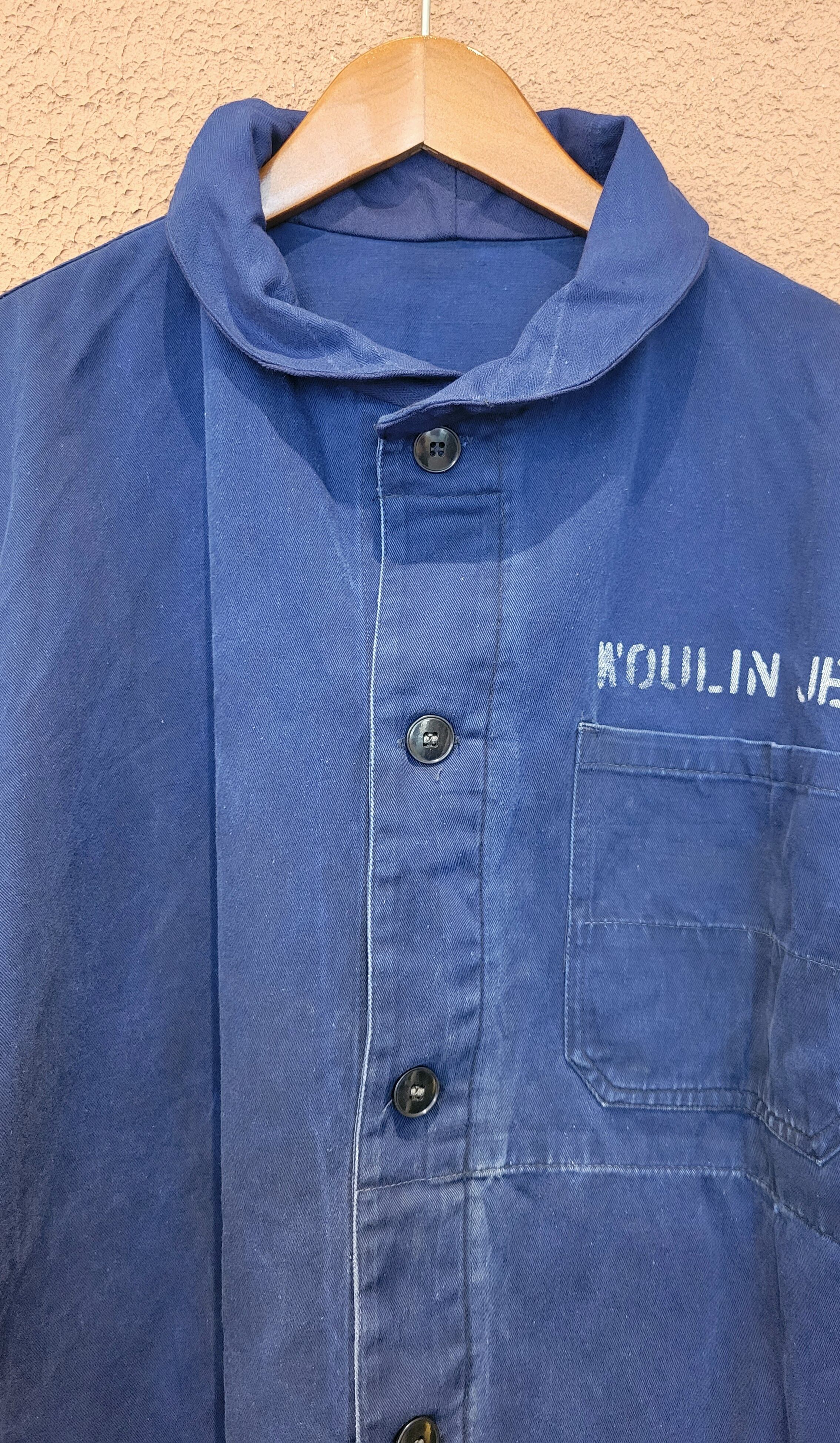 Used ユーロワークジャケット。素材表記はありませんがコットンのようです。ステンシルの文字と襟部分は後からプチリメイクされたものです。メンズサイズですが女性がオーバーサイズで着てもこなれた雰囲気。男女兼用でおすすめです。*実際の色は着用画像に最も近いです。
