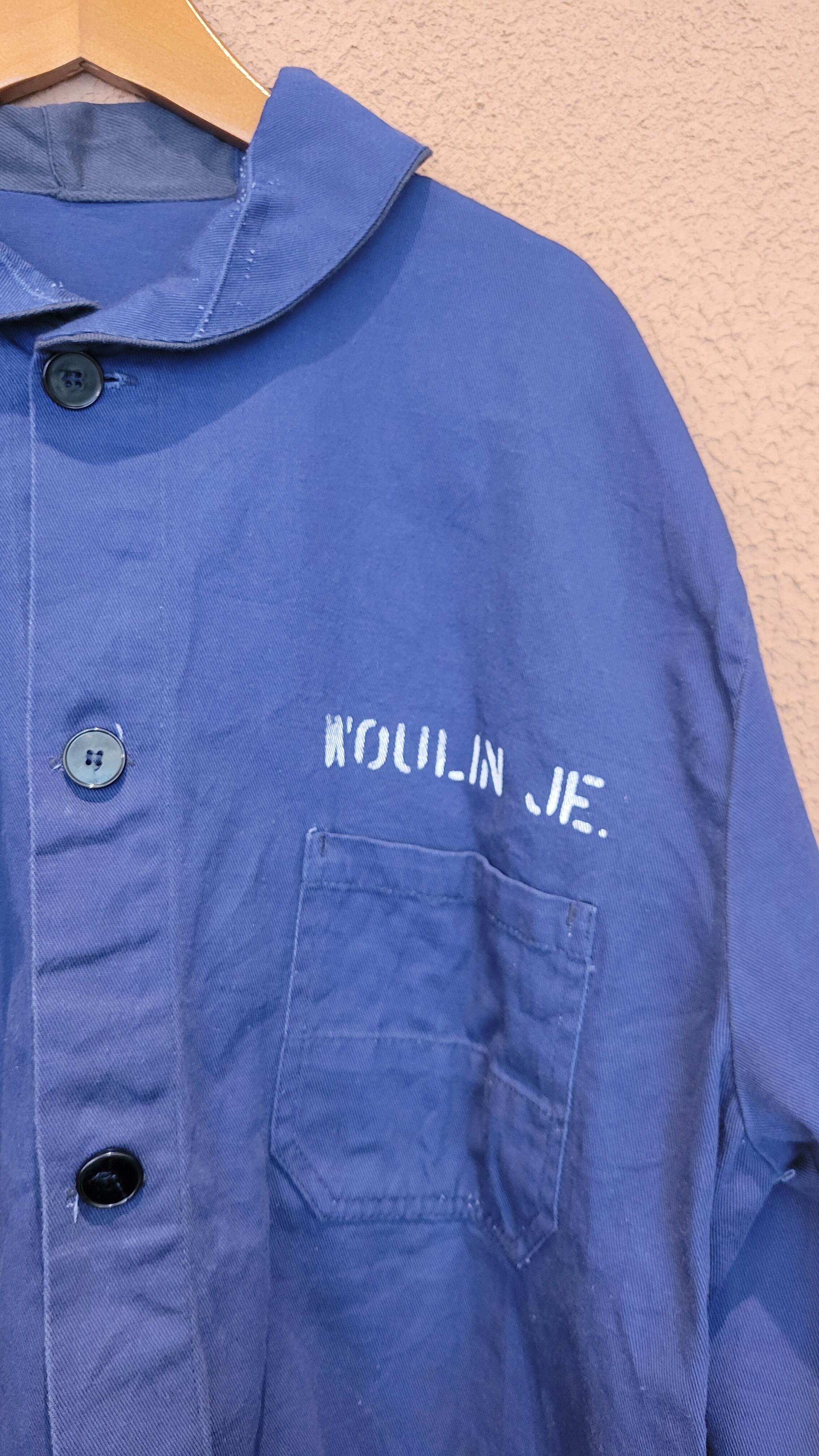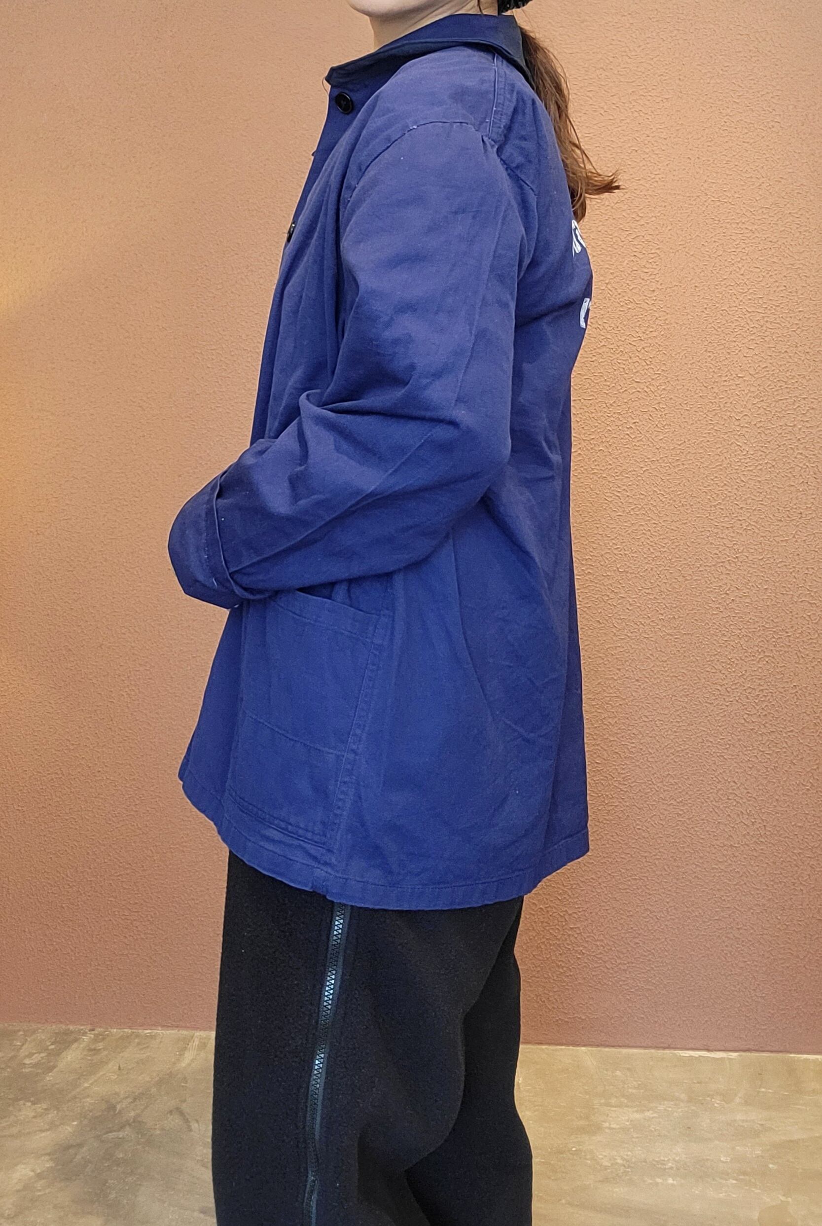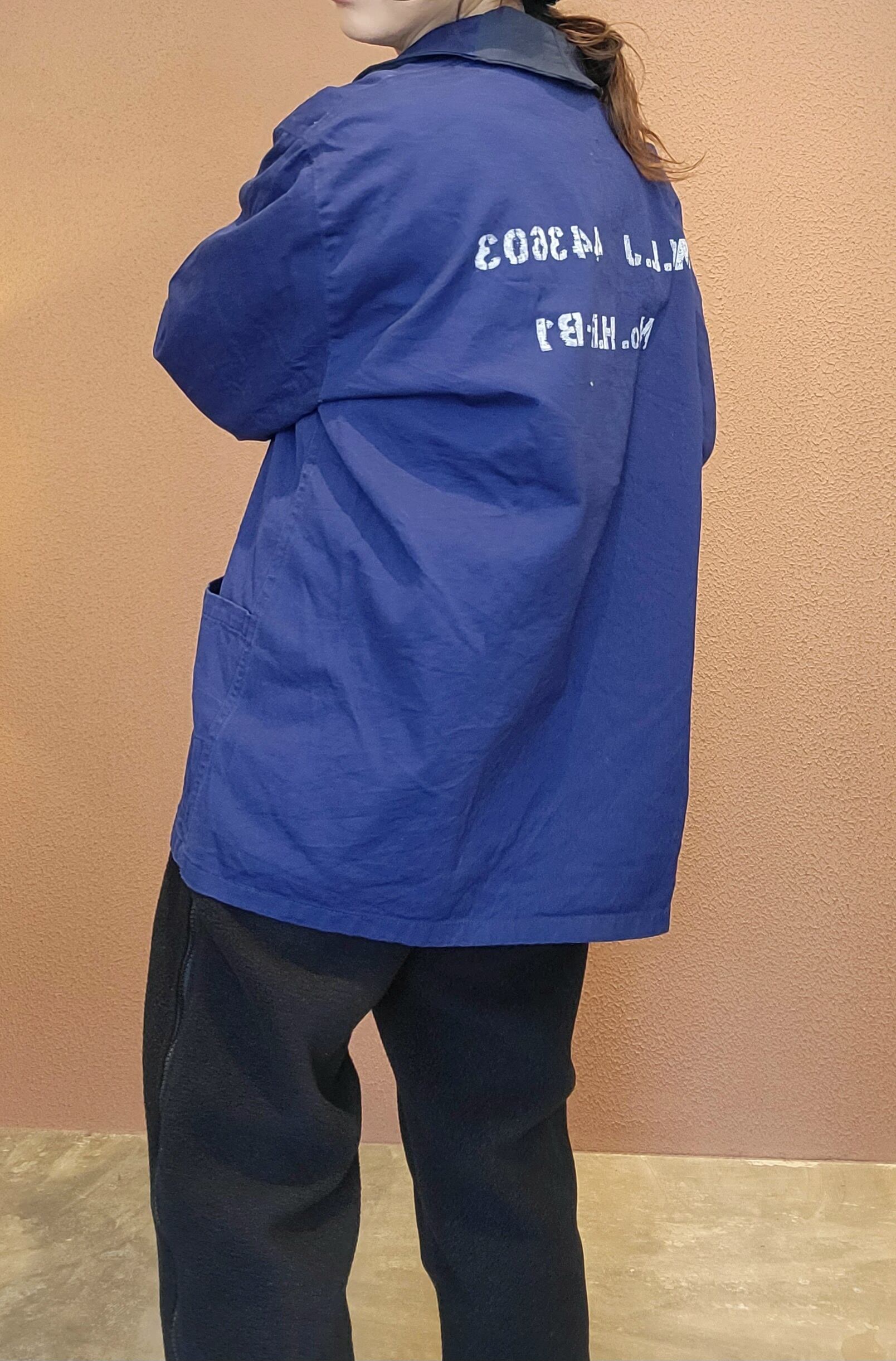 Used ユーロワークジャケット。素材表記はありませんがコットンのようです。ステンシルの文字と襟部分は後からプチリメイクされたものです。メンズサイズですが女性がオーバーサイズで着てもこなれた雰囲気。男女兼用でおすすめです。*実際の色は着用画像に最も近いです。