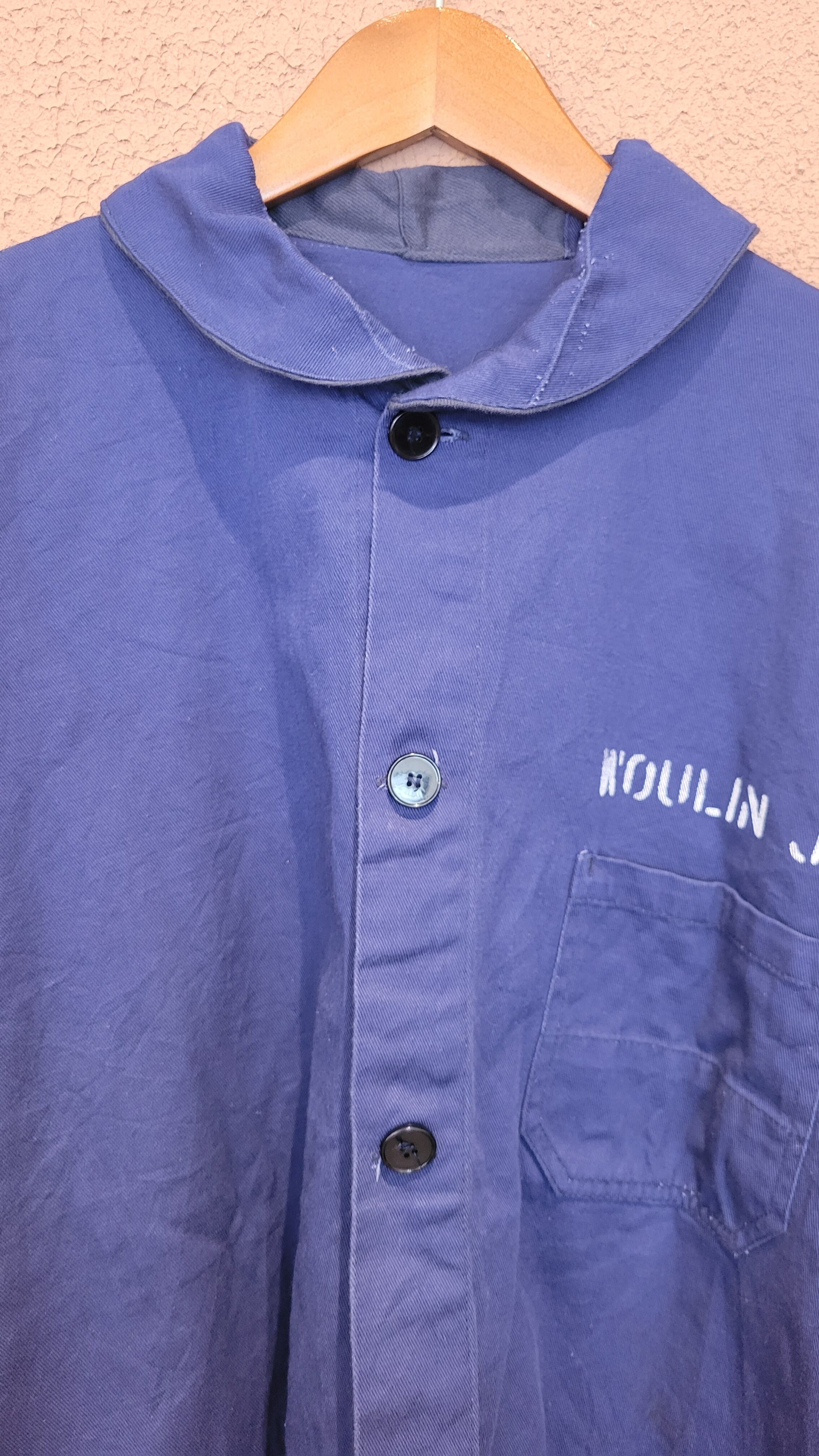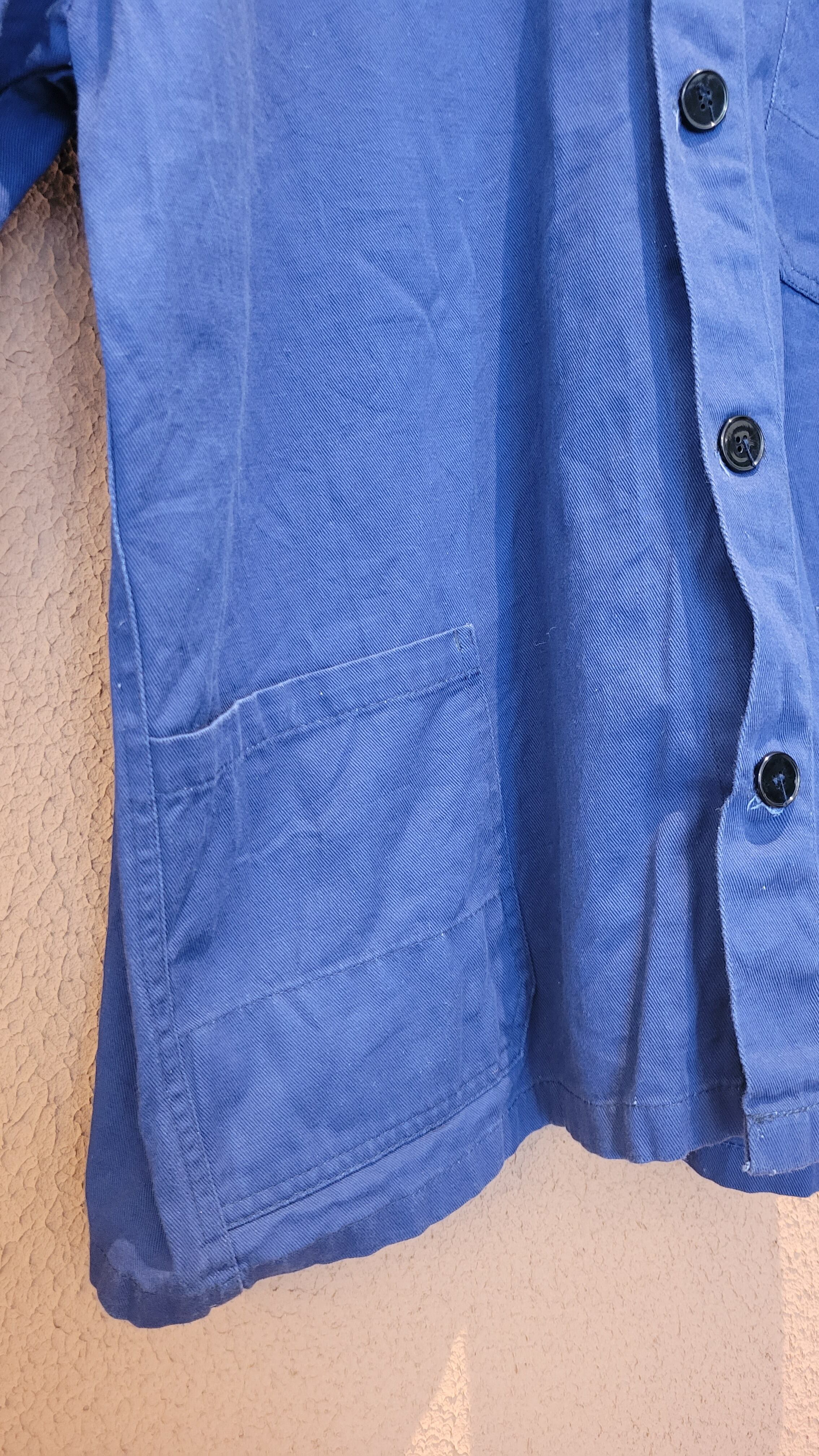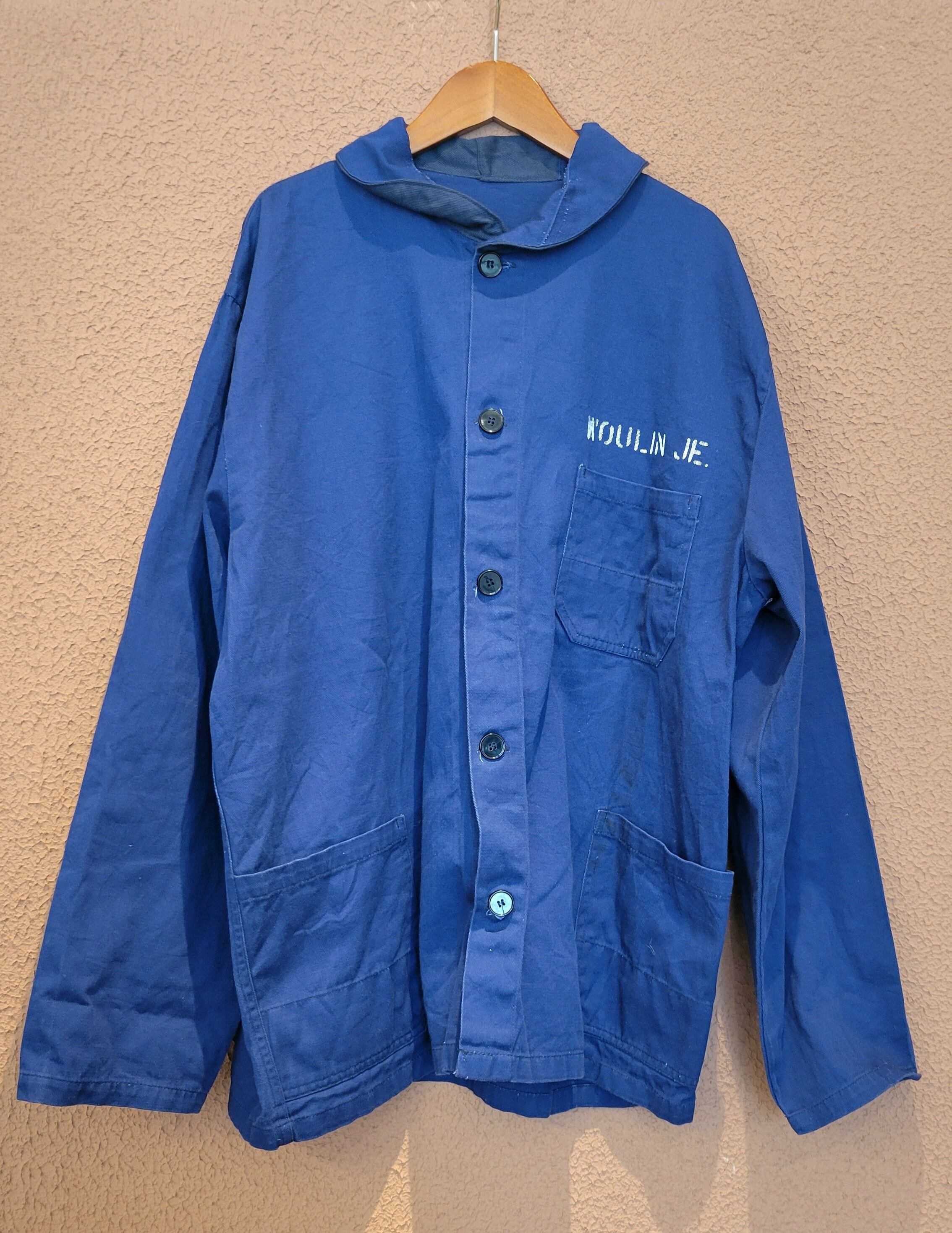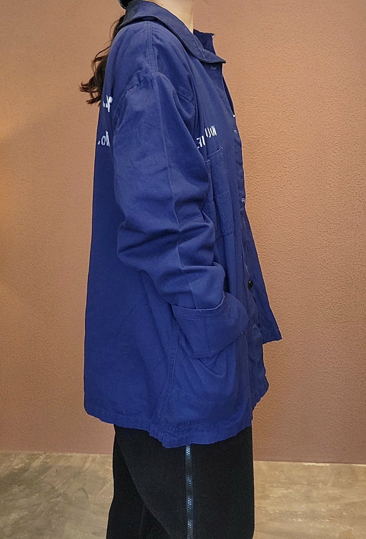 Used ユーロワークジャケット。素材表記はありませんがコットンのようです。ステンシルの文字と襟部分は後からプチリメイクされたものです。メンズサイズですが女性がオーバーサイズで着てもこなれた雰囲気。男女兼用でおすすめです。*実際の色は着用画像に最も近いです。