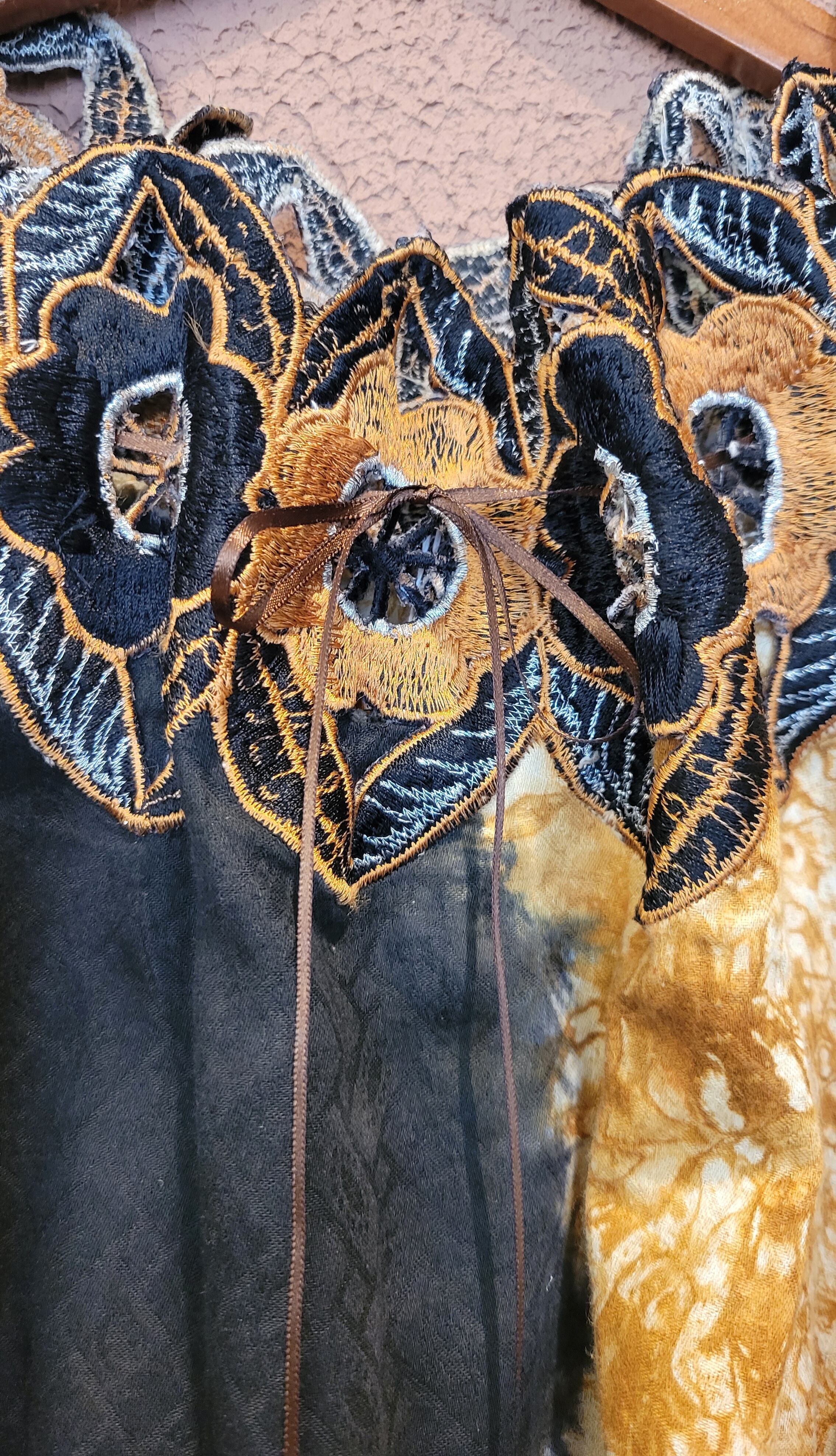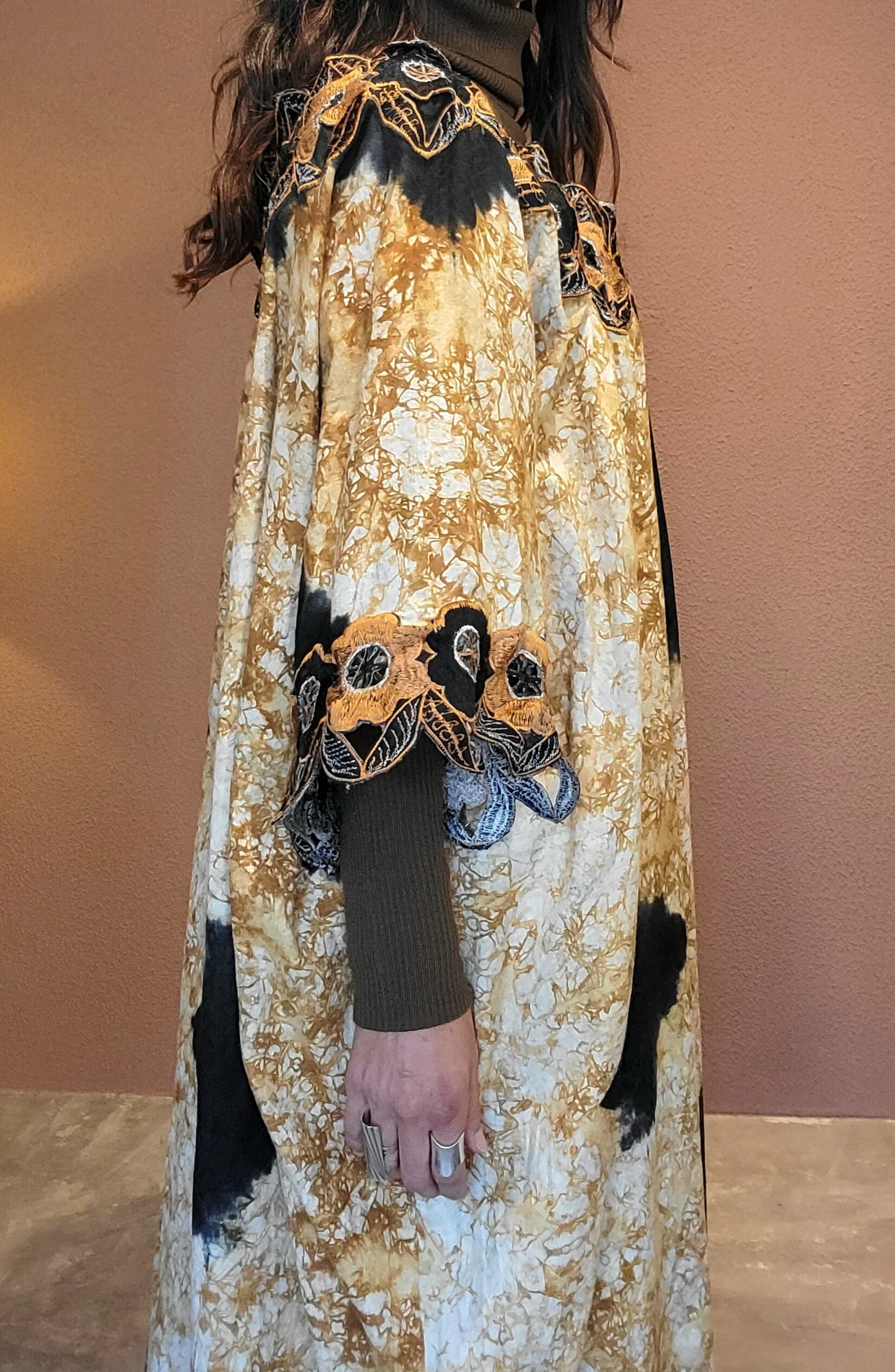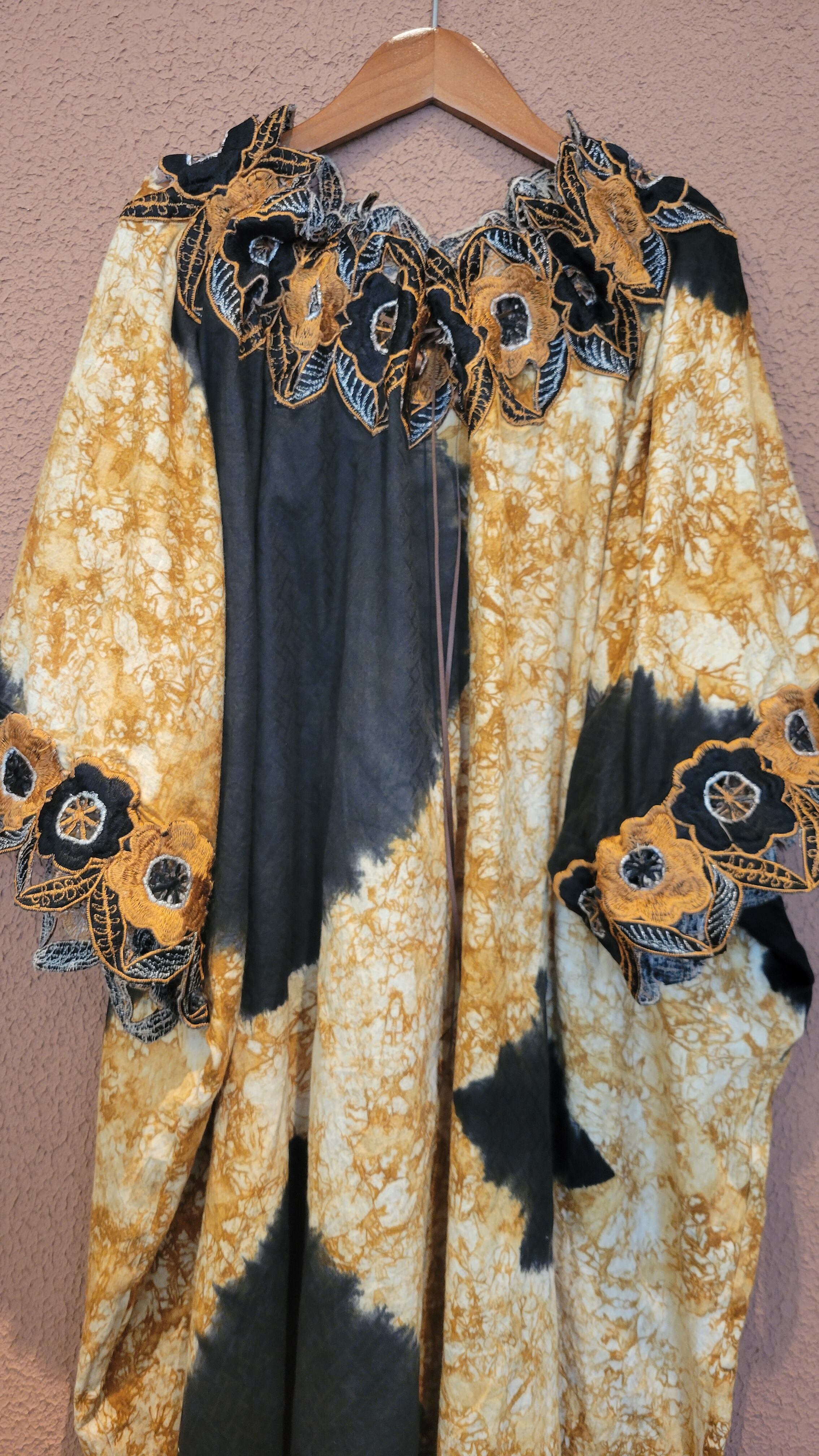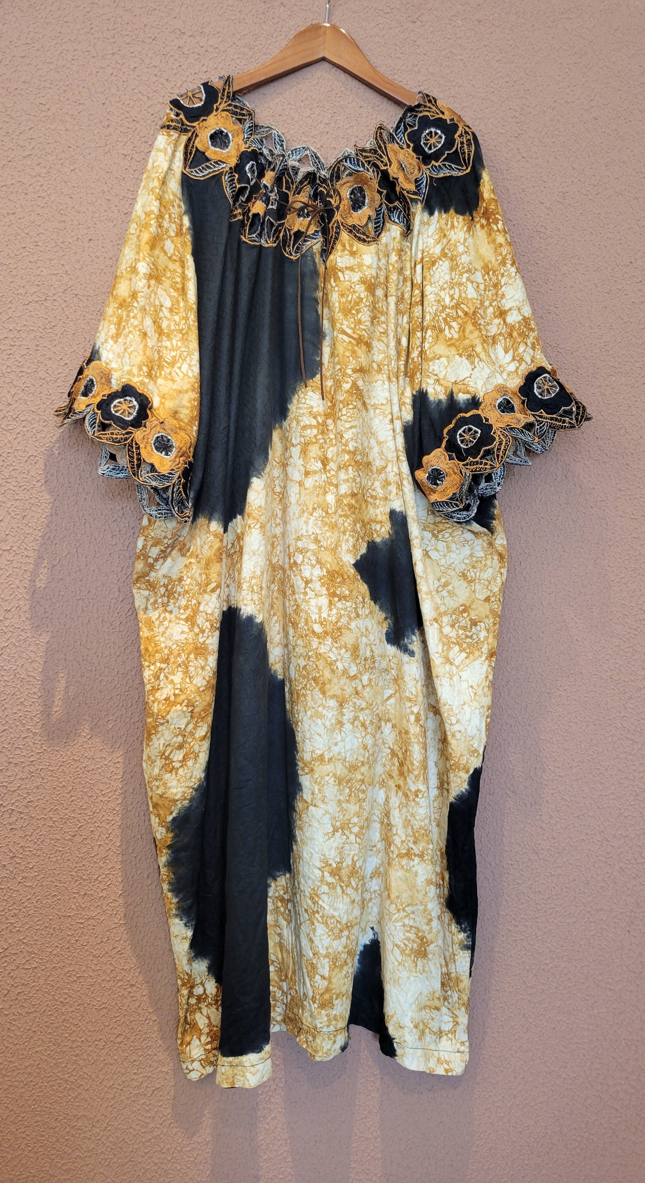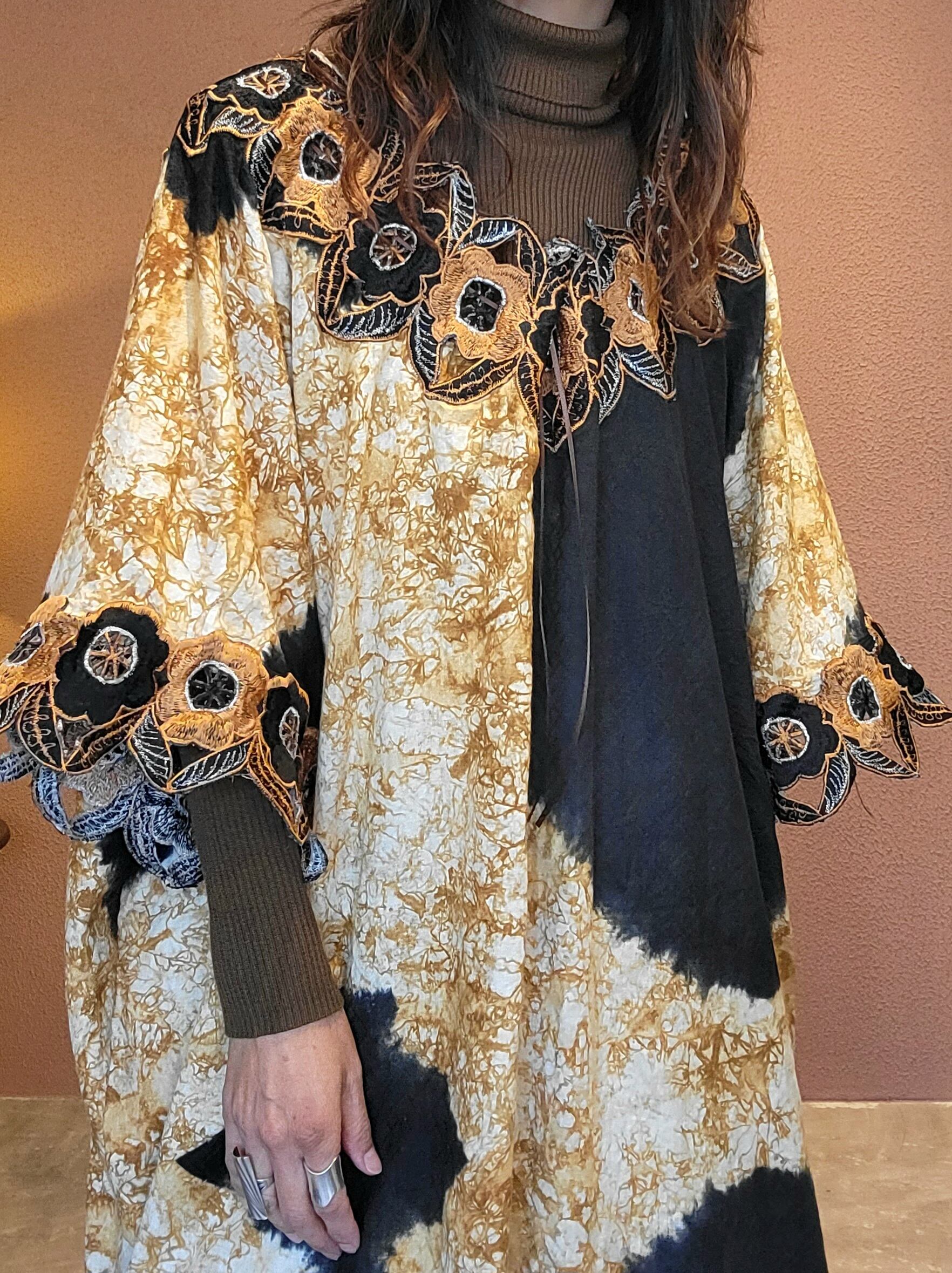 ヴィンテージのアフリカンワンピース。素材表記はありませんがコットンのようです。元々はかなり大きなサイズのものを、デコルテに紐を通して絞ることでサイズ調整して着用できるようにしています。デコルテと袖口にカットワーク刺繍入りです。ダイナミックなデザインながら渋めのカラーで気負わず着られる1枚です。*カットワーク部分に数ヶ所ダメージがあります。画像でご確認ください。着用に支障のあるものではありませんが、ヴィンテージにご理解のおありの方へおすすめいたします。