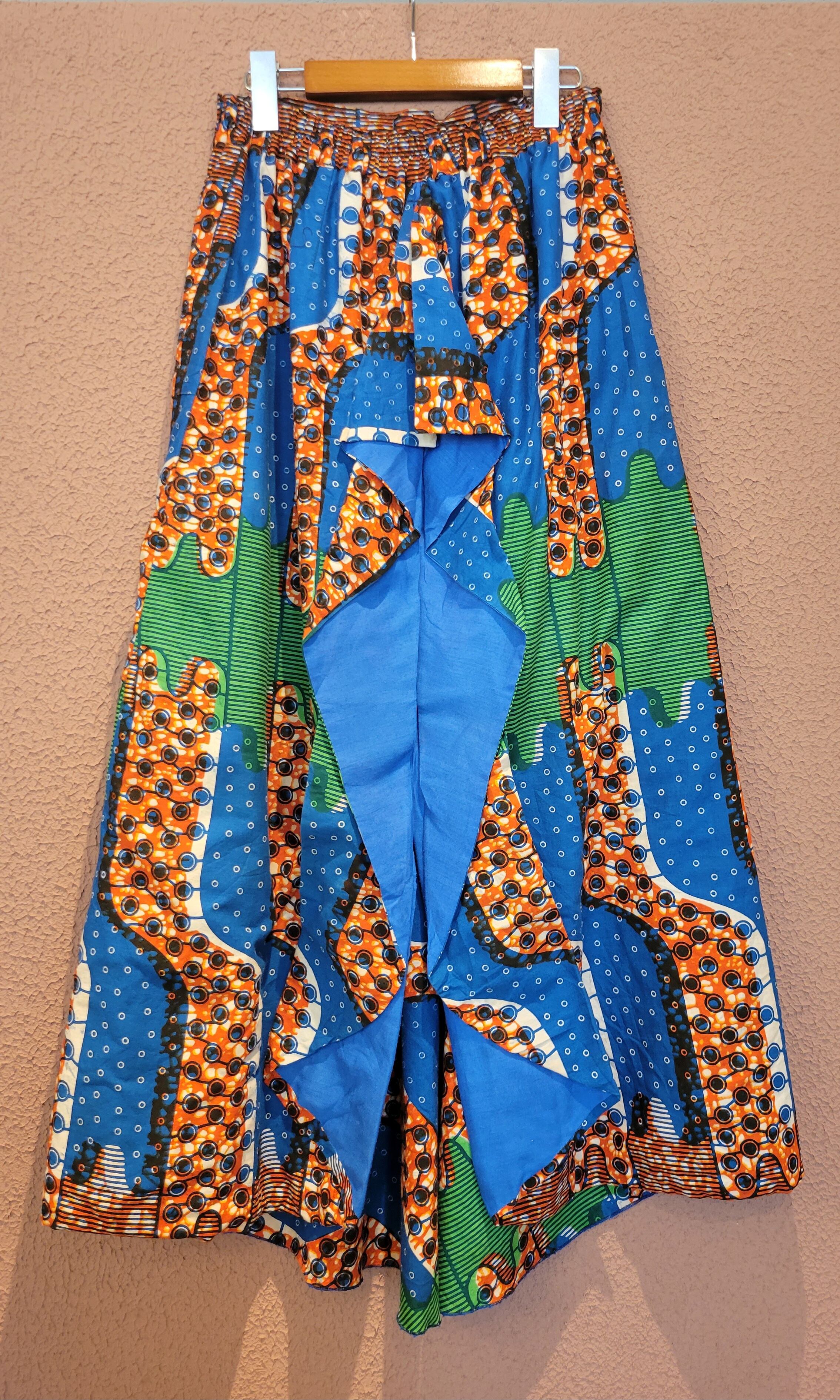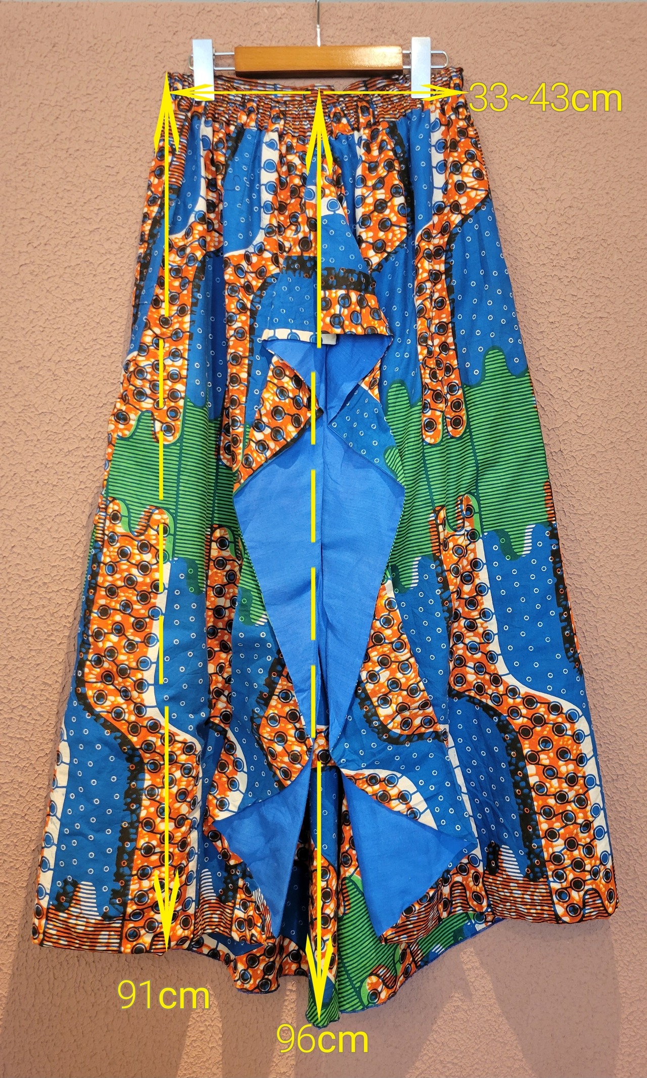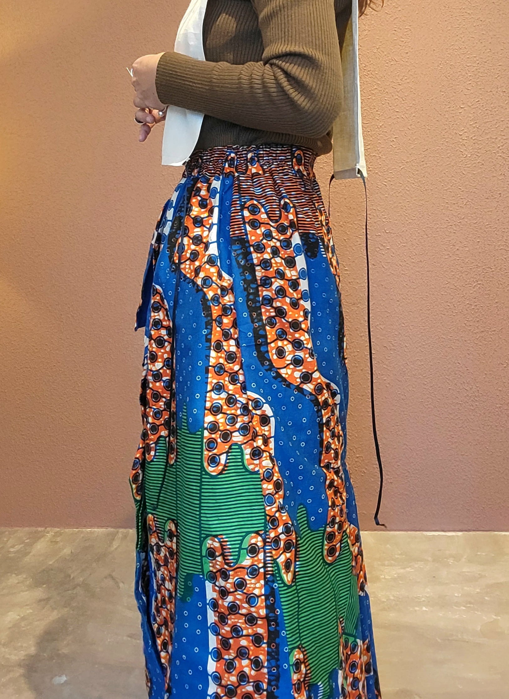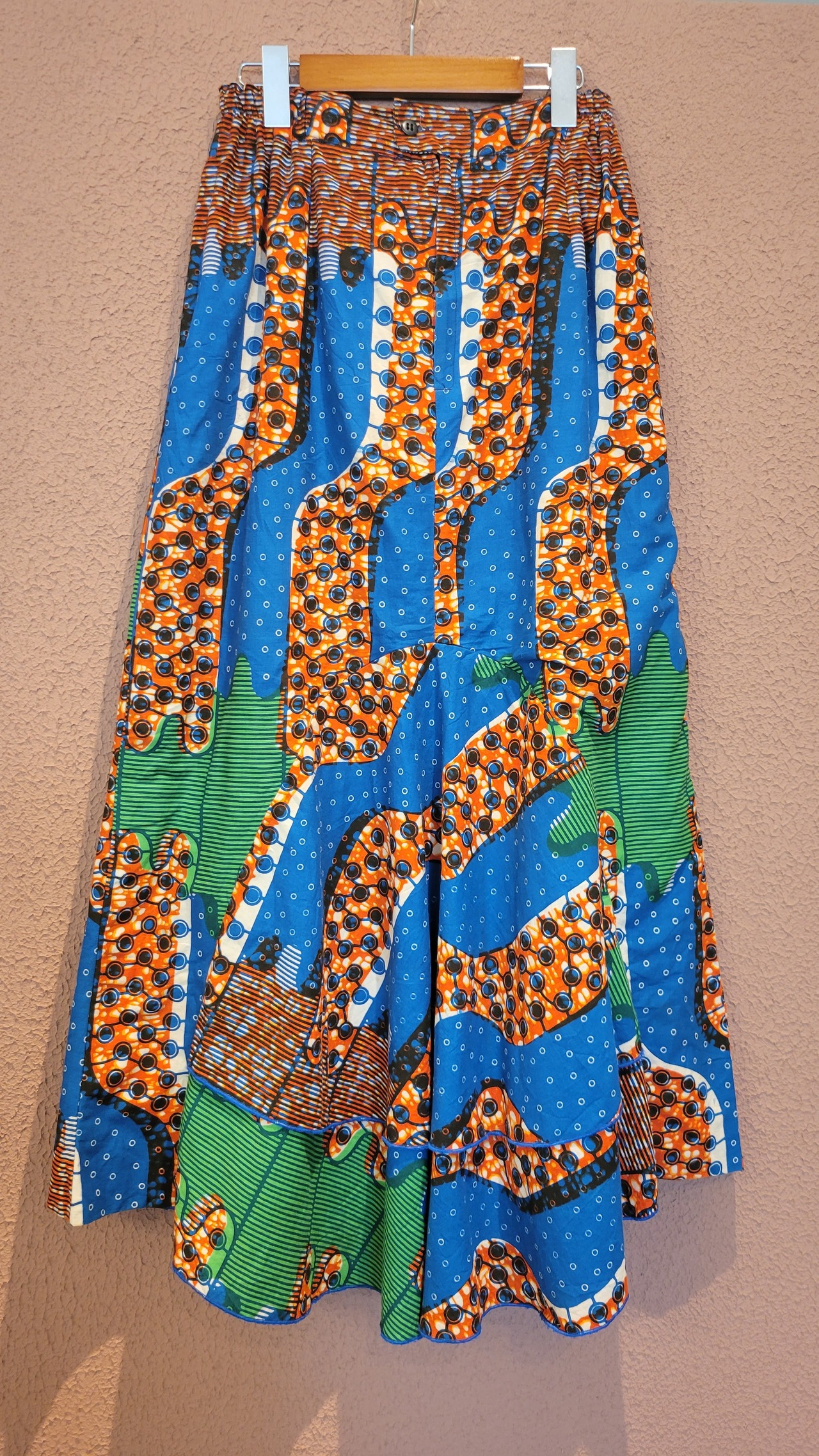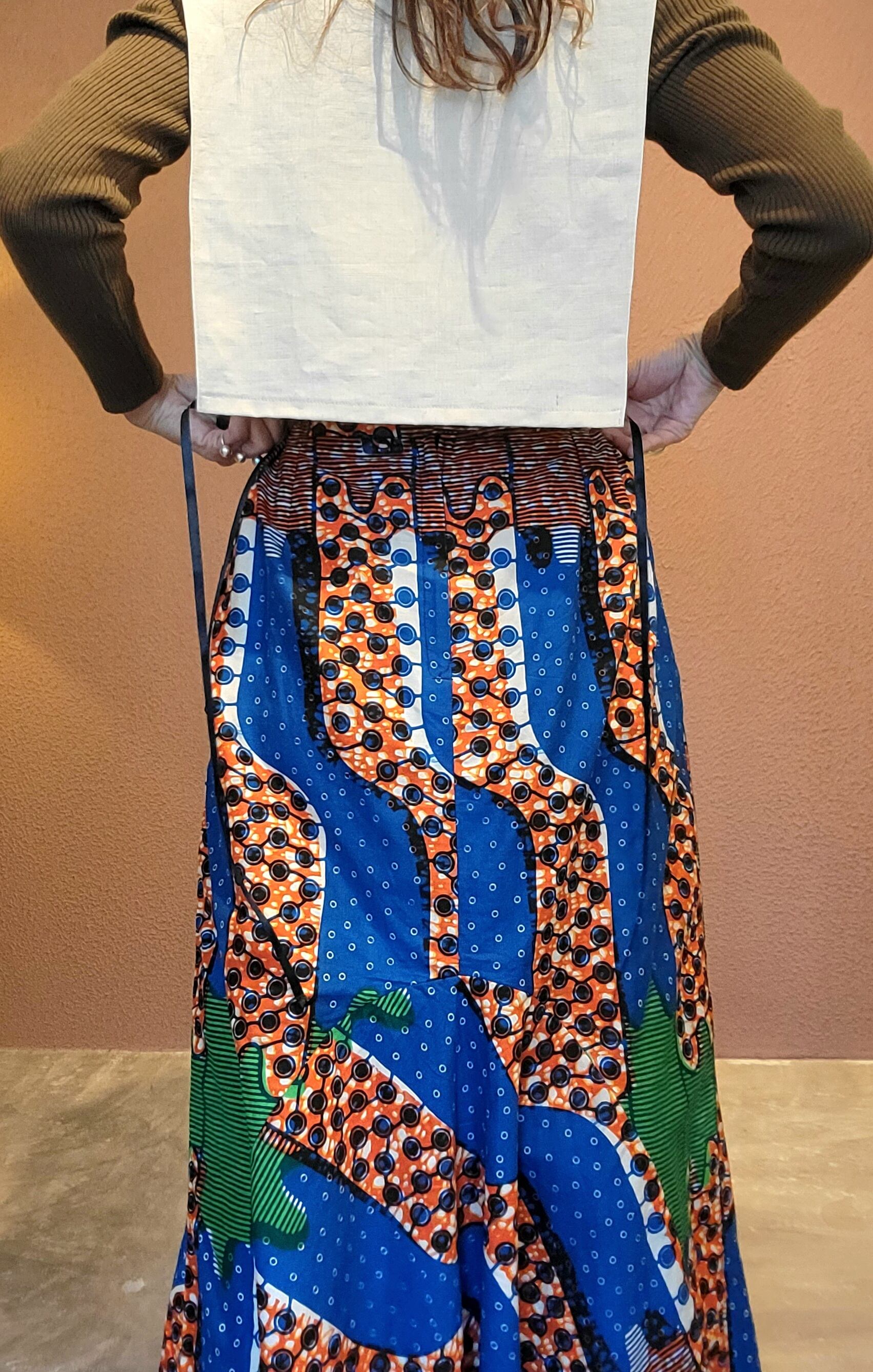ヴィンテージのアフリカンバティックマキシスカート。後ろのみウエストゴムです。後ろにボタンとジッパーが付いています。フロントセンターの折り紙のようなディテールが印象的です。