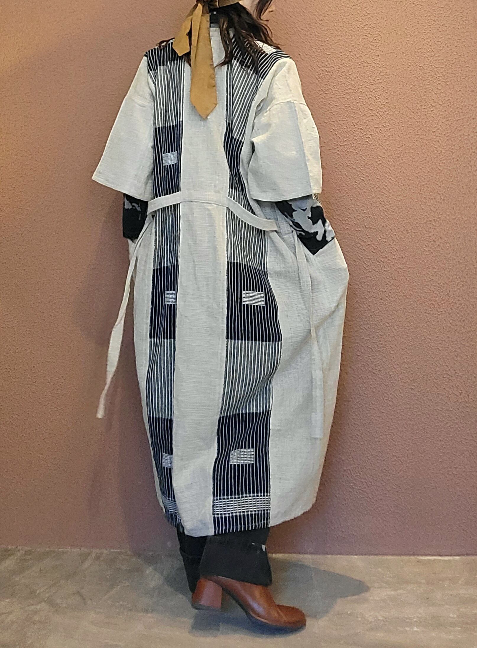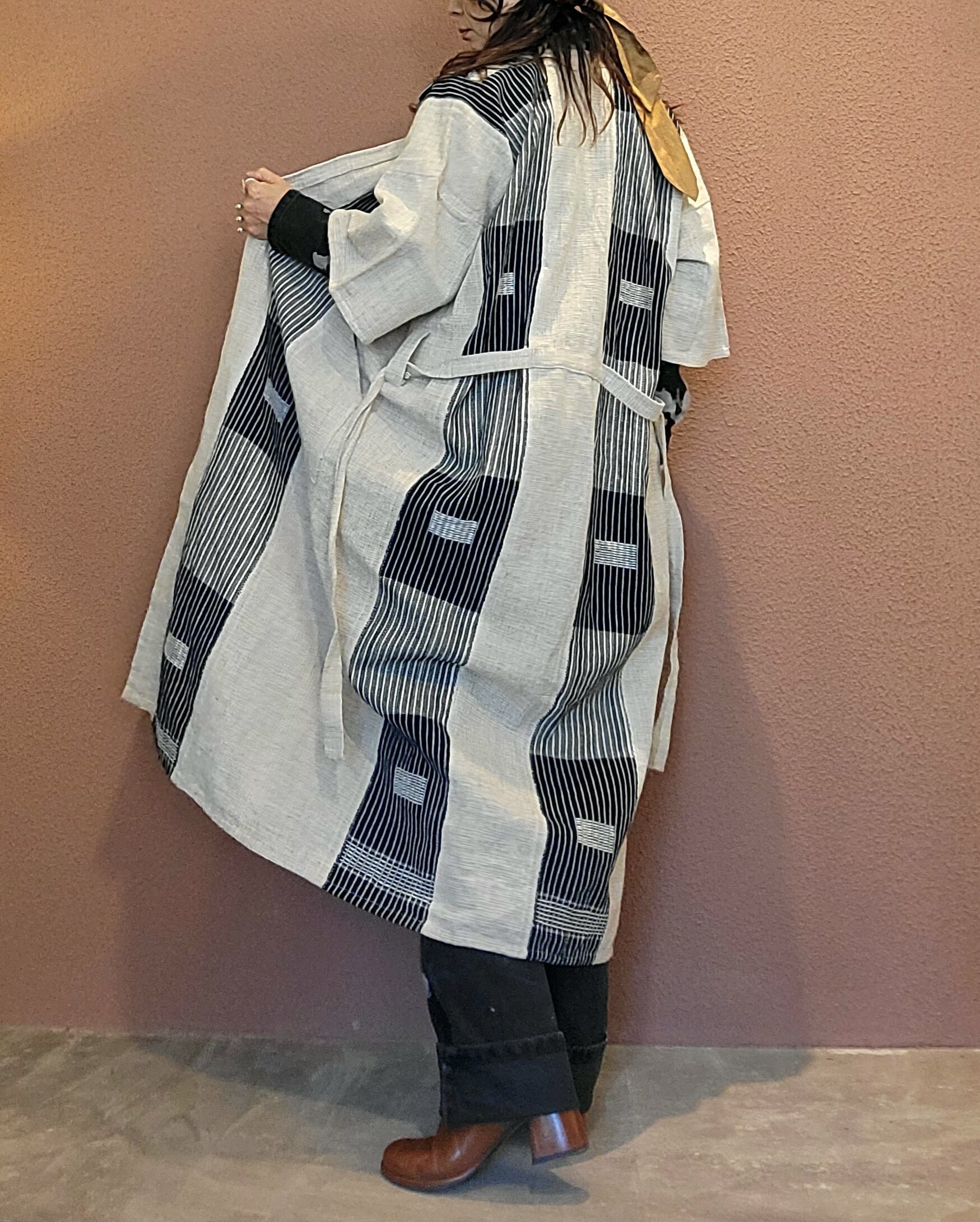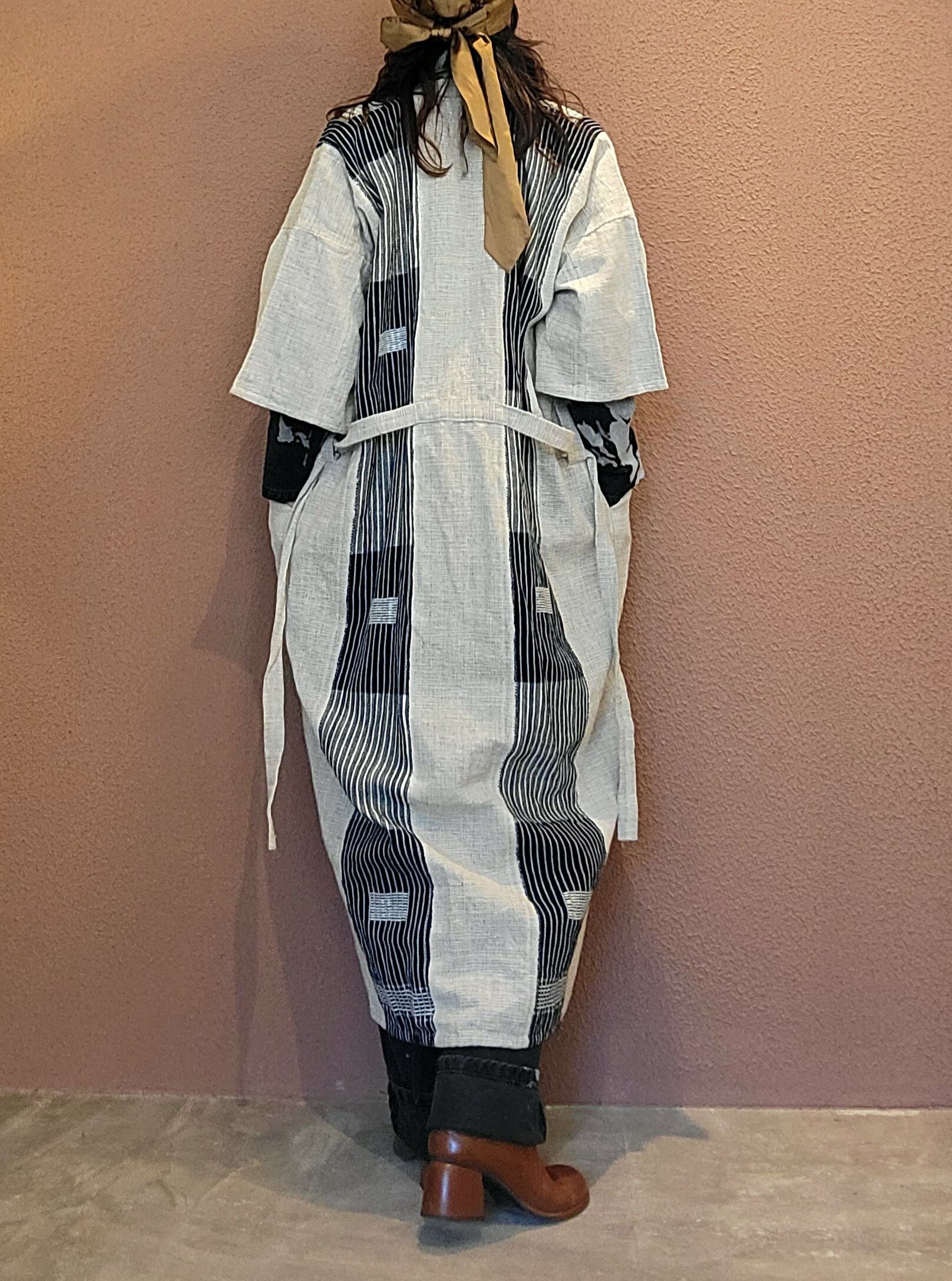 ヴィンテージのロングガウン。素材表記はありませんがコットンのようです。共布のベルトは後ろ身頃の中心で縫い付けられています。ざっくりした風合いと柄が良い雰囲気。さっと羽織ってこなれ感の出るオープンガウンです。