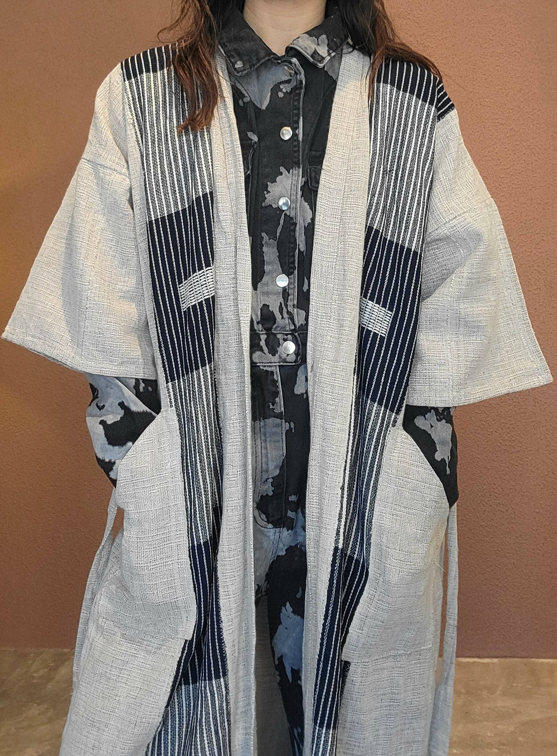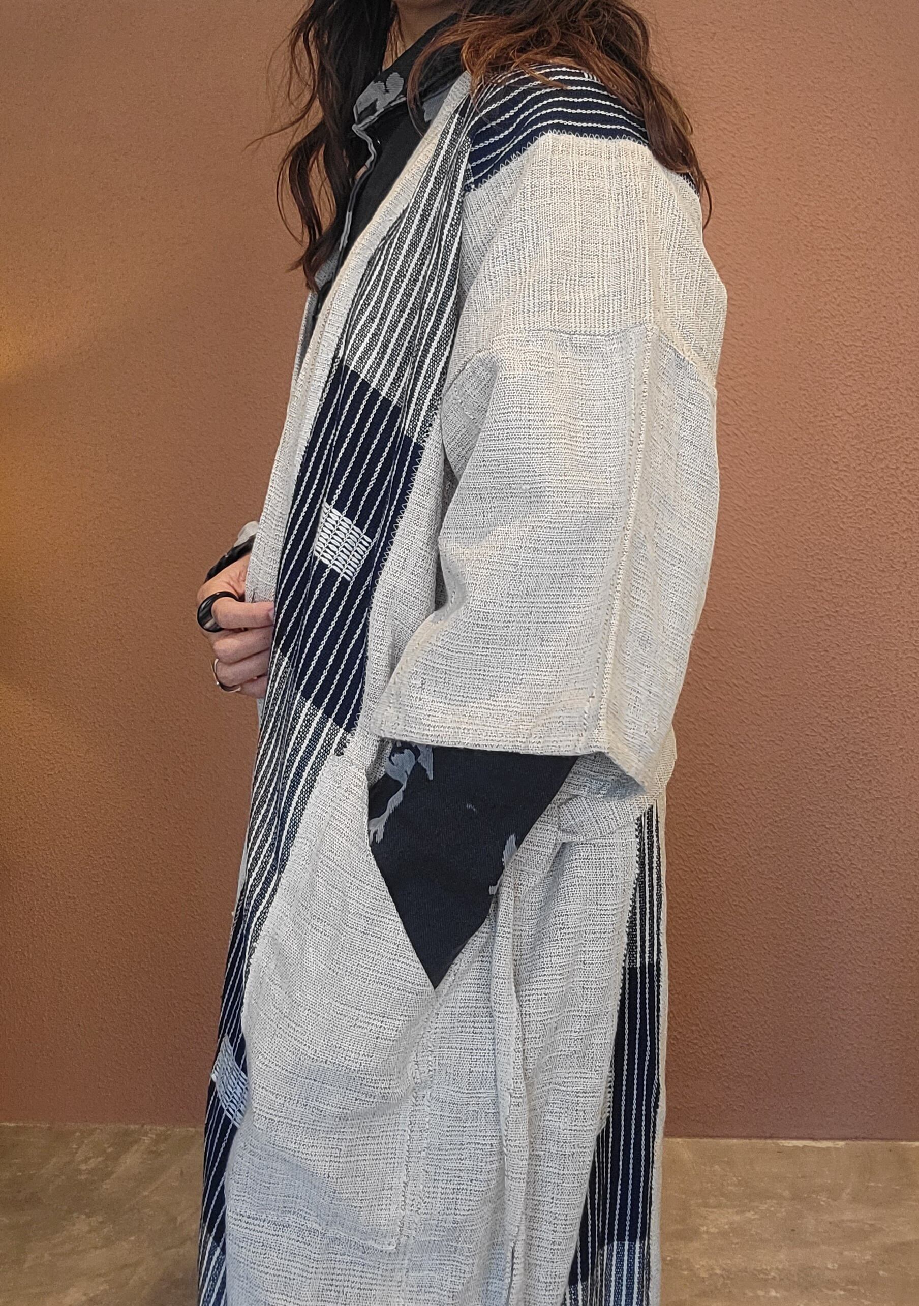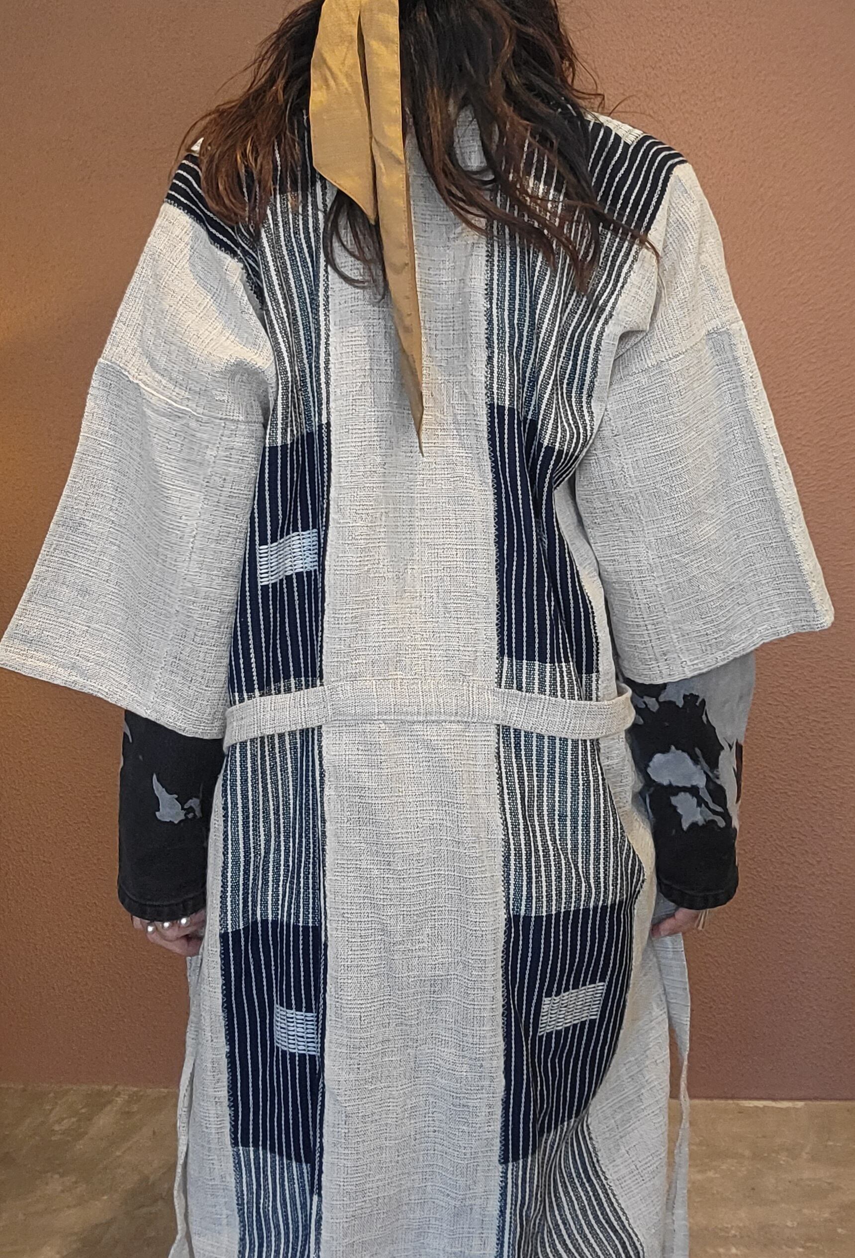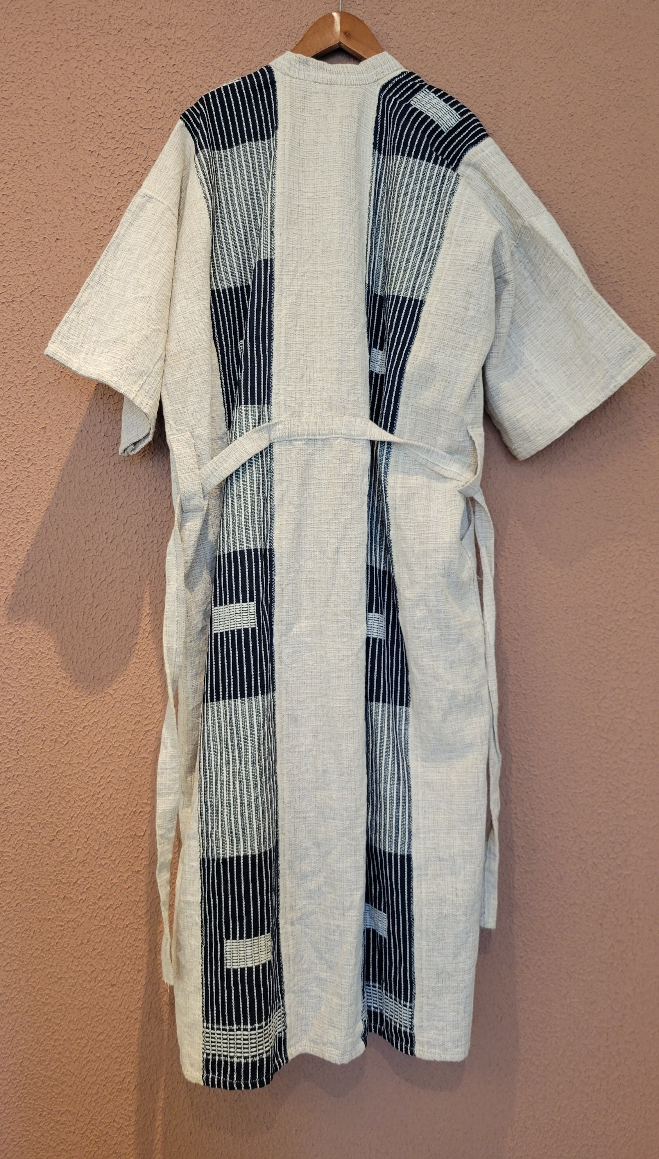 ヴィンテージのロングガウン。素材表記はありませんがコットンのようです。共布のベルトは後ろ身頃の中心で縫い付けられています。ざっくりした風合いと柄が良い雰囲気。さっと羽織ってこなれ感の出るオープンガウンです。