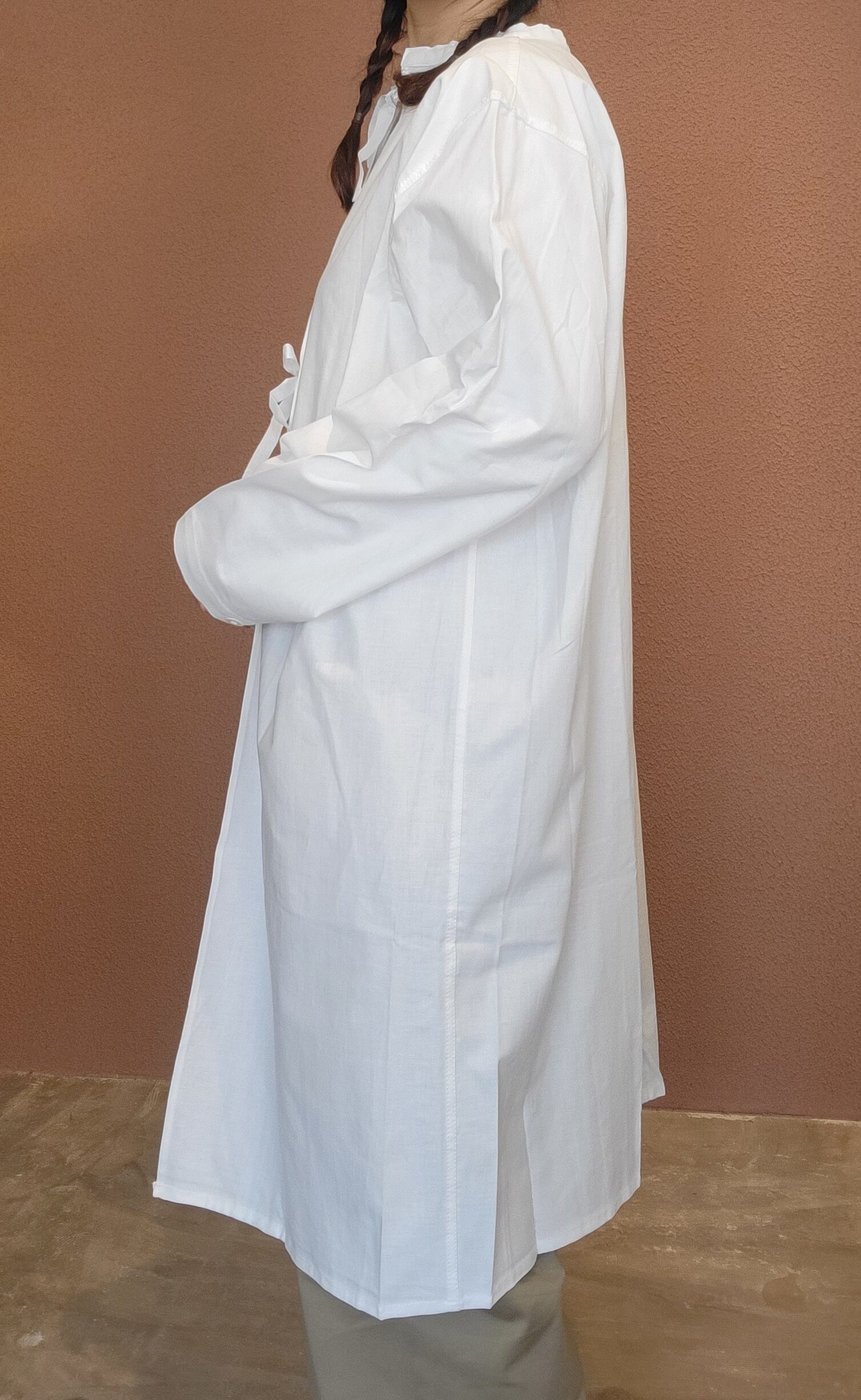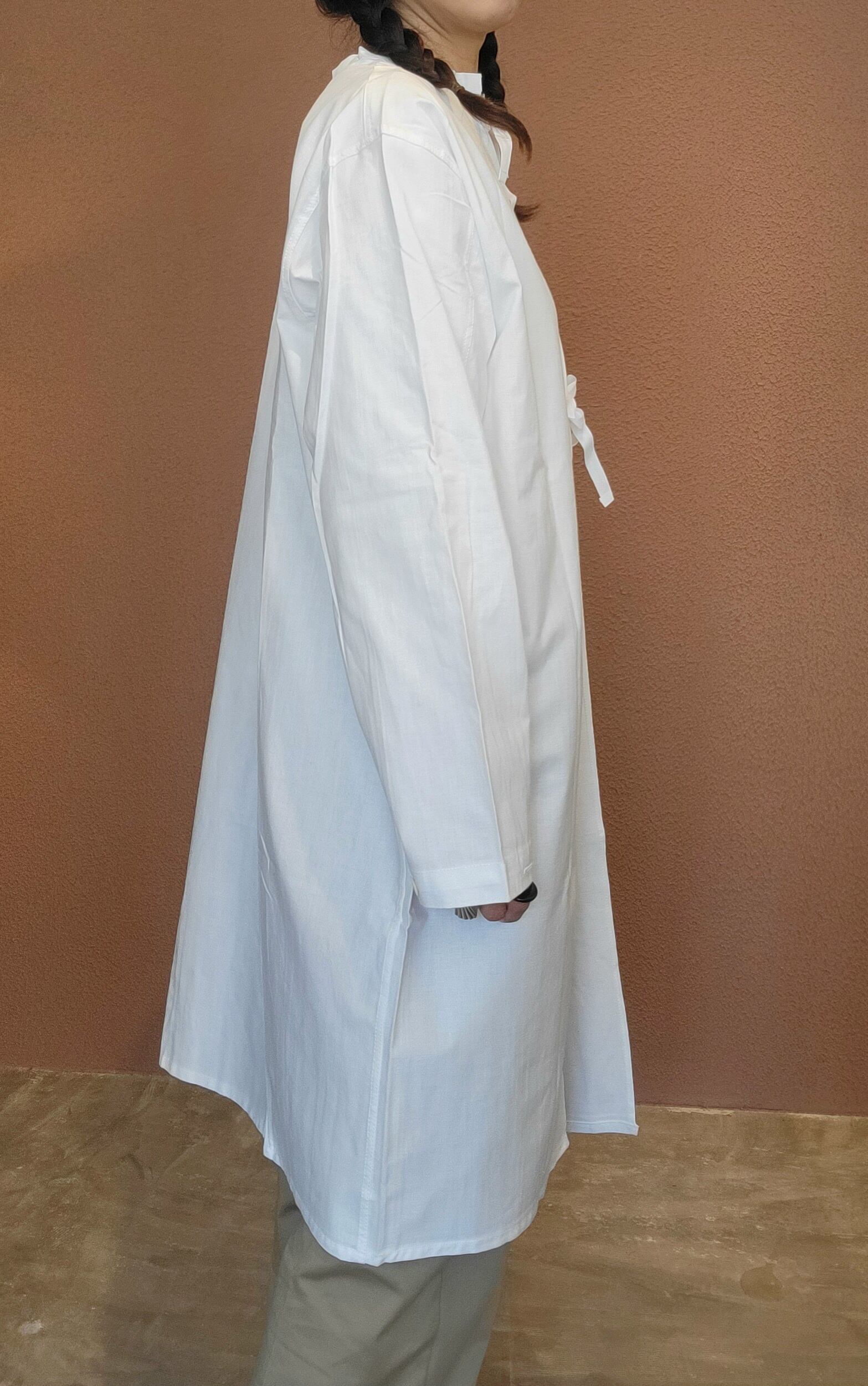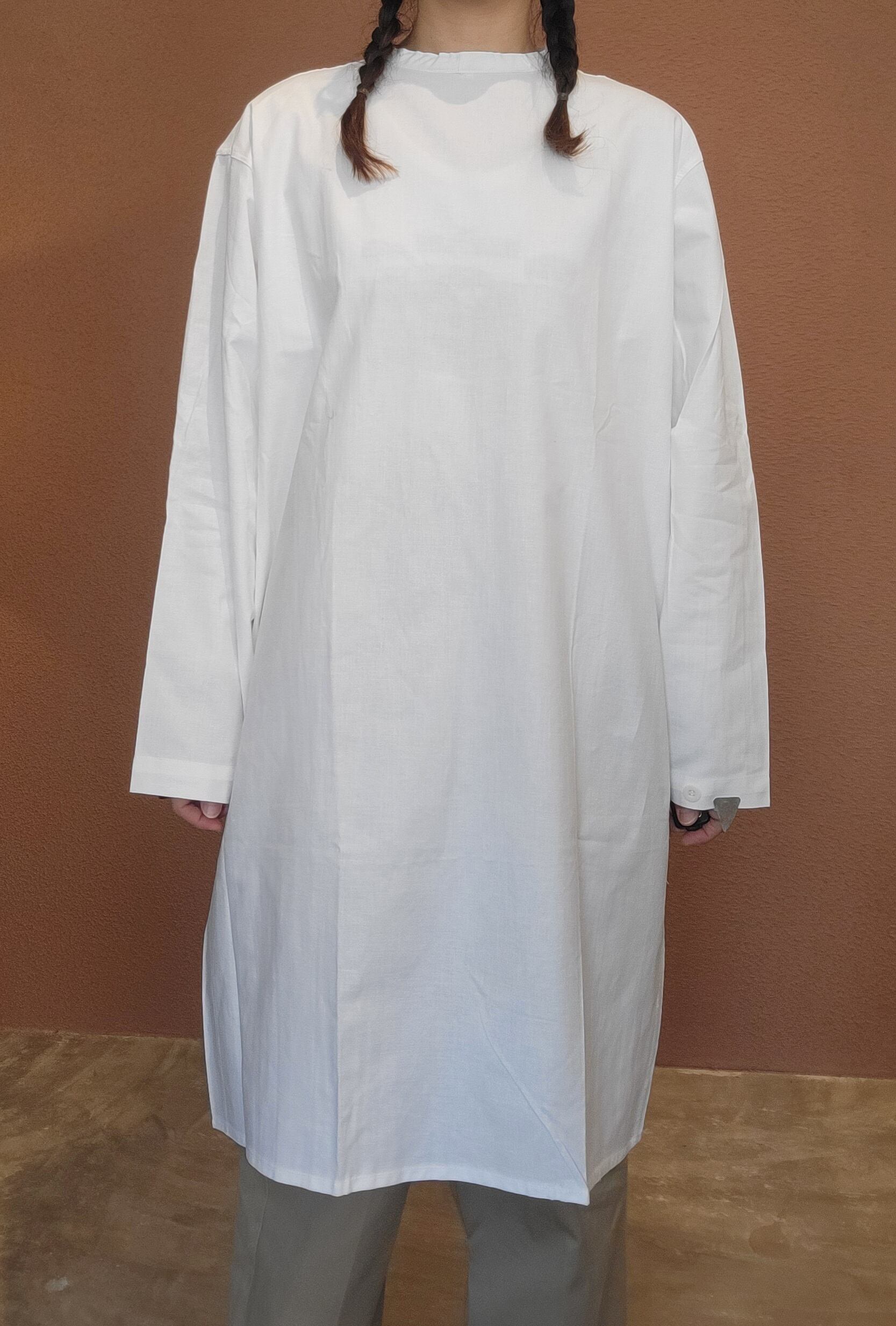 DEADSTOCK 未使用のスウェーデン軍サージカルガウン。張りのあるコットン素材でさらっとした肌触りです。本来は紐のある身ごろを後ろに着るものですが前後どちらでも着用可能です。シンプルかつほどよい存在感で使いやすいアイテムです。*未使用ですが1cmほどの薄いシミが2ヶ所あります。画像でご確認ください。
