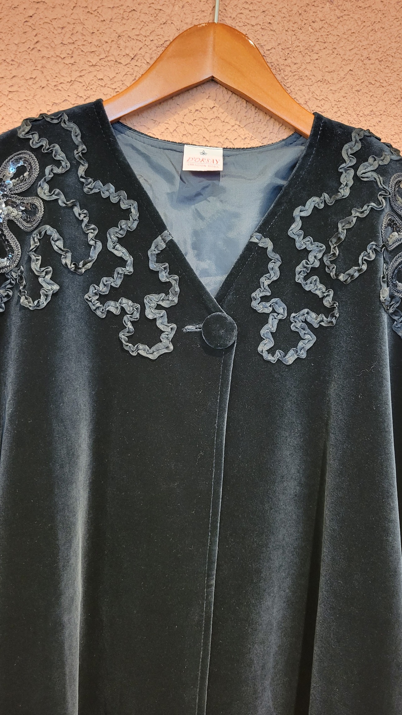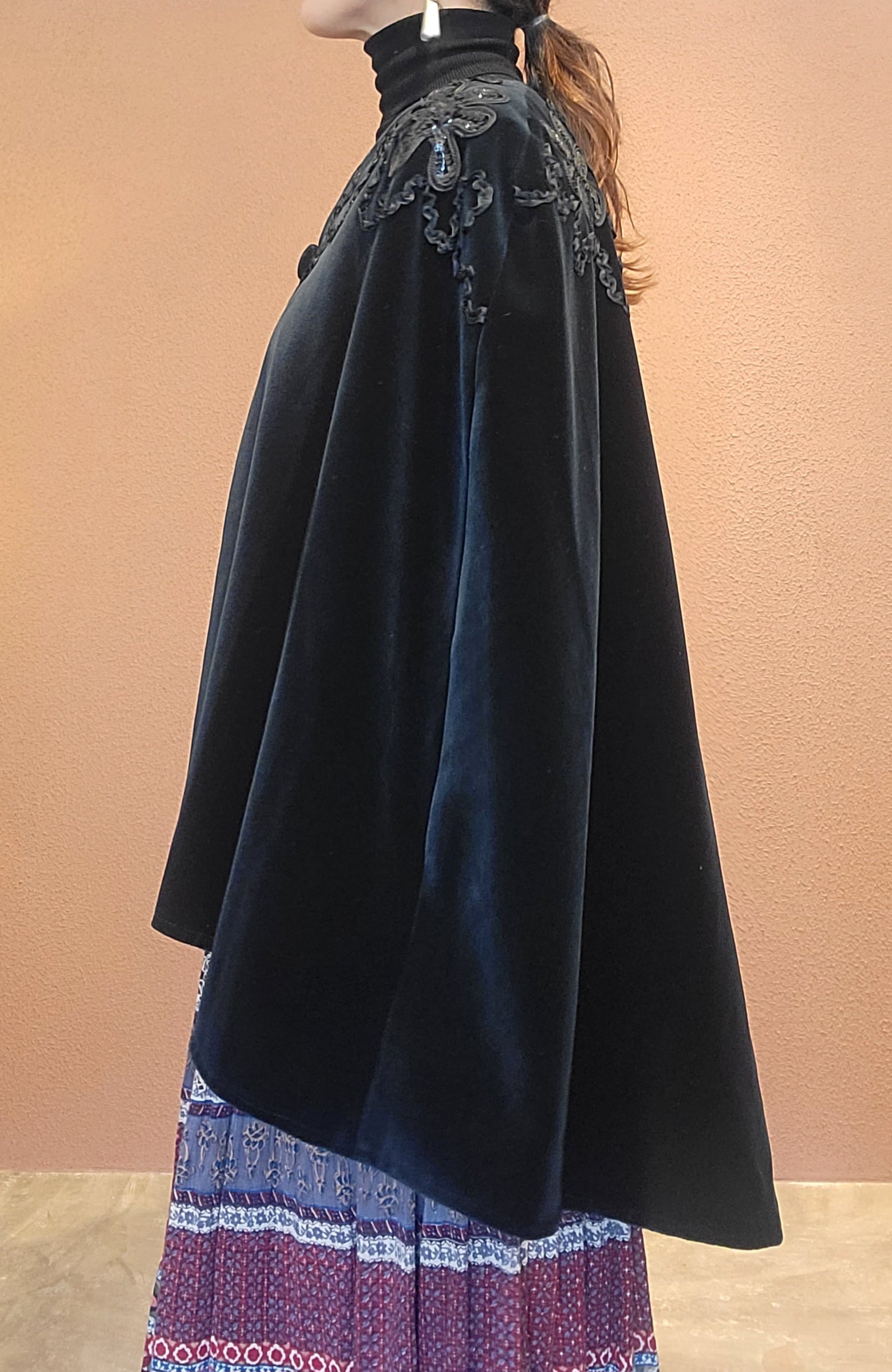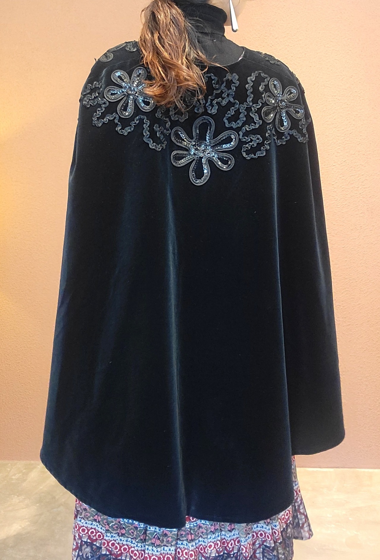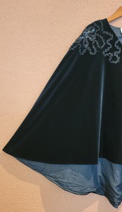 ベルベットのヴィンテージケープ。スペインのヴィンテージです。肌触りがとても滑らかな上質なベルベット生地です。黒地に黒のスパンコールとリボンテープの装飾が品良く華やか。ゆったりサイジングでコートなどアウターの上にも羽織っていただけます。