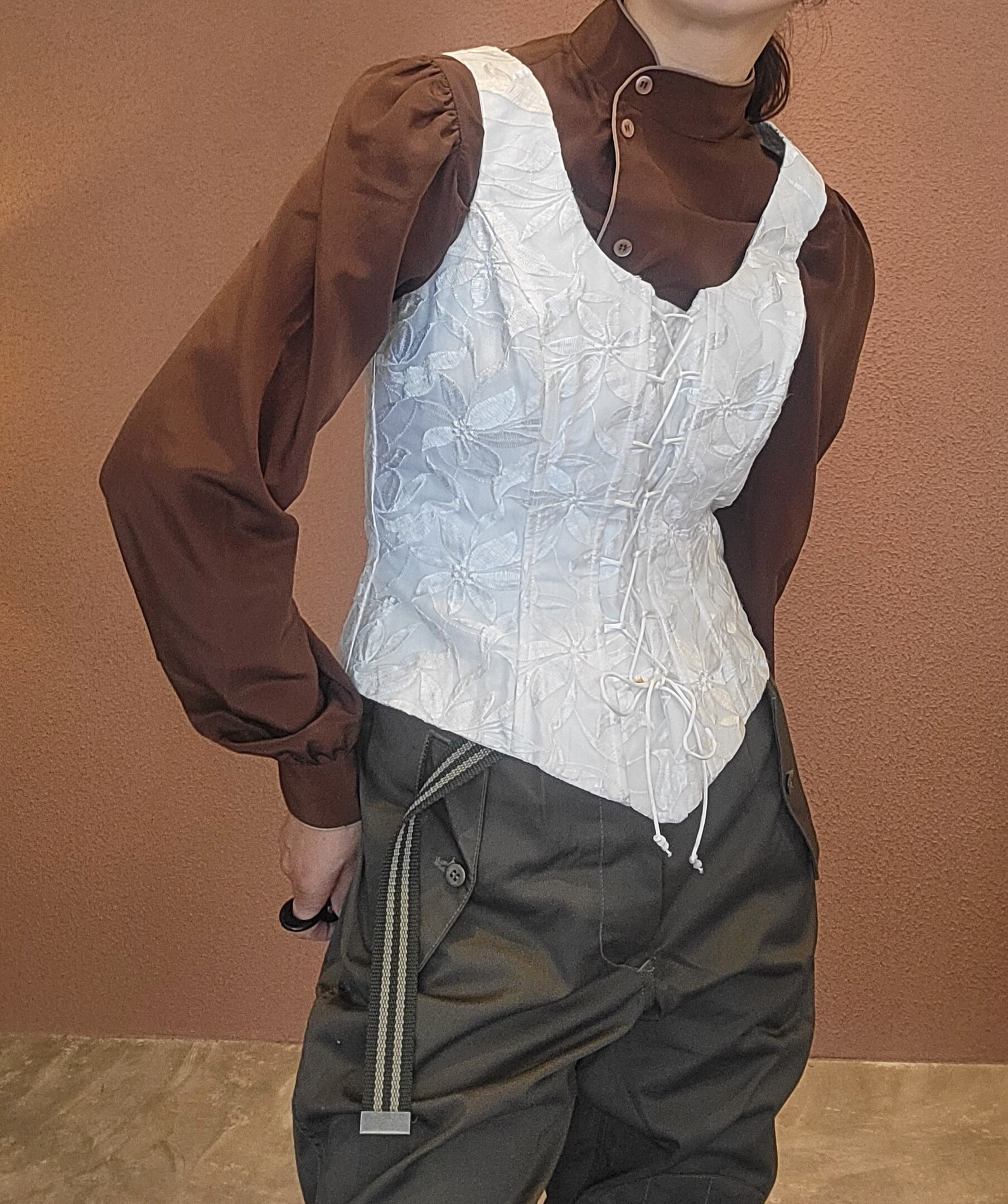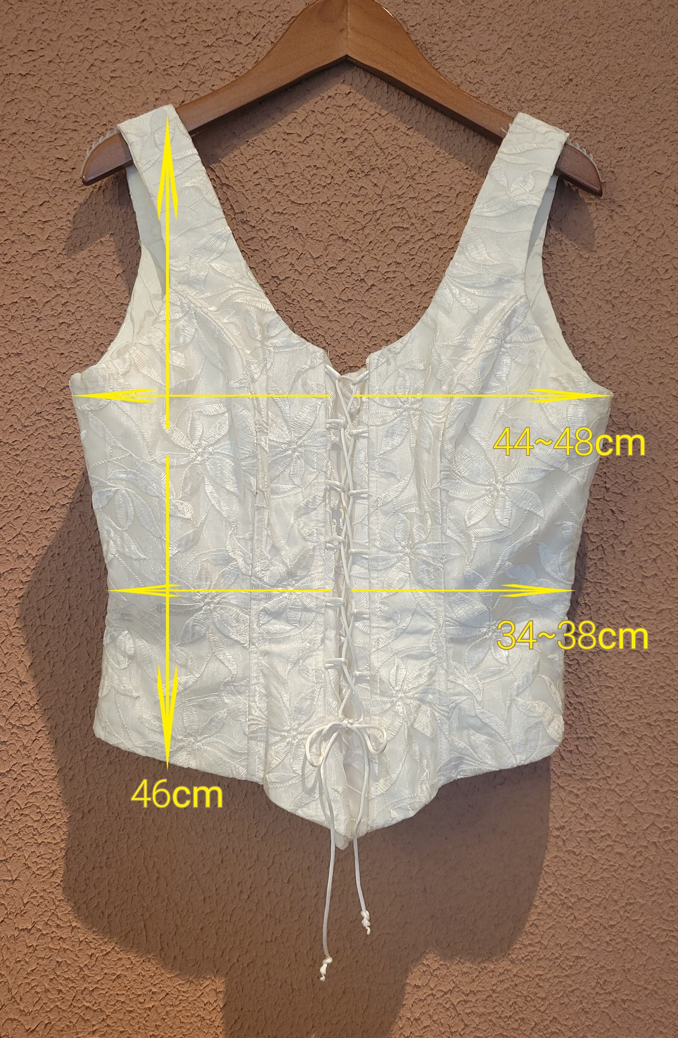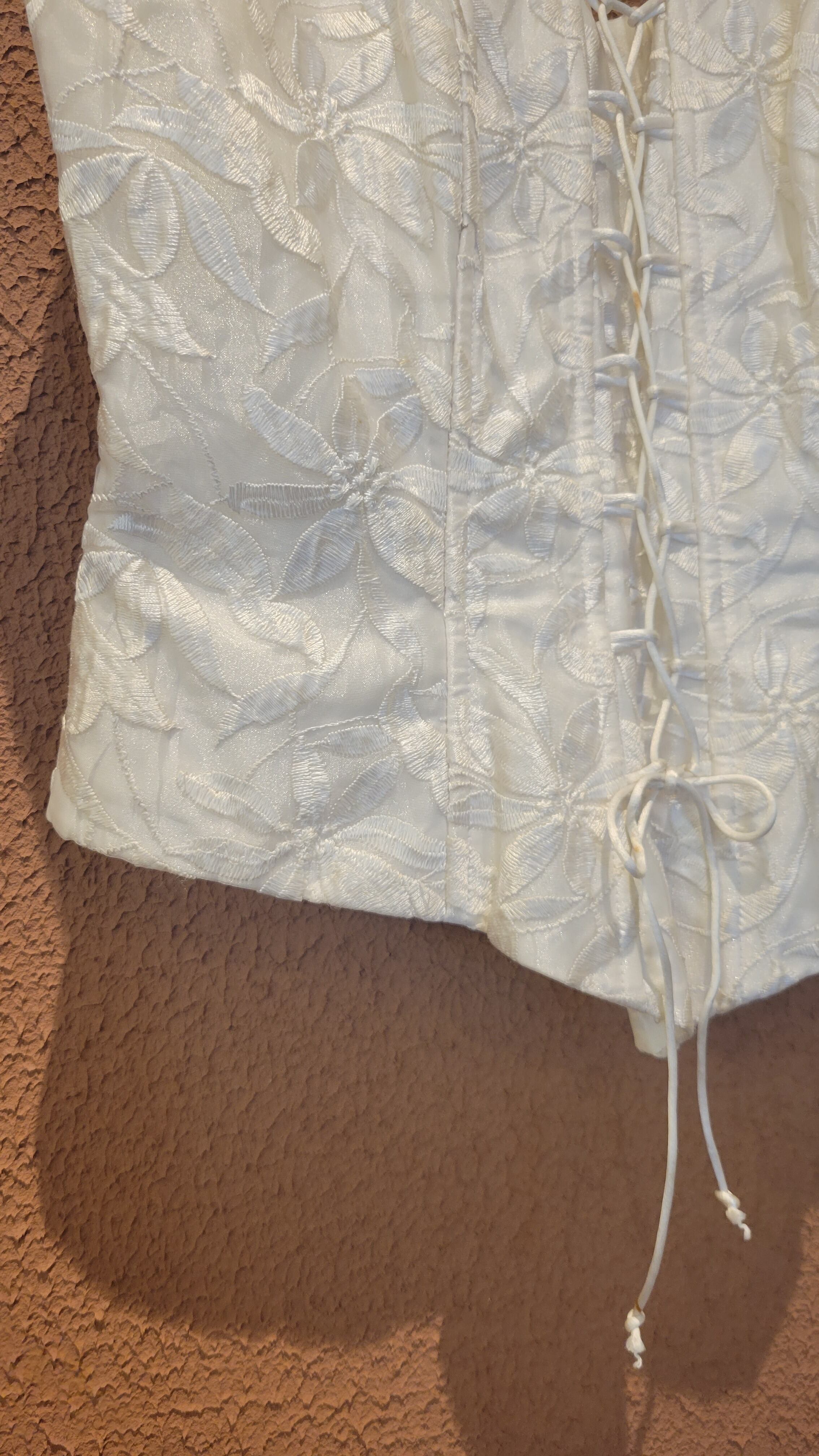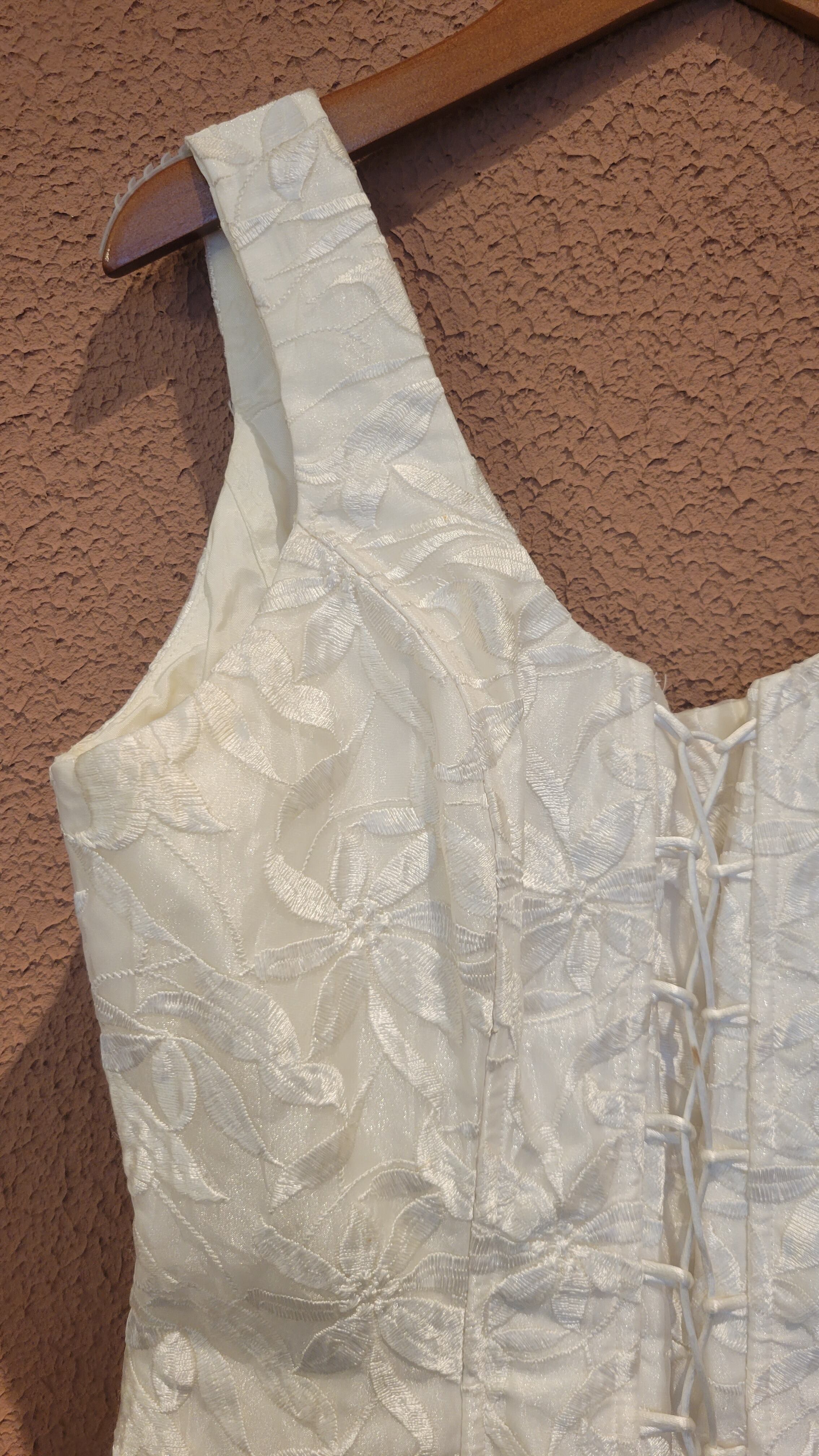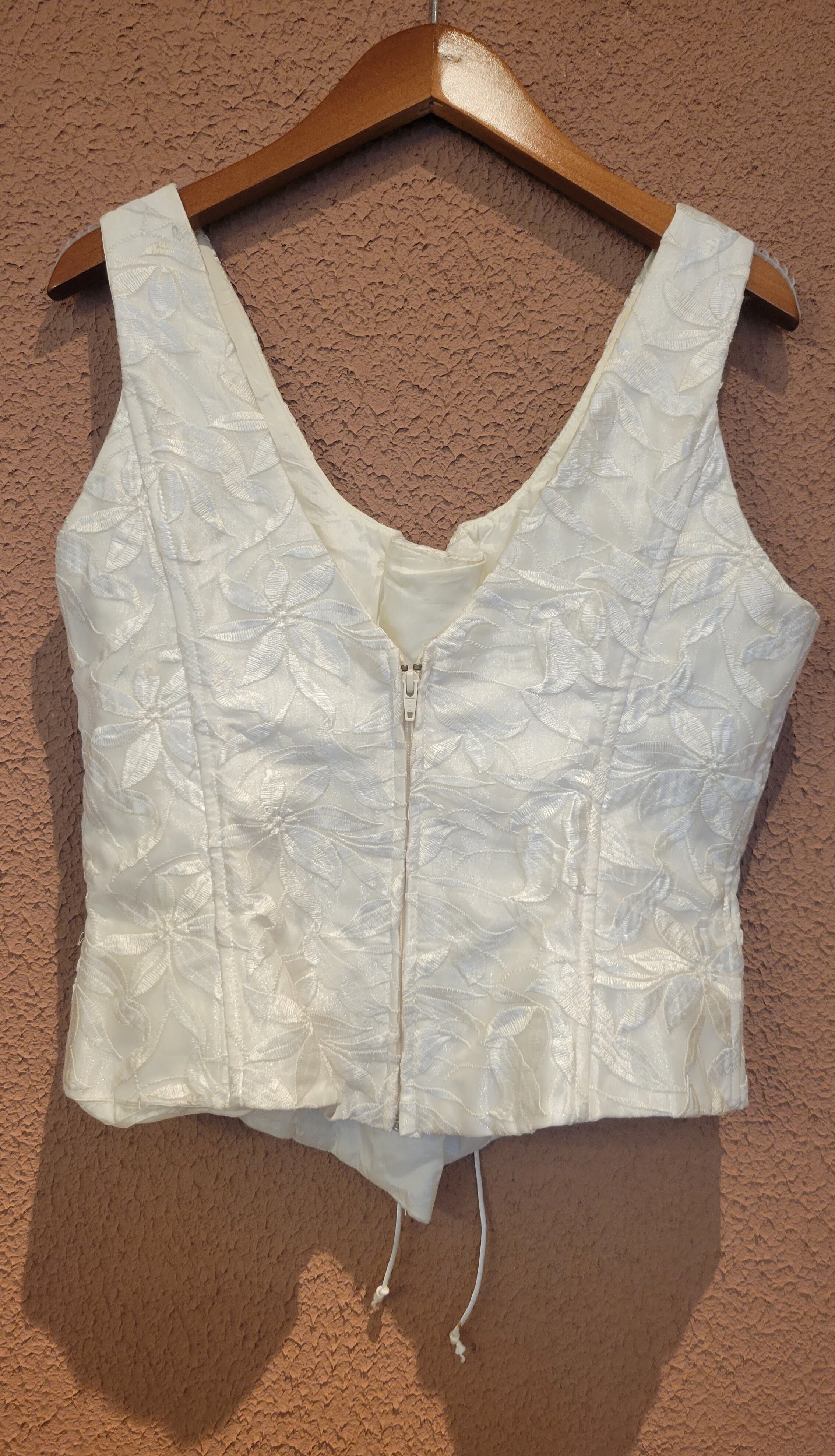 Made in USA のヴィンテージ刺繍コルセット。素材はポリエステルです。表面はオーガンジー素材に刺繍が施された繊細なディテール。バックファスナーは劣化していたものを当方で新品に取り替え済みです。身ごろに縦に4本ソフトワイヤー入っていますが、きつく感じるほどの本格的なコルセット用ワイヤーではありません。カジュアルなTシャツからフェミニンなブラウスまで幅広く合わせられ、スタイリングの格上げができる優秀アイテムです。*紐に1ミリ程度のシミが2ヶ所あります。着用時に目立つものではありませんが、こちらはヴィンテージにご理解のおありの方へおすすめいたします。