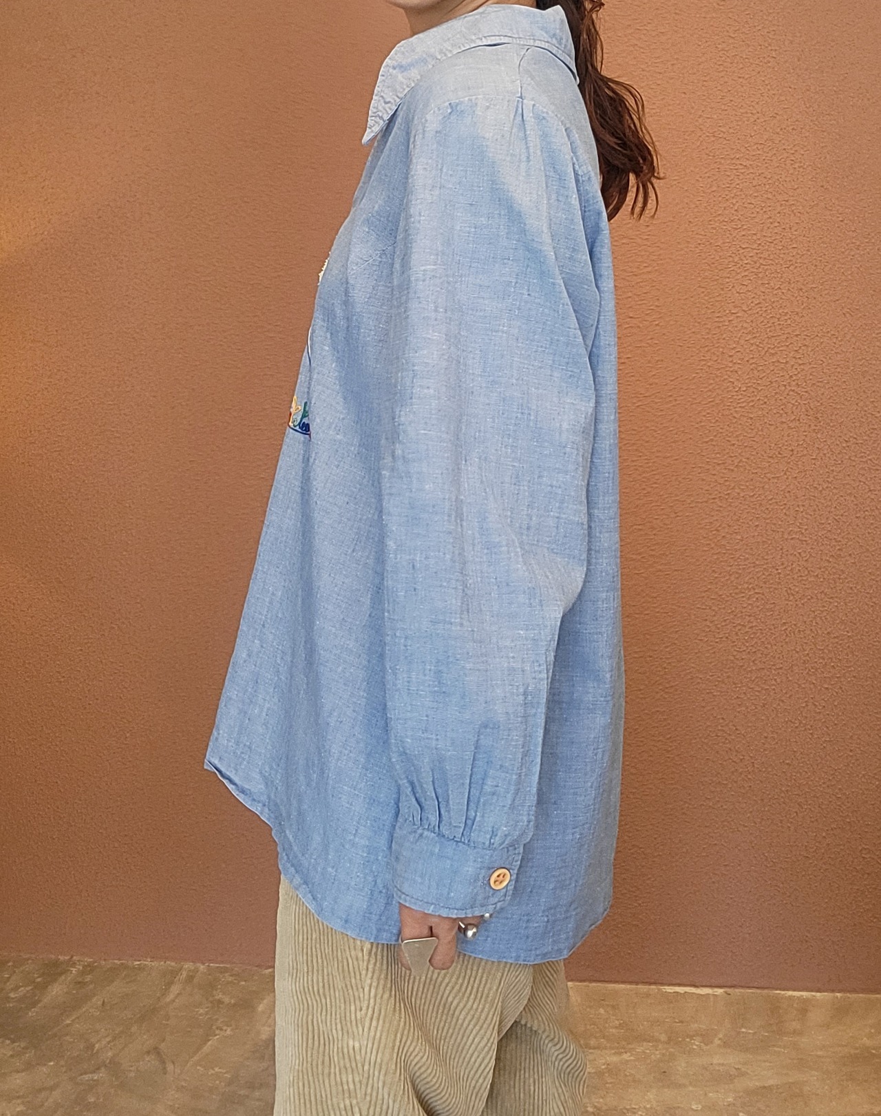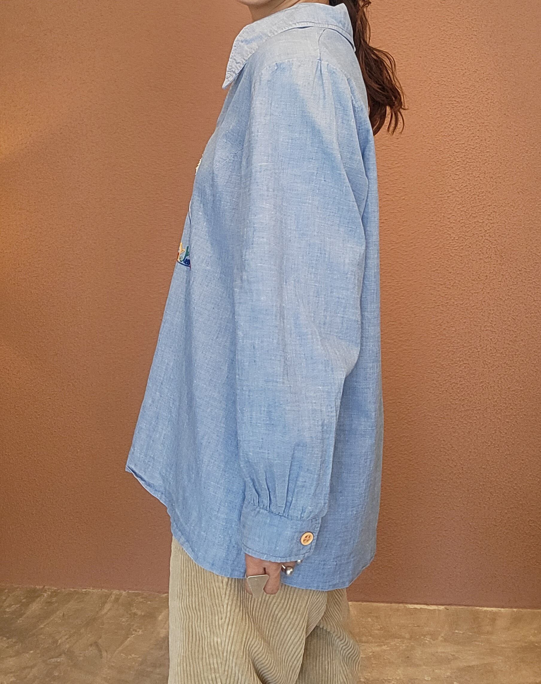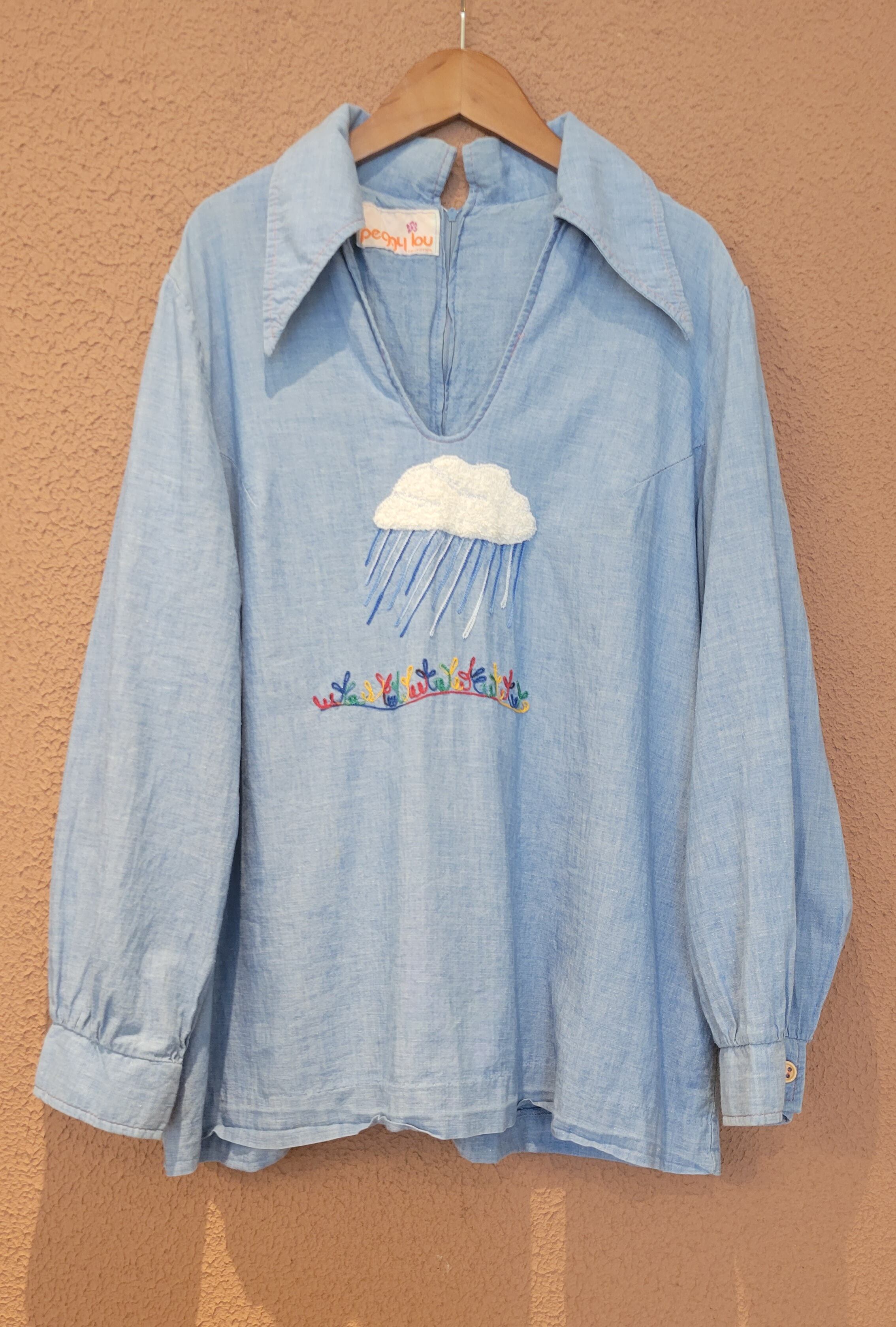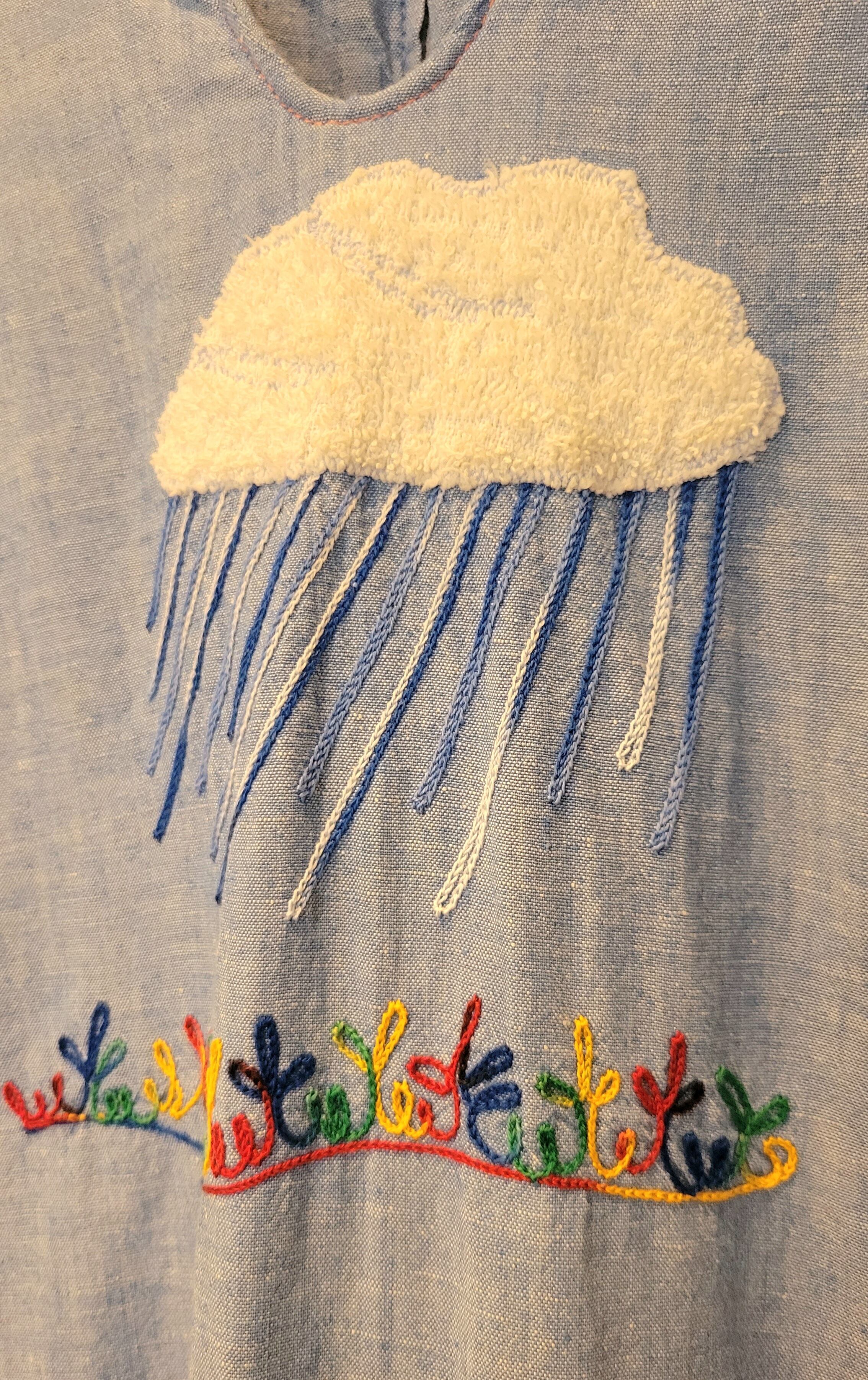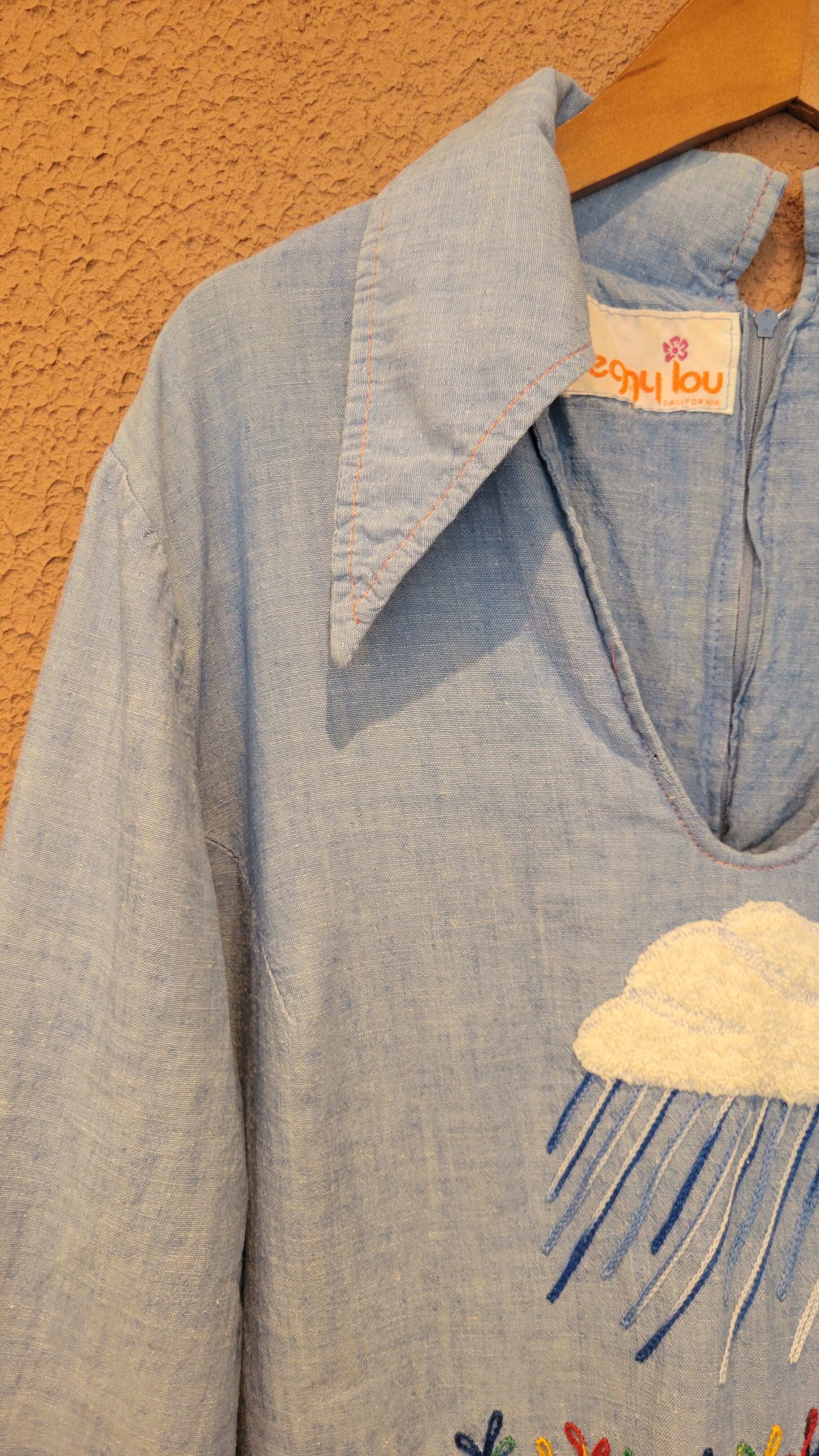 Made in USA のヴィンテージスキッパーシャツ。素材表記はありませんがコットンのようです。柔らかく通気の良い素材でシャンブレーの風合いが良い雰囲気。バックファスナーは腰の辺りまで開き着脱がとても楽です。ストレスフリーのゆったりデザイン。パイル素材の雲のアップリケにチェーンステッチの雨と草花刺繍が可愛らしいです。