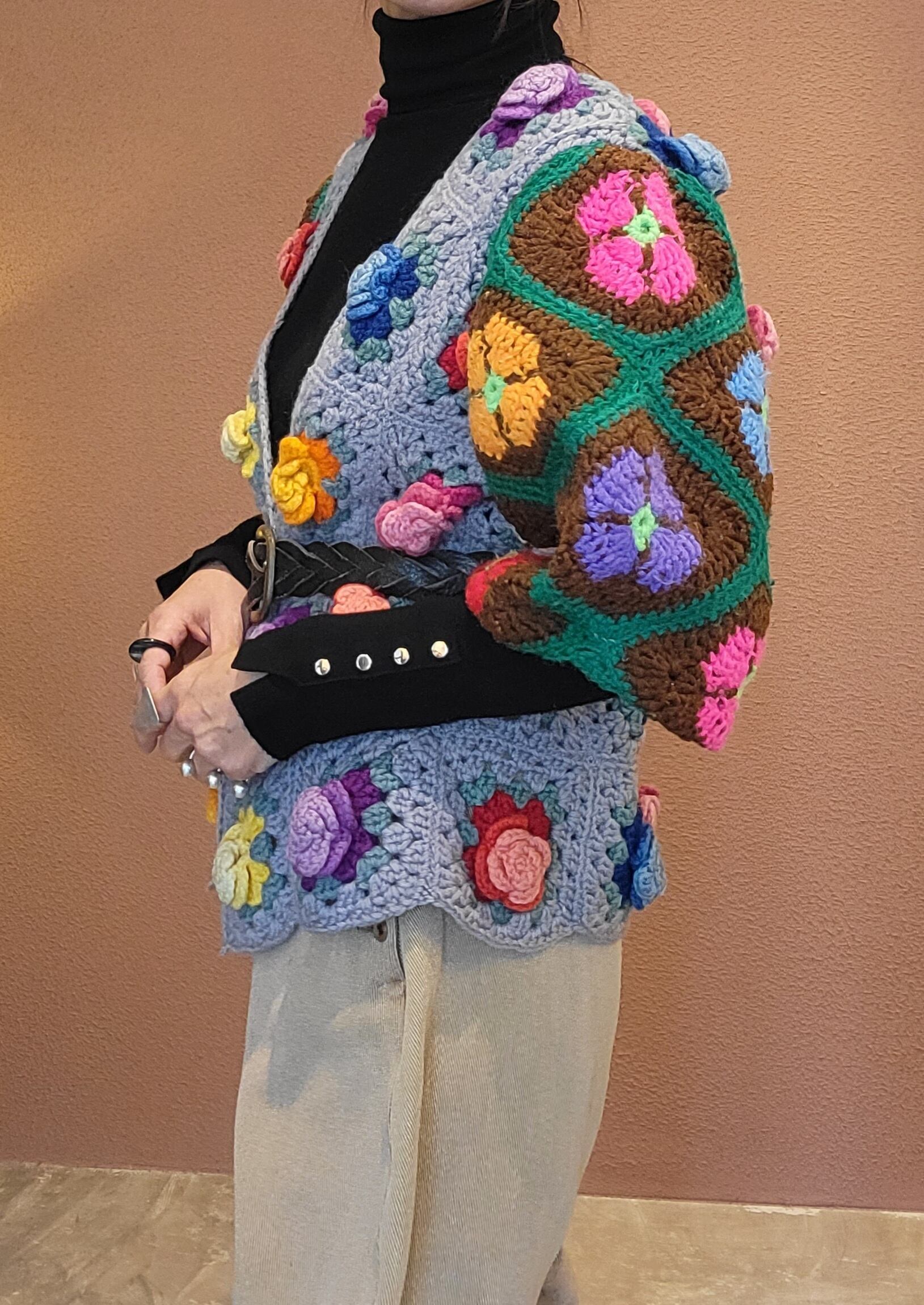 ヴィンテージのグラニーニットを使用したリメイクオープンジャケット。素材表記はありませんがアクリルまたはウールとアクリルの混紡のようです。カラフルで立体的なお花が主役級の存在感です。オーバーベルトでウエストマークしてもバランス良いです。