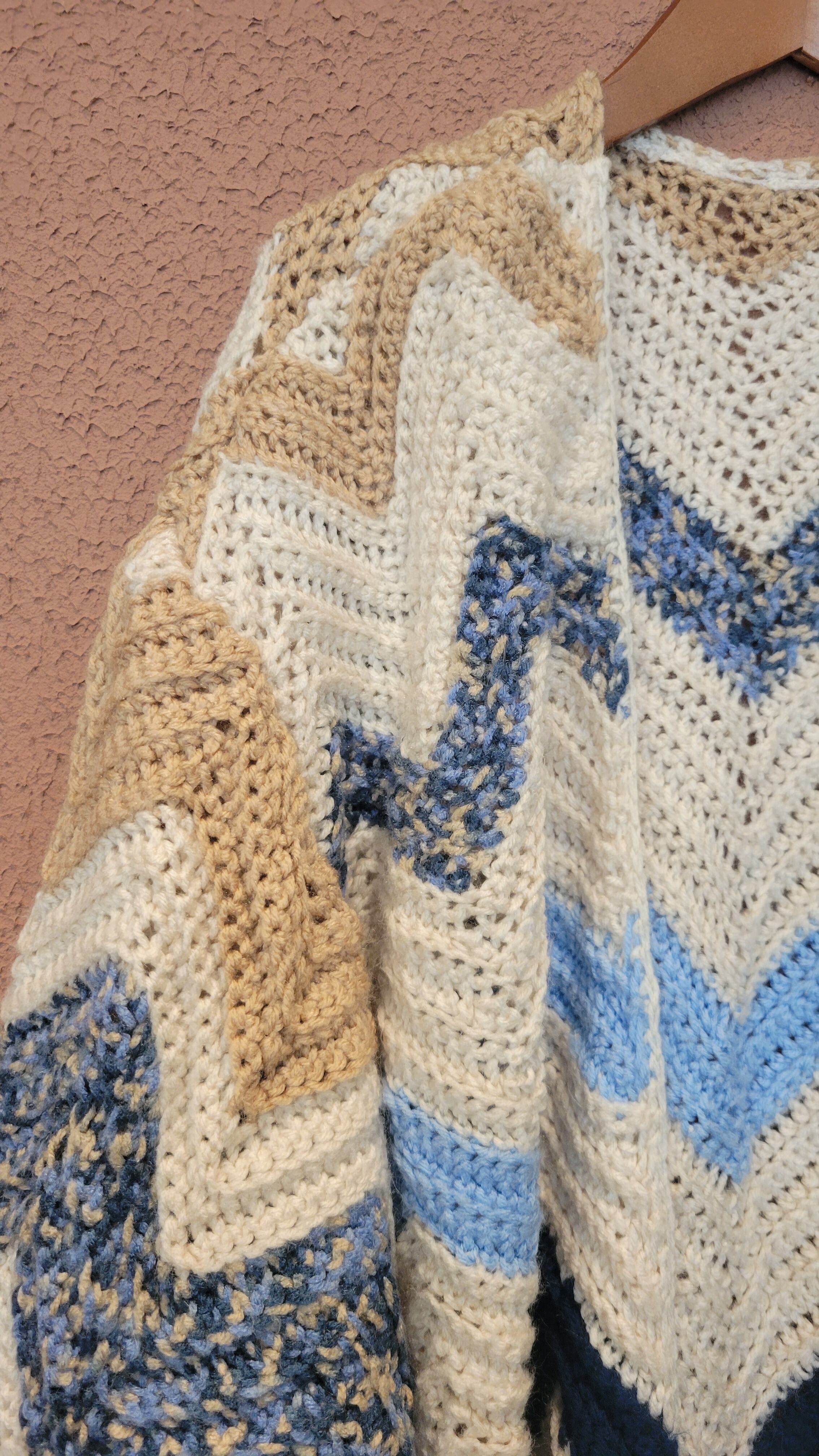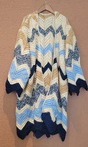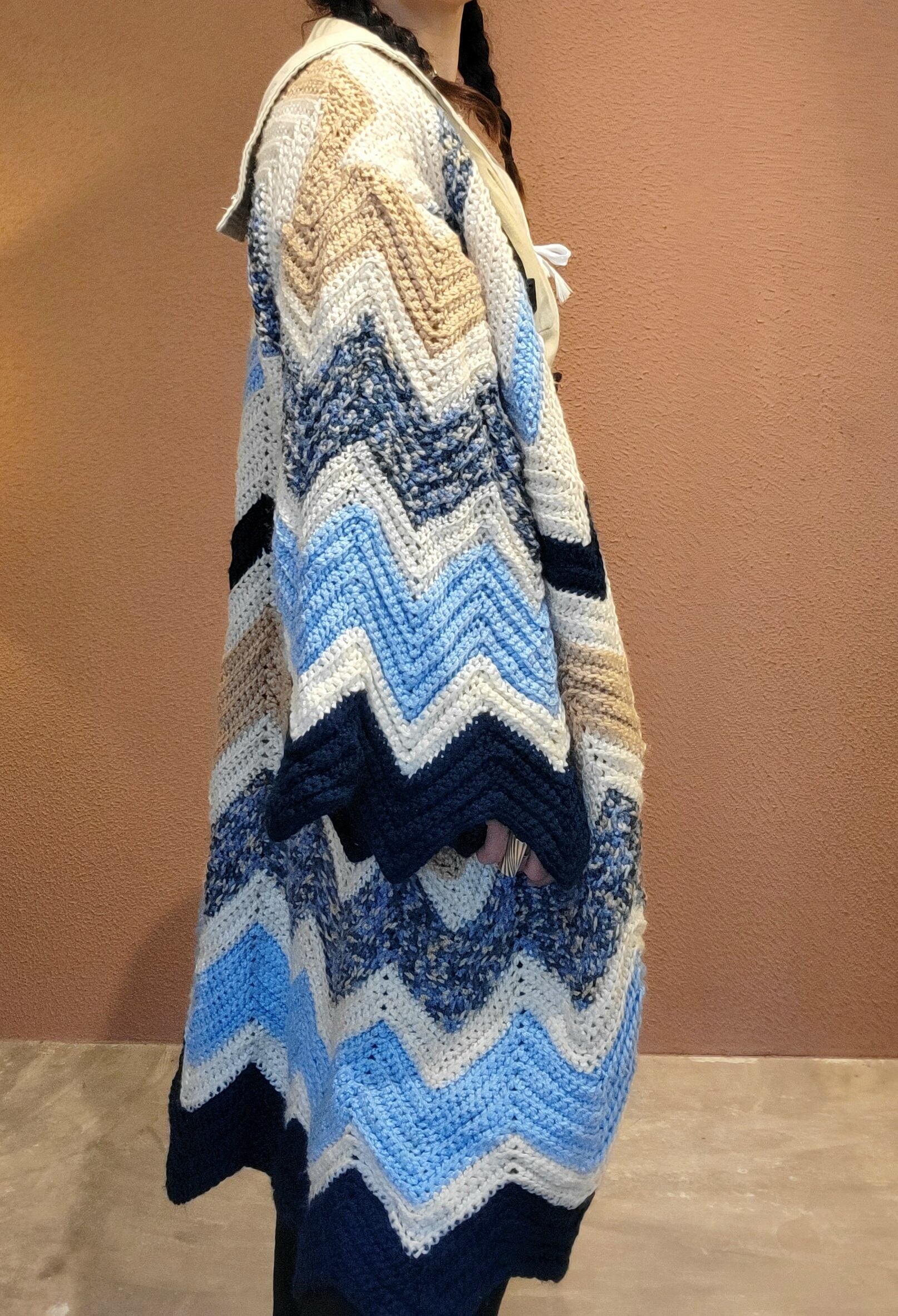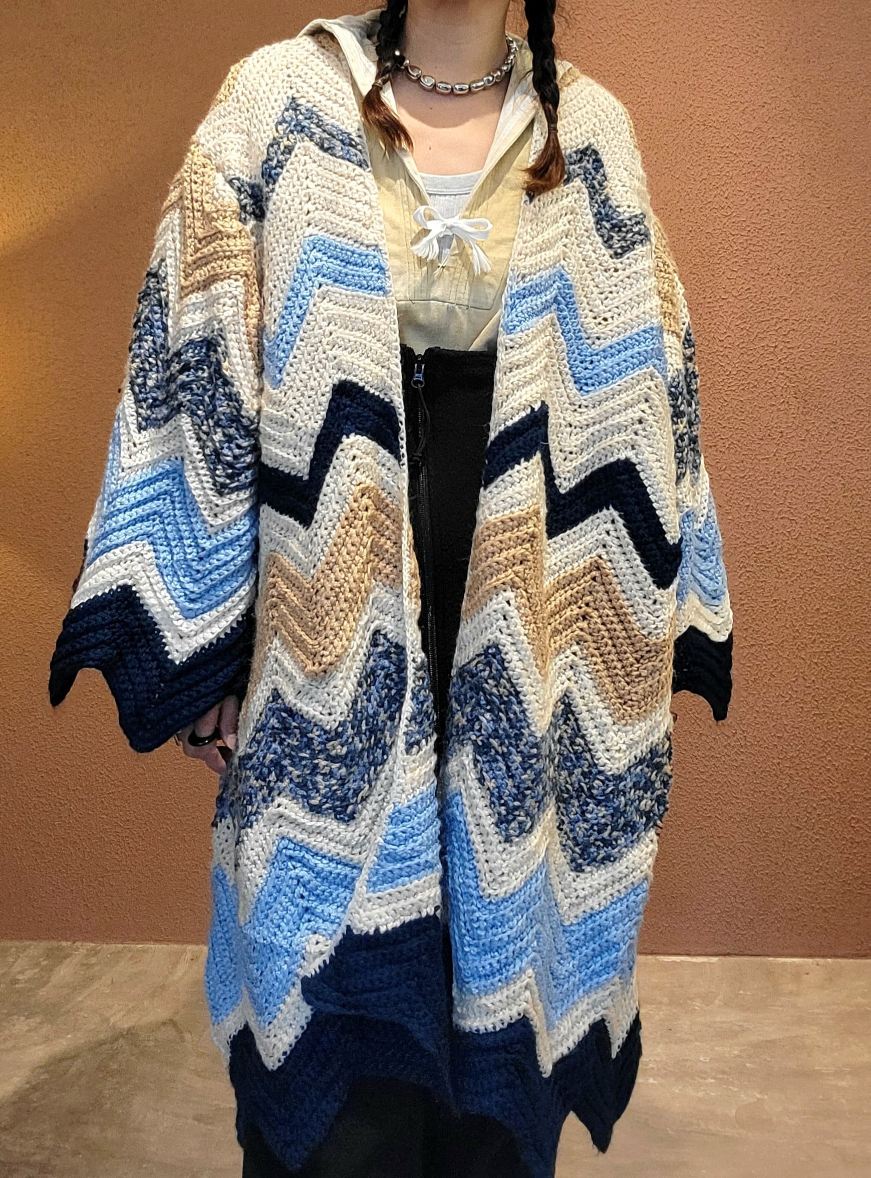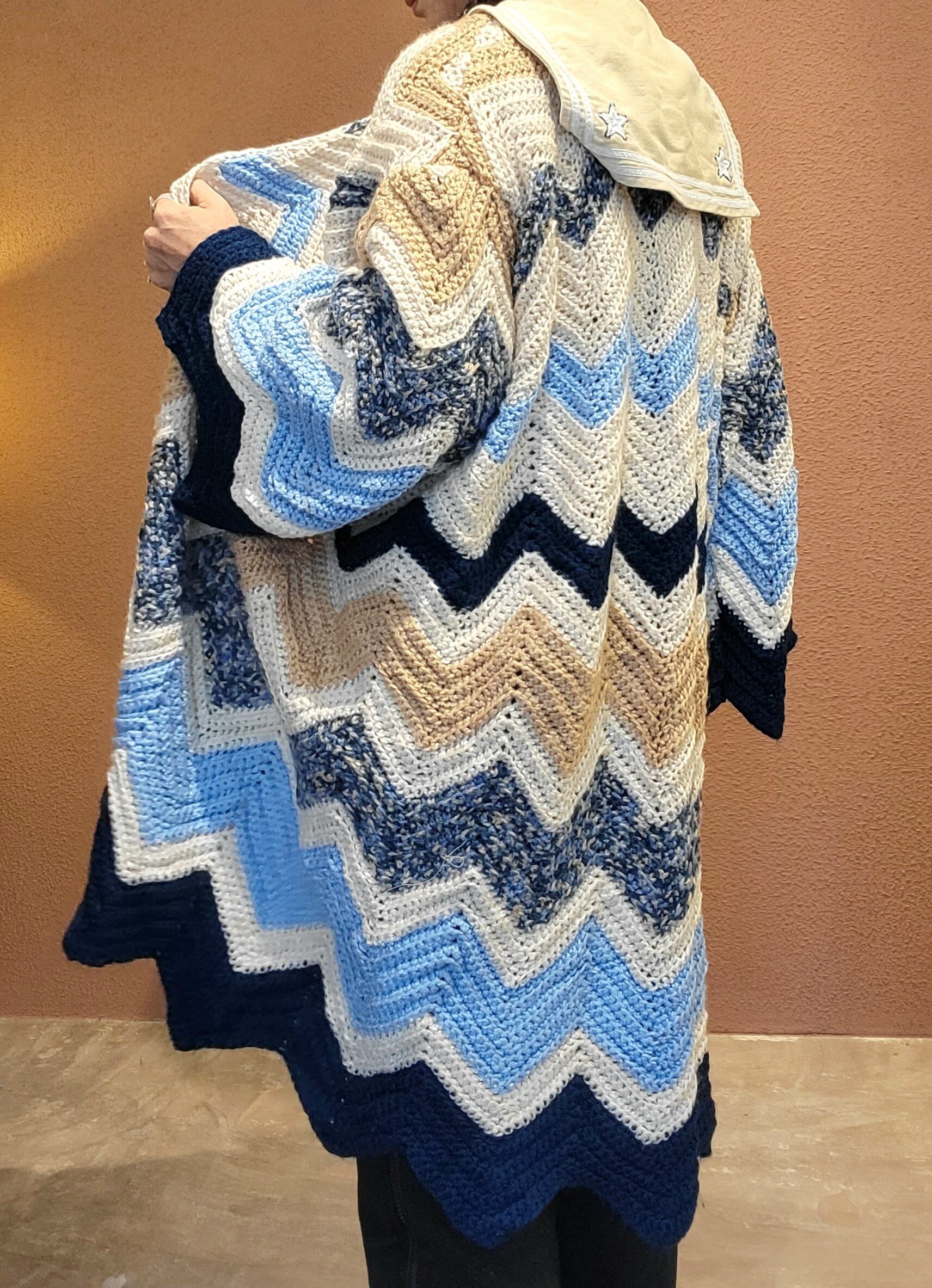 70sのヴィンテージグラニーニットを使用したリメイクガウン。フロントオープンタイプでサイズフリーです。暖かくてリラックスでき、まるで毛布をまるごと1枚着ているよう。アウトドアシーンやご自宅でのくつろぎ時間にもぴったりです。