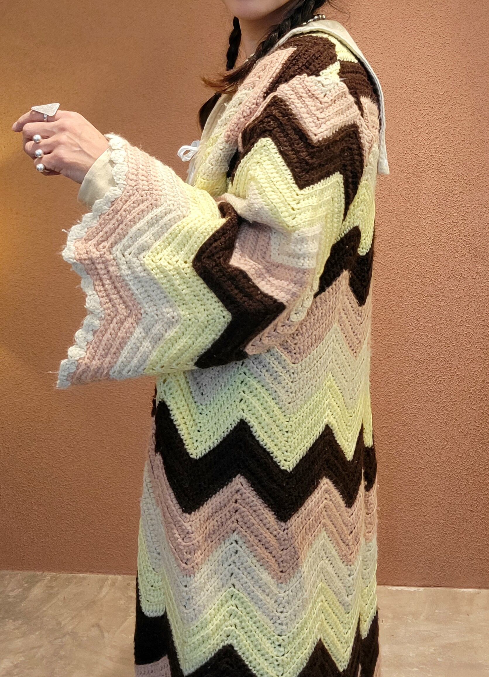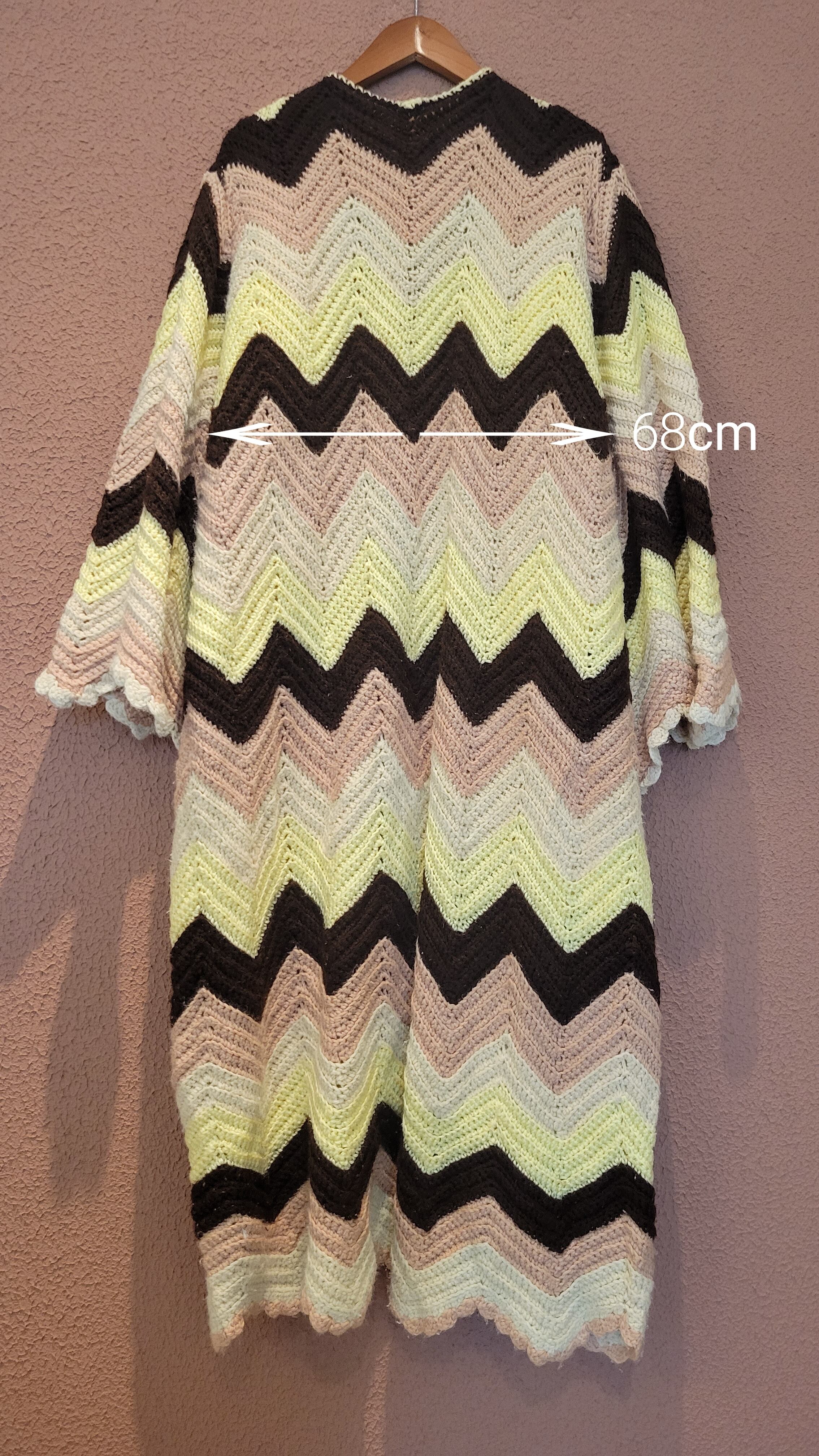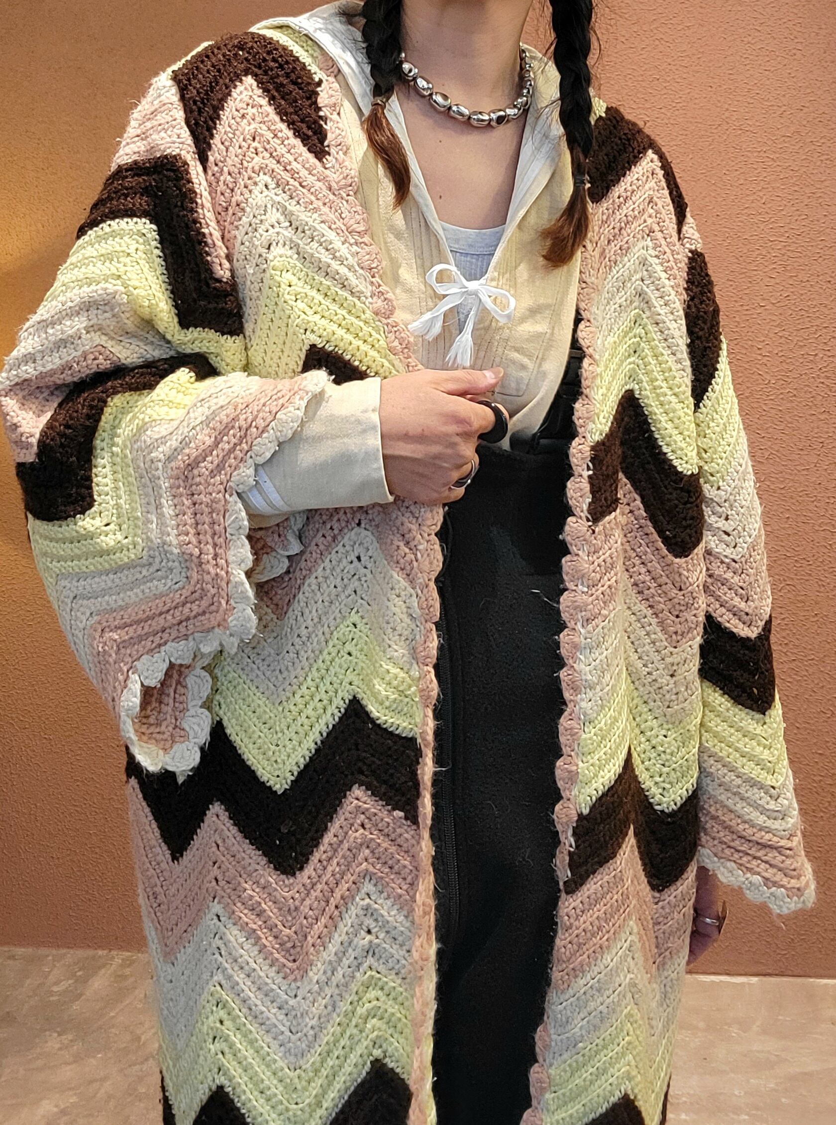 70sのヴィンテージグラニーニットを使用したリメイクガウン。フロントオープンタイプでサイズフリーです。暖かくてリラックスでき、まるで毛布をまるごと1枚着ているよう。アウトドアシーンやご自宅でのくつろぎ時間にもぴったりです。