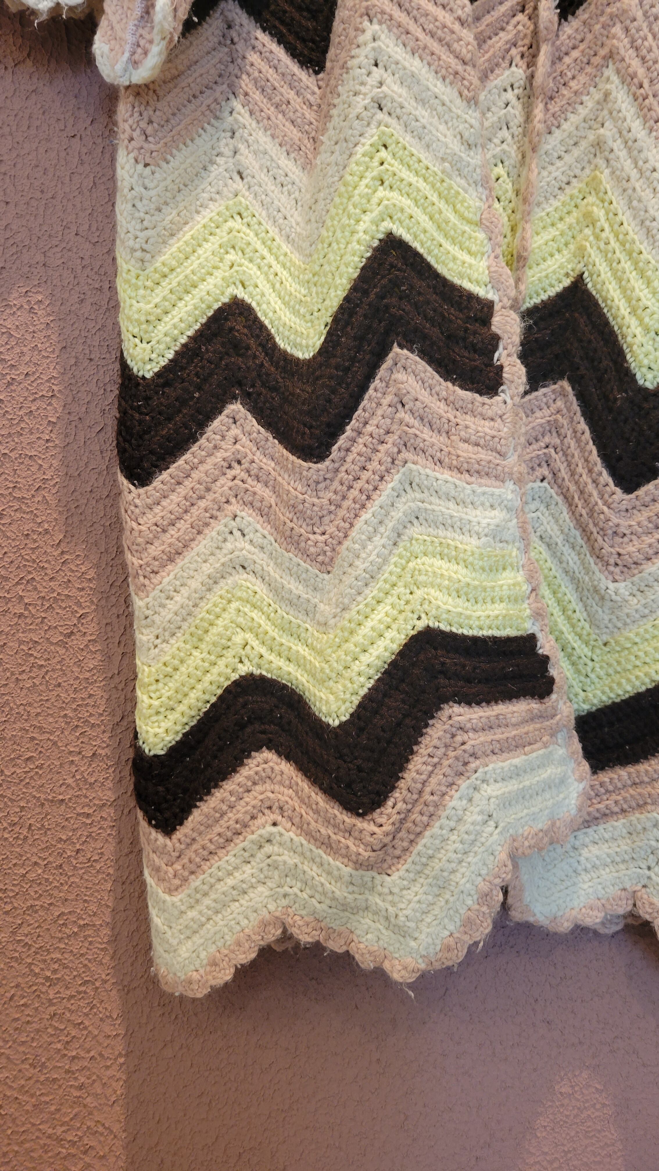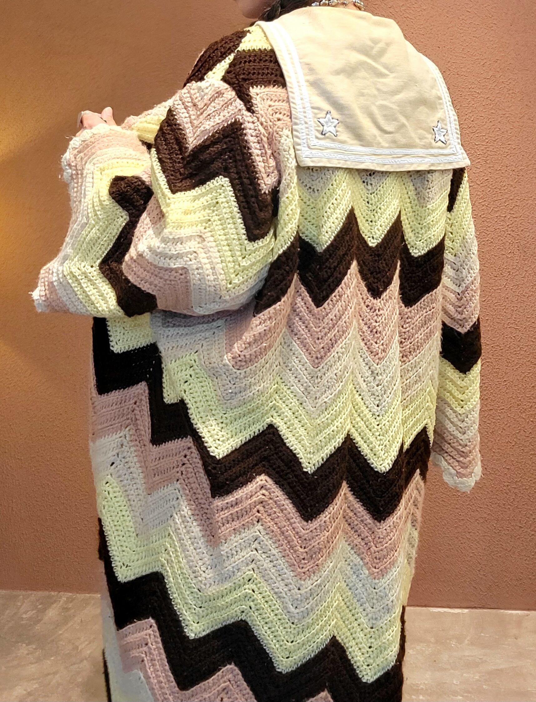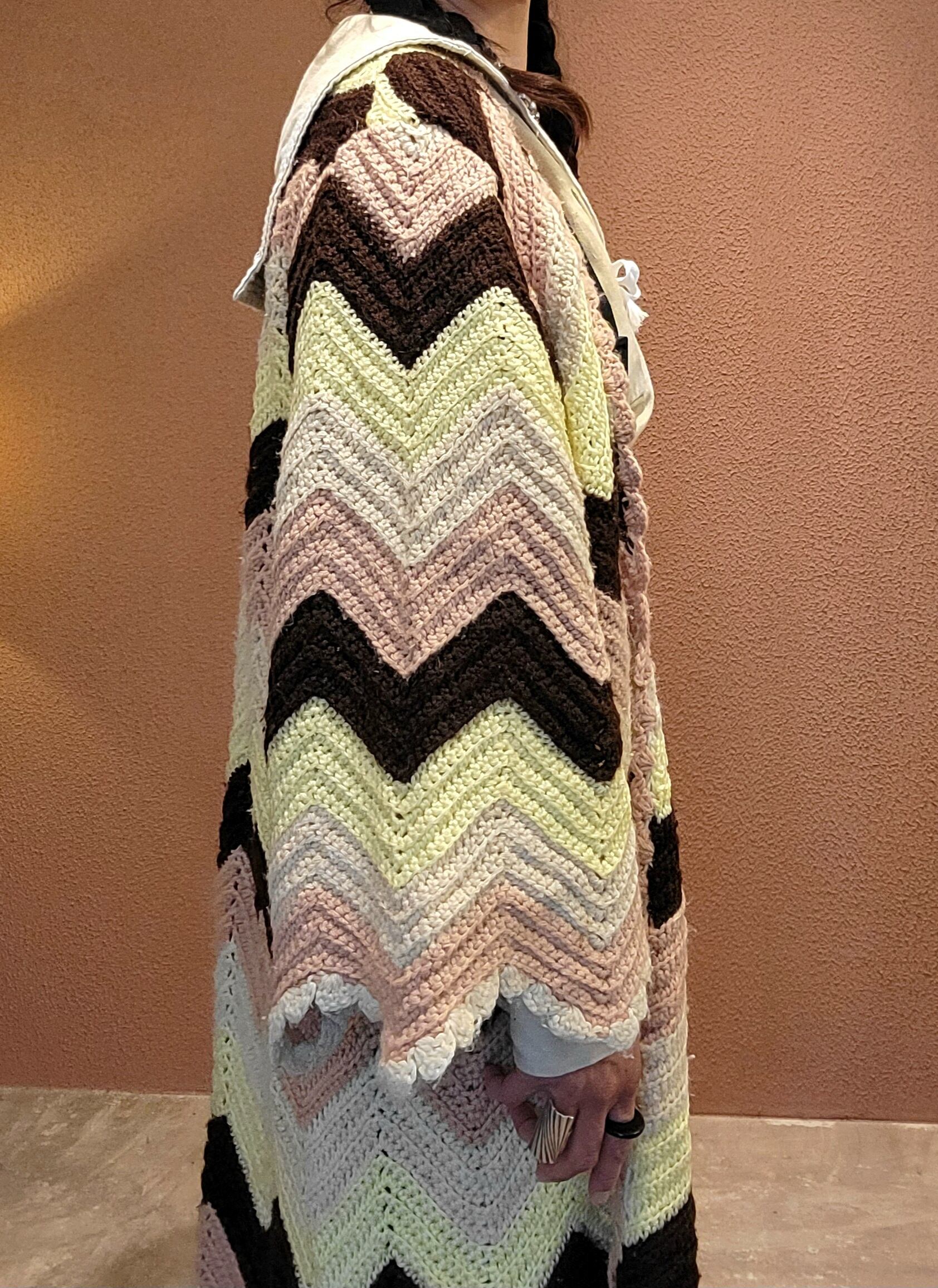 70sのヴィンテージグラニーニットを使用したリメイクガウン。フロントオープンタイプでサイズフリーです。暖かくてリラックスでき、まるで毛布をまるごと1枚着ているよう。アウトドアシーンやご自宅でのくつろぎ時間にもぴったりです。