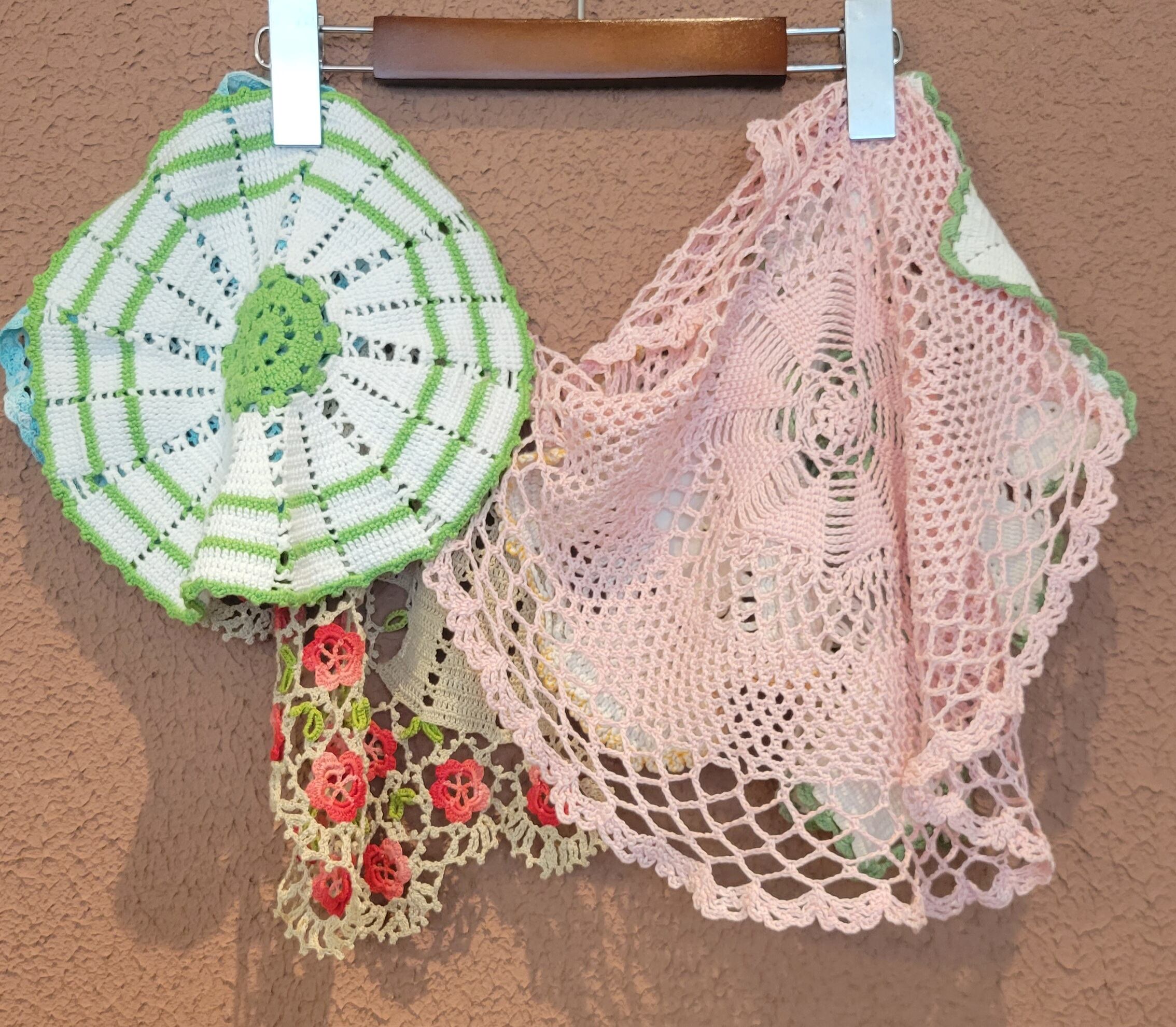 ヴィンテージのハンドメイドのカラークロシェを繋ぎ合わせたリメイクケープです。サイズフリー。ケープの首まわりに付いている紐はサイズ調節ができるよう当方で後から付けましたが、簡単に取り外すことも可能です。お好みの紐に取り替えても○