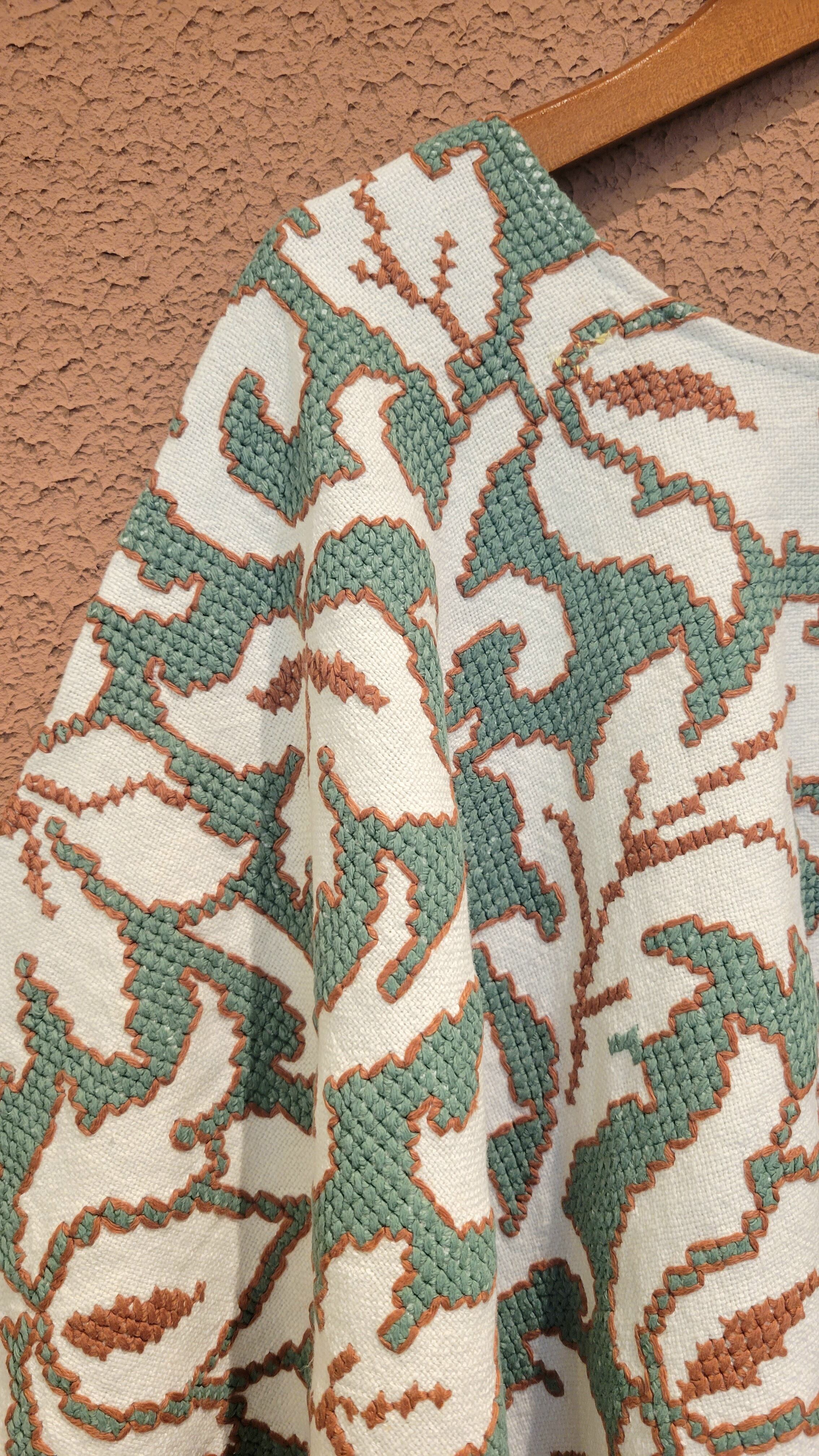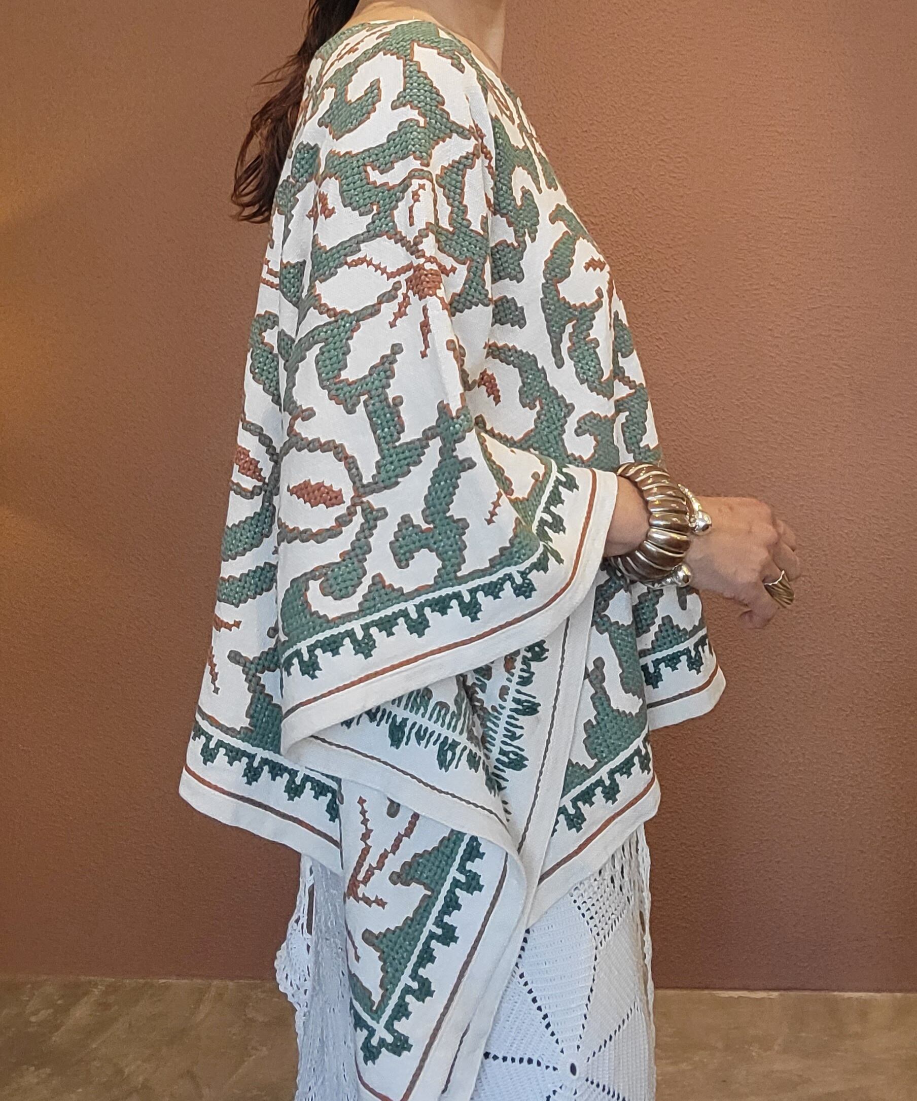 ヴィンテージの刺繍クロスを使用したリメイクトップス。素材はコットンです。重量感がありますが着用時にストレスになるほどではありません。サイドは縫われており袖のように腕を通して着用する仕様です。美しい手刺繍が見事です。