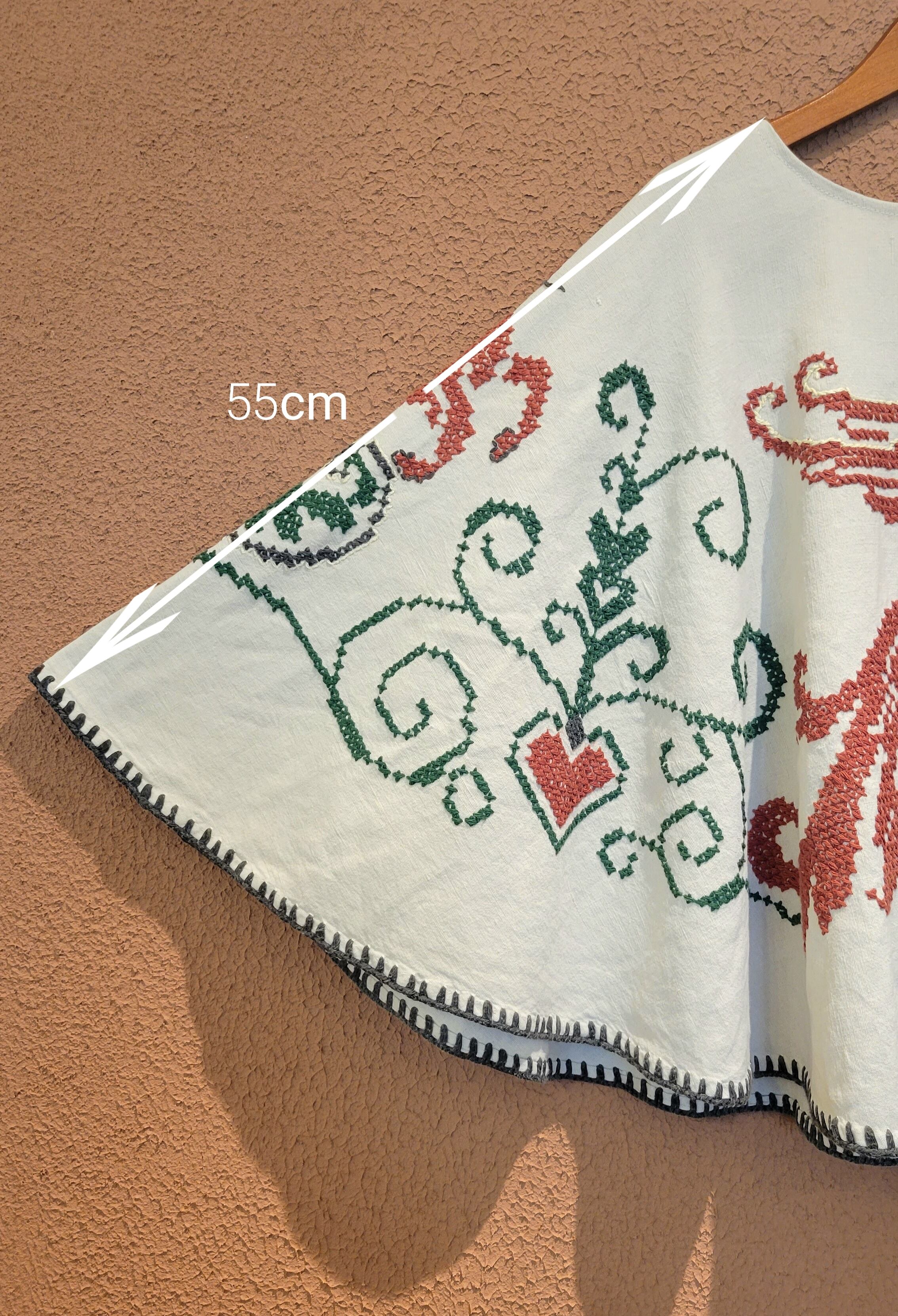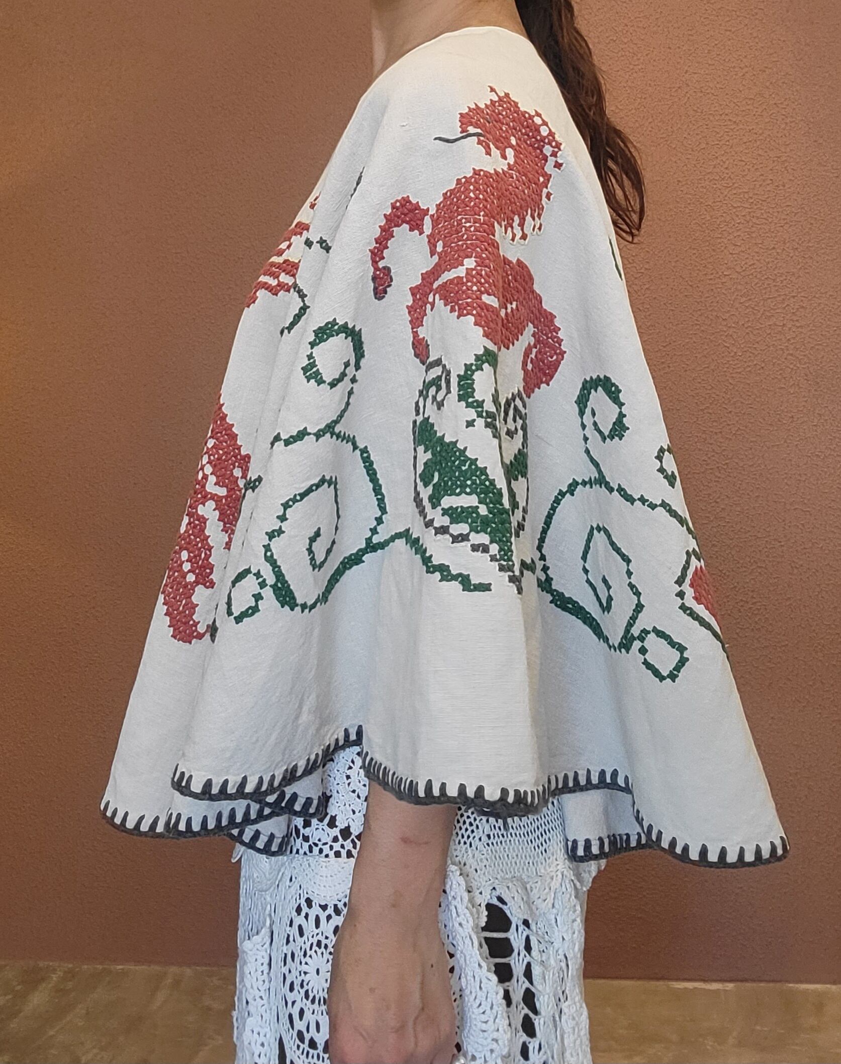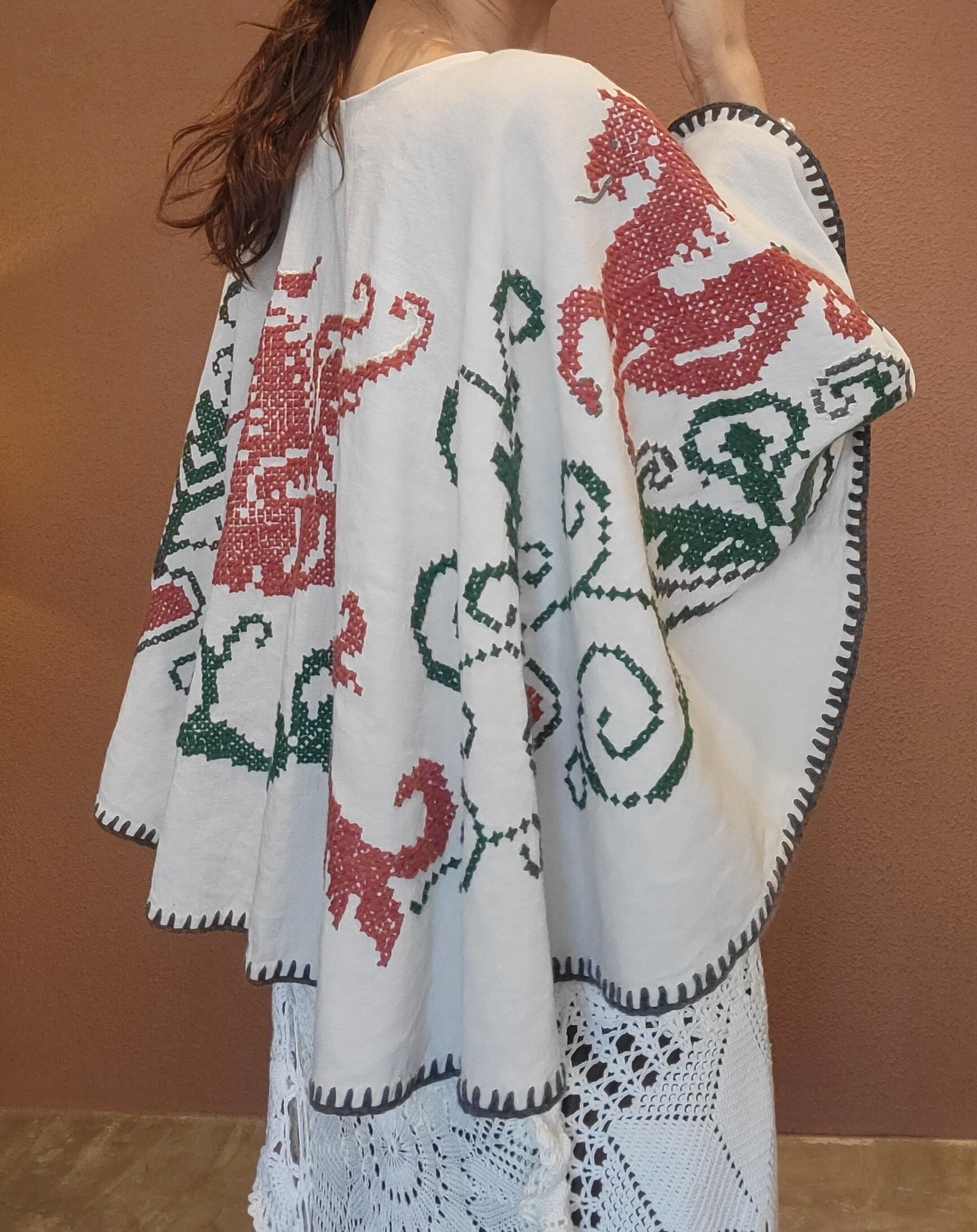 ヴィンテージの刺繍クロスを使用したリメイクトップス。素材はコットンです。頭からすっぽりかぶるだけのポンチョのような仕様です。サイドは縫われていません。美しい手刺繍が見事です。