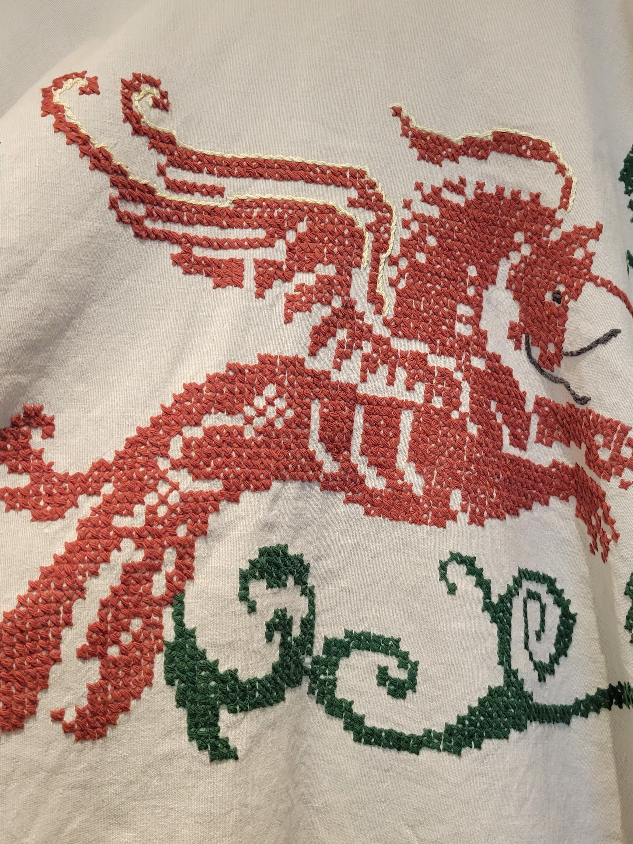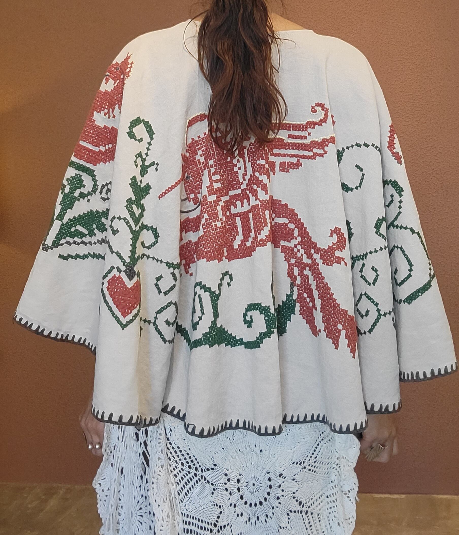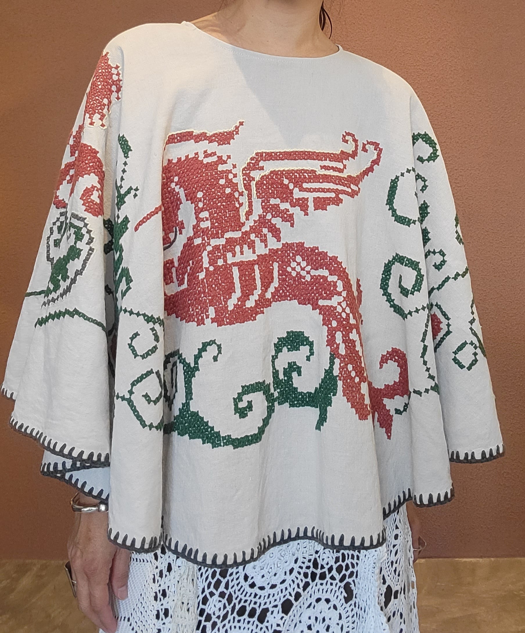 ヴィンテージの刺繍クロスを使用したリメイクトップス。素材はコットンです。頭からすっぽりかぶるだけのポンチョのような仕様です。サイドは縫われていません。美しい手刺繍が見事です。