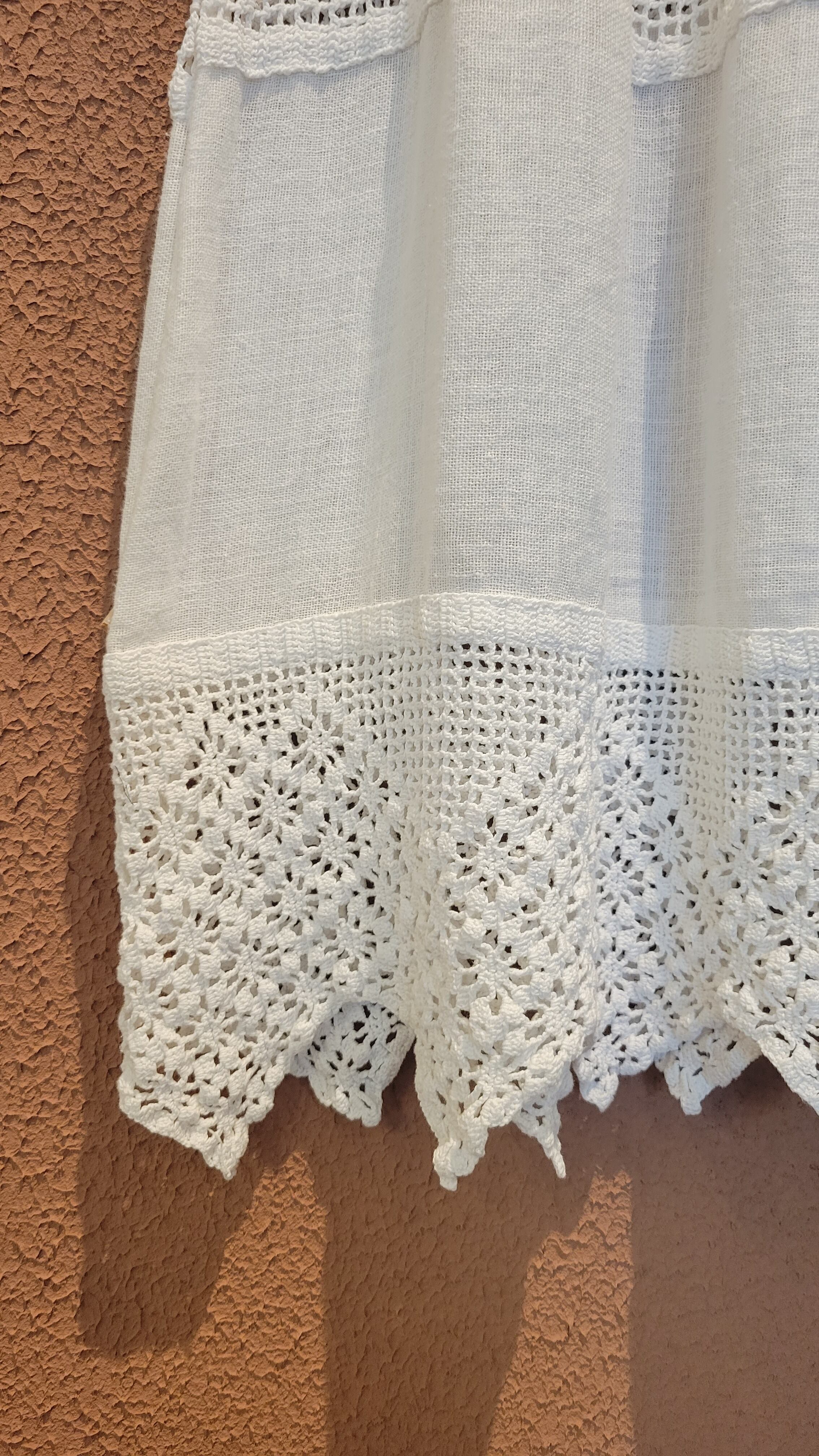 ヴィンテージレースを使用したリメイクスカート。素材表記はありませんがコットンのようです。ウエストゴムです。やや透け感がありますのでペチコートの着用やパンツの上にレイヤードをおすすめします。裾のギザギザがアクセントに。