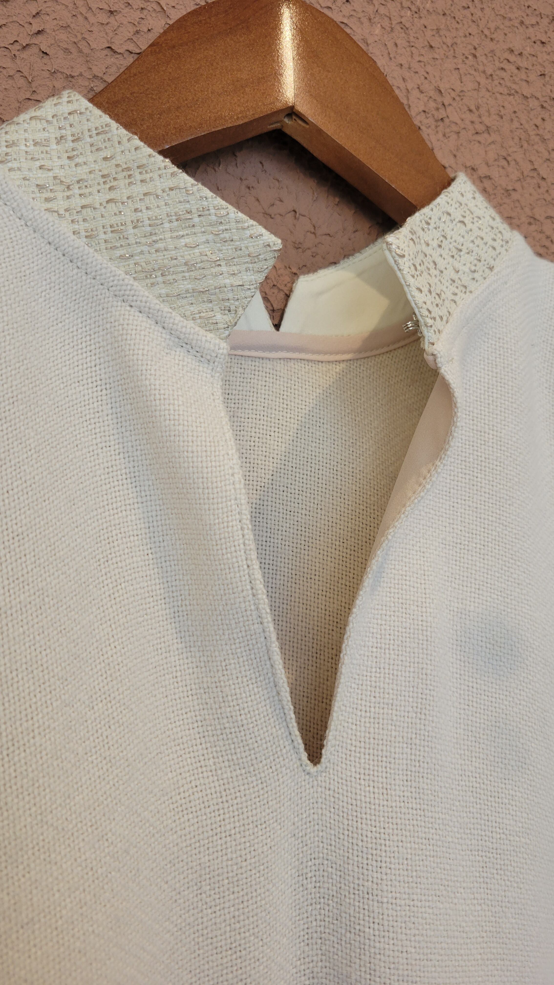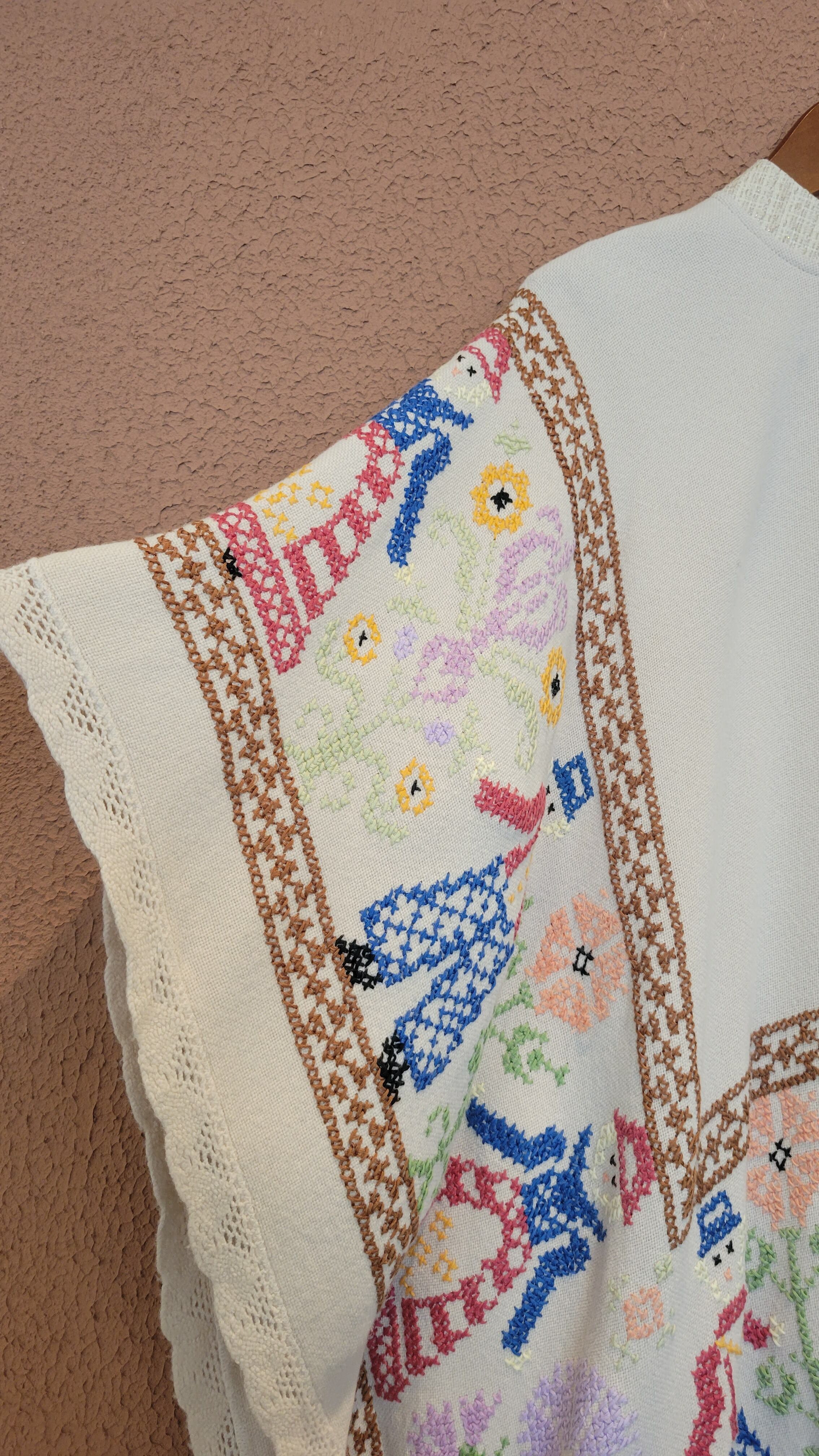ヴィンテージクロスを使用したリメイクトップス。素材表記はありませんがウールのようです。落ち感があります。左右サイドは縫われており袖が通せるデザインです。首後ろにホックがひとつ付いています。締め付け感のないストレスフリーな着心地です。*背中右側にシミがあります。画像でご確認ください。