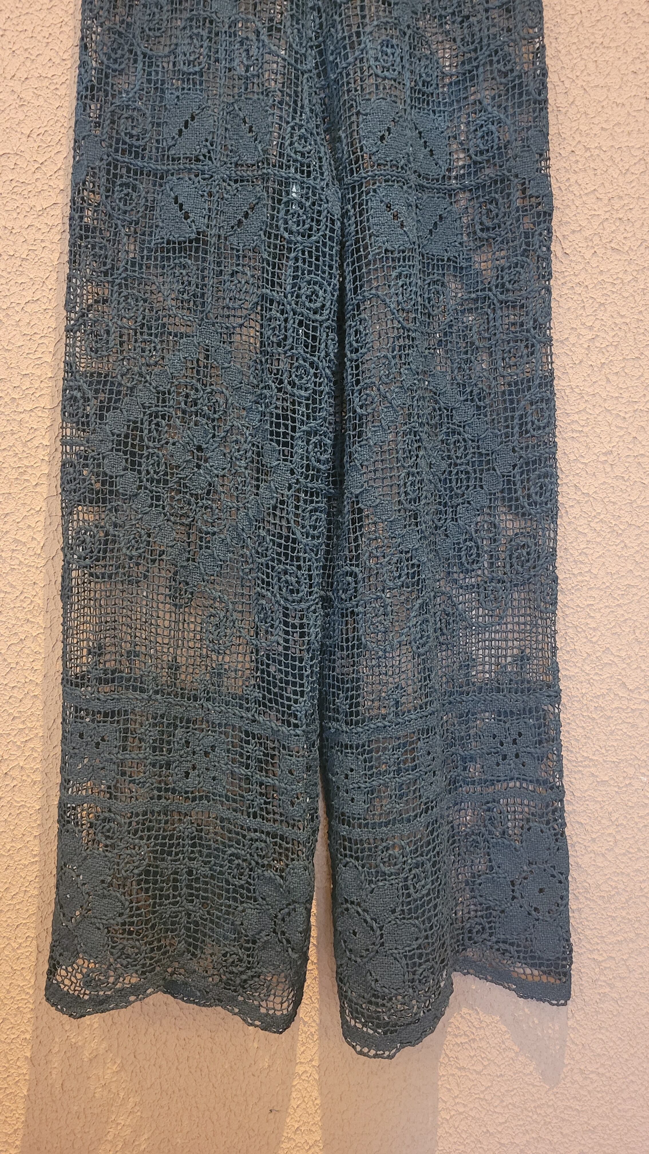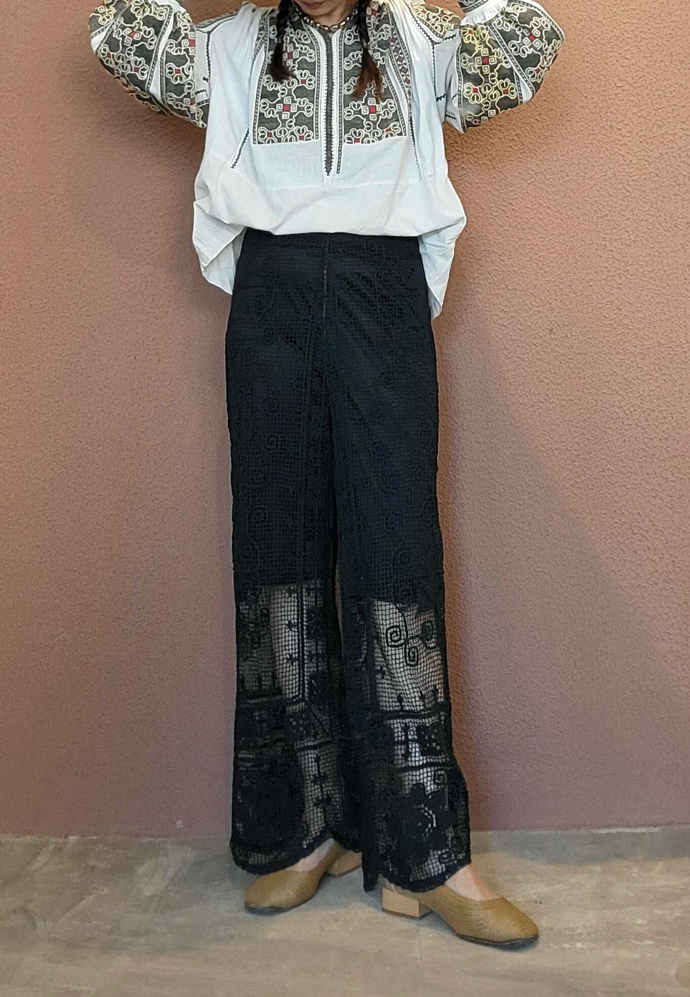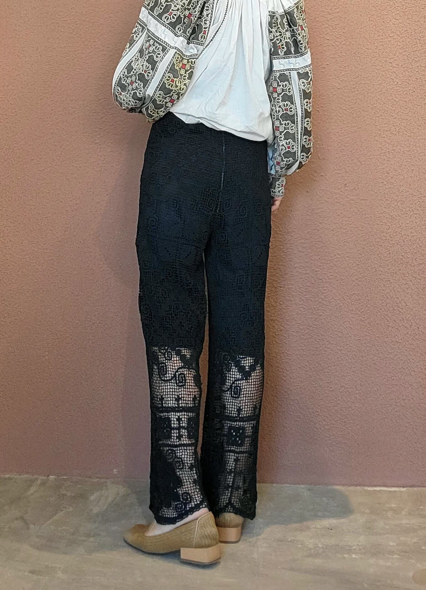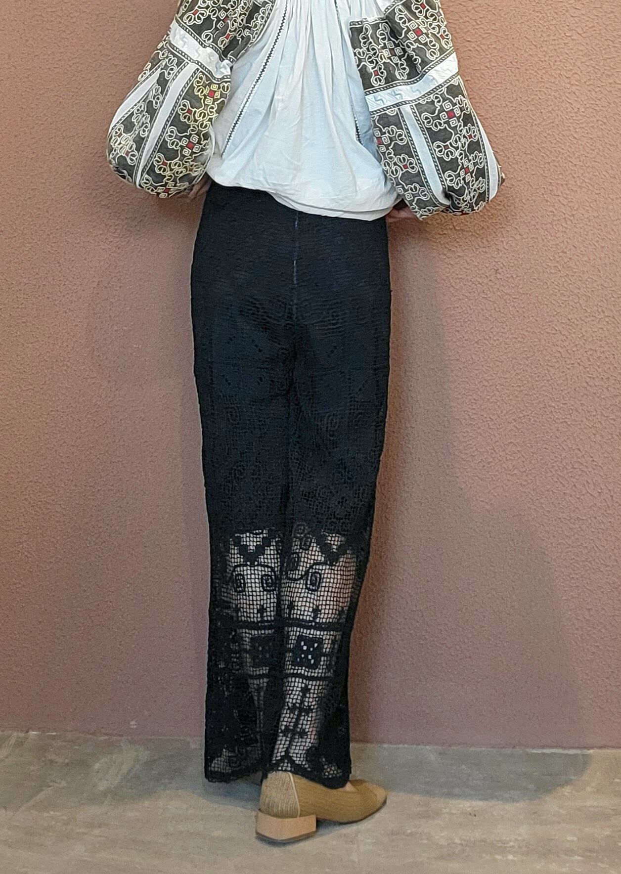ヴィンテージのクロシェ生地を使用したリメイクパンツを柿渋染めで後染めしたパンツです。素材はコットン。ウエストゴム、クロシェ編みのため若干の伸縮性があります。