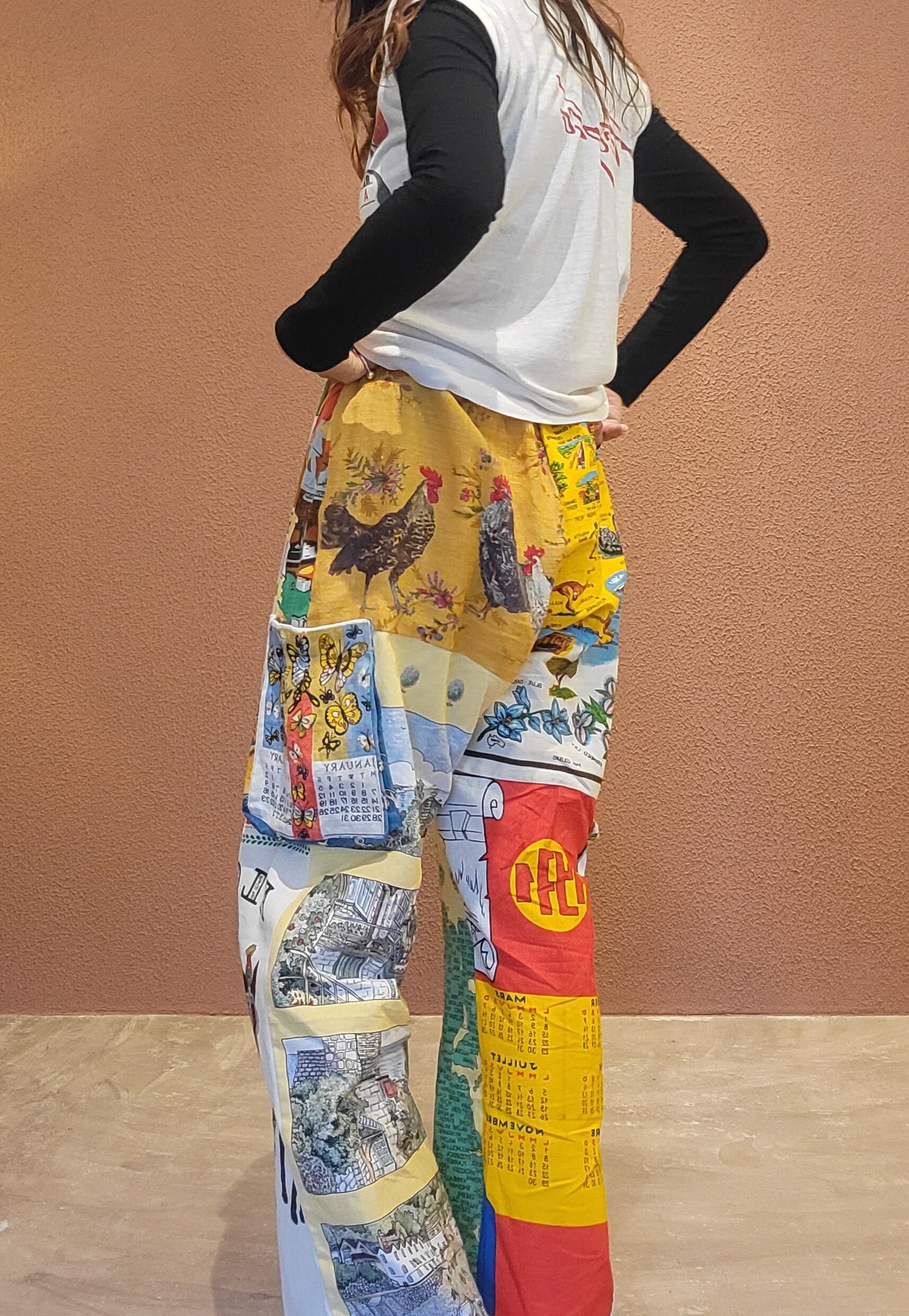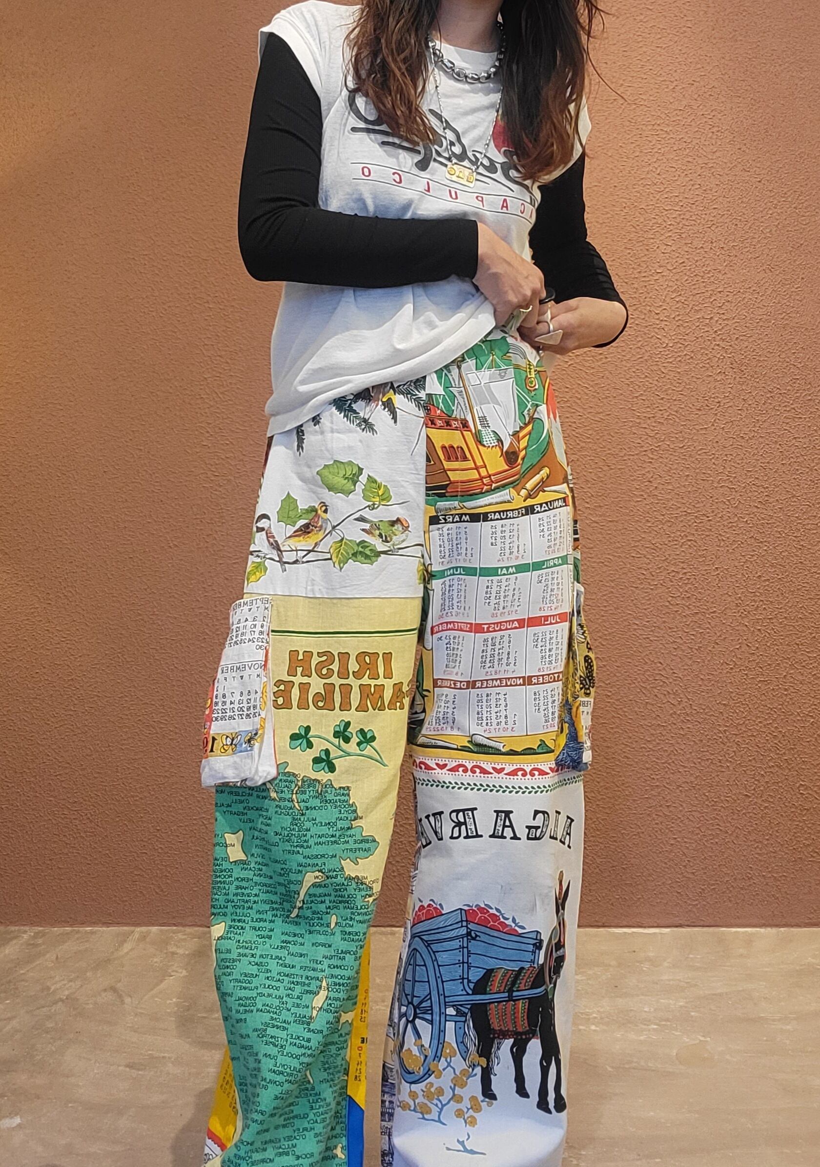 ヴィンテージのティータオルを使用したリメイクカーゴパンツです。