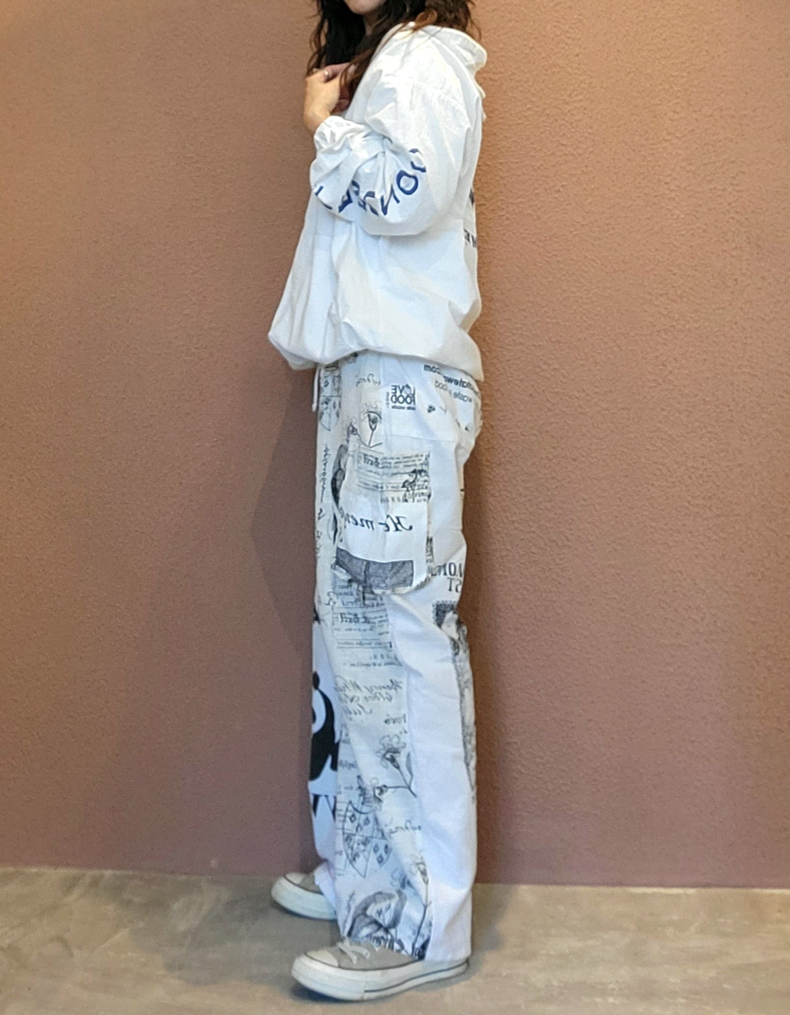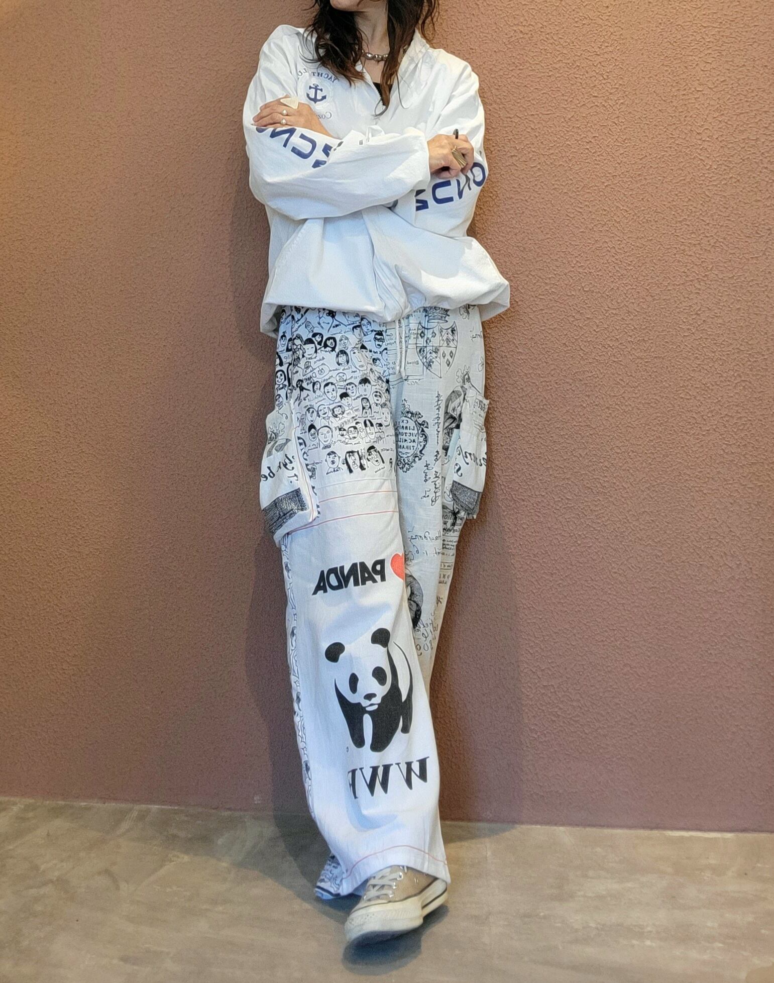 ヴィンテージのティータオルを使用したリメイクカーゴパンツです。