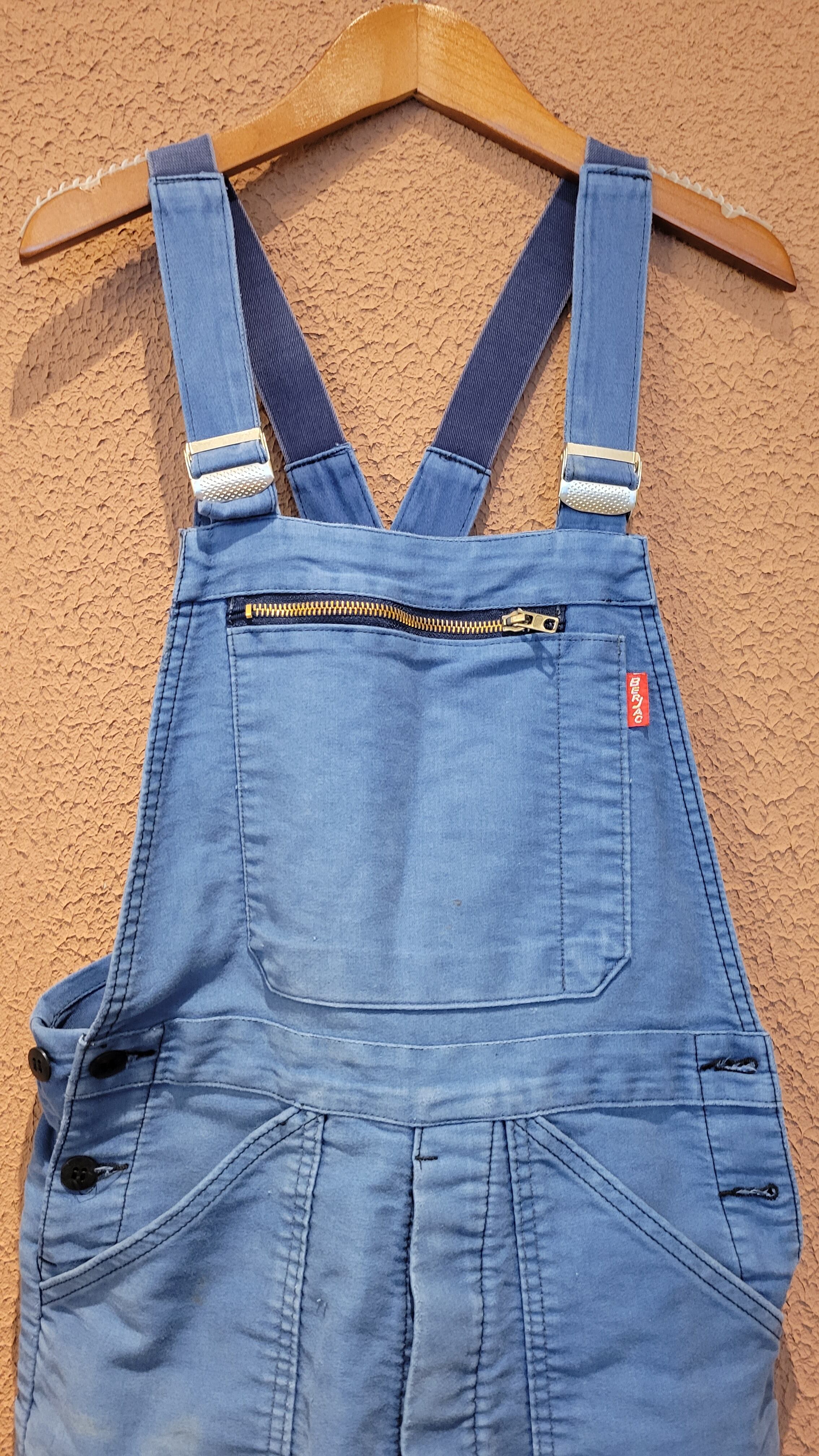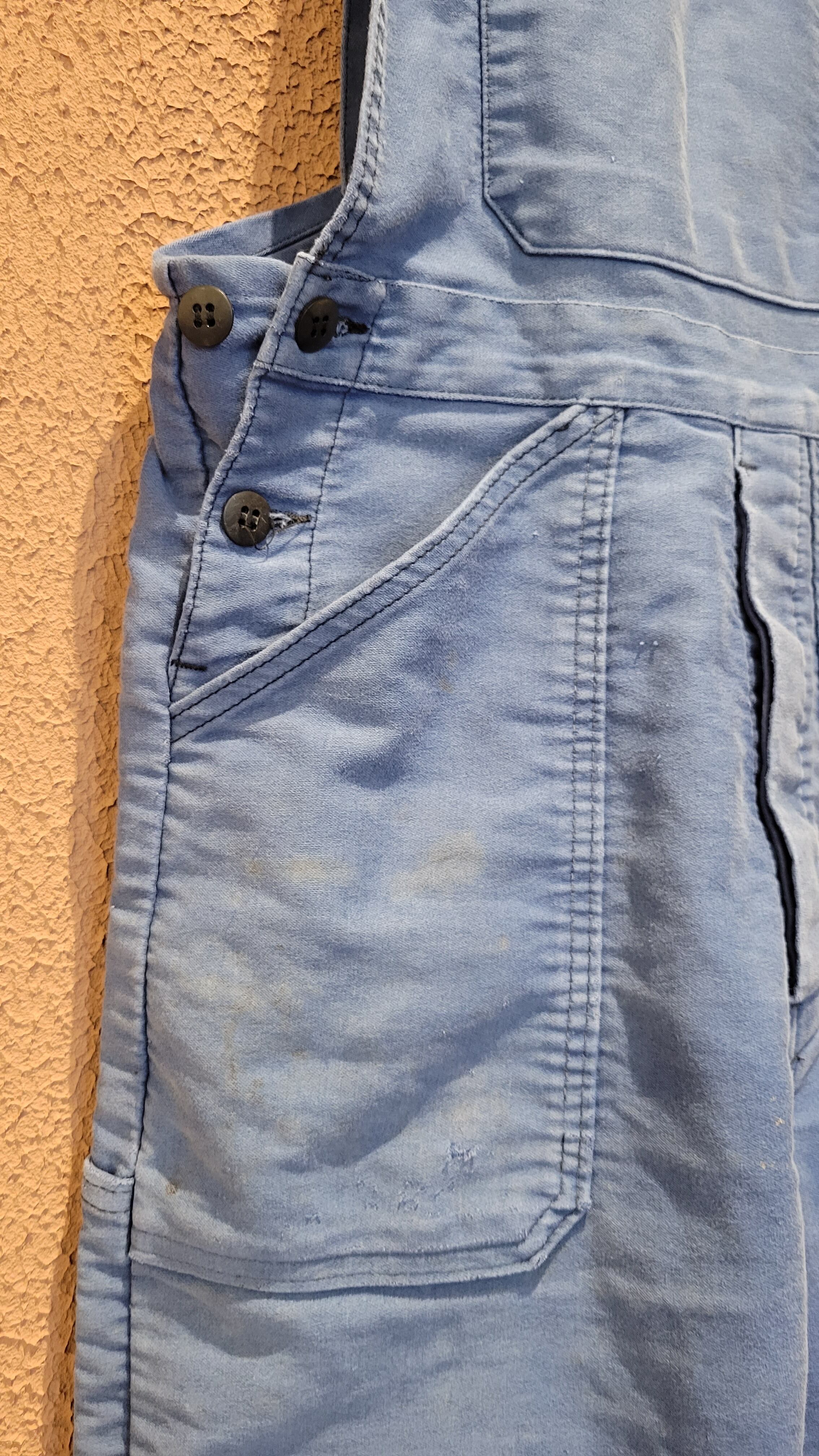 Made in France ヴィンテージモールスキンオーバーオール。モールスキンならではの頑丈なコットン素材ですが、こちらはすでに程よく馴染んでおりなんとも言えない良い色落ちと風合いです。希少なレディースサイズ、コンディションも程よいダメージがあり古いものならではの独特のかっこ良さのある1本です。