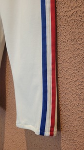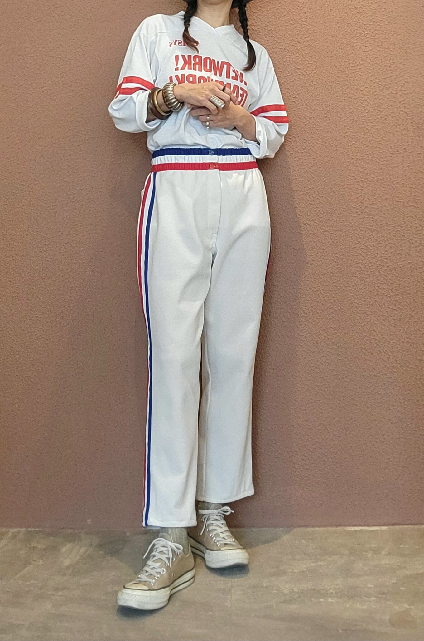 Made in USA サイドライントラックパンツ。素材はポリエステル62% ナイロン38% 伸縮性があります。ウエストはスナップボタン+ファスナー、さらにゴム仕様です。クロップト丈とトリコロールの組み合わせが爽やかです。