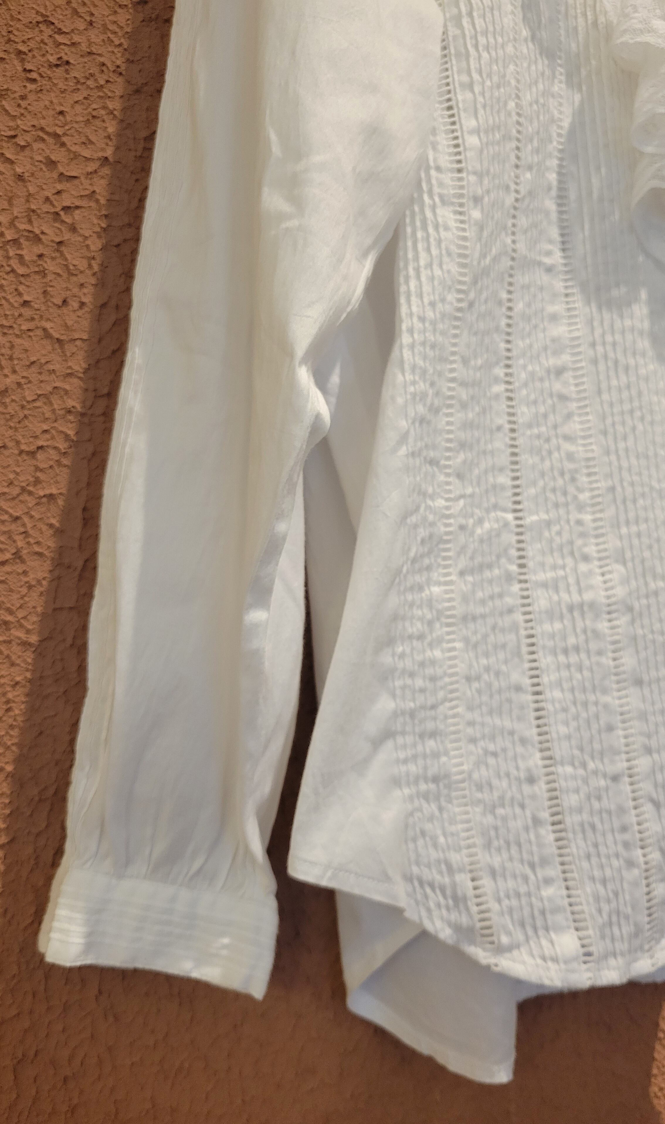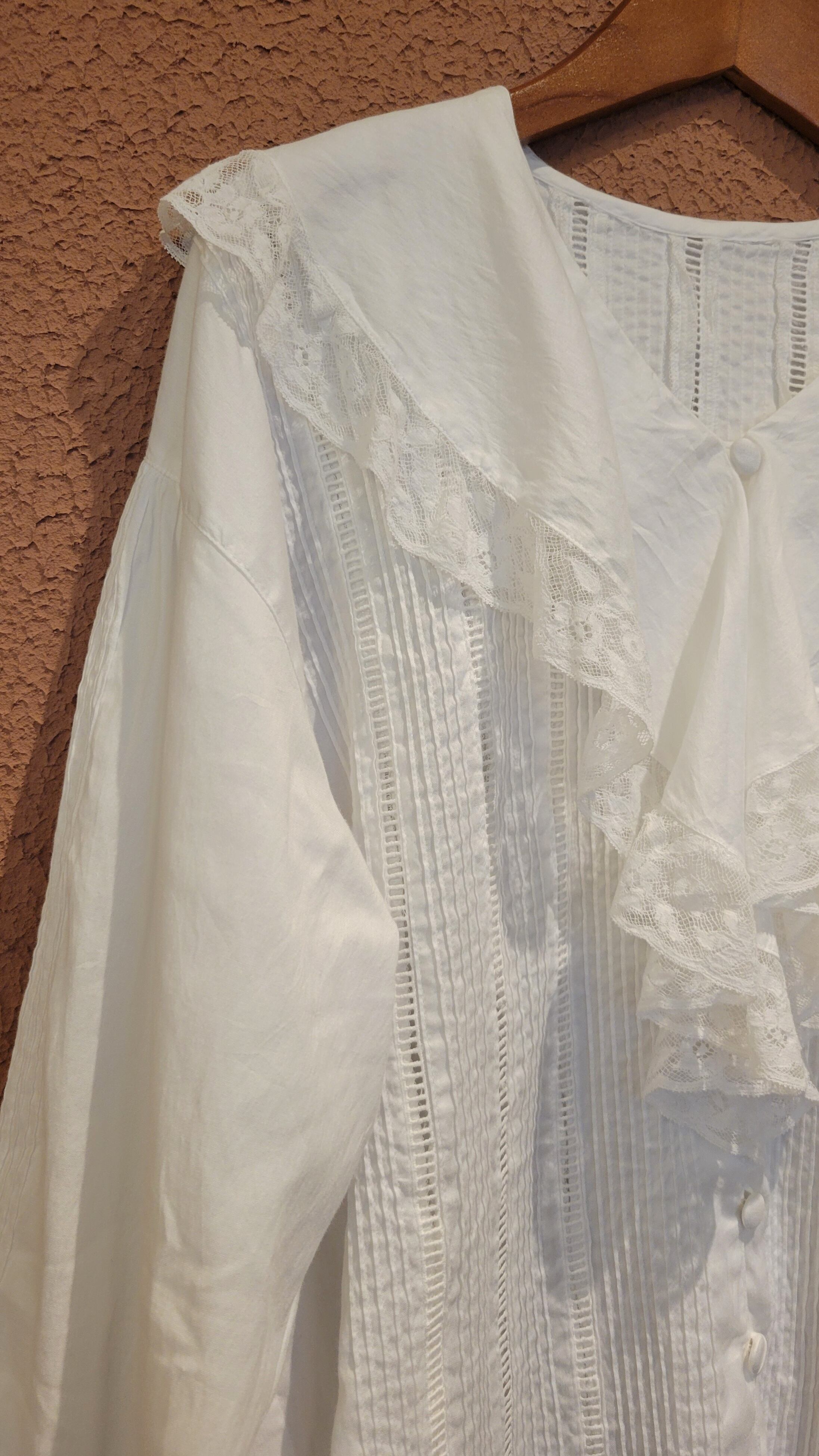 ヴィンテージのホワイトレースブラウス。素材は薄手の柔らかいコットンです。前後身頃と袖に細かいプリーツとはしごレースが施された贅沢な1枚。ドレープの美しいレース襟も魅力です。カジュアルにもオケージョンにも。