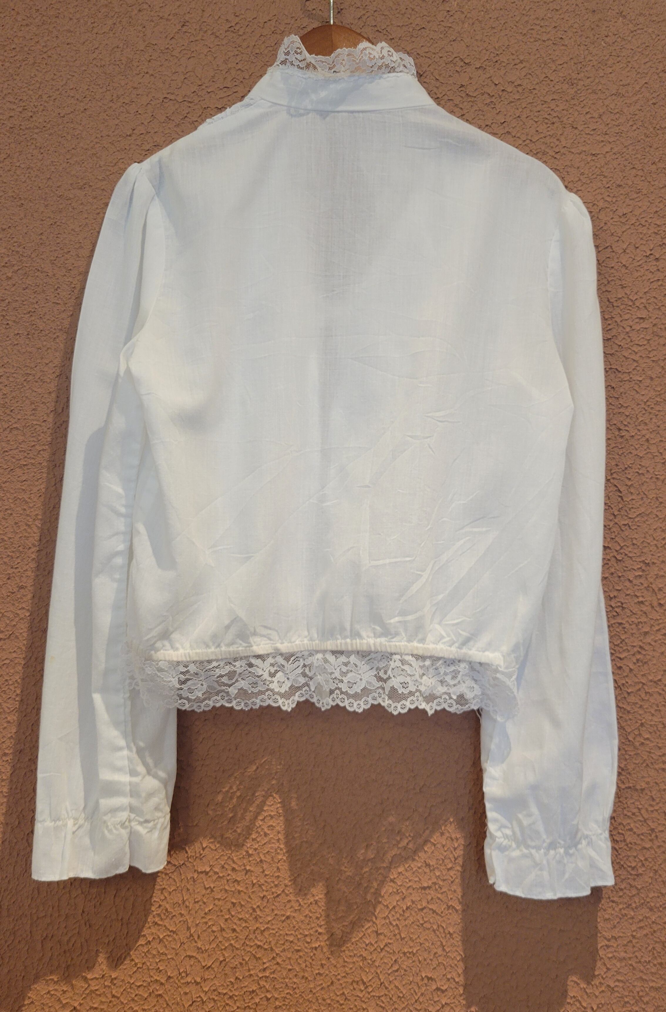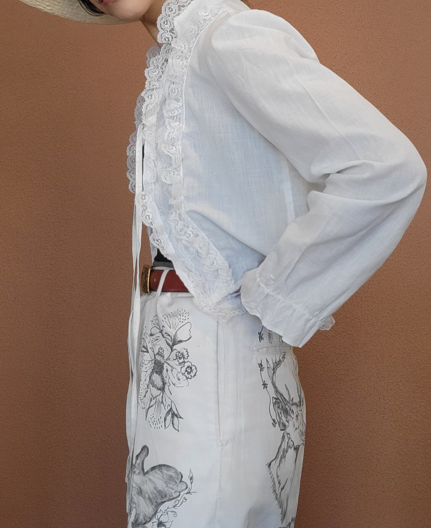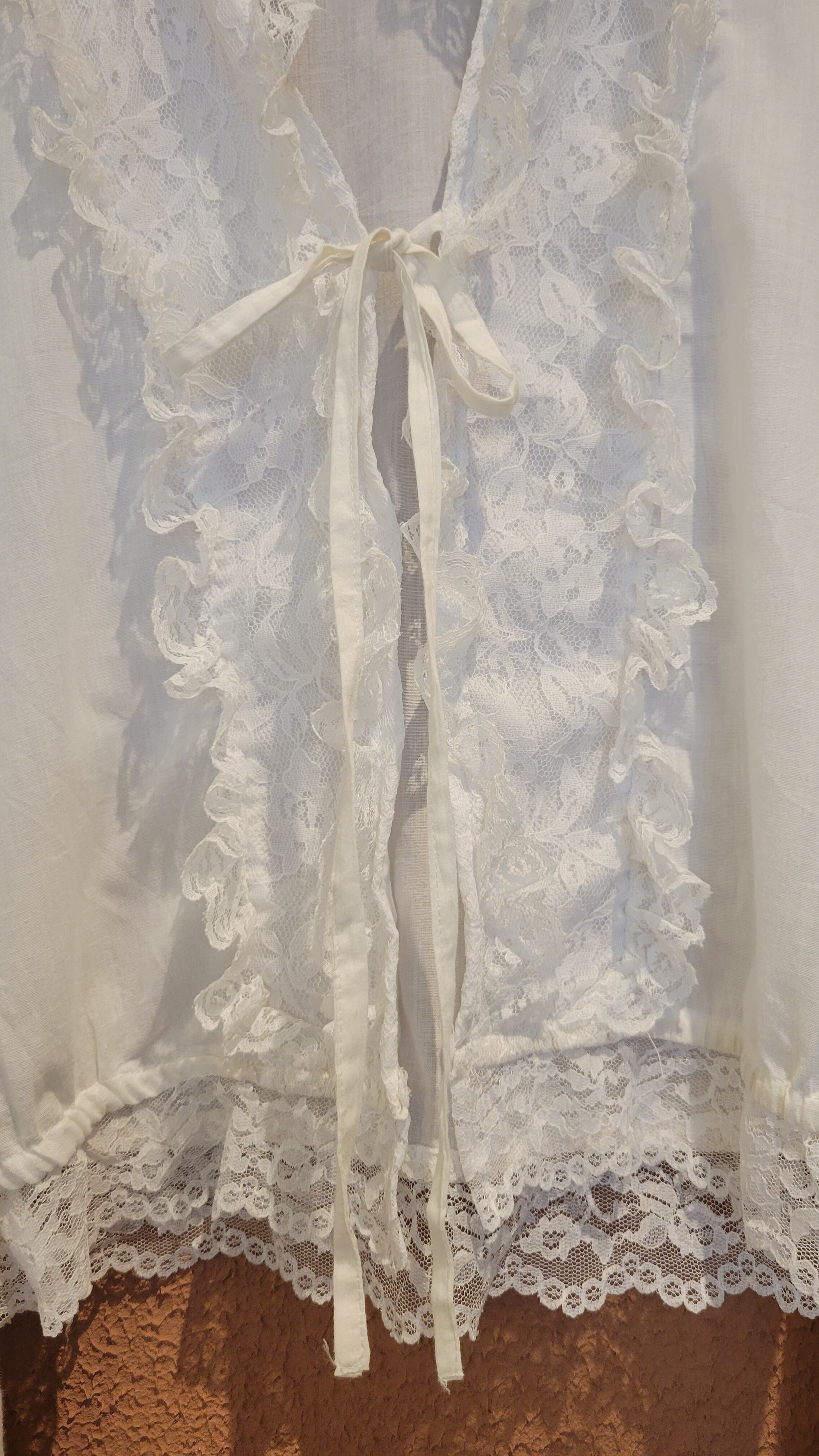 ヴィンテージのホワイトレースブラウス。素材表記はありませんがコットンとポリエステルの混紡素材のようです。やや透け感のある薄手の柔らかい素材です。フロントリボンをほどいて羽織りとしても着られます。*左袖後ろ肘掛辺りに小さなシミがひとつあります。画像でご確認ください。