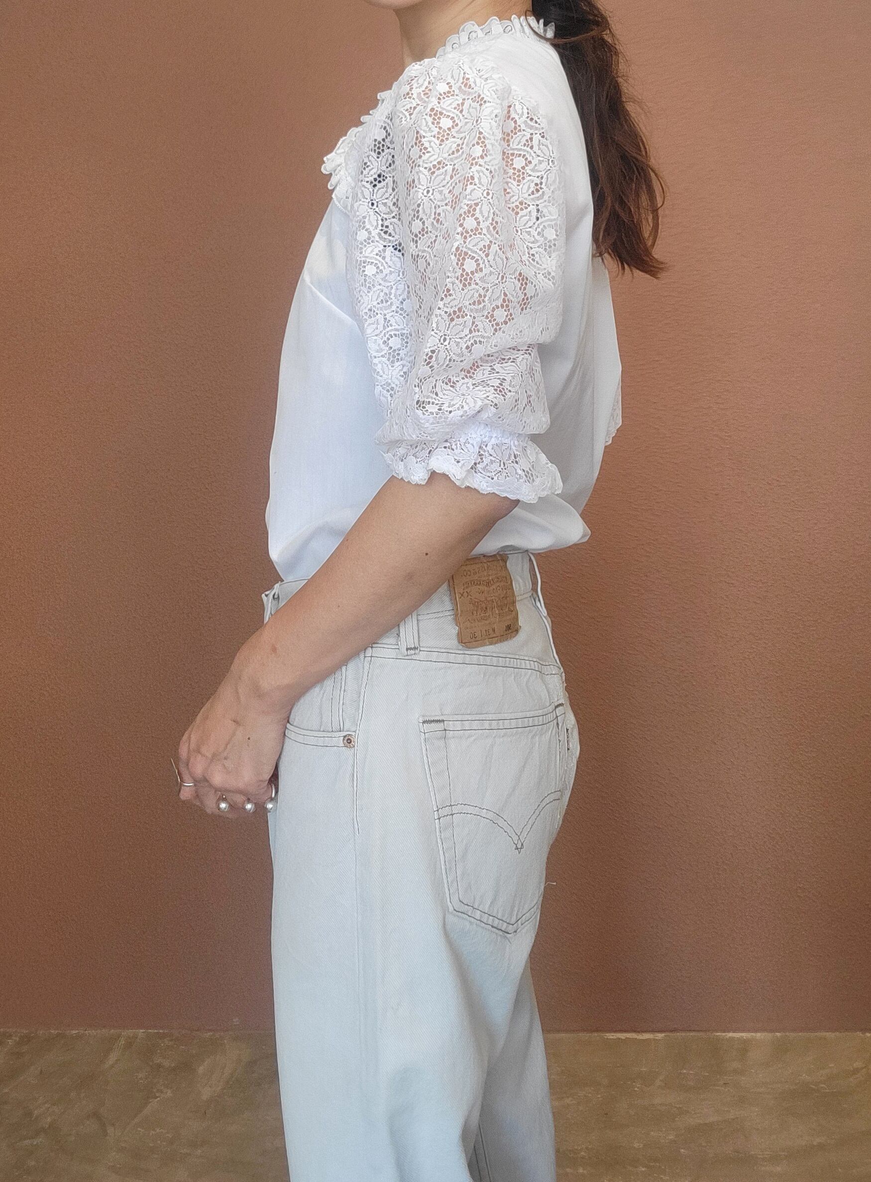 ヴィンテージのホワイトレースブラウス。素材表記はありませんがコットンとポリエステルの混紡素材のようです。やや張り感があります。総レースのボリュームスリーブが涼しげで華やか。ほどよい丈感でインでもアウトでもバランス良く着られます。