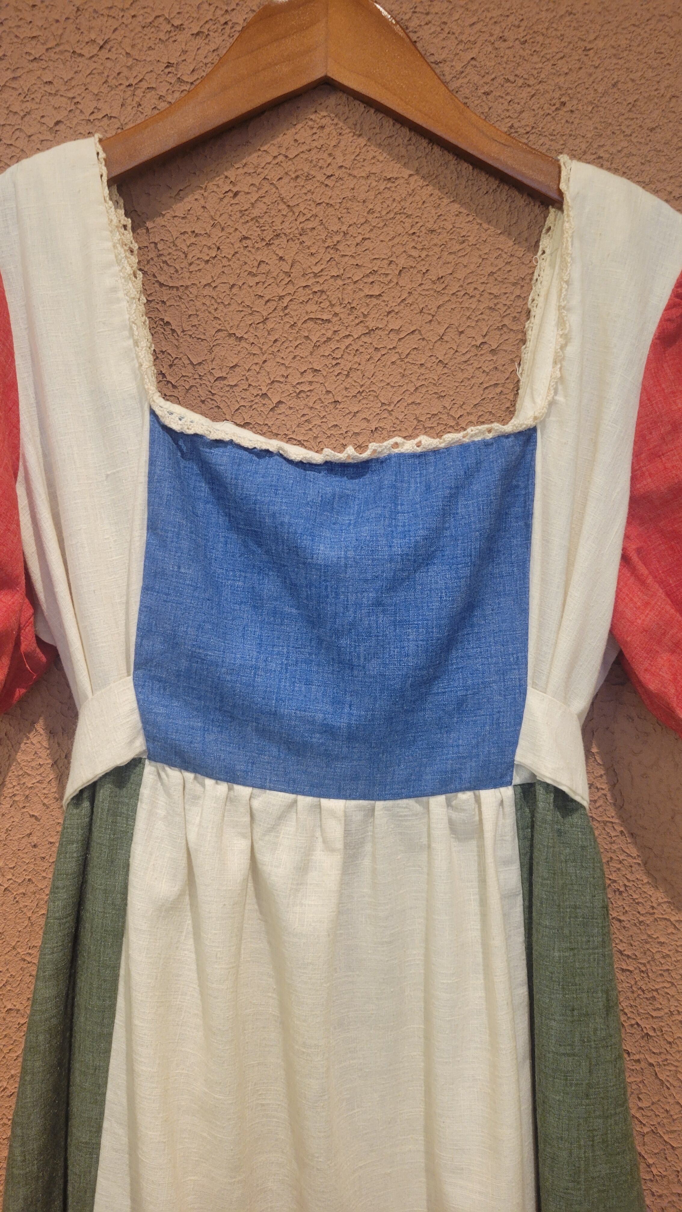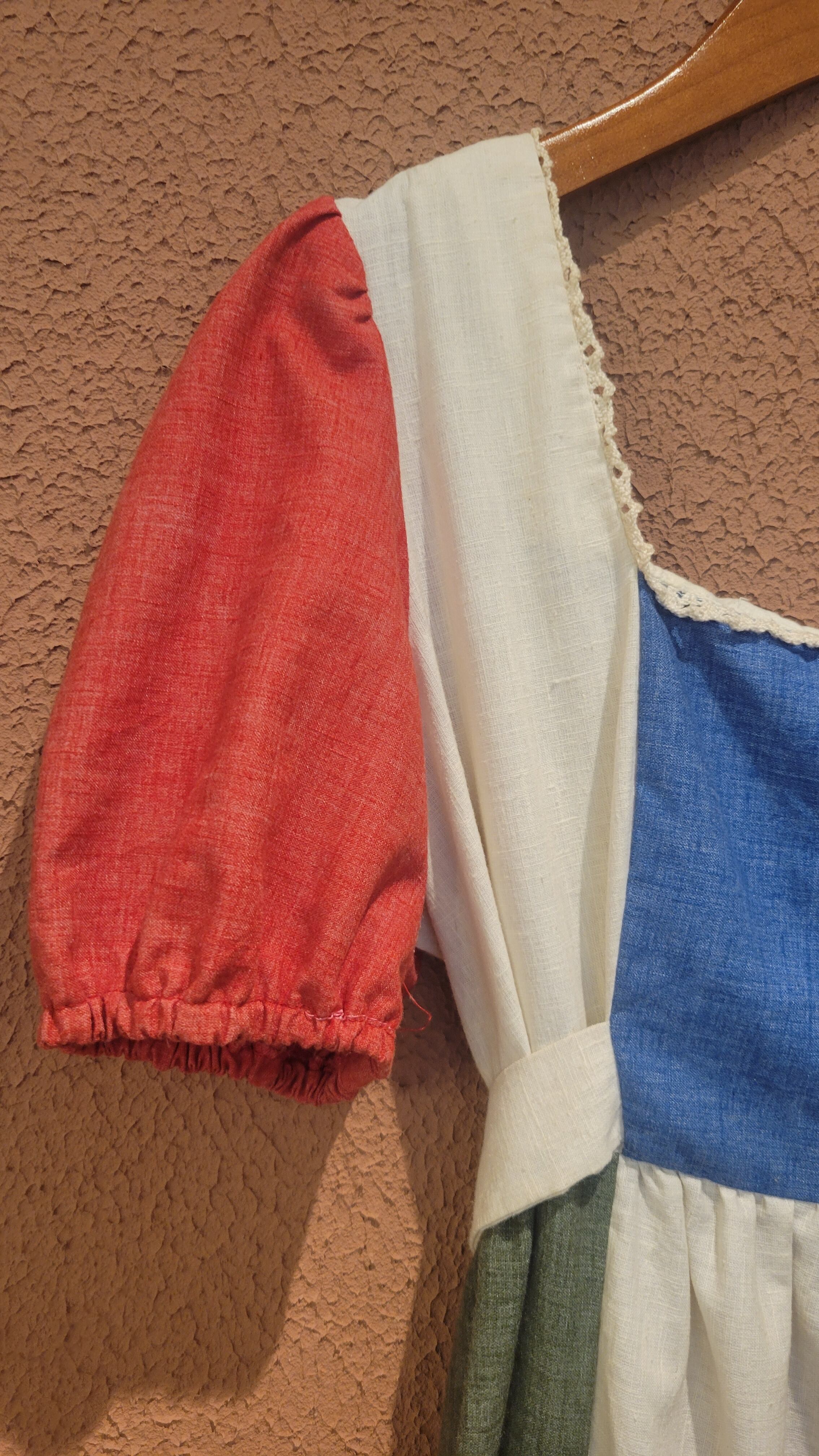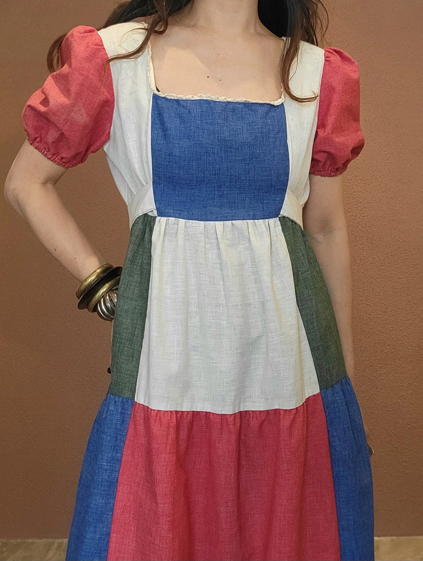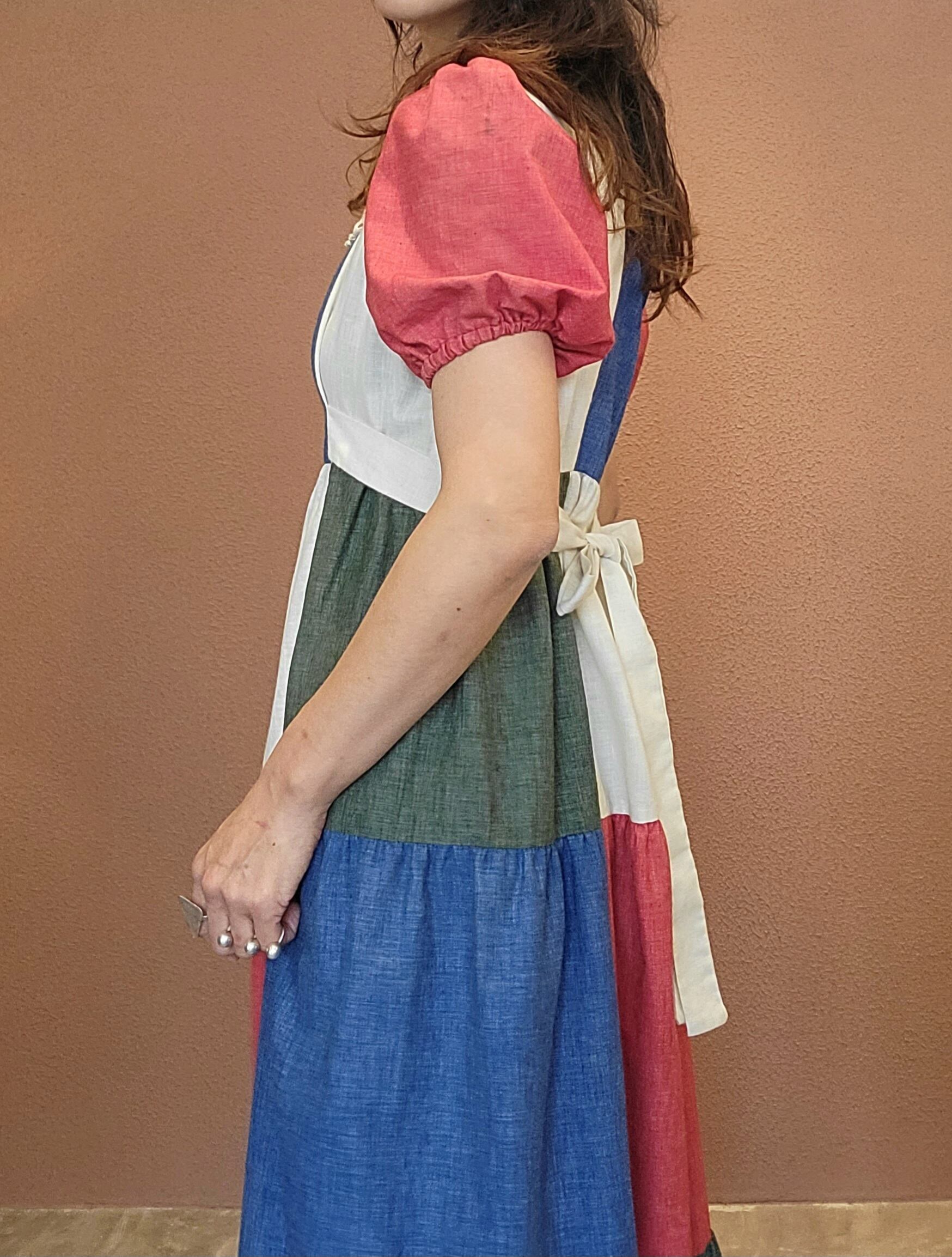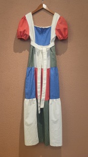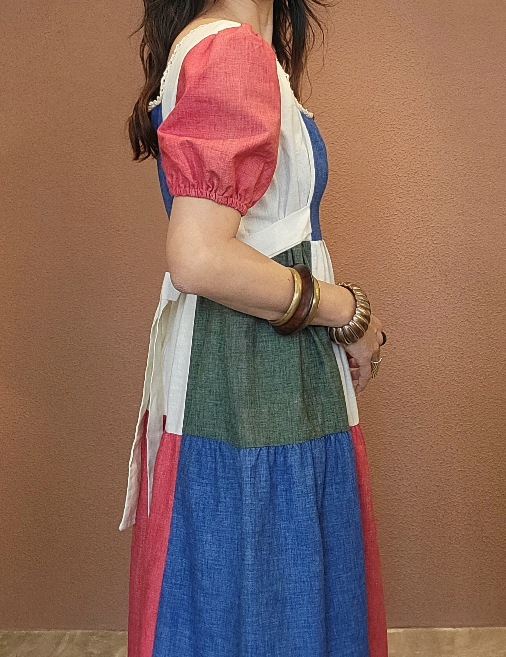 ヴィンテージのマキシワンピース。素材表記はありませんがコットンです。落ち着いた色のカラートーンです。バックファスナーで着脱も簡単に。ウエストリボン付き。透け感が無く1枚で仕上がる春夏のワンピースです。*右袖に薄い黒のシミがあります。画像でご確認ください。