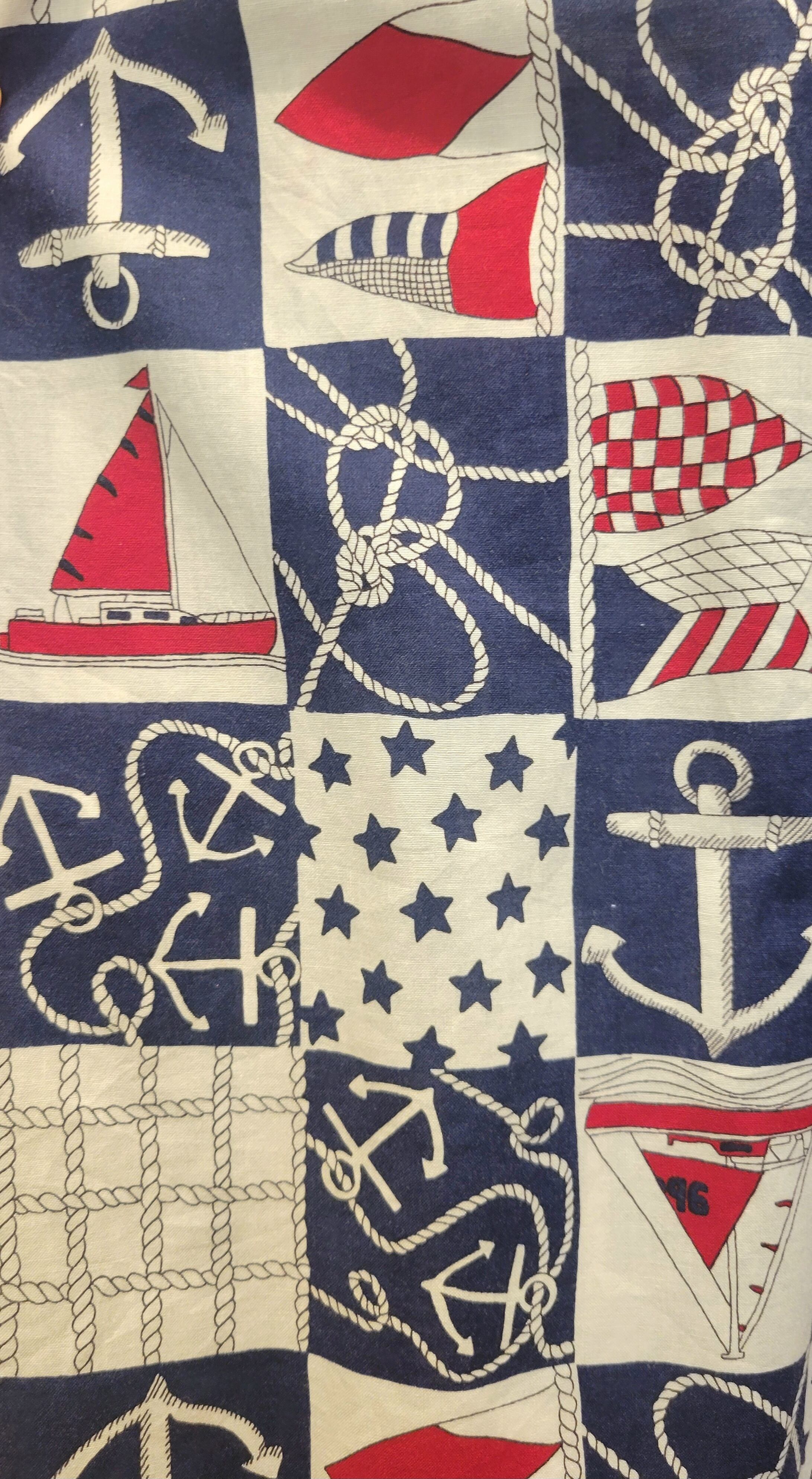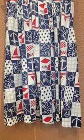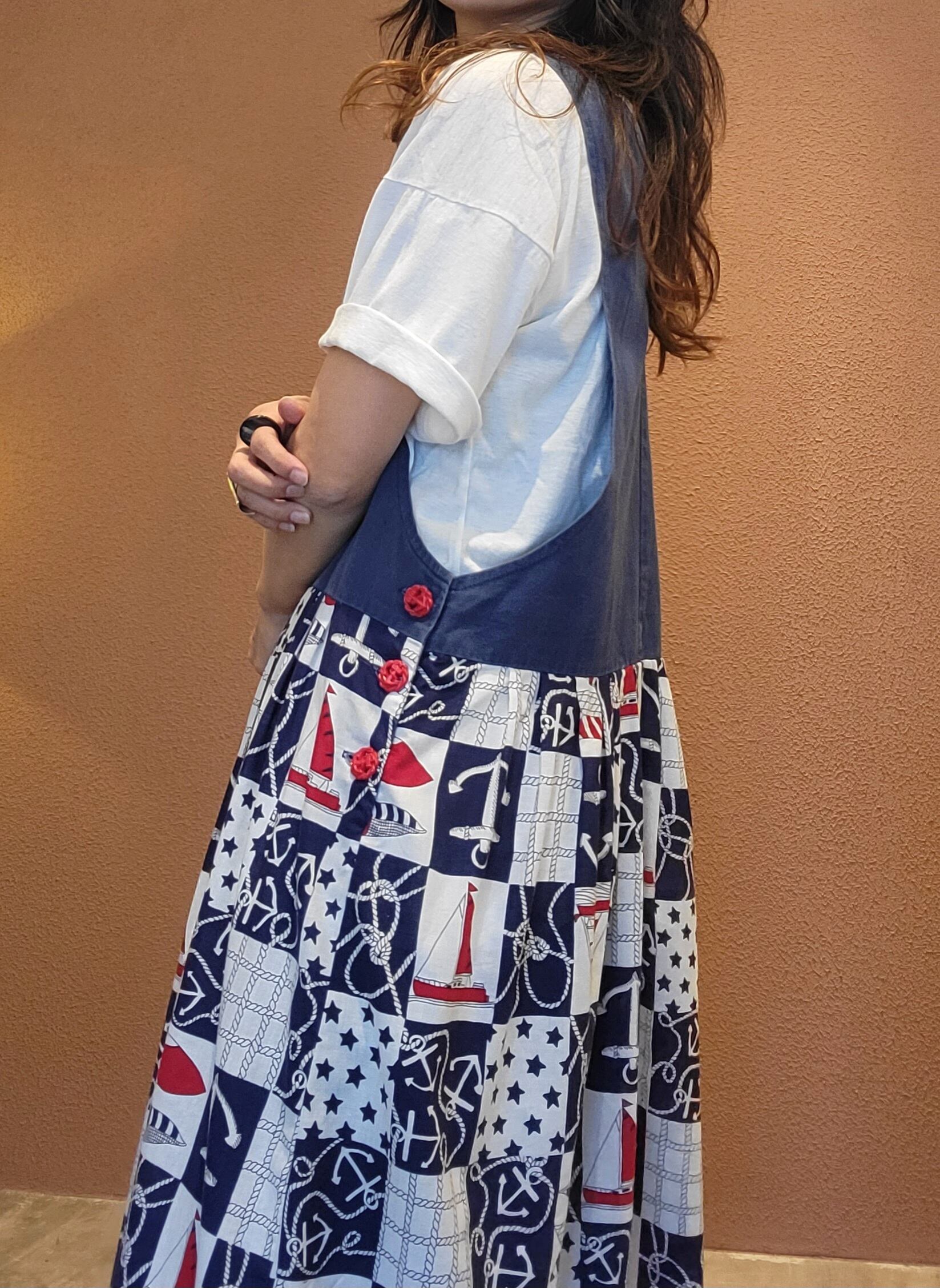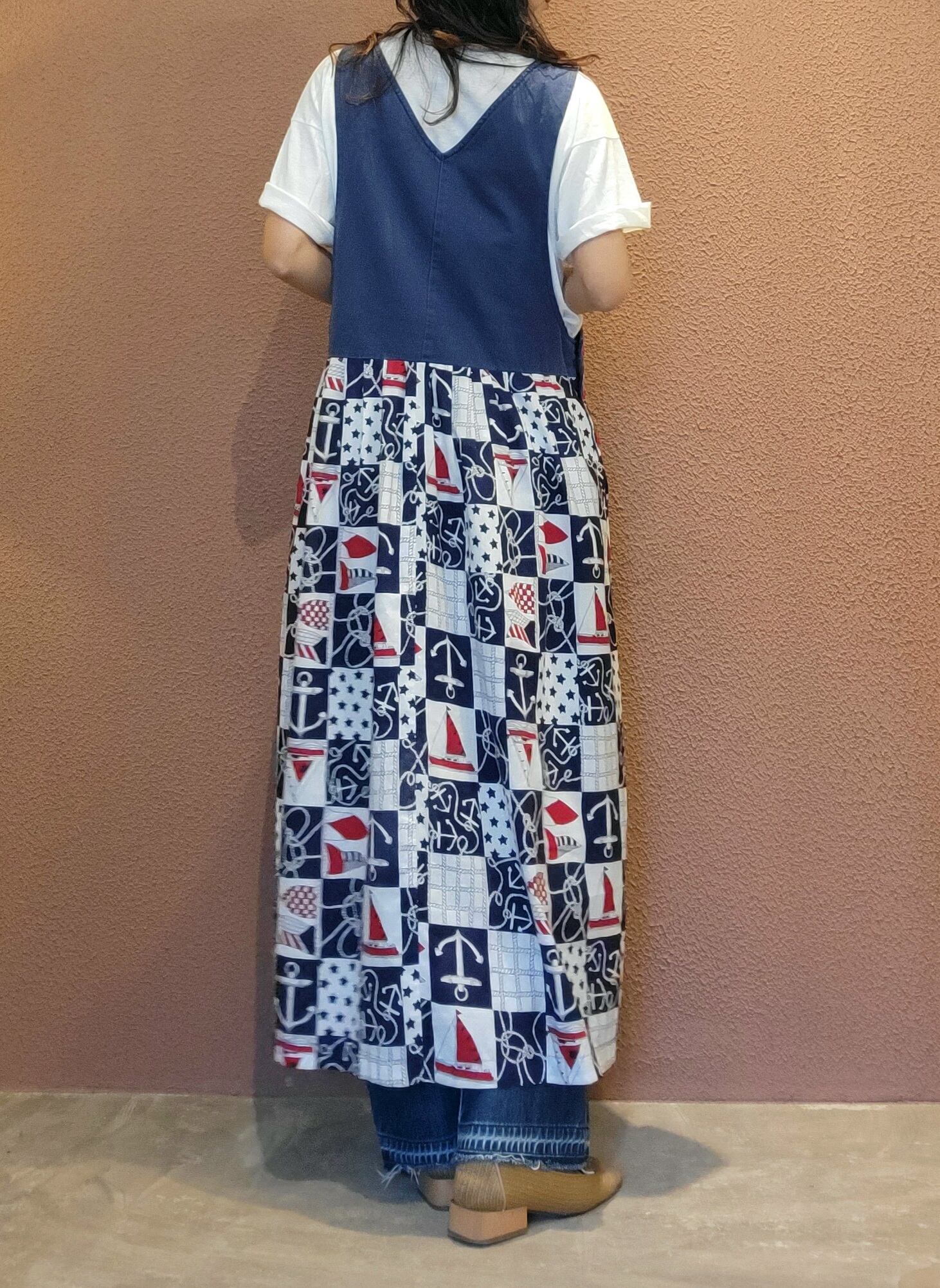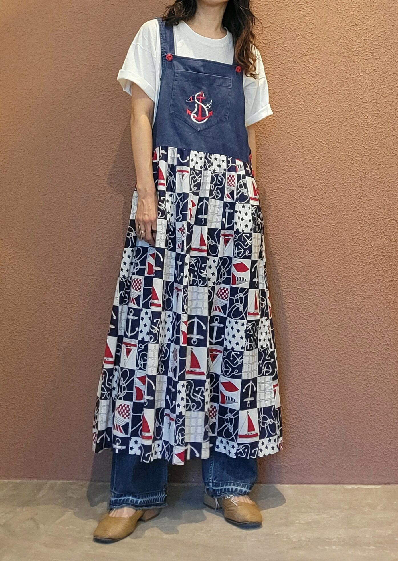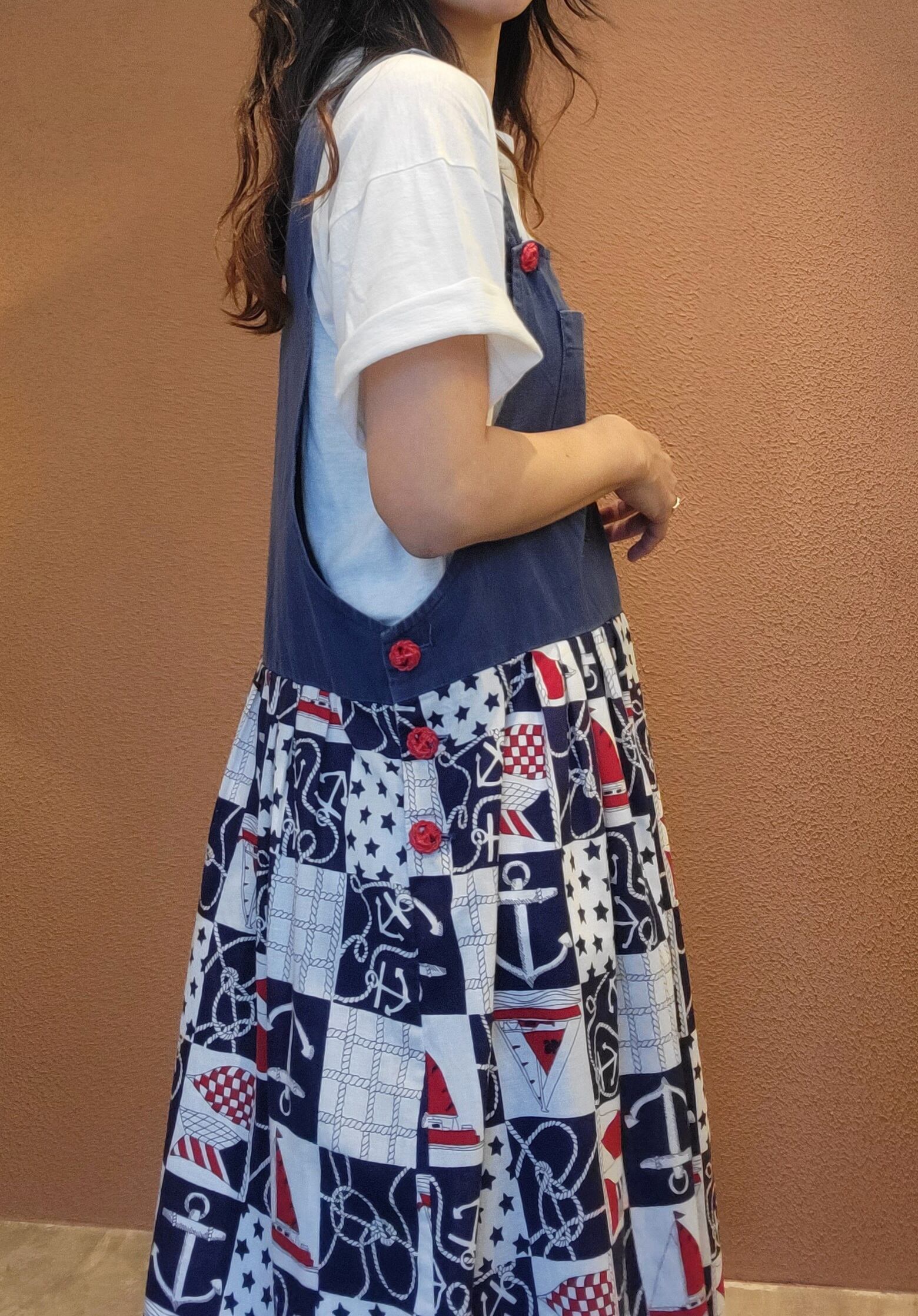 Made in USA のヴィンテージジャンパースカート。素材はコットンです。ゆったりしたサイジングで締め付け感無くストレスフリーな着心地。イカリモチーフの赤いボタンがアクセントに。マリンプリントとトリコロールカラーが夏らしく爽やかな1着です。