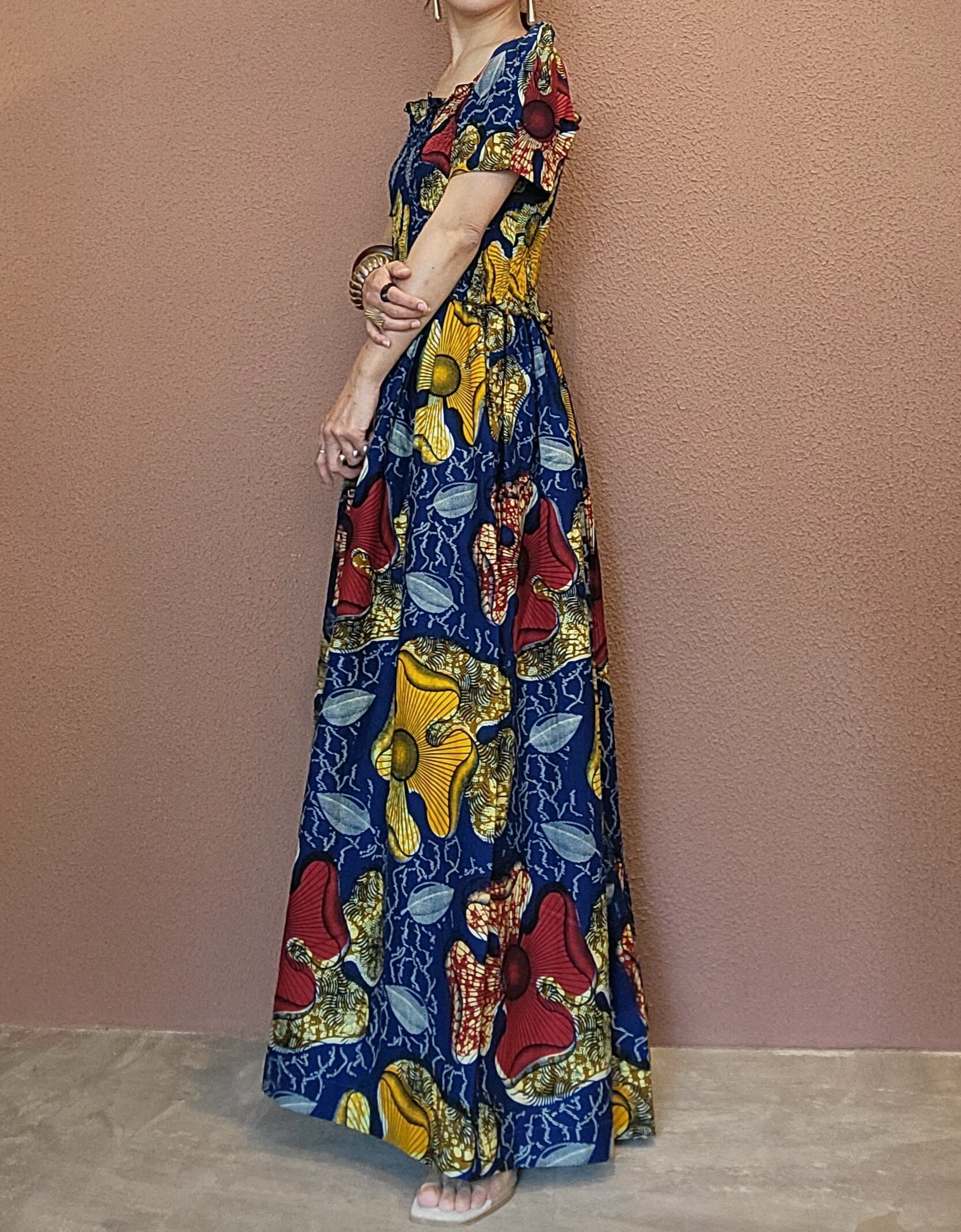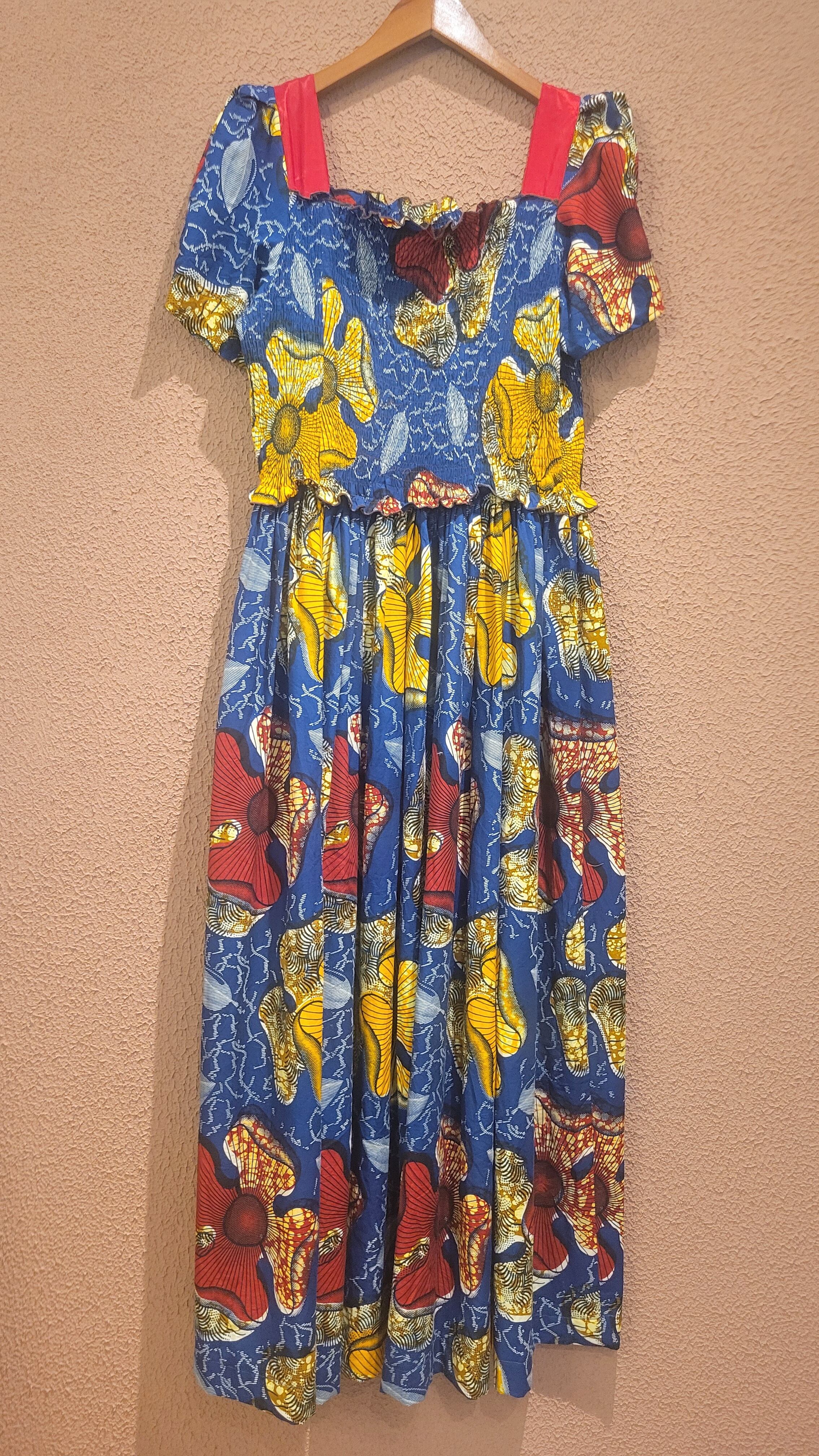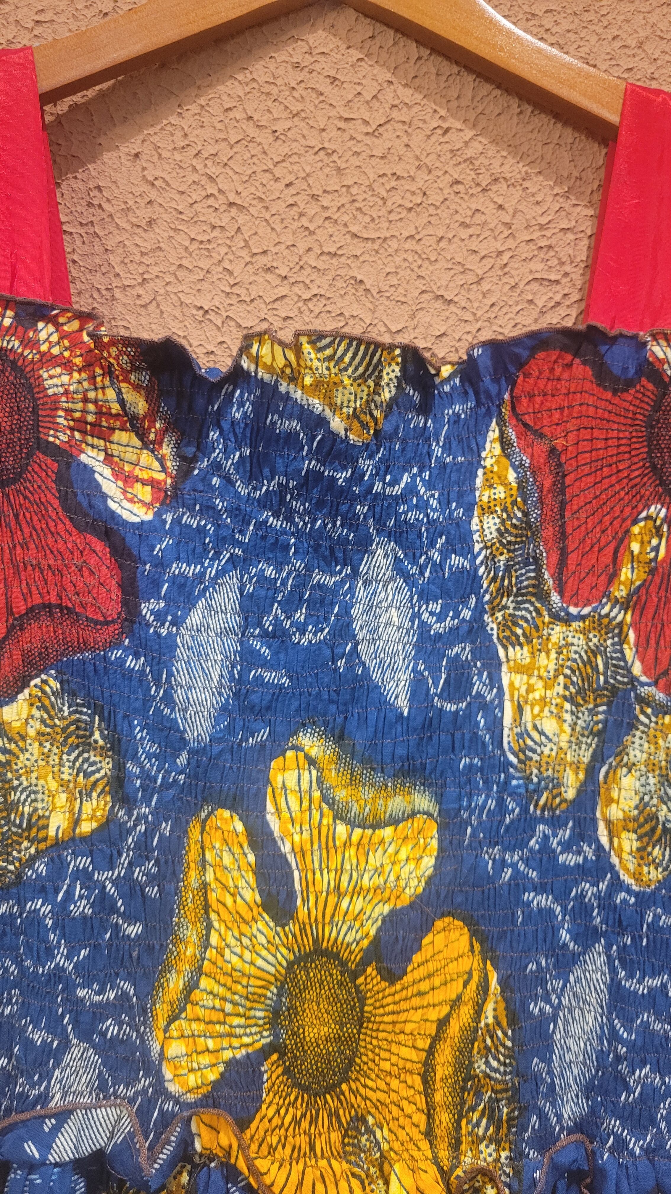 ヴィンテージのアフリカンバティックワンピース。素材はコットンです。トップス部分はシャーリングゴム、スカート部分はたっぷりの生地を使ったボリュームギャザーでめりはりのある綺麗なシルエットです。肩の赤いサテン地の切り替えが良いアクセントに。肩のプリーツやウエストの小さなフリル等ディテールにもこだわりを感じる一着です。