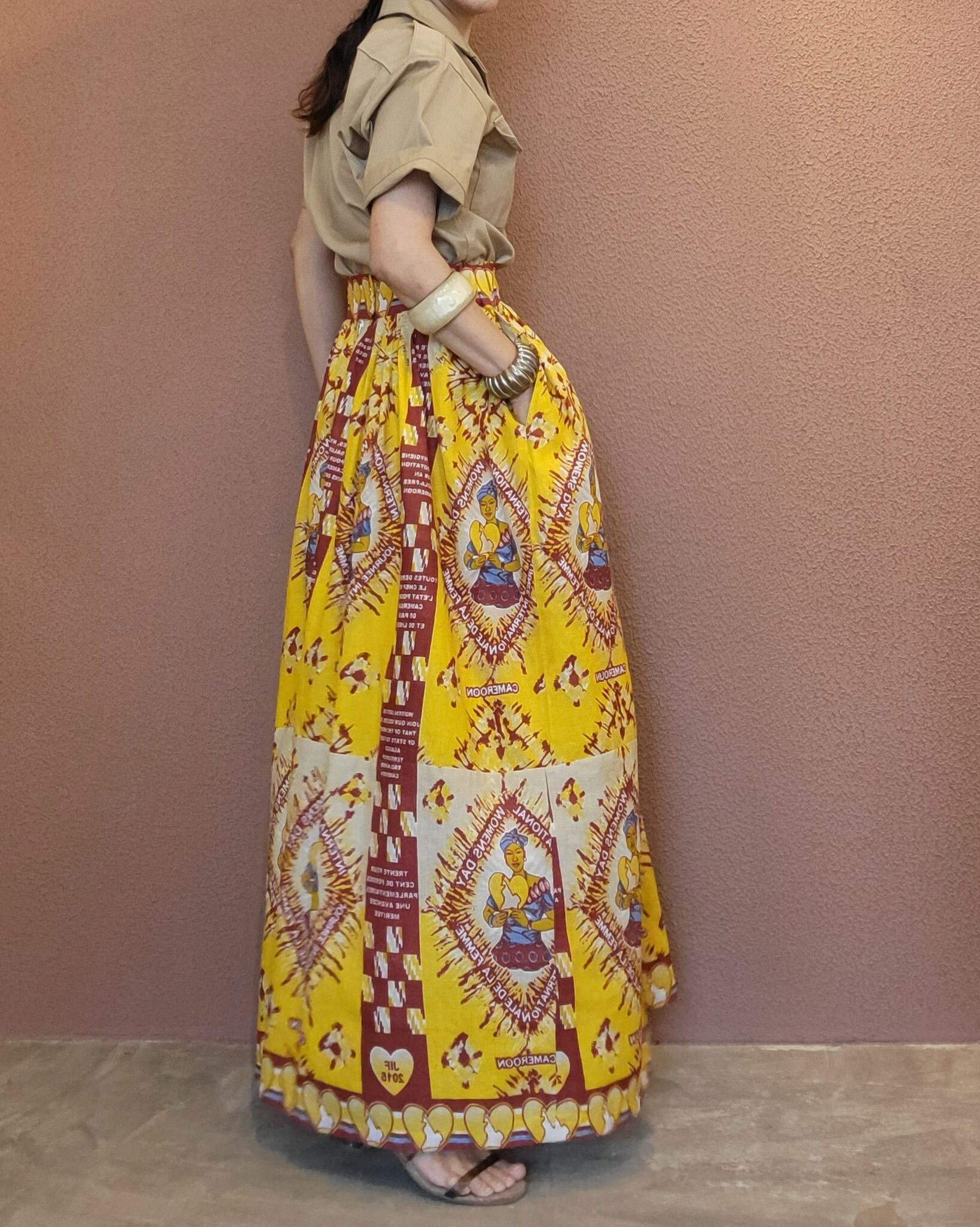 国際女性デー アフリカンプリントのマキシギャザースカート。素材表記はありませんがコットンのようです。ウエストは左右にゴム入り、バックはホックとファスナーが付いています。インパクトのある総柄ながら派手すぎず、合わせやすい1着です。
