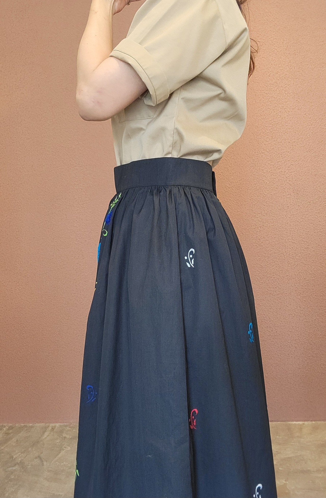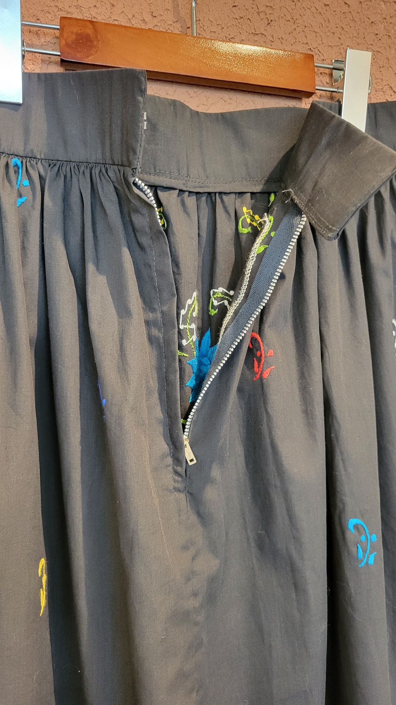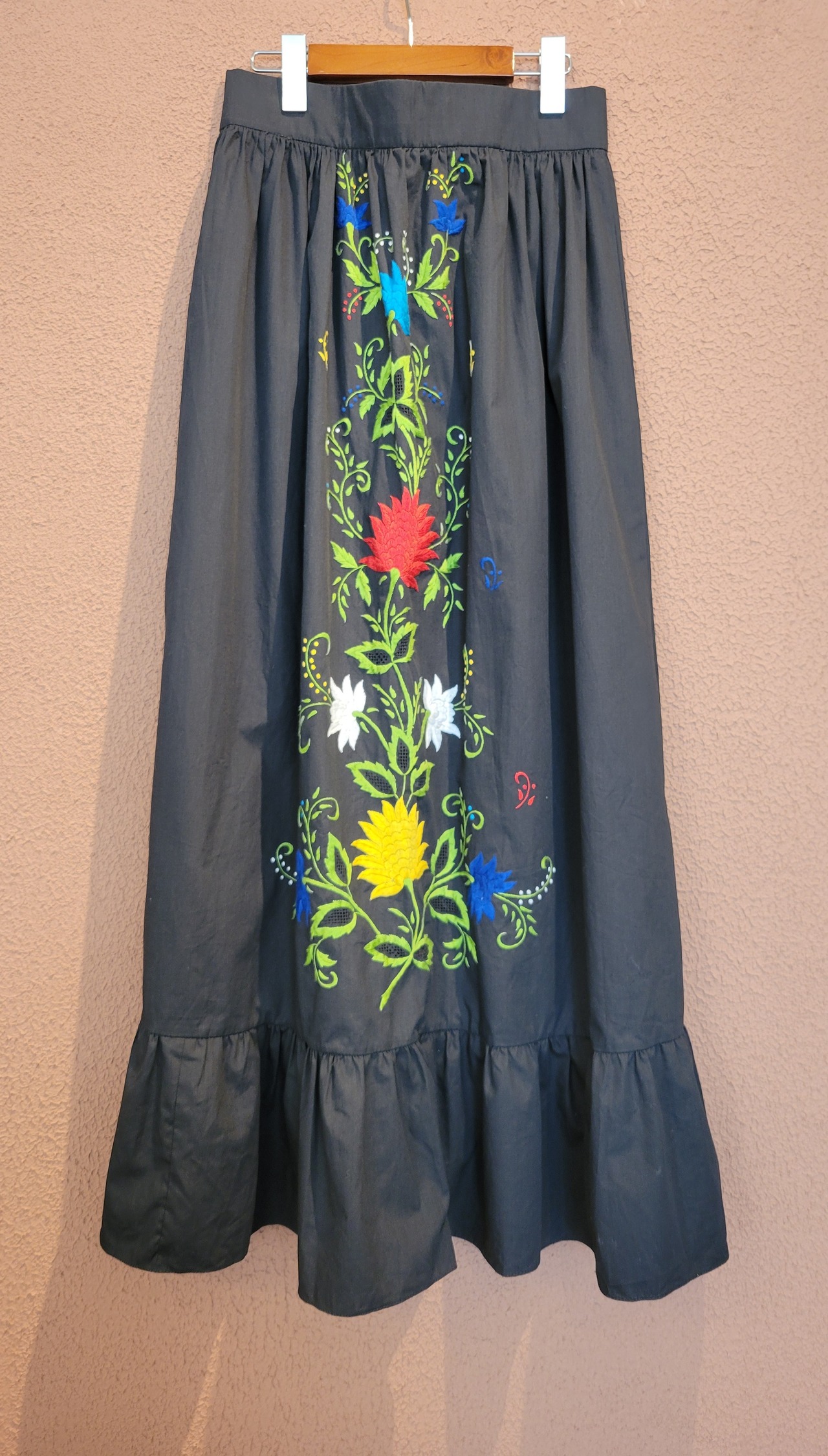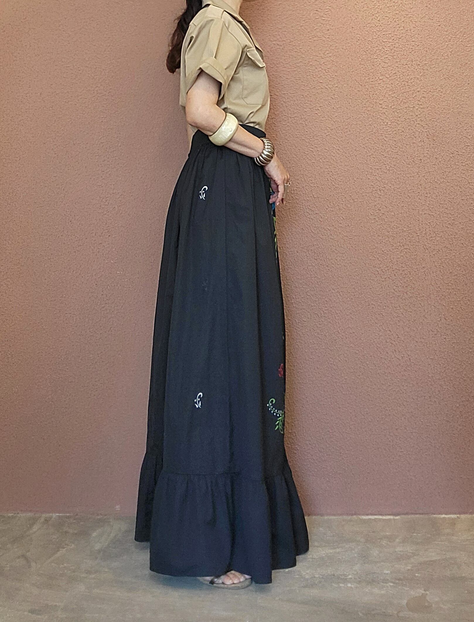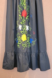 ヴィンテージのフィリピン刺繍マキシスカート。素材表記はありませんがコットンとポリエステルの混紡のようです。透け感はありません。フロント中央とバックにも刺繍入りです。ウエスト後ろにホックとジッパー付き。黒地に鮮やかな刺繍が映える存在感のある1着です。