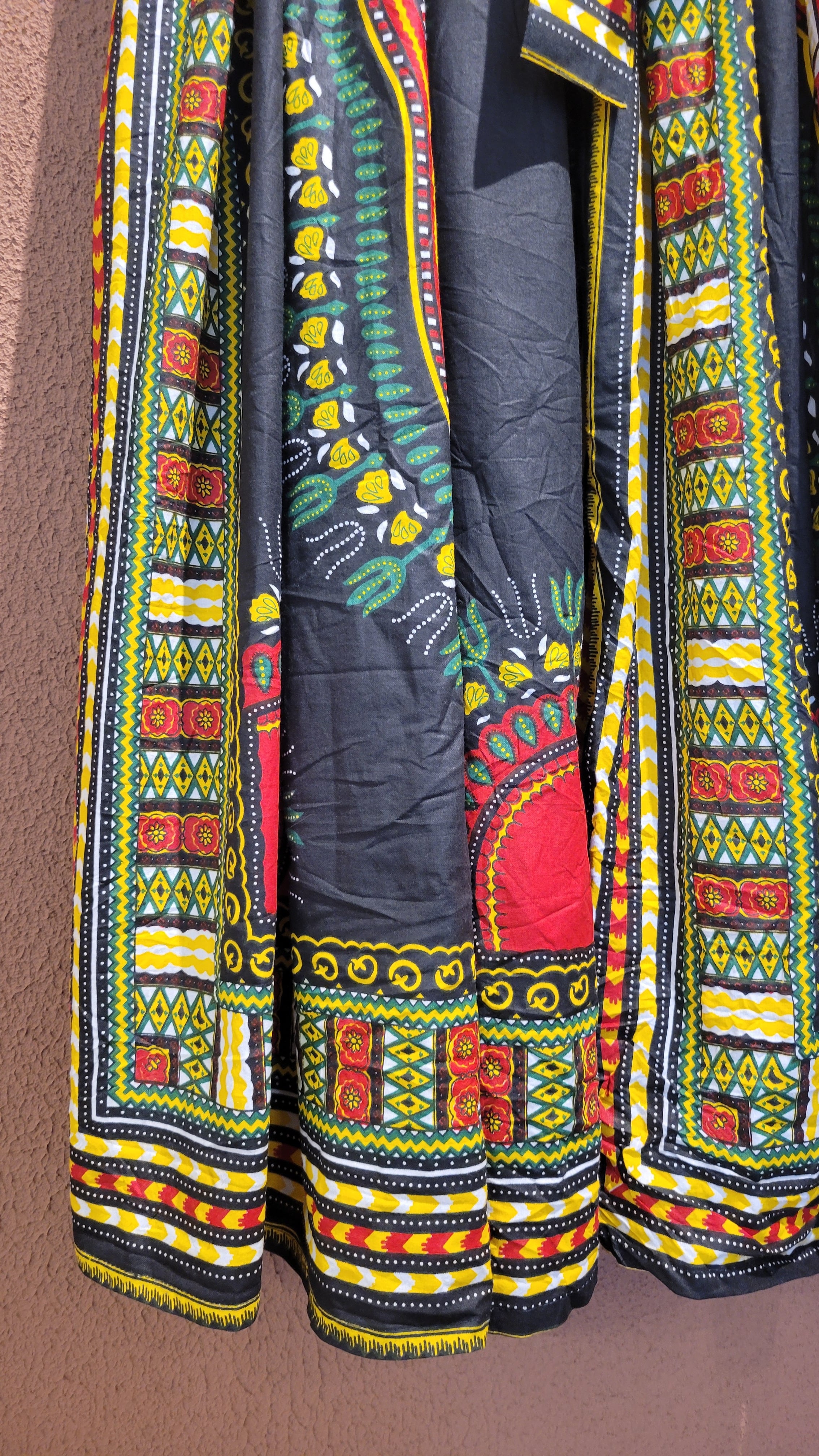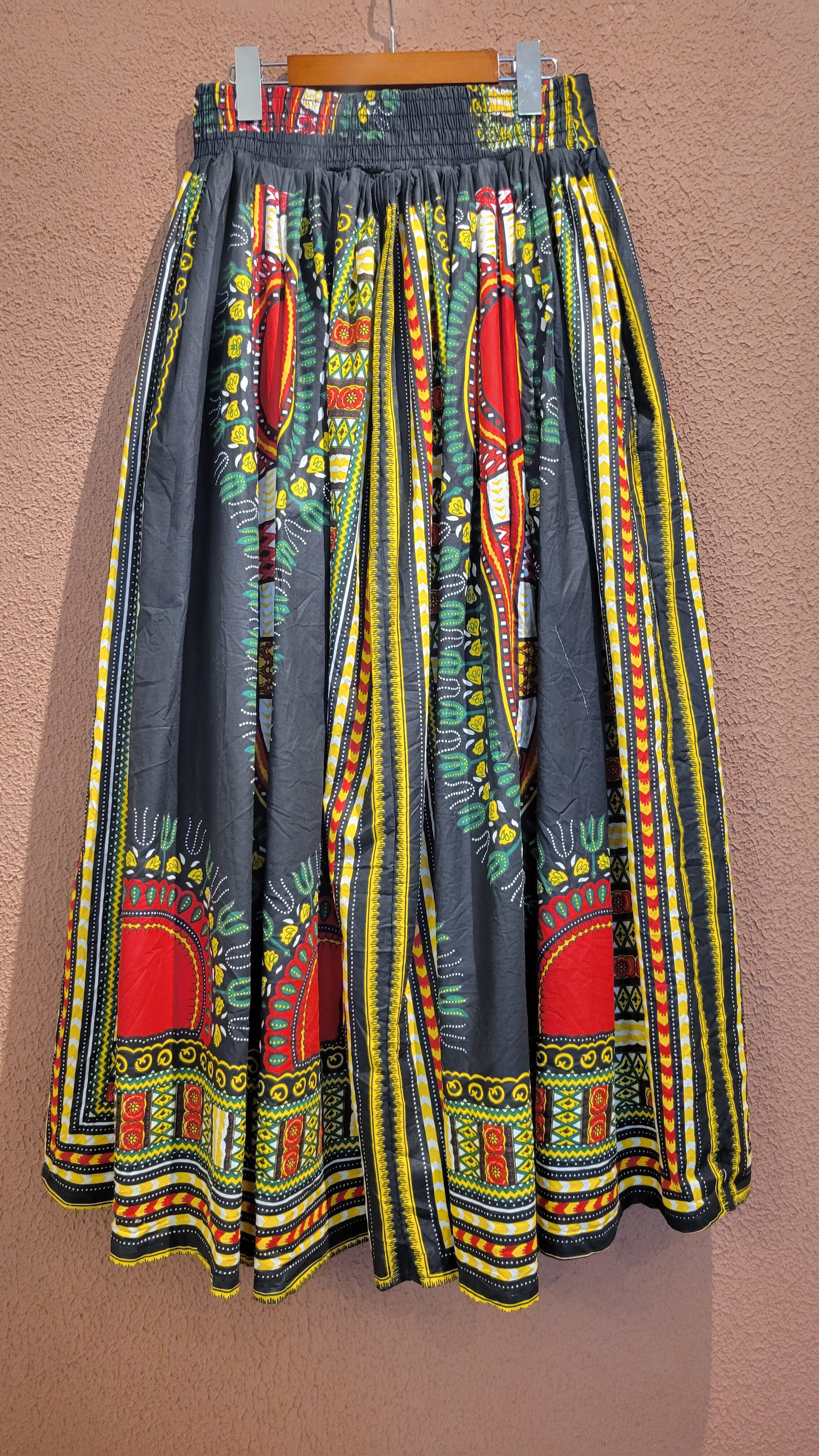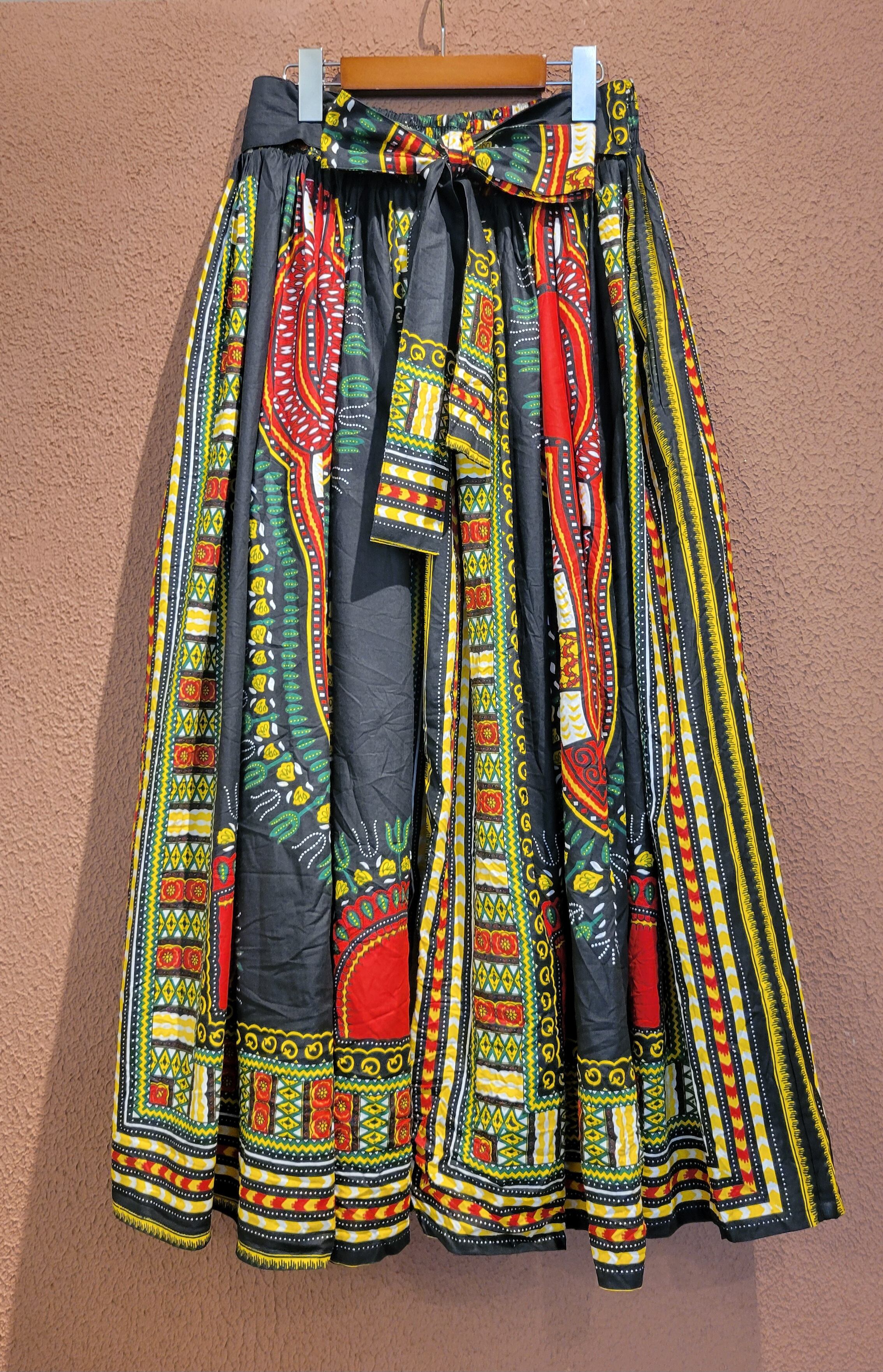 ヴィンテージのDASHIKI柄のアフリカンバティックマキシスカート。素材表記はありませんがコットンです。ろうけつ染めの張り感がしっかり残っておりボリューム感がたまらない1枚。ウエストゴム。ウエストリボンはフロントでもバックでもお好きな位置で結んでいただけます。*スカートの一部に白い線のようなものがあります。画像でご確認ください。着用時にはギャザーに隠れ目立つものではありませんが、こちらはヴィンテージに慣れていらっしゃる方、ご理解のある方へおすすめいたします。