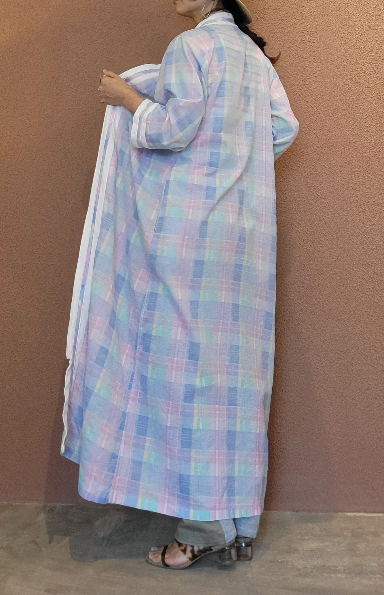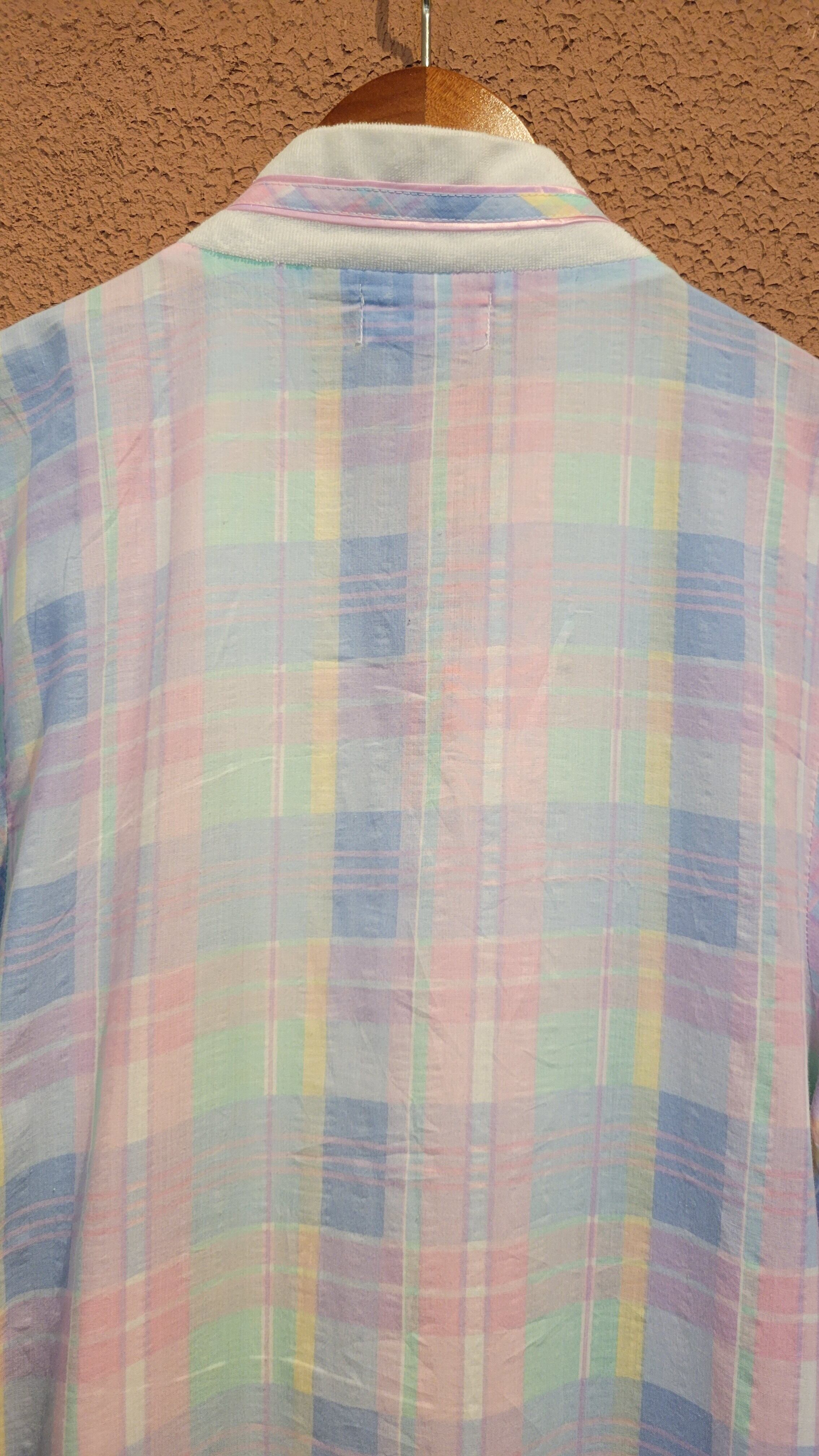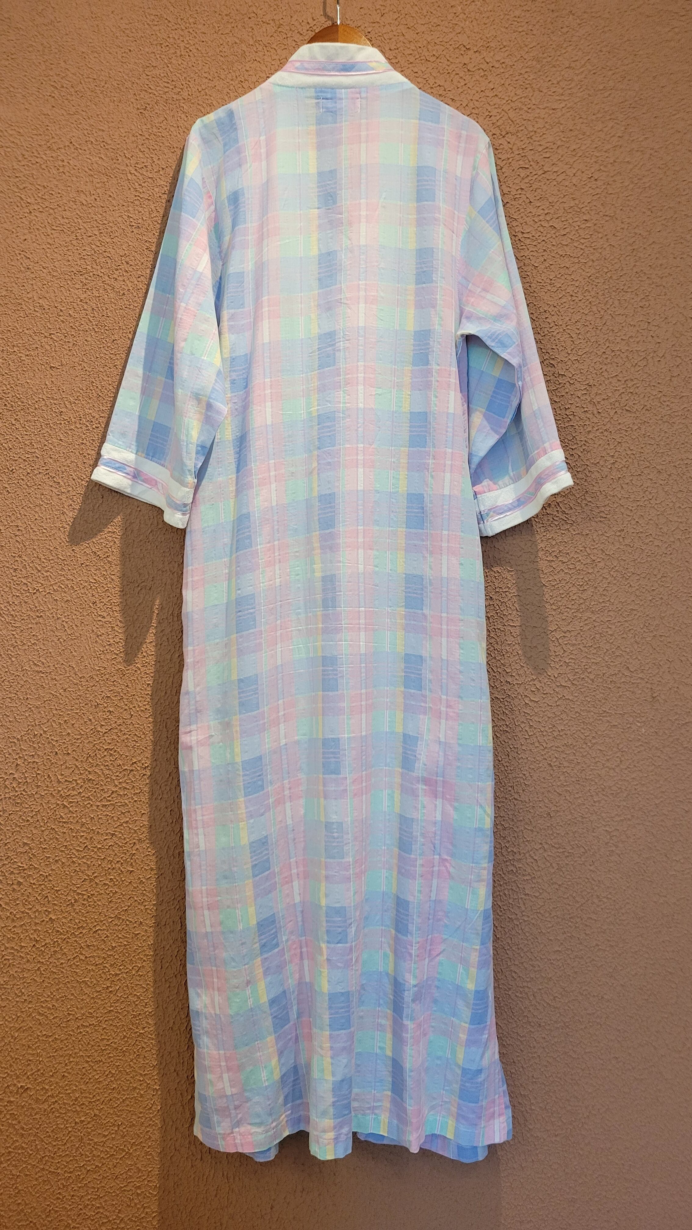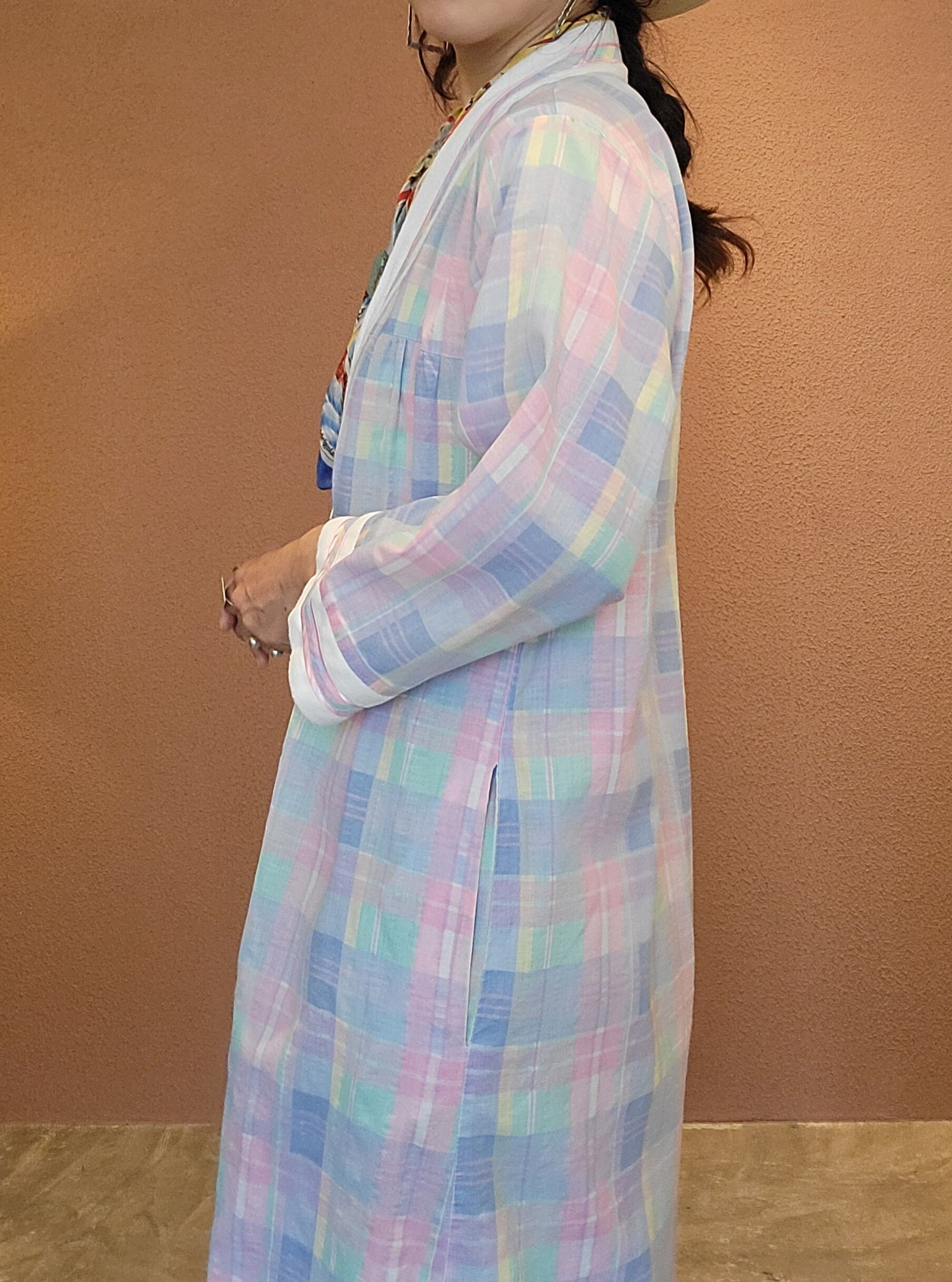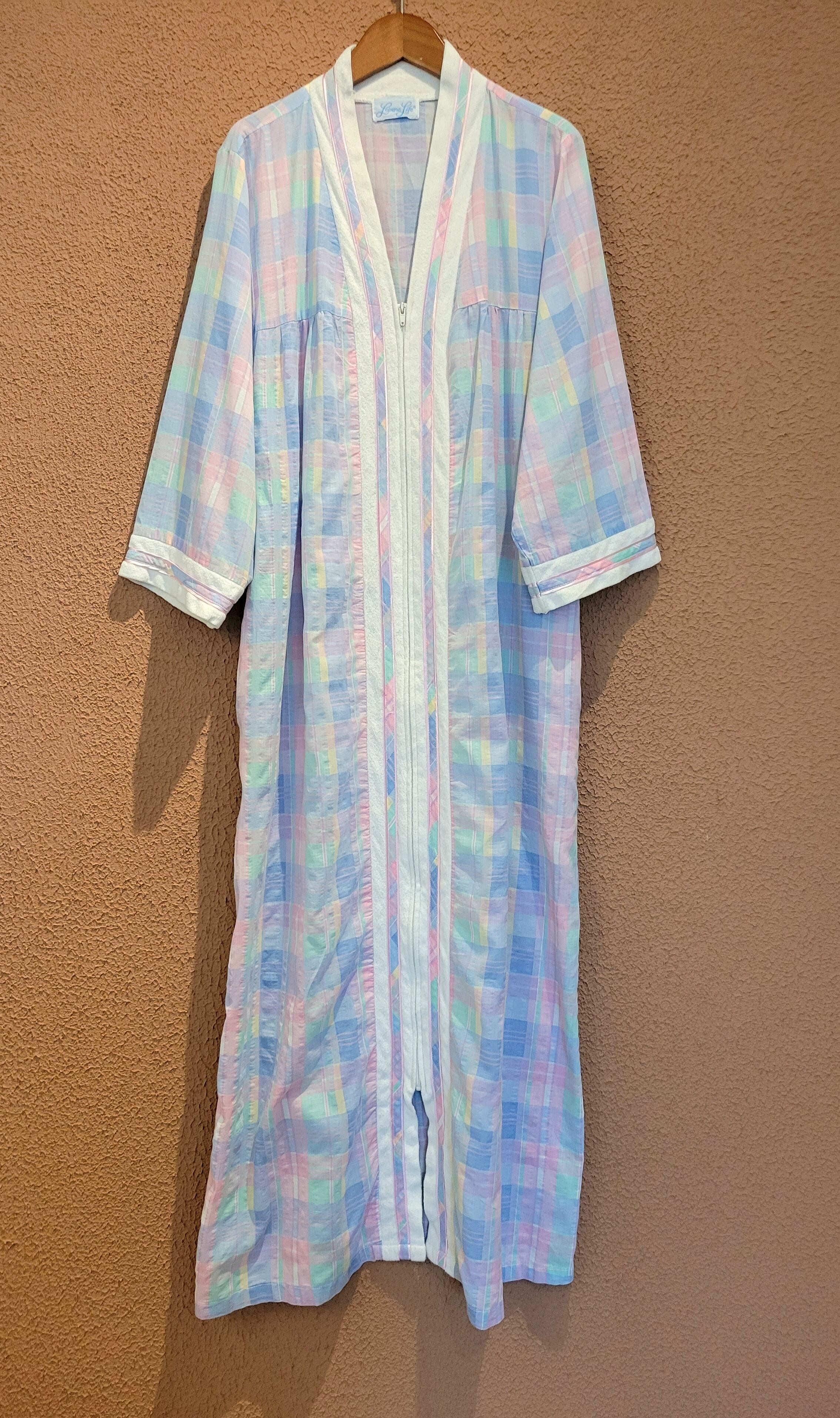 ヴィンテージラウンジドレス。素材表記はありませんが薄手のコットンのようです。軽量で柔らかく優しい肌触りです。フロントフルジップで羽織りとしても使えます。元々は室内でくつろぐための洋服なのでストレスフリーな着心地が魅力です。