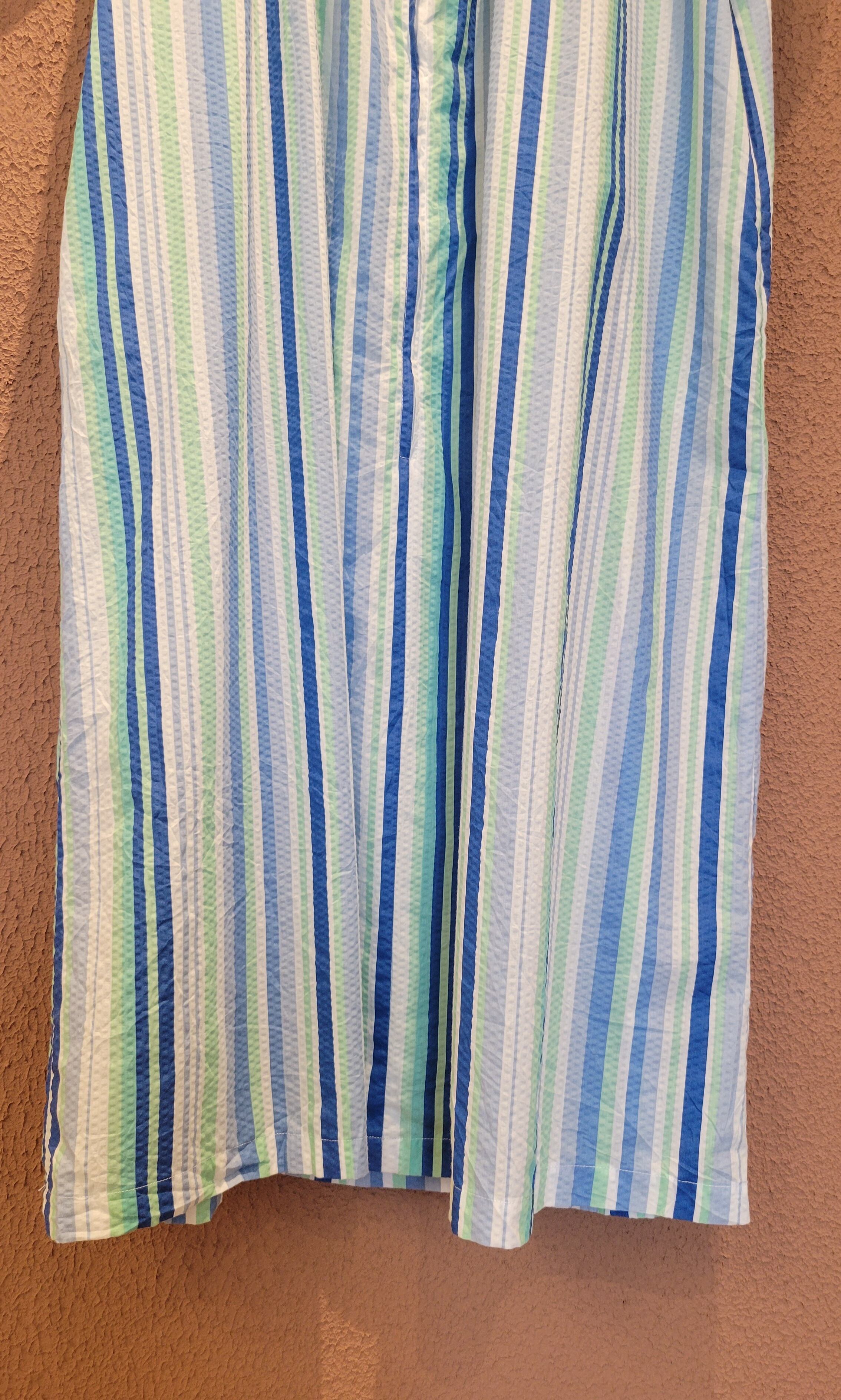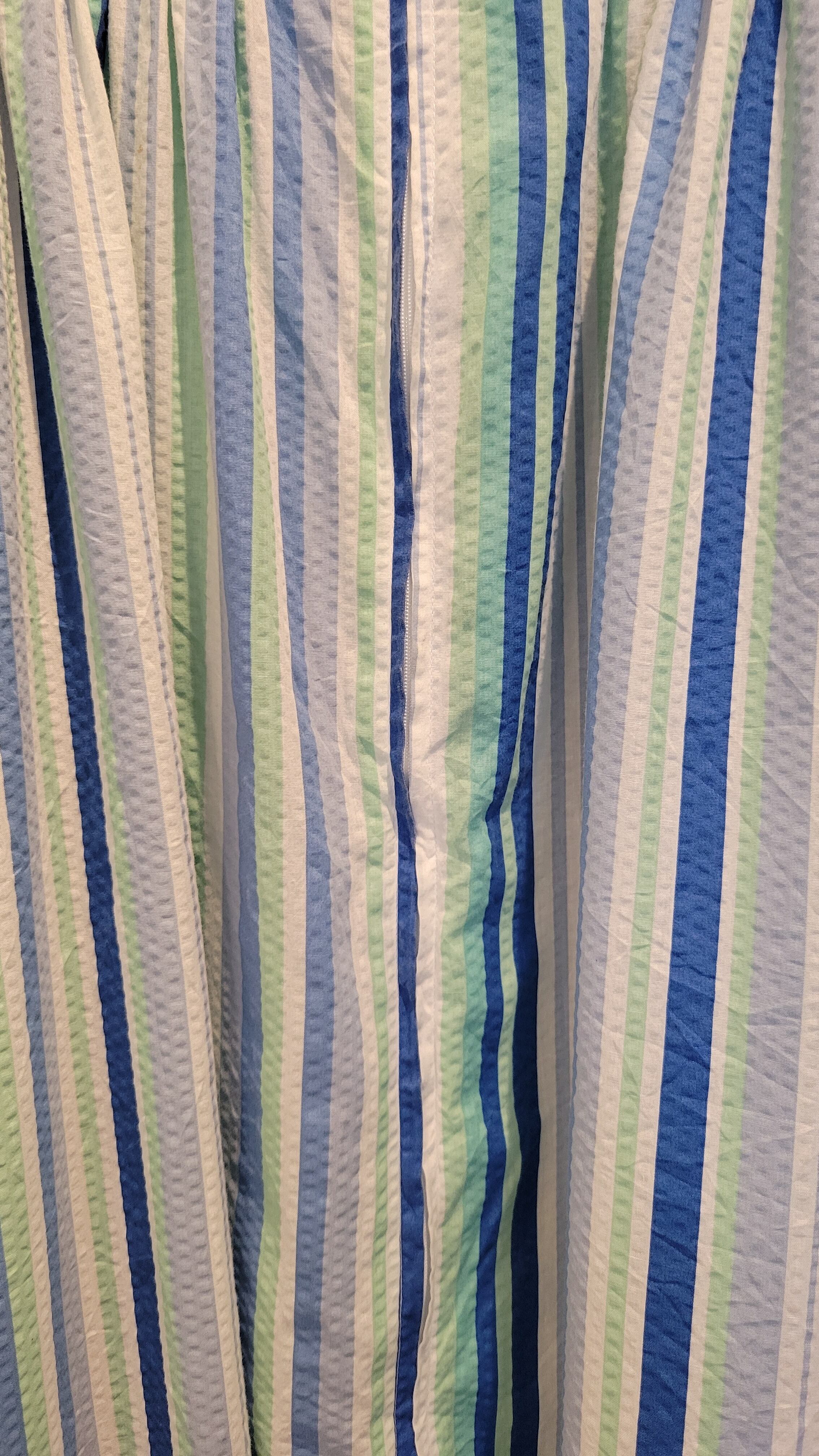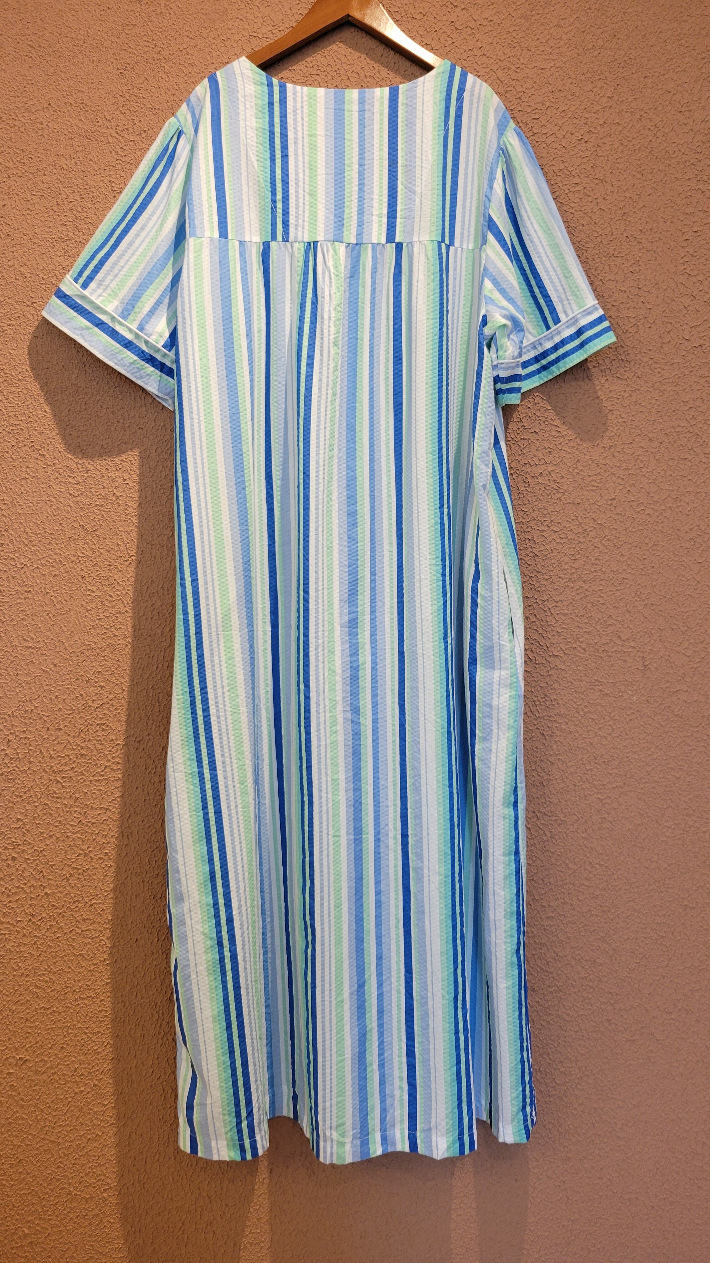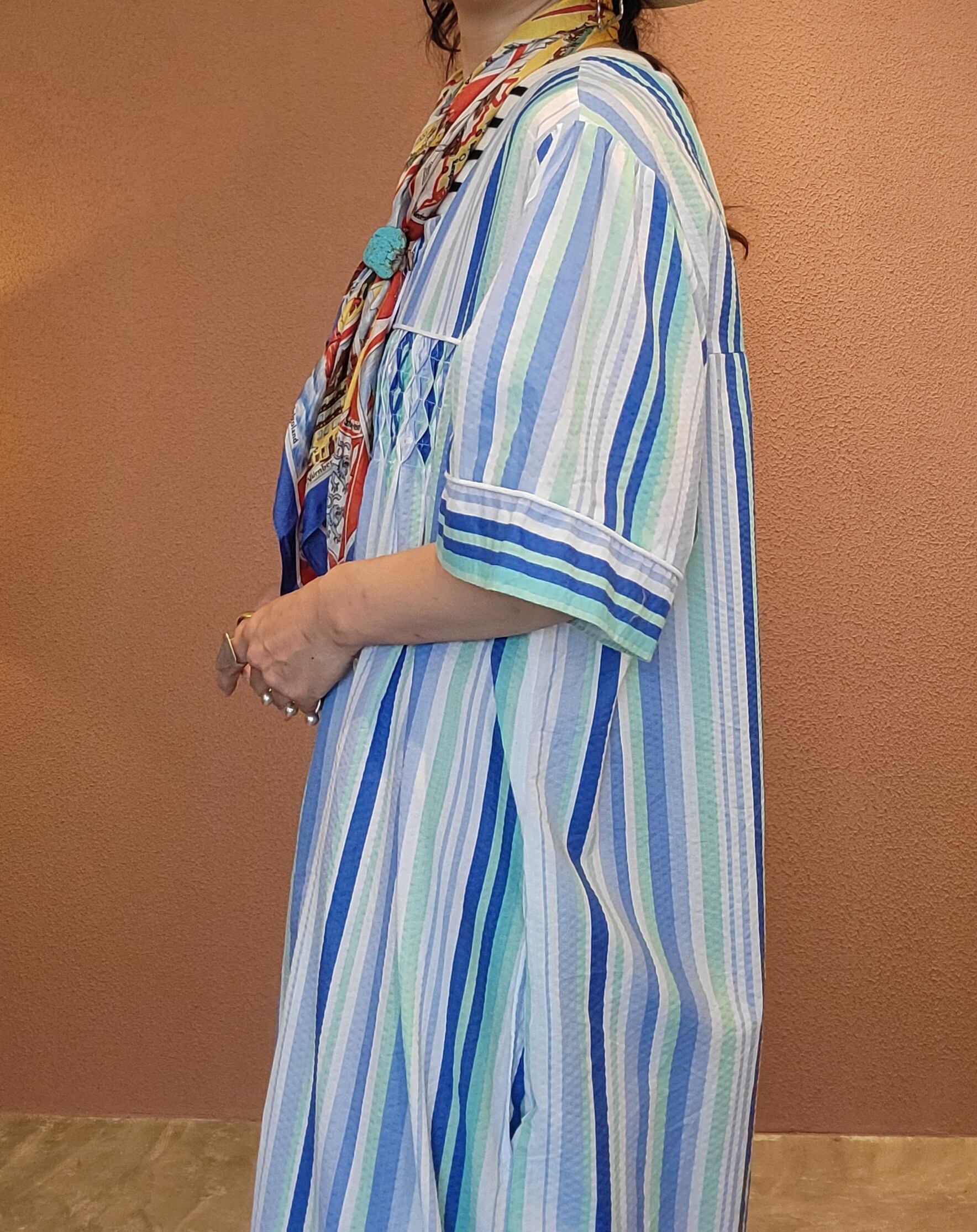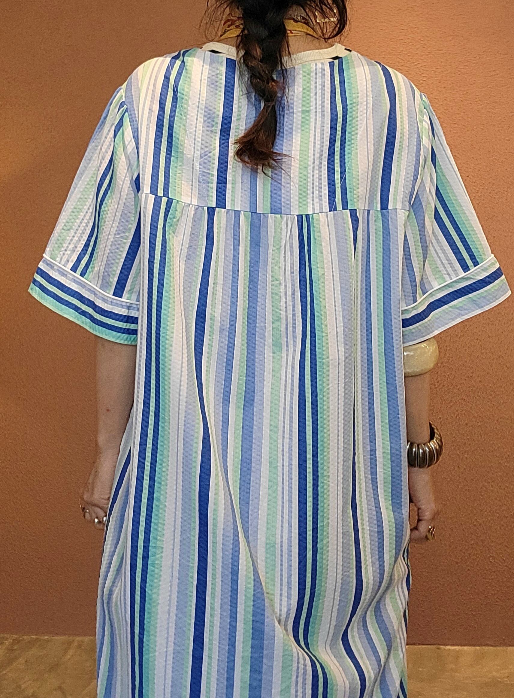 ヴィンテージラウンジドレス。素材表記はありませんがコットンのようです。シアサッカー素材で軽量で肌にまとわりつかず、涼しく着られます。フロントのハーフジップに付いたプルタブが可愛いアクセントに。元々は室内でくつろぐための洋服なのでストレスフリーな着心地が魅力です。