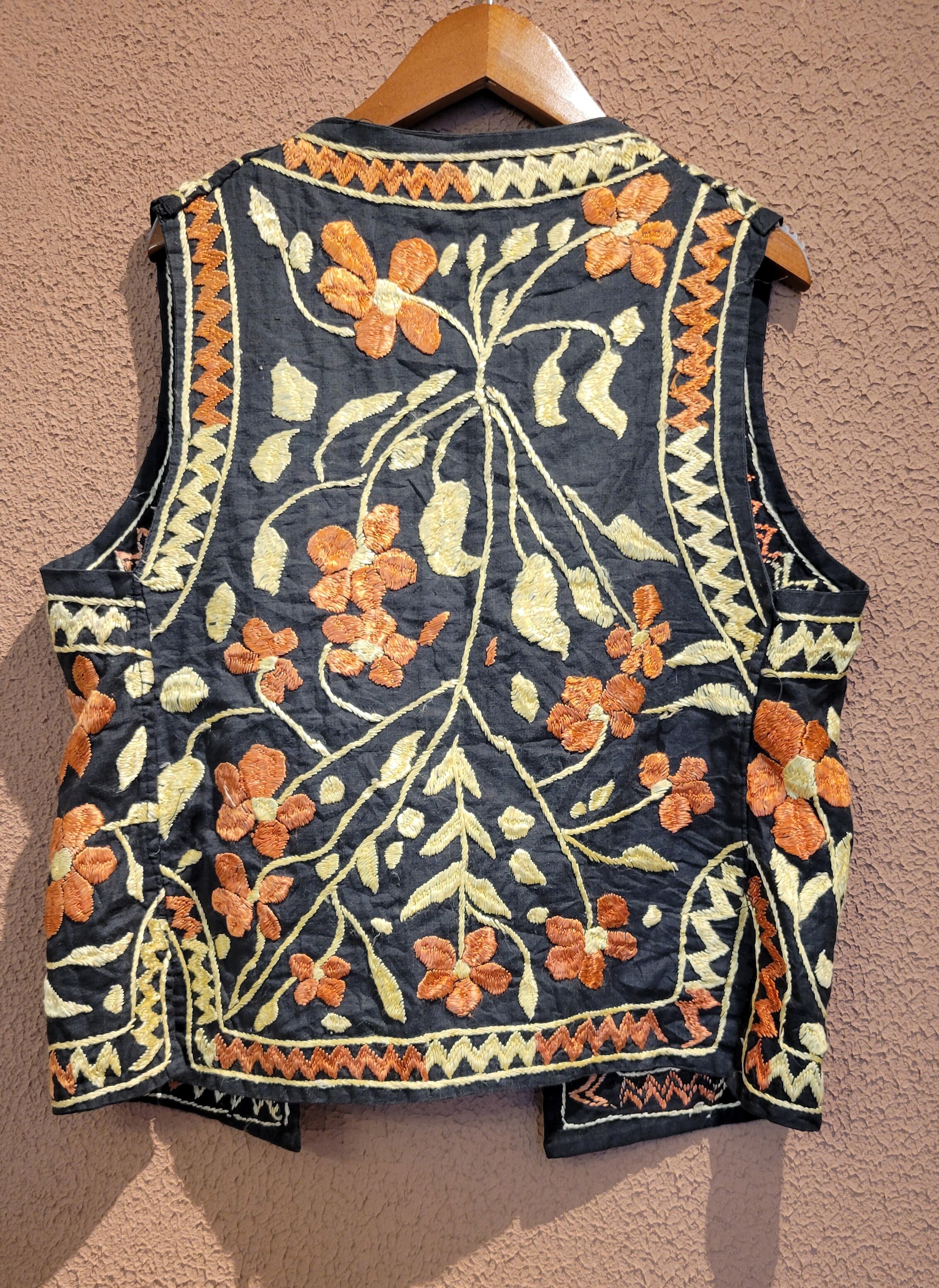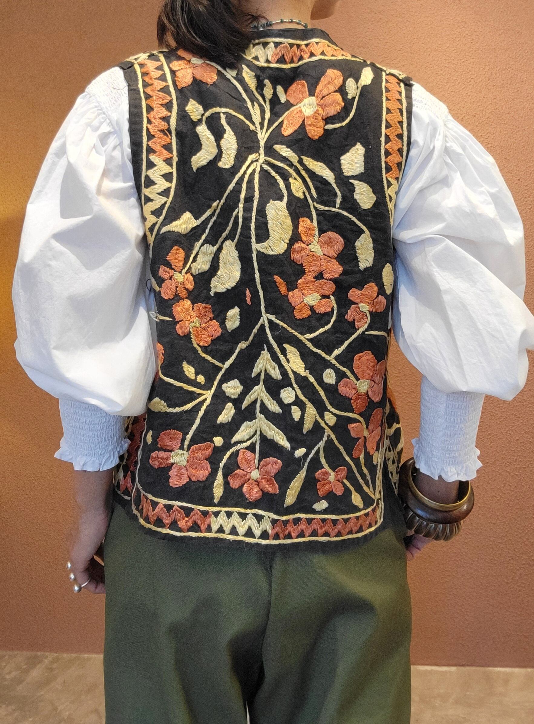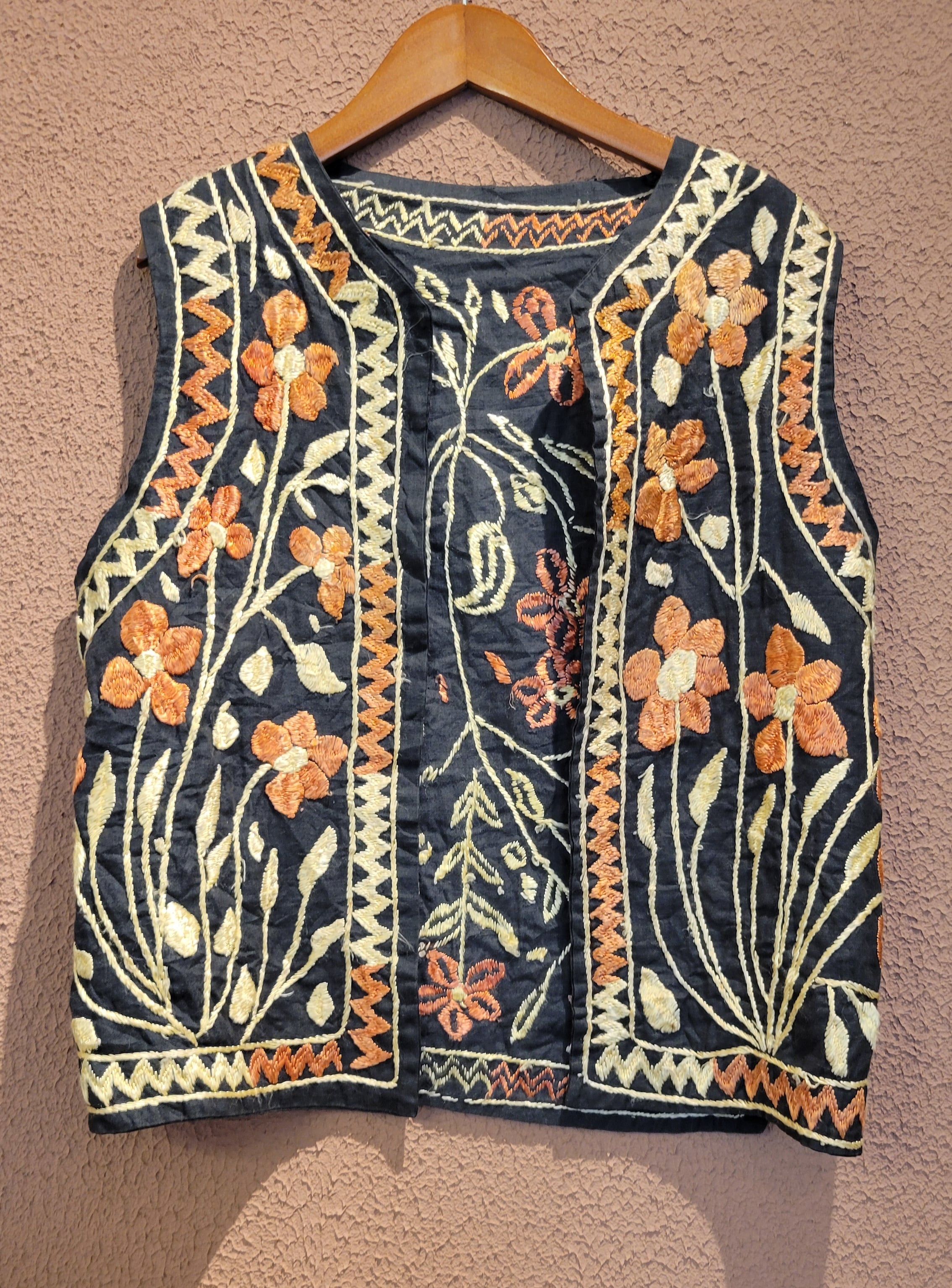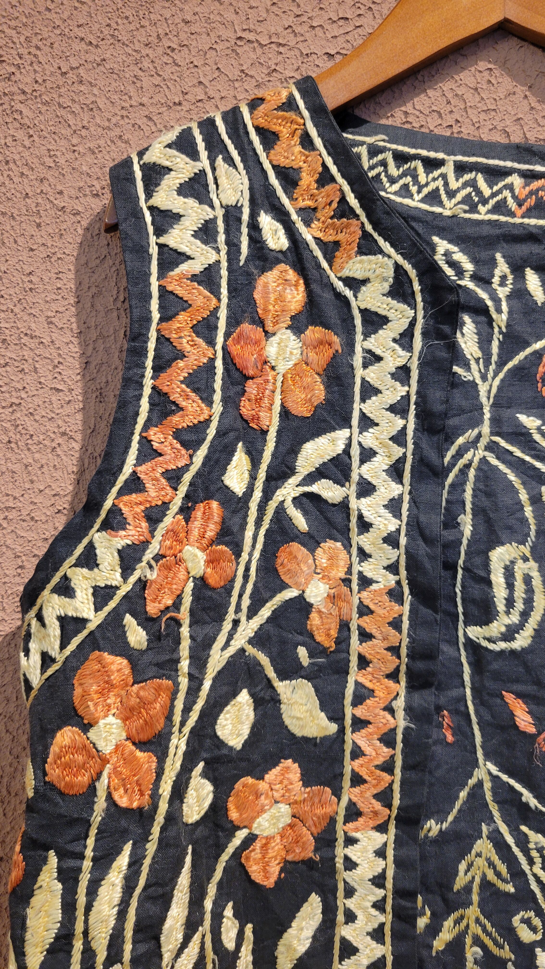 インドの古い刺繍のヴィンテージベスト。素材表記はありませんがコットンのようです。ヴィンテージならではの刺繍の立体感と深みのある味わいを存分にお楽しみいただける1着です。特筆するダメージはありませんが、古いお品のため経年による風合いを味わいとしてお楽しみいただける方へおすすめいたします。